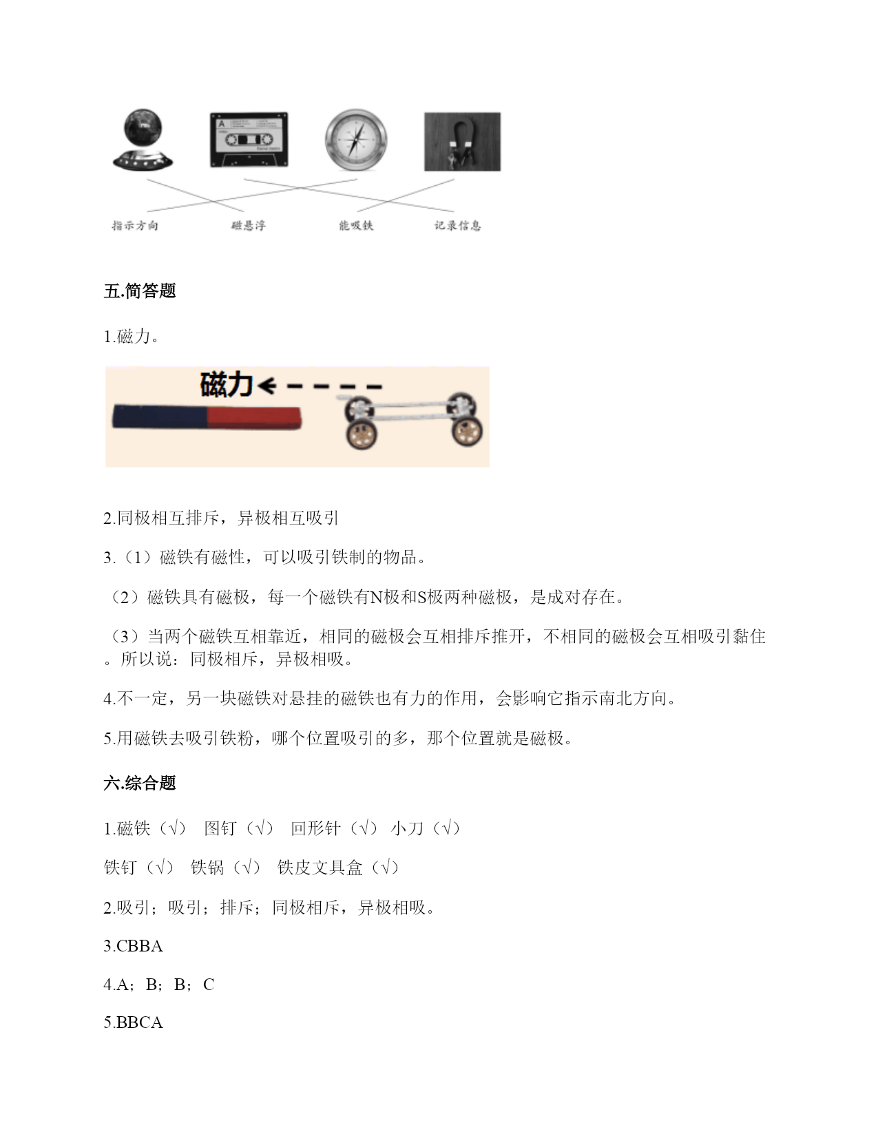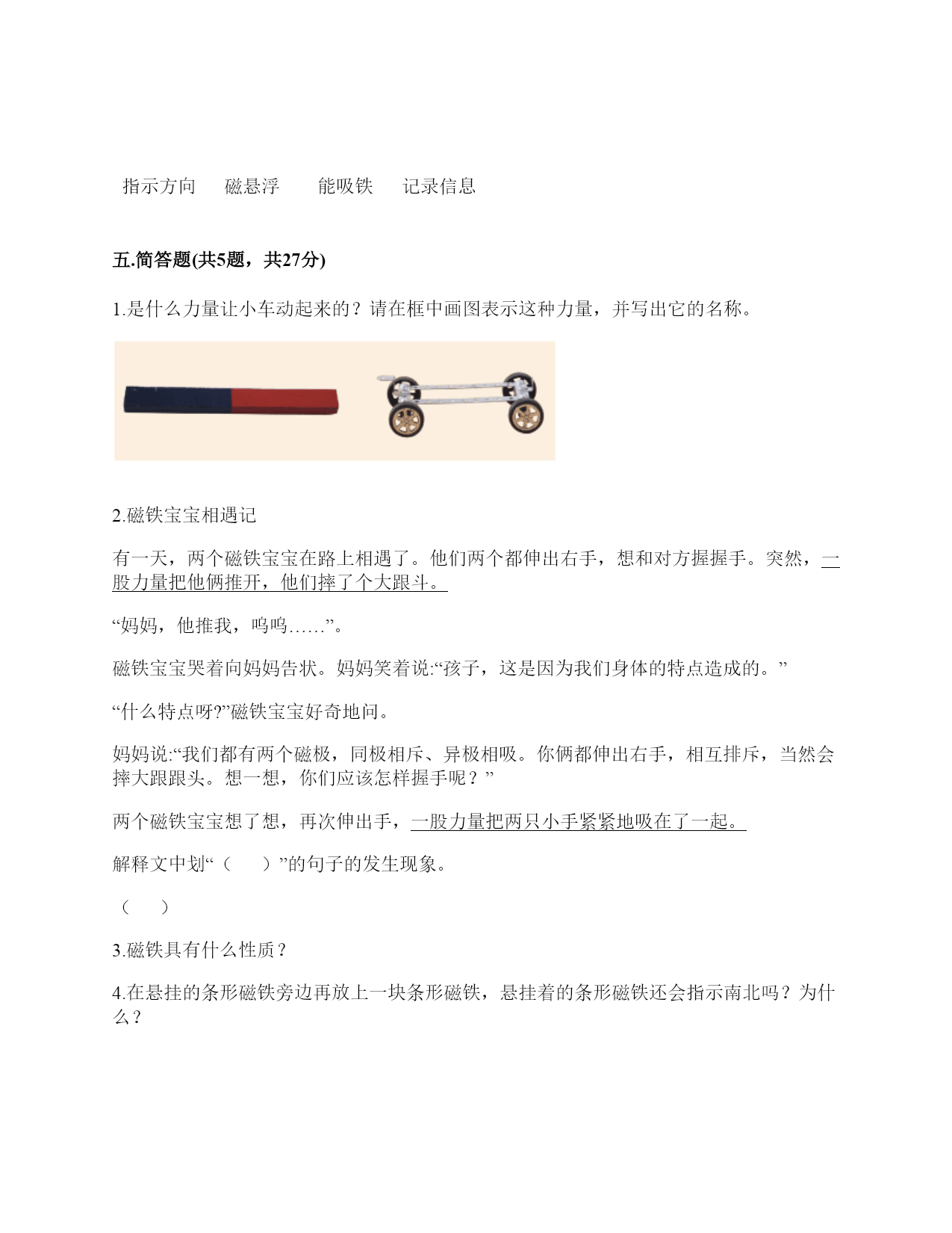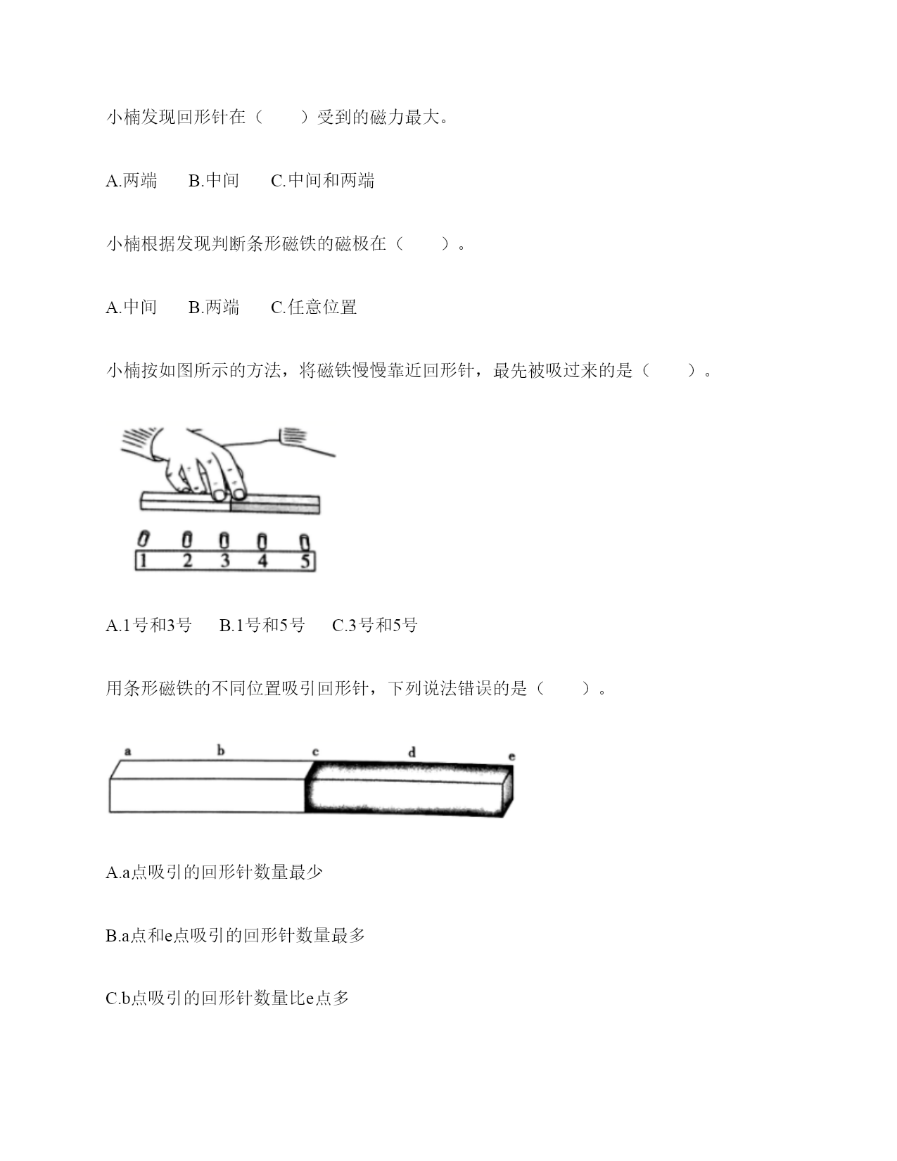 小学科学《磁铁》练习题一.选择题(共6题,共12分)1.如图所示,将小钢珠放置在蹄形磁铁上,最终小钢珠会滚到()处。A.AB.BC.C2.当两块条形磁铁相互靠近时,不会发生排斥现象的是()。A.B.C.3.使用指南针辨别方向时,附近有()对指南针没有影响。A.橡皮B.铁柜C.磁铁4.把一颗小钢珠放在磁性比较强的蹄形磁铁上,松开手,可能发生的现象是()。A.小钢珠不动B.小钢珠会掉下来C.小钢珠会滚向蹄形磁铁的磁极部位5.如果把小钢珠放在条形磁铁的中间,松开手,小钢珠会()。A.留在中间B.会掉下来滚向一端C.掉下来后不动了6.磁铁上磁力最强的部分我们把它叫做磁极,磁铁有()磁极。A.一个B.两个C.三个二.填空题(共6题,共24分)1.写出三种生活中含有磁铁的物品:()、()、()。2.辨认铁制品,()比用眼看更可靠。3.一般情况下,磁铁的磁力大小是()的。4.磁铁上()的部分叫磁极,磁铁有两个磁极。指北的磁极叫北极(用字母()表示),指南的磁极叫南极(用字母()表示)。5.磁铁()做的;磁铁有(),因为它们有不同的用途。6.磁铁有两个磁极,相同的磁极间(),不同的磁极间()。三.判断题(共6题,共12分)1.磁铁隔着布也能吸铁。()2.磁铁在任何情况下都能指示南北方向。()3.磁铁磁力最强的部分是磁极。()4.磁铁可以吸引铜钥匙。()5.我们在做“磁铁能隔着这些物体吸引小车”时,只要做一次就能判断出结果了。()6.我们生活中经常会应用到磁铁的磁性这个性质。()四.连线题(共1题,共4分)1.把下列事物和它应用的磁铁的原理用线连起来指示方向磁悬浮能吸铁记录信息五.简答题(共5题,共27分)1.是什么力量让小车动起来的?请在框中画图表示这种力量,并写出它的名称。2.磁铁宝宝相遇记有一天,两个磁铁宝宝在路上相遇了。他们两个都伸出右手,想和对方握握手。突然,一股力量把他俩推开,他们摔了个大跟斗。“妈妈,他推我,呜呜……”。磁铁宝宝哭着向妈妈告状。妈妈笑着说:“孩子,这是因为我们身体的特点造成的。”“什么特点呀?”磁铁宝宝好奇地问。妈妈说:“我们都有两个磁极,同极相斥、异极相吸。你俩都伸出右手,相互排斥,当然会摔大跟跟头。想一想,你们应该怎样握手呢?”两个磁铁宝宝想了想,再次伸出手,一股力量把两只小手紧紧地吸在了一起。解释文中划“()”的句子的发生现象。()3.磁铁具有什么性质?4.在悬挂的条形磁铁旁边再放上一块条形磁铁,悬挂着的条形磁铁还会指示南北吗?为什么?5.用什么方法可以找到磁铁的磁极?六.综合题(共5题,共39分)1.下列物体哪些能被磁铁吸引?请在后面的括号里打上“√”纸片()铅笔()磁铁()图钉()回形针()小刀()小木块()布片()玻璃杯()铁钉()塑料小尺()铁锅()石块()橡皮()铁皮文具盒()瓷器()2.将一条形磁铁悬挂,手拿另一条形磁铁,当两磁铁的磁极互相靠近时,会有什么现象?把结果记录入下表。3.小欣的爸爸给她买了一个指南针,请你教她如何使用指南针吧!1.观察上图这个指南针,它的刻度盘上有()个方位。A.2B.4C.82.指南针刻度盘上的南方用字母()表示A.NB.SC.W3.正确使用指南针时,磁针静止后,白色的一端指向()方。A.东B.南C.北4.如果指南针附近有铁制品,()影响指南针正常工作。A.会B.不会C.不一定4.小楠利用回形针感受条形磁铁不同部位的磁力大小。接近磁铁的一端接近磁铁的中间小楠发现回形针在()受到的磁力最大。A.两端B.中间C.中间和两端小楠根据发现判断条形磁铁的磁极在()。A.中间B.两端C.任意位置小楠按如图所示的方法,将磁铁慢慢靠近回形针,最先被吸过来的是()。A.1号和3号B.1号和5号C.3号和5号用条形磁铁的不同位置吸引回形针,下列说法错误的是()。A.a点吸引的回形针数量最少B.a点和e点吸引的回形针数量最多C.b点吸引的回形针数量比e点多5.如图所示,子萓和昊瑞一起玩“蝴蝶飞”的游戏,请你根据所学的知识回答问题。1.“蝴蝶”的身体应该用()制作。A.毛线B.回形针C.塑料笔帽2.“蝴蝶”能飞起来,是因为受到了()。A.拉力B.磁力C.推力3.如果在“蝴蝶”和磁铁中间放上(),“蝴蝶”就不能飞起来了。A.B.C.4.如果用条形磁铁的另一端靠近“蝴蝶”,蝴蝶()飞起来。A.能B.不能参考答案一.选择题1.A2.A3.A4.C5.B6.B二.填空题1.冰箱门;磁力扣;门吸2.使用磁铁检测3.固定4.磁力最强;N;S5.不一定是铁;各种形状6.相互排斥;相互吸引