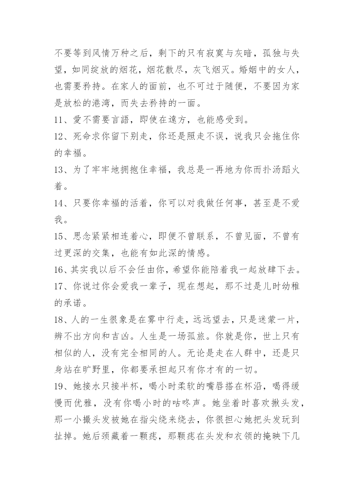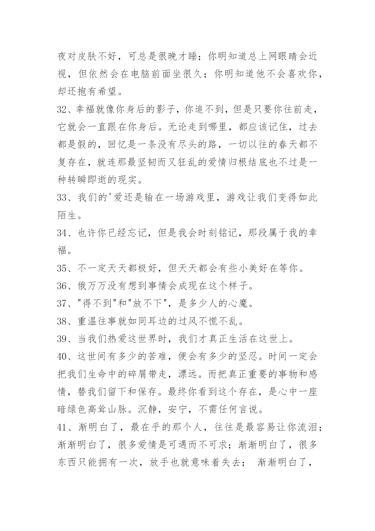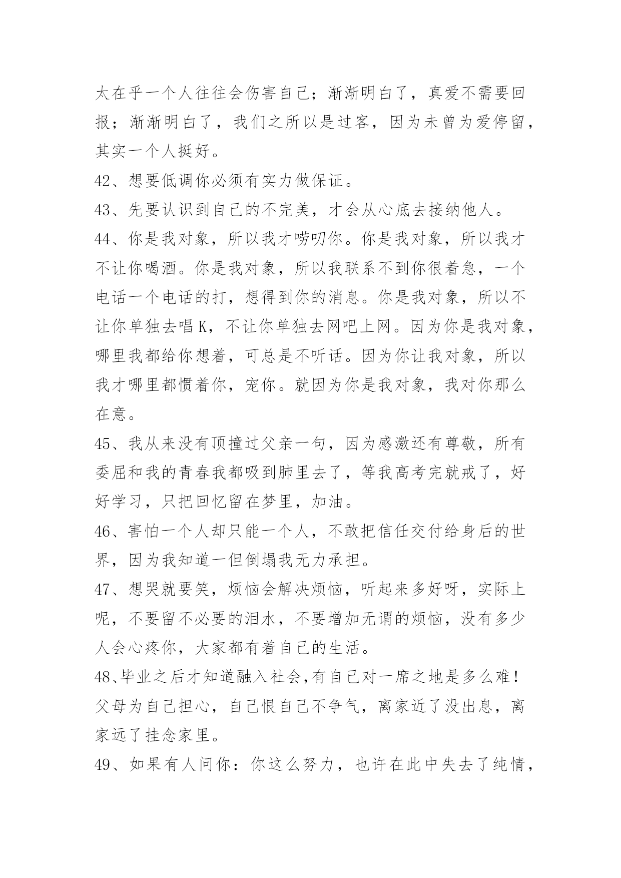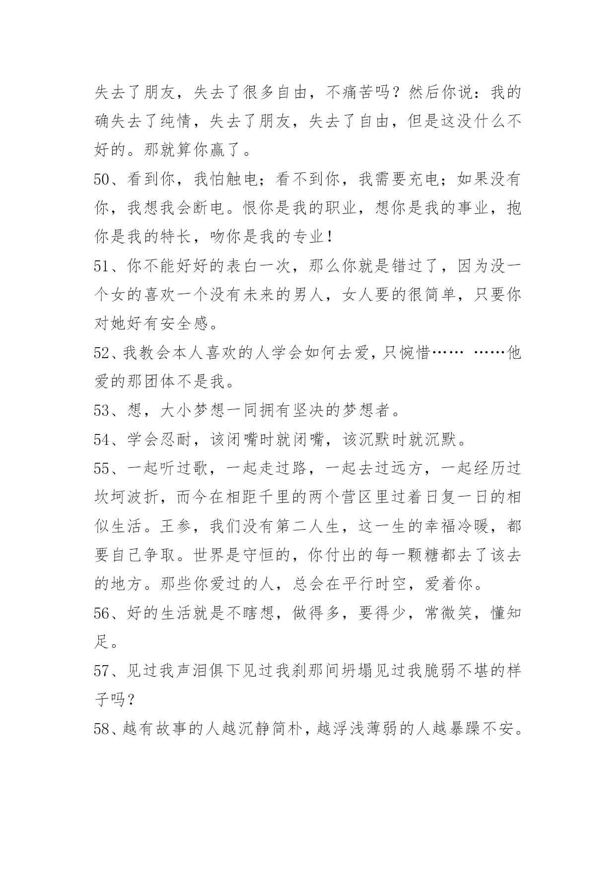 感人的情感语录58条2021年感人的情感语录58条我们一直在那里,静静地忠实的守在你的回忆里。下面是小编给各位读者分享的感人的情感语录58条,大家快来看看吧。1、人生就像等车,也许等一等就来了。2、怀旧,不是曾经多么美好,而是那些曾经我们都年轻。3、当你的才华还撑不起你的野心的时候,那你就应该静下心来学习。4、外表的美只能取悦于人的眼睛,而内在的美却能感染人的灵魂。5、为什么我总感觉不幸福?难道当幸福来敲门的时候,我在加班?6、有理想,有目标,有勇气,有信心,有恒心,有毅力,加把劲,提提神,前途一片光明。7、如果没有盲目的期待,就不会有失望。如果能了解一切都是无常,就不会攀缘执著;如果不攀缘执著,就不会患得患失,也才能真正完完全全地活着。8、我打了所有的幌子却还是遮不住爱你的样子。9、你说我给不了你幸福,也许一开始就没有幸福。10、恋爱中的女人,需要矜持,大方得体,进退有度。男人是烈火,女人则是温泉,用你的矜持,保持自己不被燃烧,不要等到风情万种之后,剩下的只有寂寞与灰暗,孤独与失望,如同绽放的烟花,烟花散尽,灰飞烟灭。婚姻中的女人,也需要矜持。在家人的面前,也不可过于随便,不要因为家是放松的港湾,而失去矜持的一面。11、愛不需要言語,即使在遠方,也能感受到。12、死命求你留下别走,你还是照走不误,说我只会拖住你的幸福。13、为了牢牢地拥抱住幸福,我总是一再地为你而扑汤蹈火着。14、只要你幸福的活着,你可以对我做任何事,甚至是不爱我。15、思念紧紧相连着心,即便不曾联系,不曾见面,不曾有过更深的交集,也能有如此深的情感。16、其实我以后不会任由你,希望你能陪着我一起放肆下去。17、你说过你会爱我一辈子,现在想起,那不过是儿时幼稚的承诺。18、人的一生很象是在雾中行走,远远望去,只是迷蒙一片,辨不出方向和吉凶。人生是一场孤旅。你就是你,世上只有相似的人,没有完全相同的人。无论是走在人群中,还是只身站在旷野里,你都要承担起只有你才有的一切。19、她接水只接半杯,喝小时柔软的嘴唇搭在杯沿,喝得缓慢而优雅,没有你喝小时的咕咚声。她坐着时喜欢揪头发,那一小撮头发被她在指尖绕来绕去,你很担心她把头发玩到扯掉。她后颈藏着一颗痣,那颗痣在头发和衣领的掩映下几不可见,你偶尔看到了,觉得这是只有你才能发现的秘密,开心的扯动嘴角。20、你在我记忆的那头,苦苦撑住了岁月的蹉跎。那份回忆折叠了我的思想,让我在你的记忆里沉浮。21、在全力以赴的奋斗中,因为你的豪情壮志,为你的成功建立起坚定的信心和信念。22、你的幸福是我触及不到的天空。23、有时吹跑的、只是幸福的外壳。24、归属感是你很想和他在一起;安全感是你觉得他很想和你在一起;成就感是你很想和他在一起并得以实现;幸福感是彼此都很想在一起最终走在了一起。25、选择了你,就选择和幸福在一起,多谢冥冥中的天意,让我邂逅缘分中的你,于是我付出我一腔的情意,陪伴你永远欢欢喜喜。26、催眠本身,报告本身,有幸福。27、书籍也可以改变我们的情感,情感会导致我们做错很多事情,做错之后我们会后悔。所以大家需要找一本有意思的书籍。28、我喝酒,只是释放我的感情。我抽烟,只是清晰我的情感。我喝酒时抽烟,只是感受我的感受罢了。29、别跟我谈钱,谈钱多伤感情,别跟我谈感情,谈感情多伤钱。30、就算删除了来访踪迹,我也晓得你曾经来过。31、你明知道会长胖,却还是忍不住不停的吃;你明知道熬夜对皮肤不好,可总是很晚才睡;你明知道总上网眼睛会近视,但依然会在电脑前面坐很久;你明知道他不会喜欢你,却还抱有希望。32、幸福就像你身后的影子,你追不到,但是只要你往前走,它就会一直跟在你身后。无论走到哪里,都应该记住,过去都是假的,回忆是一条没有尽头的路,一切以往的春天都不复存在,就连那最坚韧而又狂乱的爱情归根结底也不过是一种转瞬即逝的现实。33、我们的'爱还是输在一场游戏里,游戏让我们变得如此陌生。34、也许你已经忘记,但是我会时刻铭记,那段属于我的幸福。35、不一定天天都极好,但天天都会有些小美好在等你。36、俄万万没有想到事情会成现在这个样子。37、"得不到"和"放不下",是多少人的心魔。38、重温往事就如同耳边的过风不慌不乱。39、当我们热爱这世界时,我们才真正生活在这世上。40、这世间有多少的苦难,便会有多少的坚忍。时间一定会把我们生命中的碎屑带走,漂远。而把真正重要的事物和感情,替我们留下和保存。最终你看到这个存在,是心中一座暗绿色高耸山脉。沉静,安宁,不需任何言说。41、渐明白了,最在乎的那个人,往往是最容易让你流泪;渐渐明白了,很多爱情是可遇而不可求;渐渐明白了,很多东西只能拥有一次,放手也就意味着失去;渐渐明白了,太在乎一个人往往会伤害自己;渐渐明白了,真爱不需要回报;渐渐明白了,我们之所以是过客,因为未曾为爱停留,其