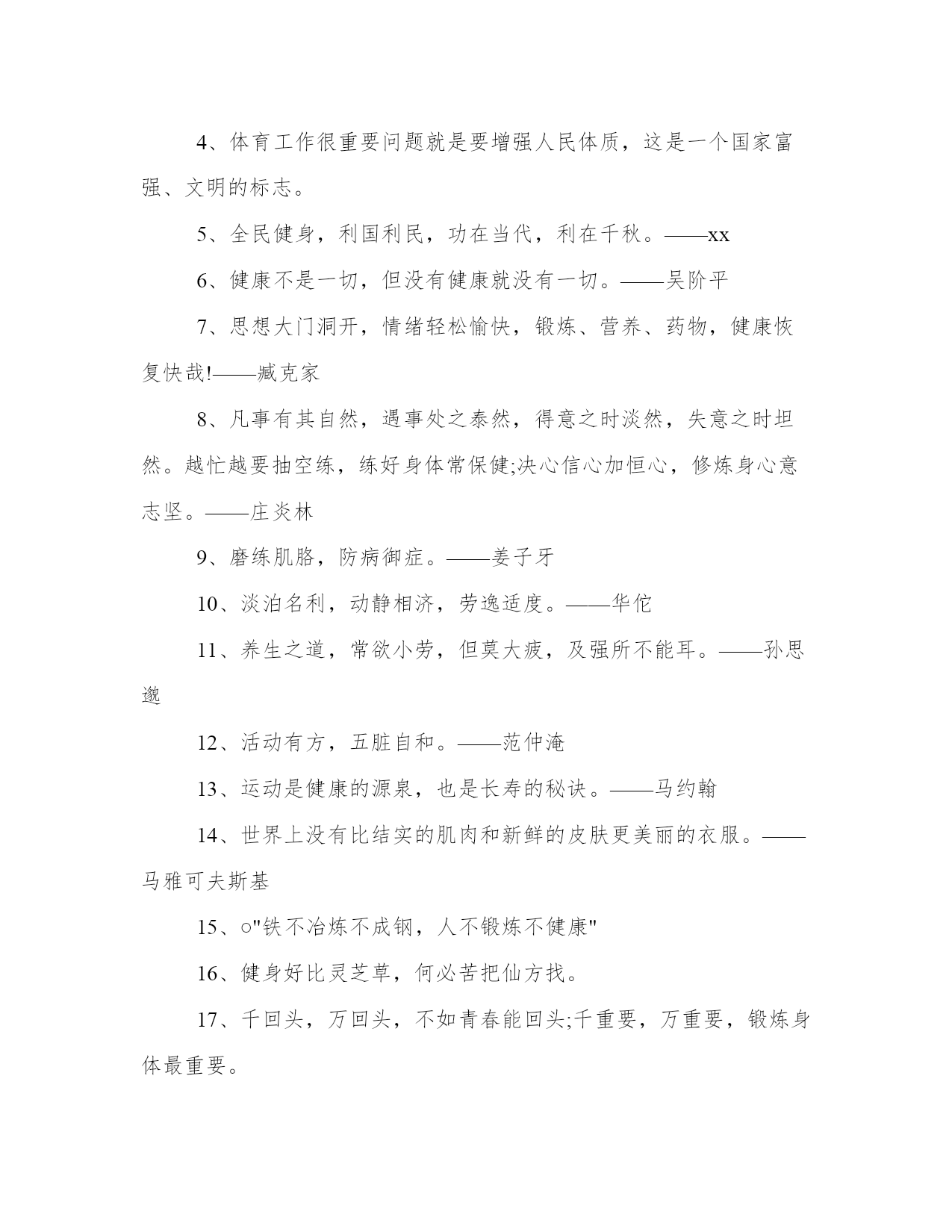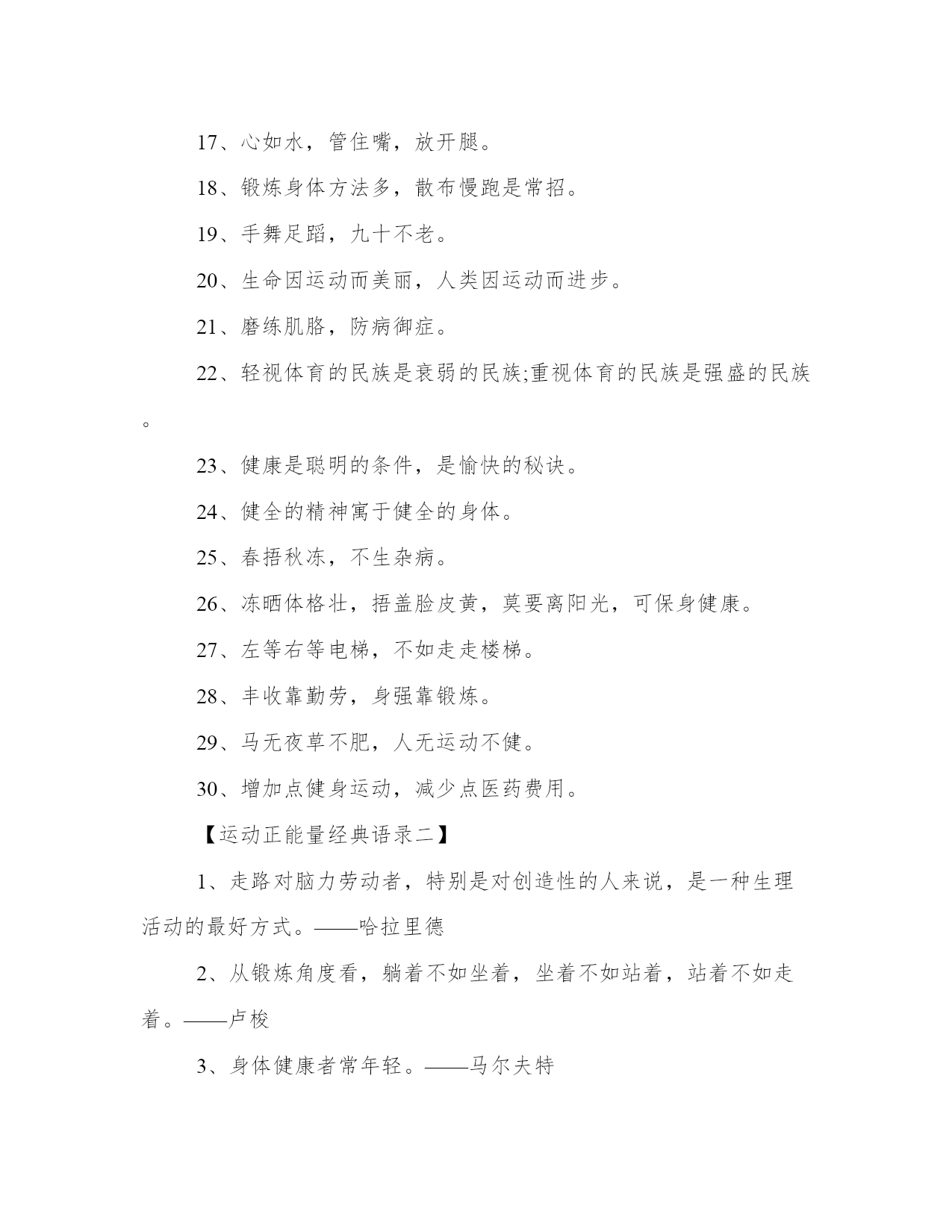 运动正能量经典语录【运动正能量经典语录一】1、健康你我他,幸福千万家。2、活动好比灵芝草,何必苦把仙方找。3、衣服早补补丁少,疾病早治病苦少。4、健身能长寿,不容再等候。5、数九严寒天气寒,锻炼自己莫间断。6、动为纲,吃杂粮,开口笑,寿命长。7、生命在于运动,健康在于健身。8、健心在于养神,养神在于养脑,养脑在于勤用,用则强,偏则废。9、走路对脑力劳动者,特别是对创造性的人来说,是一种生理活动的最好方式。10、身体是营造知识大厦的基石,运动是事业奋斗路上的伴侣。11、顺走一百步是健身,倒走一百步是健心。12、不怕穿的少,就怕脱的早。13、提高体育运动水平,振奋中华民族精神。14、强身健体的处方是锻炼,延年益寿的秘诀是运动。15、置健身于不屑一顾的人,迟早会尝到失去健康的滋味。16、不贪心自安,不淫体魄健;不怨心胸宽,不气乐安然。17、心如水,管住嘴,放开腿。18、锻炼身体方法多,散布慢跑是常招。19、手舞足蹈,九十不老。20、生命因运动而美丽,人类因运动而进步。21、磨练肌胳,防病御症。22、轻视体育的民族是衰弱的民族;重视体育的民族是强盛的民族。23、健康是聪明的条件,是愉快的秘诀。24、健全的精神寓于健全的身体。25、春捂秋冻,不生杂病。26、冻晒体格壮,捂盖脸皮黄,莫要离阳光,可保身健康。27、左等右等电梯,不如走走楼梯。28、丰收靠勤劳,身强靠锻炼。29、马无夜草不肥,人无运动不健。30、增加点健身运动,减少点医药费用。【运动正能量经典语录二】1、走路对脑力劳动者,特别是对创造性的人来说,是一种生理活动的最好方式。——哈拉里德2、从锻炼角度看,躺着不如坐着,坐着不如站着,站着不如走着。——卢梭3、身体健康者常年轻。——马尔夫特4、体育工作很重要问题就是要增强人民体质,这是一个国家富强、文明的标志。5、全民健身,利国利民,功在当代,利在千秋。——xx6、健康不是一切,但没有健康就没有一切。——吴阶平7、思想大门洞开,情绪轻松愉快,锻炼、营养、药物,健康恢复快哉!——臧克家8、凡事有其自然,遇事处之泰然,得意之时淡然,失意之时坦然。越忙越要抽空练,练好身体常保健;决心信心加恒心,修炼身心意志坚。——庄炎林9、磨练肌胳,防病御症。——姜子牙10、淡泊名利,动静相济,劳逸适度。——华佗11、养生之道,常欲小劳,但莫大疲,及强所不能耳。——孙思邈12、活动有方,五脏自和。——范仲淹13、运动是健康的源泉,也是长寿的秘诀。——马约翰14、世界上没有比结实的肌肉和新鲜的皮肤更美丽的衣服。——马雅可夫斯基15、○"铁不冶炼不成钢,人不锻炼不健康"16、健身好比灵芝草,何必苦把仙方找。17、千回头,万回头,不如青春能回头;千重要,万重要,锻炼身体最重要。18、机器不转要生锈,人不活动要得病。19、刀不磨要生锈,人不练要生病。20、枪不擦不亮,人不练不壮。