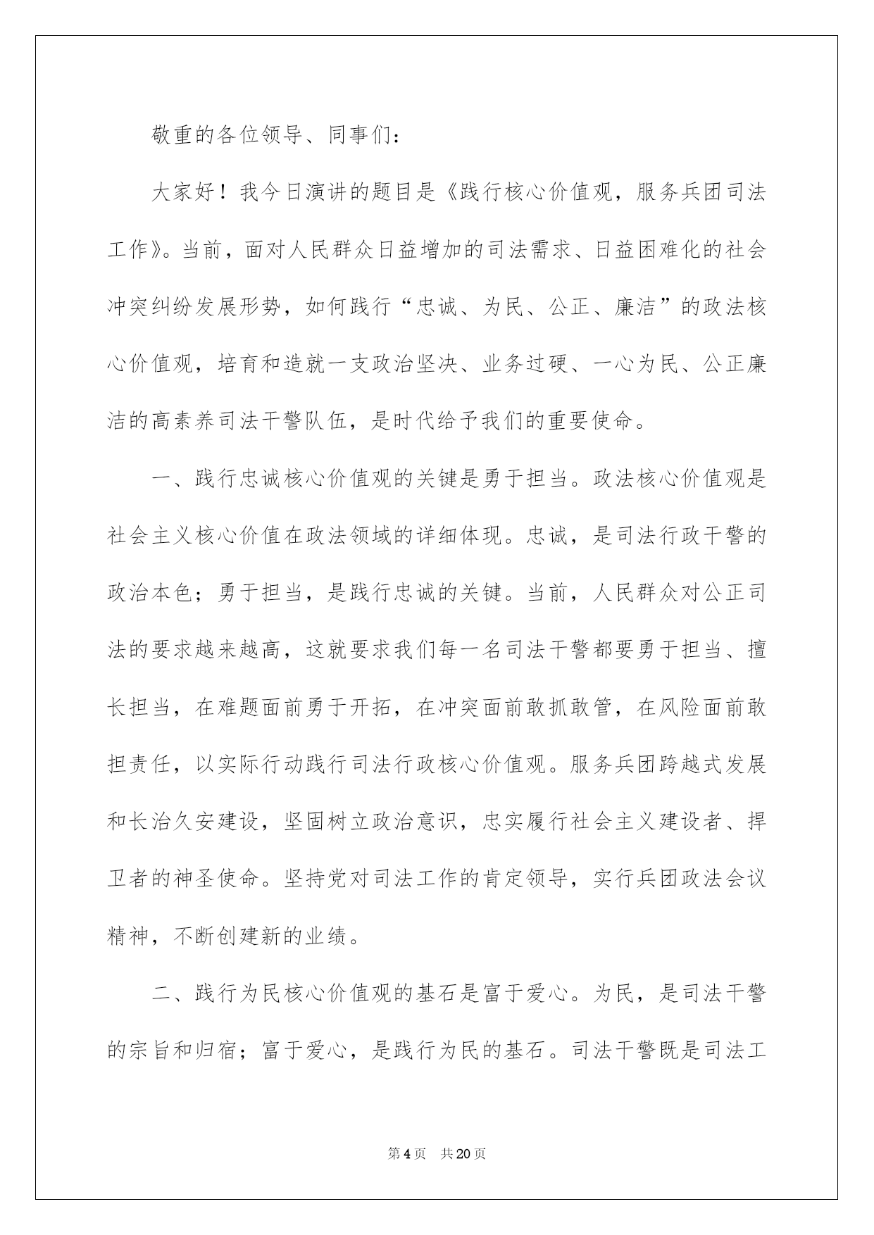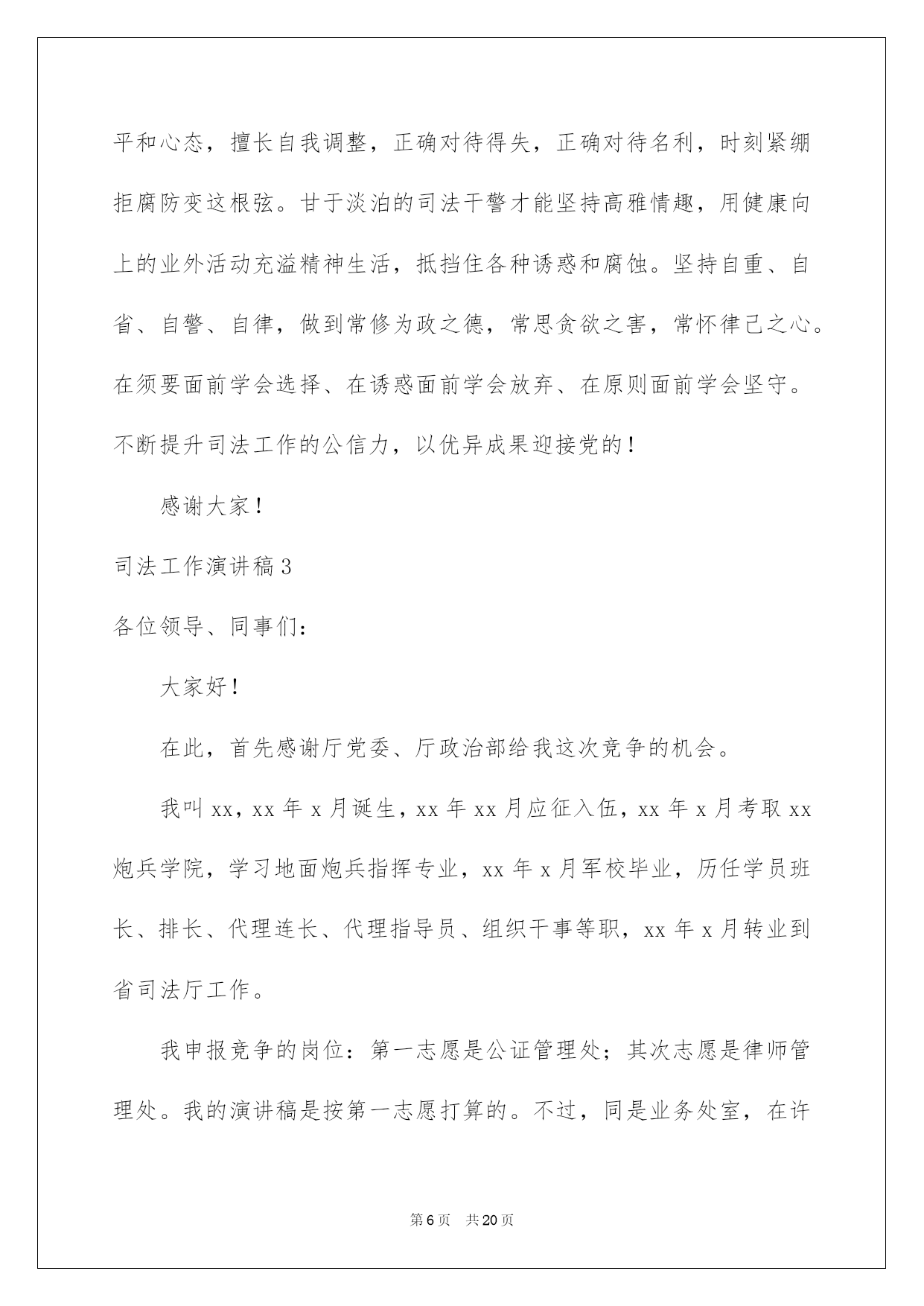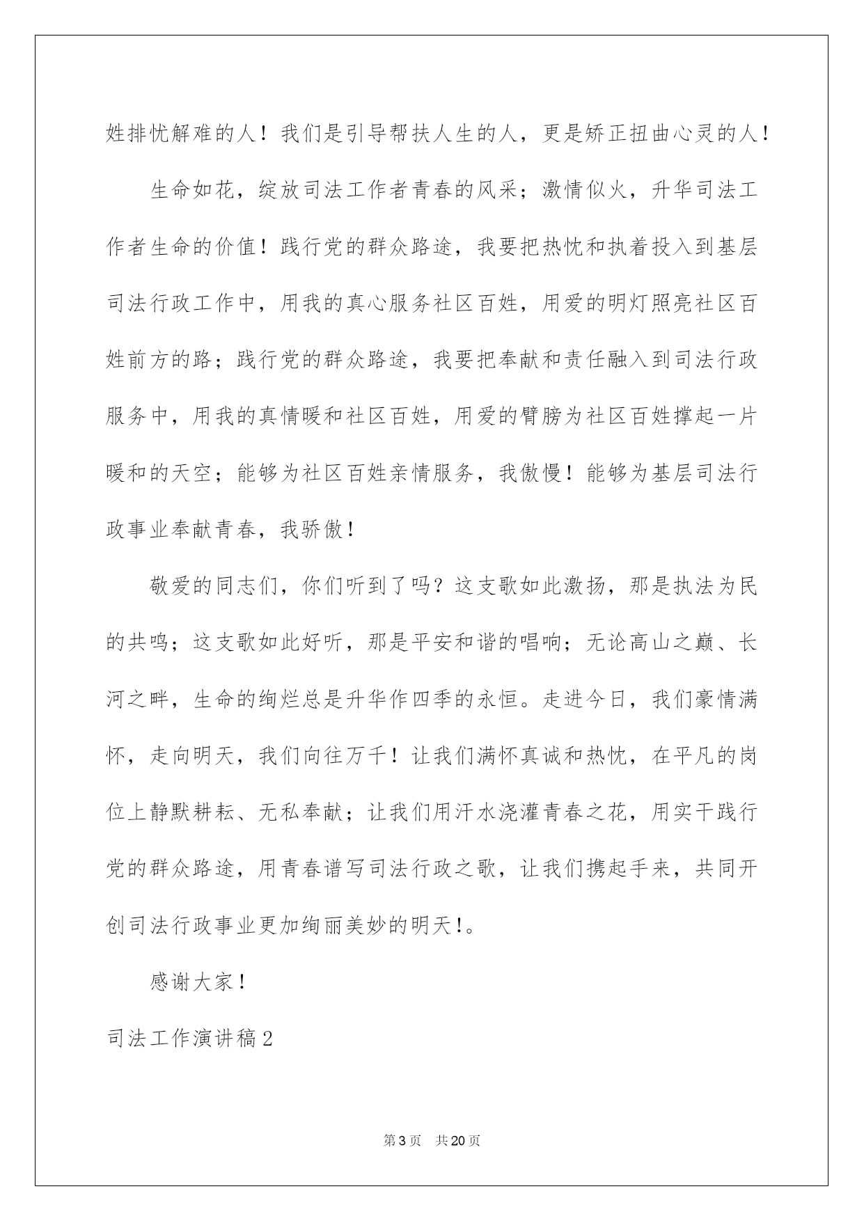 第PAGE\*Arabic\*MERGEFORMAT20页共NUMPAGES\*Arabic\*MERGEFORMAT20页第PAGE\*MERGEFORMAT20页共NUMPAGES\*MERGEFORMAT20页第PAGE\*MERGEFORMAT20页共NUMPAGES\*MERGEFORMAT20页第PAGE\*MERGEFORMAT20页共NUMPAGES\*MERGEFORMAT20页第PAGE\*MERGEFORMAT20页共NUMPAGES\*MERGEFORMAT20页第PAGE\*MERGEFORMAT20页共NUMPAGES\*MERGEFORMAT20页第PAGE\*MERGEFORMAT20页共NUMPAGES\*MERGEFORMAT20页第PAGE\*MERGEFORMAT20页共NUMPAGES\*MERGEFORMAT20页第PAGE\*MERGEFORMAT20页共NUMPAGES\*MERGEFORMAT20页第PAGE\*MERGEFORMAT20页共NUMPAGES\*MERGEFORMAT20页第PAGE\*MERGEFORMAT20页共NUMPAGES\*MERGEFORMAT20页2022司法工作演讲稿司法工作演讲稿5篇演讲稿是作为在特定的情境中供口语表达运用的文稿。在不断进步的社会中,演讲稿在演讲中起到的作用越来越大,信任写演讲稿是一个让很多人都头痛的问题,以下是我为大家收集的司法工作演讲稿,仅供参考,欢迎大家阅读。司法工作演讲稿1敬重的各位领导、评委老师:大家好!我叫王洪飞,是来自__县司法局菜屯司法所的一名基层政法干警。今日我演讲的题目是践行党的群众路途,谱写司法行政之歌。与雄鹰相比,小鸟是渺小的,可它翱翔的心灵却在蓝天上描绘出长风的踪迹;与大海相比,小河是孱弱的,可它奋进的灵魂却在大地见流淌着岁月的清泉。在全国800万党员之中,我有幸从事阳光下最暖和的基层司法行政事业,服务于社区居民百姓,用实干践行党的群众路途,用青春谱写基层司法行政事业之歌。小时候,我们诵读过郑板桥的的两句诗:“些小吾曹州县吏,一枝一叶总关情。”那时还不能完全理解它的内涵。长大后,尤其是走上工作岗位以后,我慢慢懂得了其中的含义,我虽不是什么领导干部,但在基层工作同群众接触过程中也能深深地感受到,我们平常的一举一动都牵动着群众的感情。在司法所工作的两年多时间里,我总被一些人一些事感动着:难遗忘,炎炎烈日下,寒风凛冽中,深化村居百姓家中化解冲突的脚步;难遗忘,喧闹团聚的节日里,热气腾腾的饭桌上撇下自己的子女,投身到制止群体性上访工作一线的身影……当这感人的一幕幕一次又一次真实地呈现在我面前时,我深深地体会到作为一名基层司法工作者的光荣与责任,也更加懂得,群众在你心里有多重,你在群众心里就有多重!或许,我们的工作很琐碎,很平凡,但是当社区百姓须要我们的时候,我们会用最真挚的情感给他们送去暖和;当社区百姓感到无助的时候,我们会尽最大的努力为他们带去希望和力气!而作为一名基层政法干警,我们是心系群众、扎根基层、平凡如水的人,更是胸怀大局,身负重任的人!我们是为人民群众传法解疑的人;是为一般百姓排忧解难的人!我们是引导帮扶人生的人,更是矫正扭曲心灵的人!生命如花,绽放司法工作者青春的风采;激情似火,升华司法工作者生命的价值!践行党的群众路途,我要把热忱和执着投入到基层司法行政工作中,用我的真心服务社区百姓,用爱的明灯照亮社区百姓前方的路;践行党的群众路途,我要把奉献和责任融入到司法行政服务中,用我的真情暖和社区百姓,用爱的臂膀为社区百姓撑起一片暖和的天空;能够为社区百姓亲情服务,我傲慢!能够为基层司法行政事业奉献青春,我骄傲!敬爱的同志们,你们听到了吗?这支歌如此激扬,那是执法为民的共鸣;这支歌如此好听,那是平安和谐的唱响;无论高山之巅、长河之畔,生命的绚烂总是升华作四季的永恒。走进今日,我们豪情满怀,走向明天,我们向往万千!让我们满怀真诚和热忱,在平凡的岗位上静默耕耘、无私奉献;让我们用汗水浇灌青春之花,用实干践行党的群众路途,用青春谱写司法行政之歌,让我们携起手来,共同开创司法行政事业更加绚丽美妙的明天!。感谢大家!司法工作演讲稿2敬重的各位领导、同事们:大家好!我今日演讲的题目是《践行核心价值观,服务兵团司法工作》。当前,面对人民群众日益增加的司法需求、日益困难化的社会冲突纠纷发展形势,如何践行“忠诚、为民、公正、廉洁”的政法核心价值观,培育和造就一支政治坚决、业务过硬、一心为民、公正廉洁的高素养司法干警队伍,是时代给予我们的重要使命。一、践行忠诚核心价