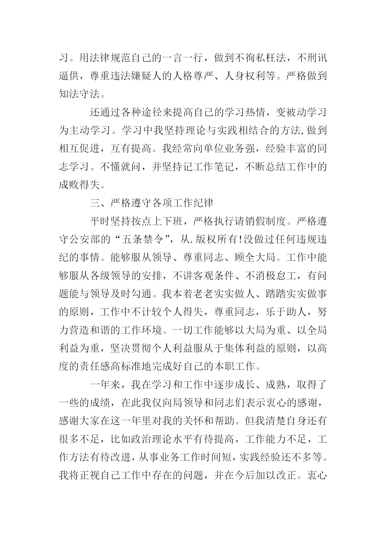 公务员转正工作总结报告篇一:转眼我到单位工作已经快一年了。这一年是我人生旅途中的重要一程,期间在领导的培养帮助、同志们的关心支持下我逐步完成着从象牙塔到政府机关、从大学生到国家公务员这种环境和角色的双重转变和适应。我静心回顾这一年的工作生活,收获颇丰。现将我这一年来的学习工作情况总结如下:一、刻苦学习政治理论,不断提高思想政治素质认真学习马列主义、毛泽东思想、邓小平理论及“三个代表”重要思想;认真学习贯彻党的xx届四中全会精神,站稳政治立场,严守政治纪律。认真学习领会二十次公安工作会议精神,牢记“全心全意为人民服务”的宗旨。积极参加理论学习,坚持到课认真记笔记。通过这些学习不断提高了自身的政治理论水平,丰富了政治头脑。.版权所有!我还郑重的向党组织递交了入党申请书,希望党组织在实践中考验我!虽然我现在还不是一名党员,但我始终以党员标准严格要求自己,自觉学习共产党员先进性教育活动的相关内容,做到思想上始终与党中央保持高度一致。二、认真学习法律、法规,努力钻研业务知识在单位里我结合自己的工作实际,学习了宪法、人民警察法、刑法、行政法、公安机关办理刑事案件程序规定、中华人民共和国治安管理处罚条例等一系列法律法规。在学习中能够突出重点,结合我队的实际工作有针对性的进行学习。用法律规范自己的一言一行,做到不徇私枉法,不刑讯逼供,尊重违法嫌疑人的人格尊严、人身权利等。严格做到知法守法。还通过各种途径来提高自己的学习热情,变被动学习为主动学习。学习中我坚持理论与实践相结合的方法,做到相互促进,互有提高。我经常向单位业务强,经验丰富的同志学习。不懂就问,并坚持记工作笔记,不断总结工作中的成败得失。三、严格遵守各项工作纪律平时坚持按点上下班,严格执行请销假制度。严格遵守公安部的“五条禁令”,从.版权所有!没做过任何违规违纪的事情。能够服从领导、尊重同志、顾全大局。工作中能够服从各级领导的安排,不讲客观条件、不消极怠工,有问题能与领导及时勾通。我本着老老实实做人、踏踏实实做事的原则,工作中不计较个人得失,尊重同志,乐于助人,努力营造和谐的工作环境。一切工作能够以大局为重、以全局利益为重,坚决贯彻个人利益服从于集体利益的原则,以高度的责任感高标准地完成好自己的本职工作。一年来,我在学习和工作中逐步成长、成熟,取得了一些的成绩,在此我仅向局领导和同志们表示衷心的感谢,感谢大家在这一年里对我的关怀和帮助。但我清楚自身还有很多不足,比如政治理论水平有待提高,工作能力不足,工作方法有待改进,从事业务工作时间短,实践经验还不多等。我将正视自己工作中存在的问题,并在今后加以改正。衷心希望领导和同志们继续给予关心和帮助。篇二:x年x月,我通过公务员录用考试被招录到x局,成为一名光荣的国家公务员。一年来,在局领导的言传身教、关心培养下,在同事的支持帮助、密切配合下,我不断加强思想政治学习,对工作精益求精,较为圆满地完成了自己所承担的各项工作任务,个人思想政治素质和业务工作能力都取得了一定的进步,为今后的工作和学习打下了良好的基础,现将具体工作情况总结如下:一、在思想上始终坚持以邓小平理论和“xxxx”重要思想为指导,认真贯彻党的xx大和xx届四中、五中全会精神,认真加强思想政治学习,深入学习一系列重大方针、政策、措施,不断提高自己的政治理论水平,牢固树立全心全意为人民服务的宗旨和正确的世界观、人生观和价值观,强化廉洁自律的自觉性,使思想认识和自身素质都有了新的提高。同时积极向党组织靠拢,并向党组织递交了入党申请书。二、在工作上本着对工作积极、认真、负责的态度,认真遵守各项规章制度,虚心向领导和经验丰富的同志请教,努力学习各项业务知识。能够按照领导的要求参与x监督检查工作和x举报平台的工作,在工作中主义寻找方法,通过不断学习,不断积累,逐步掌握x监督检查的技巧和规律,使工作效率和工作质量有了较大提高,较好地完成了各项工作任务。三、在工作过程中,深深感到加强自身学习、提高自身素质的紧迫性,因此,每天都坚持挤出一定的时间不断充实自己,端正态度,改进方法,广泛汲取各种“营养”。同时向周围的同志学习,始终保持谦虚谨慎、虚心求教的态度,主动向领导、同事们请教,学习他们任劳任怨、求真务实的工作作风和处理问题的方法,努力使自己在尽短的时间内熟悉工作,并把所学的知识运用于实际工作中,在实践中检验所学知识,查找不足,提高自己,防止和克服浅尝辄止、一知半解的倾向。一年来,我在组织、领导和同志们的教育和帮助下取得了一定的成绩,但我深知自己还存在一些缺点和不足,政治理论基础还不够扎实,业务知识还不够全面,工作方式还不够成熟。在今后的工作中,我要努力做到戒骄戒躁,坚定政治信念,加强理论学习,积累经验教训,不断调整自己的思维方式和工