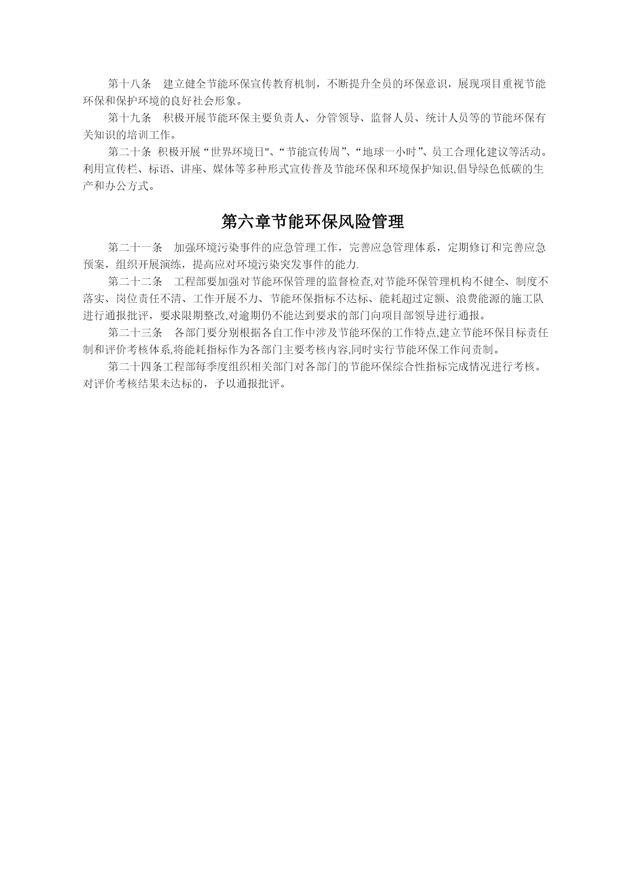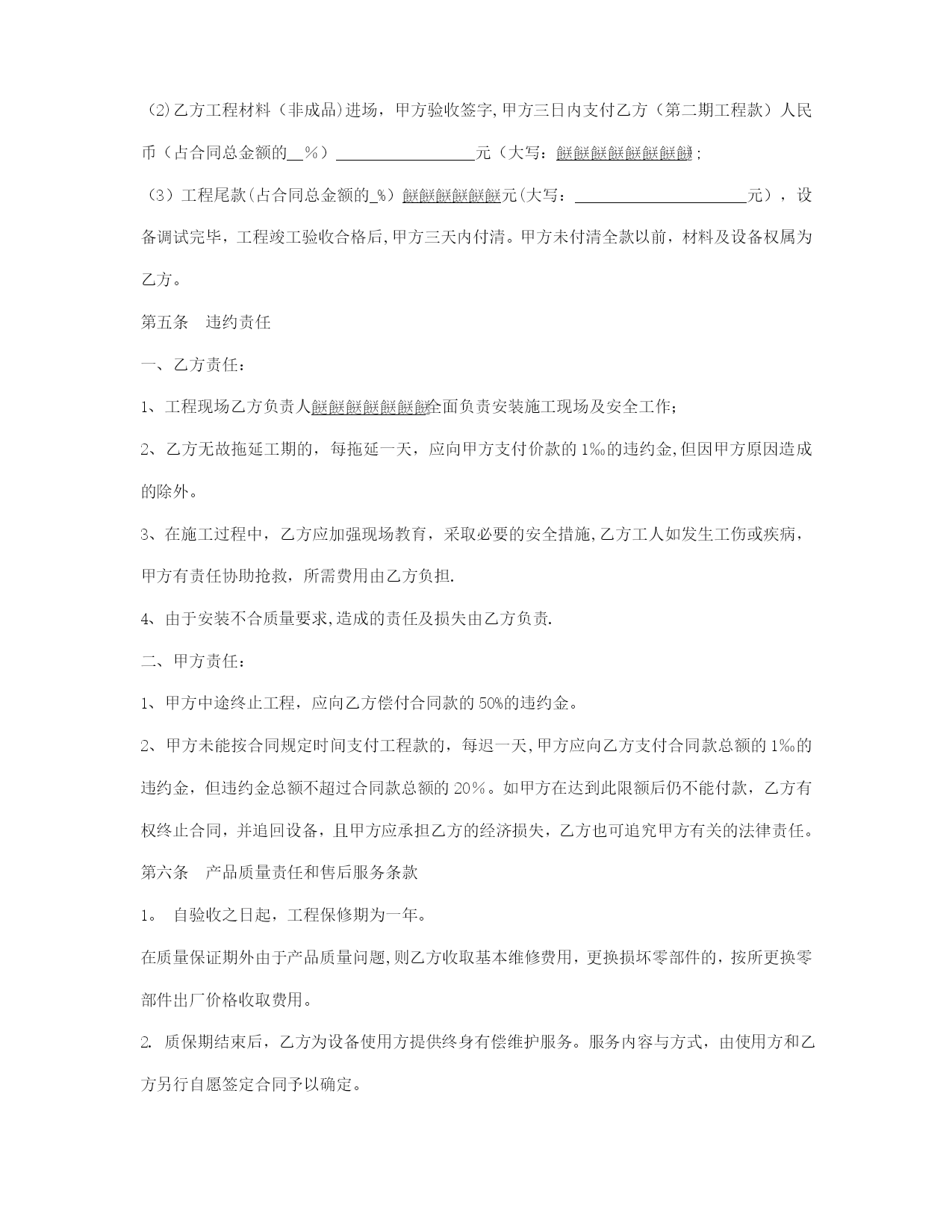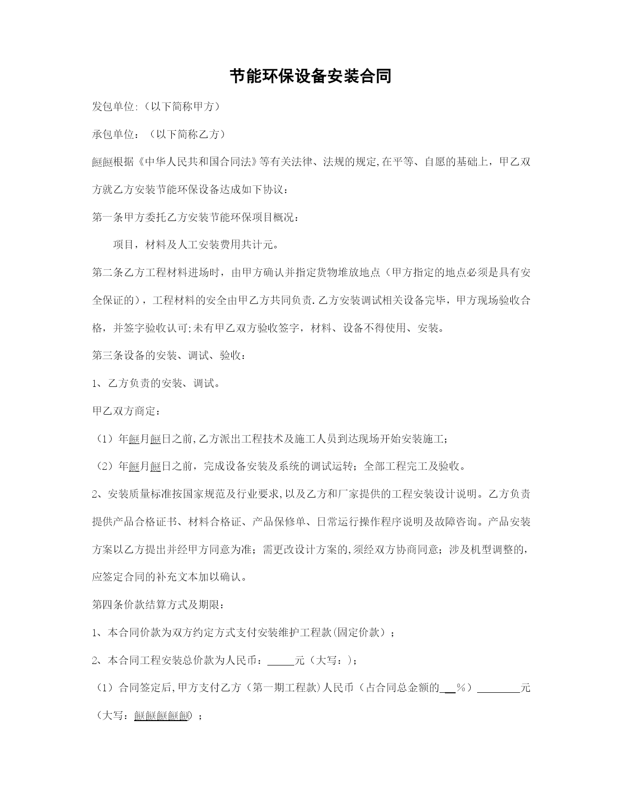 节能环保设备安装项目合同(可以直接使用,可编辑优秀版资料,欢迎下载)节能环保设备安装合同发包单位:(以下简称甲方)承包单位:(以下简称乙方)根据《中华人民共和国合同法》等有关法律、法规的规定,在平等、自愿的基础上,甲乙双方就乙方安装节能环保设备达成如下协议:第一条甲方委托乙方安装节能环保项目概况:项目,材料及人工安装费用共计元。第二条乙方工程材料进场时,由甲方确认并指定货物堆放地点(甲方指定的地点必须是具有安全保证的),工程材料的安全由甲乙方共同负责.乙方安装调试相关设备完毕,甲方现场验收合格,并签字验收认可;未有甲乙双方验收签字,材料、设备不得使用、安装。第三条设备的安装、调试、验收:1、乙方负责的安装、调试。甲乙双方商定:(1)年月日之前,乙方派出工程技术及施工人员到达现场开始安装施工;(2)年月日之前,完成设备安装及系统的调试运转;全部工程完工及验收。2、安装质量标准按国家规范及行业要求,以及乙方和厂家提供的工程安装设计说明。乙方负责提供产品合格证书、材料合格证、产品保修单、日常运行操作程序说明及故障咨询。产品安装方案以乙方提出并经甲方同意为准;需更改设计方案的,须经双方协商同意;涉及机型调整的,应签定合同的补充文本加以确认。第四条价款结算方式及期限:1、本合同价款为双方约定方式支付安装维护工程款(固定价款);2、本合同工程安装总价款为人民币:_____元(大写:);(1)合同签定后,甲方支付乙方(第一期工程款)人民币(占合同总金额的___%)________元(大写:);(2)乙方工程材料(非成品)进场,甲方验收签字,甲方三日内支付乙方(第二期工程款)人民币(占合同总金额的__%)_________________元(大写:);(3)工程尾款(占合同总金额的_%)元(大写:_____________________元),设备调试完毕,工程竣工验收合格后,甲方三天内付清。甲方未付清全款以前,材料及设备权属为乙方。第五条违约责任一、乙方责任:1、工程现场乙方负责人全面负责安装施工现场及安全工作;2、乙方无故拖延工期的,每拖延一天,应向甲方支付价款的1‰的违约金,但因甲方原因造成的除外。3、在施工过程中,乙方应加强现场教育,采取必要的安全措施,乙方工人如发生工伤或疾病,甲方有责任协助抢救,所需费用由乙方负担.4、由于安装不合质量要求,造成的责任及损失由乙方负责.二、甲方责任:1、甲方中途终止工程,应向乙方偿付合同款的50%的违约金。2、甲方未能按合同规定时间支付工程款的,每迟一天,甲方应向乙方支付合同款总额的1‰的违约金,但违约金总额不超过合同款总额的20%。如甲方在达到此限额后仍不能付款,乙方有权终止合同,并追回设备,且甲方应承担乙方的经济损失,乙方也可追究甲方有关的法律责任。第六条产品质量责任和售后服务条款1。自验收之日起,工程保修期为一年。在质量保证期外由于产品质量问题,则乙方收取基本维修费用,更换损坏零部件的,按所更换零部件出厂价格收取费用。2.质保期结束后,乙方为设备使用方提供终身有偿维护服务。服务内容与方式,由使用方和乙方另行自愿签定合同予以确定。第七条因发生不可抗力因素致使合同不能正常履行的,由双方友好协商解决。第八条解决合同纠纷的方式:执行本合同发生的争执,由双方友好协商解决.协商不能解决的,任何一方均可依法向原告所在地人民法院提起诉讼。第九条本合同自双方签字盖章之日起生效.第十条由乙方提交并经甲方确认的本工程的设计图及报价方案说明书及其他文本为本合同附件.第十一条本合同如有其他未尽事宜,可由双方共同协商,作出补充规定,补充规定与本合同具有同等效力。第十二条本合同正本一式二份,甲乙双方各执一份。第十三条合同附件为合同的组成部分,与本合同具有同等法律效力。甲方:(盖章)乙方:(盖章)甲方代表:乙方代表:联系:联系:::单位地址:单位地址:开户银行:开户银行:账号:账号:年月日年月日第一章总则第一条为切实做好项目部节能环保管理工作,加强节能环保管理,提升节能环保综合管理水平,预防和减少环保事故的发生,保障节能环保工作有效开展,特制定本制度。第二条指导思想:致力于建设资源节约型和环境友好型项目,大力推行清洁生产,节约能源及提高能源利用效率,减少污染物排放,保障可持续发展.第三条本制度适于项目部内部用水、用电、用油、用材等能源、资源消耗的管理。第二章节能环保组织建设第四条项目部成立节能环保领导小组,全面部署项目节能环保工作,指导解决工作中的重大问题。第五条项目部节能环保办公室设为工程部,全面负责项目节能环保工作的组织实