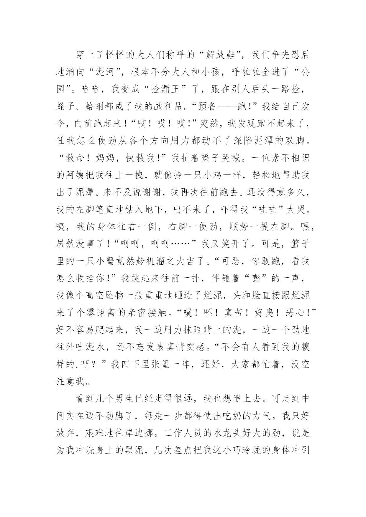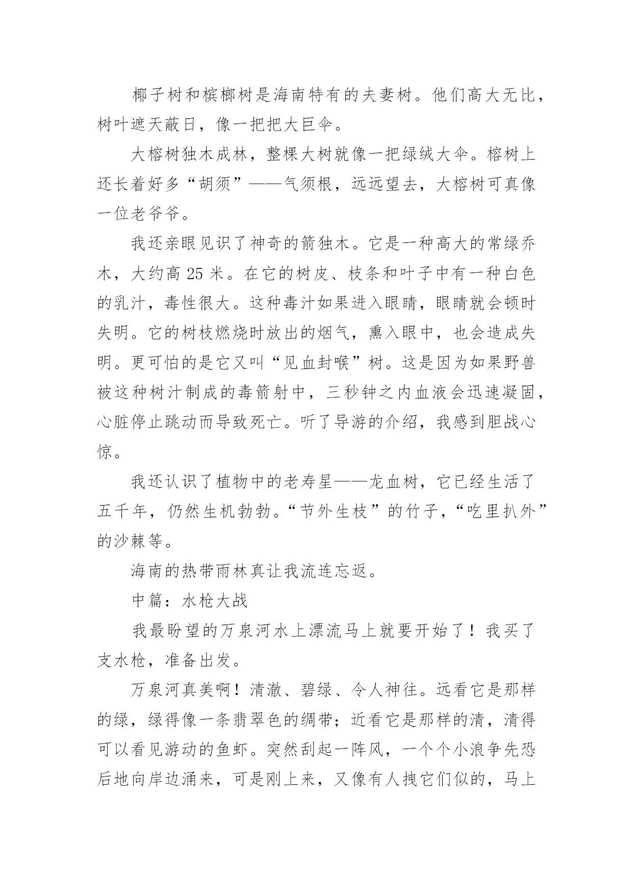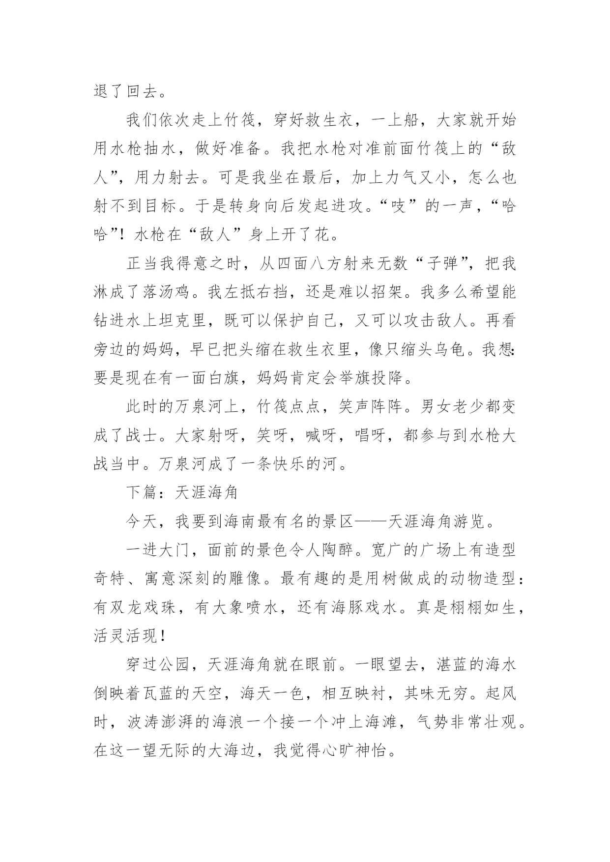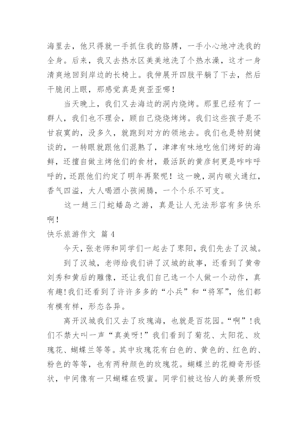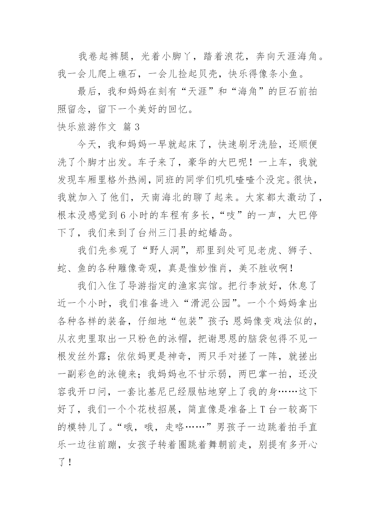 快乐旅游作文【精选】快乐旅游作文四篇在生活、工作和学习中,大家都不可避免地会接触到作文吧,写作文是培养人们的观察力、联想力、想象力、思考力和记忆力的重要手段。还是对作文一筹莫展吗?下面是小编为大家收集的快乐旅游作文4篇,仅供参考,欢迎大家阅读。快乐旅游作文篇1星期二早上六点妈妈就叫醒我,我们动身去旅游。这次旅游我们共去三个景点:白云山,尧山漂流和森海湾水上乐园。旅游中我结识了三个好朋友:阳阳姐姐,瑞瑞和妮妮。第一天我们去登白云山。我和阳阳姐姐走在最前面,第一个登上山顶。尧山漂流很有意思,前半程冷得我牙齿直打哆嗦,后半程我们一起打水仗,玩的有趣极了。森海湾里我们一起游泳,最有意思的是波浪滚滚的大浪。每次大浪来时都把我和阳阳姐姐冲走,就连工作人员也冲起来了。四天的旅游很快就结束了,我玩的很高兴。快乐旅游作文篇2上篇:热带雨林暑假,我有幸去了海南三亚。那里是个海风习习,风景如画的海滨城市。那里的热带雨林可真让我大开眼界。椰子树和槟榔树是海南特有的夫妻树。他们高大无比,树叶遮天蔽日,像一把把大巨伞。大榕树独木成林,整棵大树就像一把绿绒大伞。榕树上还长着好多“胡须”——气须根,远远望去,大榕树可真像一位老爷爷。我还亲眼见识了神奇的箭独木。它是一种高大的常绿乔木,大约高25米。在它的树皮、枝条和叶子中有一种白色的乳汁,毒性很大。这种毒汁如果进入眼睛,眼睛就会顿时失明。它的树枝燃烧时放出的烟气,熏入眼中,也会造成失明。更可怕的是它又叫“见血封喉”树。这是因为如果野兽被这种树汁制成的毒箭射中,三秒钟之内血液会迅速凝固,心脏停止跳动而导致死亡。听了导游的介绍,我感到胆战心惊。我还认识了植物中的老寿星——龙血树,它已经生活了五千年,仍然生机勃勃。“节外生枝”的竹子,“吃里扒外”的沙棘等。海南的热带雨林真让我流连忘返。中篇:水枪大战我最盼望的万泉河水上漂流马上就要开始了!我买了支水枪,准备出发。万泉河真美啊!清澈、碧绿、令人神往。远看它是那样的绿,绿得像一条翡翠色的绸带;近看它是那样的清,清得可以看见游动的鱼虾。突然刮起一阵风,一个个小浪争先恐后地向岸边涌来,可是刚上来,又像有人拽它们似的,马上退了回去。我们依次走上竹筏,穿好救生衣,一上船,大家就开始用水枪抽水,做好准备。我把水枪对准前面竹筏上的“敌人”,用力射去。可是我坐在最后,加上力气又小,怎么也射不到目标。于是转身向后发起进攻。“吱”的一声,“哈哈”!水枪在“敌人”身上开了花。正当我得意之时,从四面八方射来无数“子弹”,把我淋成了落汤鸡。我左抵右挡,还是难以招架。我多么希望能钻进水上坦克里,既可以保护自己,又可以攻击敌人。再看旁边的妈妈,早已把头缩在救生衣里,像只缩头乌龟。我想:要是现在有一面白旗,妈妈肯定会举旗投降。此时的万泉河上,竹筏点点,笑声阵阵。男女老少都变成了战士。大家射呀,笑呀,喊呀,唱呀,都参与到水枪大战当中。万泉河成了一条快乐的河。下篇:天涯海角今天,我要到海南最有名的景区——天涯海角游览。一进大门,面前的景色令人陶醉。宽广的广场上有造型奇特、寓意深刻的雕像。最有趣的是用树做成的动物造型:有双龙戏珠,有大象喷水,还有海豚戏水。真是栩栩如生,活灵活现!穿过公园,天涯海角就在眼前。一眼望去,湛蓝的海水倒映着瓦蓝的天空,海天一色,相互映衬,其味无穷。起风时,波涛澎湃的海浪一个接一个冲上海滩,气势非常壮观。在这一望无际的大海边,我觉得心旷神怡。我卷起裤腿,光着小脚丫,踏着浪花,奔向天涯海角。我一会儿爬上礁石,一会儿捡起贝壳,快乐得像条小鱼。最后,我和妈妈在刻有“天涯”和“海角”的巨石前拍照留念,留下一个美好的回忆。快乐旅游作文篇3今天,我和妈妈一早就起床了,快速刷牙洗脸,还顺便洗了个脚才出发。车子来了,豪华的大巴呢!一上车,我就发现车厢里格外热闹,同班的同学们叽叽喳喳个没完。很快,我就加入了他们,天南海北的聊了起来。大家都太激动了,根本没感觉到6小时的车程有多长,“吱”的一声,大巴停下了,我们来到了台州三门县的蛇蟠岛。我们先参观了“野人洞”,那里到处可见老虎、狮子、蛇、鱼的各种雕像奇观,真是惟妙惟肖,美不胜收啊!我们入住了导游指定的渔家宾馆。把行李放好,休息了近一个小时,我们准备进入“滑泥公园”。一个个妈妈拿出各种各样的装备,仔细地“包装”孩子:恩妈像变戏法似的,从衣兜里取出一只粉色的泳帽,把谢思恩的脑袋包得不见一根发丝外露;依依妈更是神奇,两只手对搓了一阵,就搓出一副彩色的泳镜来;我妈妈也不甘示弱,两巴掌一拍,还没容我开口问,一套比基尼已经服帖地穿上了我的身……这下好了,我们一个个花枝招展,简直像是准备上T台一较高下的模特儿了。“哦,哦,走咯……”男孩子一边跳着拍手直乐一边往前蹦,女孩子转着圈跳着舞朝前走,别提有多开心了!穿上了怪怪的大人们称呼的“解放鞋”,我们争先恐后地涌向“