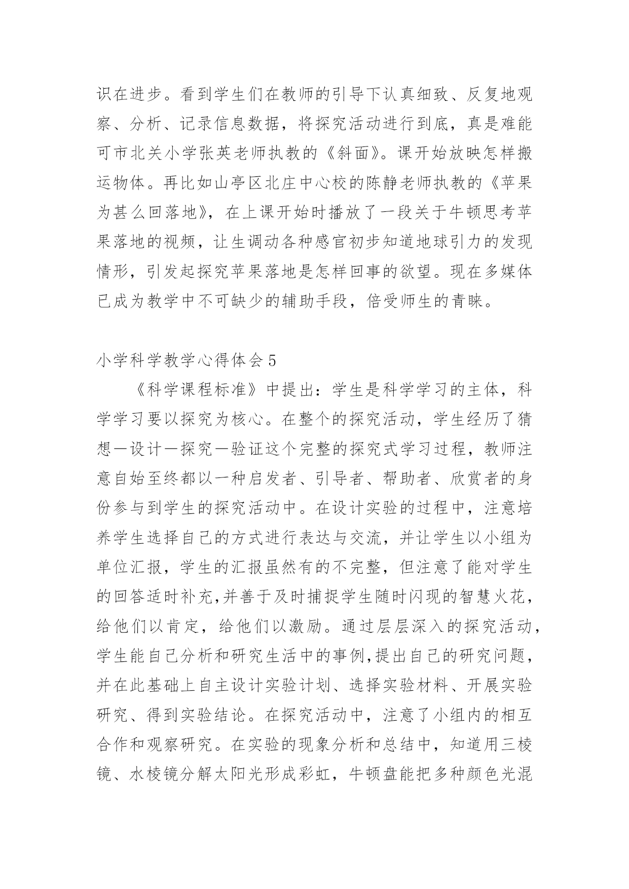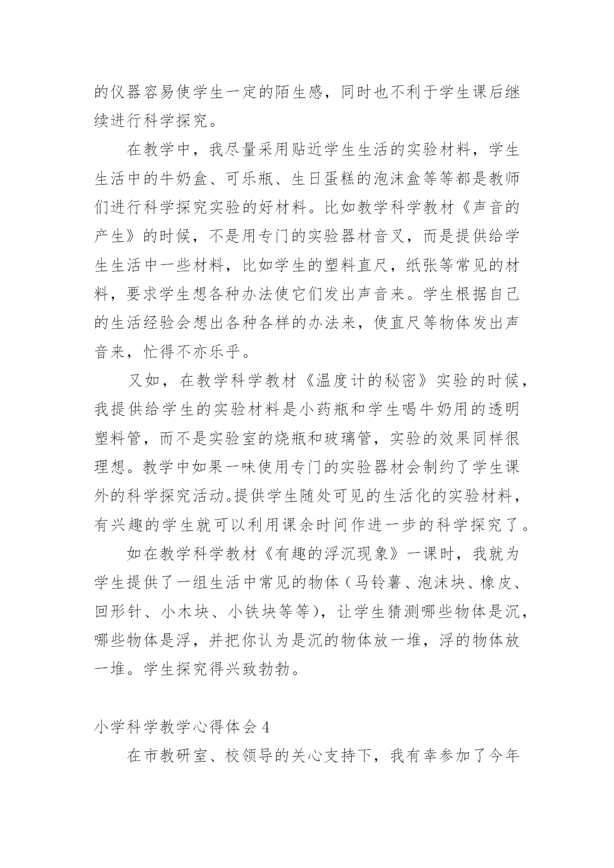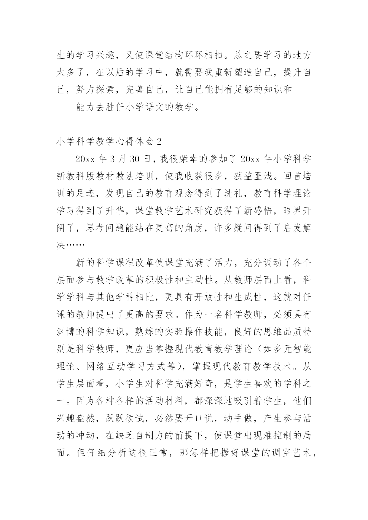 小学科学教学心得体会我们在一些事情上受到启发后,可用写心得体会的方式将其记录下来,这样就可以通过不断总结,丰富我们的思想。那么心得体会怎么写才能感染读者呢?以下是小编为大家收集的小学科学教学心得体会,希望对大家有所帮助。小学科学教学心得体会1这次国培我有幸看到老师们绘声绘色的精彩课堂,使我受益匪浅,课堂教学中,体现了以下几个优点:一、教学目标明确语文教学的总目标是:使学生具有适应实际需要的识字写字能力、阅读能力、写作能力、口语交际能力、发展学生的智力,培养学生的情操。每节课的教学目标是这总目标的一部分。语文教学过程是一个训练的过程,包括字、词、句、段、篇和听、说、读、写的基本功训练。落实“知识与能力、方法与过程、情感态度与价值观”三维教学目标是新课程标准对一节语文课的基本要求。上一堂课,教师首先要做到教学目标明确,语文基本功训练的目标明确,传授那些知识,进行那些语文基本功训练,每一项知识、训练达到什么程度,都应十分明确、具体。读、围绕目标,展开教学活动,落实读写训练。二、新课程概念在课堂上得到了充分体现。1、重视了学生的朗读教学,提倡多角度、有创意的阅读,还有范读、指导读等,在读中悟,悟中读,解决一些浅显的问题,找出自己疑惑得地方??利用阅读拓展思维空间,提高了阅读质量,也加强了学生阅读理解的能力。2、老师注重培养了学生的理解能力、语感能力和思维能力。谭雪梅老师在《只有一个地球》一文结尾中抑扬顿挫的朗读和激情昂扬的总结,到现在让人记忆犹新,人物形象活灵活现的展现在眼前。每位教师都在学生读完课文后,留给学生自由发言的时间,说说自己读懂了什么,感悟到了什么?学生不明白的问题都创设思考的空间和气氛,给学生思考的机会,让学生自主探究合作学习,培养了他们的思维能力和语言的表达能力。注重了培养学生运用语言、积累语言的能力,语言训练严格扎实。三、教学过程,要能重点突出,难点突破,体现语文学科的特点,培养学生的语文素养。1、删繁就重,从容指导。以前我存在这样一些教学误区:总感觉一堂课给我的时间不够,时间到了却还有好多的内容没有传达给学生,其实这样的认识是错误的,并不是给你的时间不够,而是你没有充分利用好和把握好时间。一堂成功的语文课,并不在于老师讲了多少,而在于学生在你这堂课上他掌握了多少、吸收了多少?而我们很多老师常犯一些认识性错误。所以我认为应删去很多多余的知识,做到敢于有所放弃。格式塔心理学家认为:我们每一个人都有一种追求“简洁”的心理,同样在课堂教学中,教师确定教学目标时,即应充分体现“简洁”的原则,选取较小的切入点,使自己的讲课有章有法,“以小见大”,突出重点。2、使用多媒体,以“趣”带“动”以培养学生学习的“兴趣”带动学生“主动”学习。爱因斯坦说:“兴趣是最好的老师。”古人云,知之者,不如好知者;好知者,不如乐知者。我个人认为我的教学总目标就是一个“趣”字,而不是灌输式或填压式的教学模式。一堂成功的语文课还在于学生是否有兴趣学。“趣”贯穿于整个课堂,教师利用多媒体,形象直观的呈现课文内容,学的人是否乐“趣”,就要看你的教学策略问题,然而其终极目标就是达到读、说、写的能力。如果你的教学方法一成不变,千篇1律,那么这时学生对你,对这门课的兴趣就会减弱感到语文学习的枯燥乏味,久而久之就会反感。这时就需要老师不断的转变教学方法,提高学生的学习兴趣。3、教学过程中,还注重培养了学生创新思维的培养。在“读”“练”环节中,培养创新精神。“读”“练”的就是学生自主的学习活动。教师善于引导,学生大胆质疑,对问题敢于求异创新,提出自己的独生简介见解,培养学生的创新精神。四、课堂中,鼓励性语言的使用和积极评价的效果。五、教学艺术。通过这次学习,我深刻地感受到了语文教学的魅力所在,尤其是多媒体设计教学的效果既创设了教学情景,激发了学生的学习兴趣,又使课堂结构环环相扣。总之要学习的地方太多了,在以后的学习中,就需要我重新塑造自己,提升自己,努力探索,完善自己,让自己能拥有足够的知识和能力去胜任小学语文的教学。小学科学教学心得体会220xx年3月30日,我很荣幸的参加了20xx年小学科学新教科版教材教法培训,使我收获很多,获益匪浅。回首培训的足迹,发现自己的教育观念得到了洗礼,教育科学理论学习得到了升华,课堂教学艺术研究获得了新感悟,眼界开阔了,思考问题能站在更高的角度,许多疑问得到了启发解决……新的科学课程改革使课堂充满了活力,充分调动了各个层面参与教学改革的积极性和主动性。从教师层面上看,科学学科与其他学科相比,更具有开放性和生成性,这就对任课的教师提出了更高的要求。作为一名科学教师,必须具有渊博的科学知识,熟练的实验操作技能,良好的思维品质特别是科学教师,更应当掌握现代教育教学理论(如多元智能理论、网络互动学习方式等),掌握现代教育教学技术。从学生