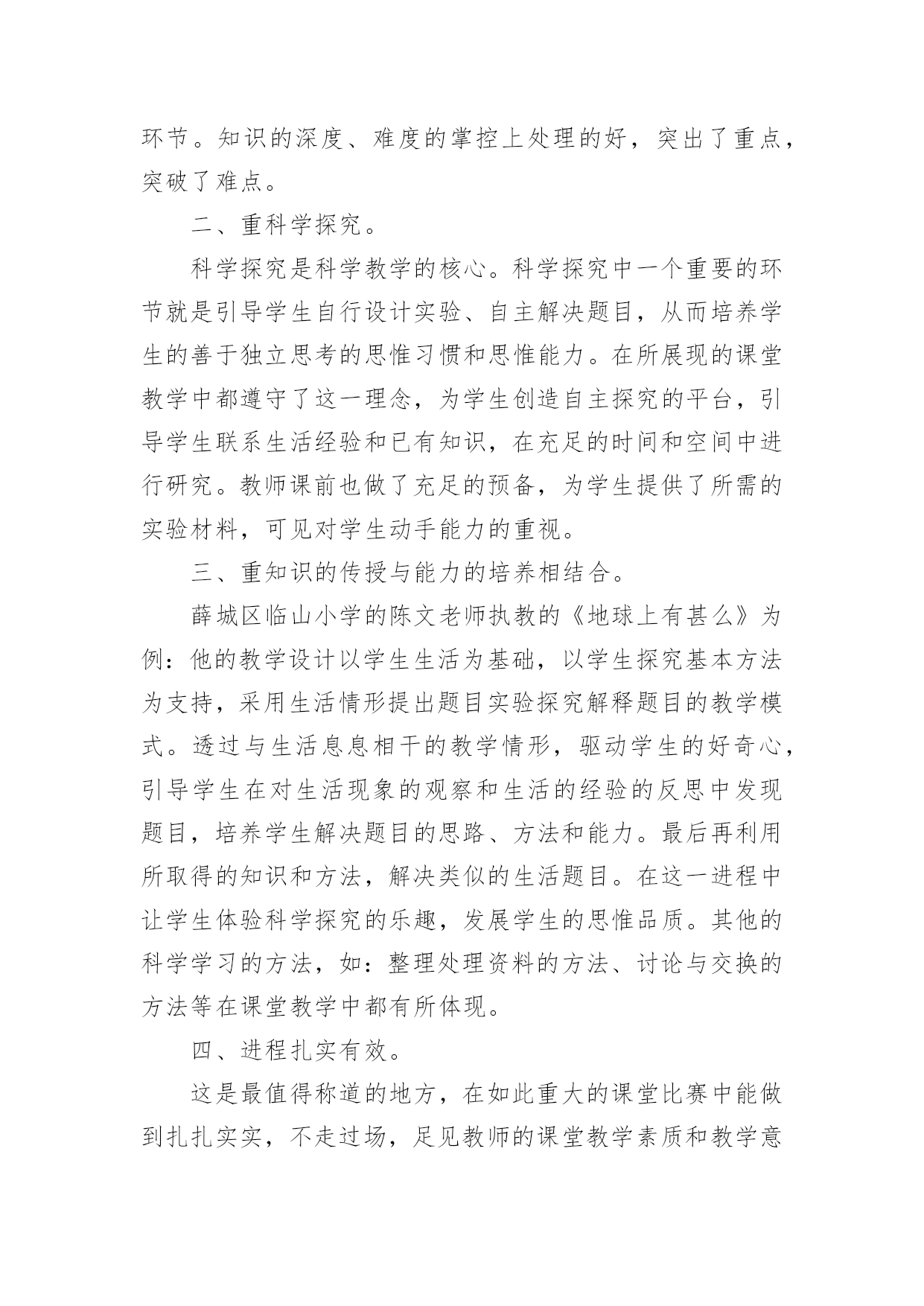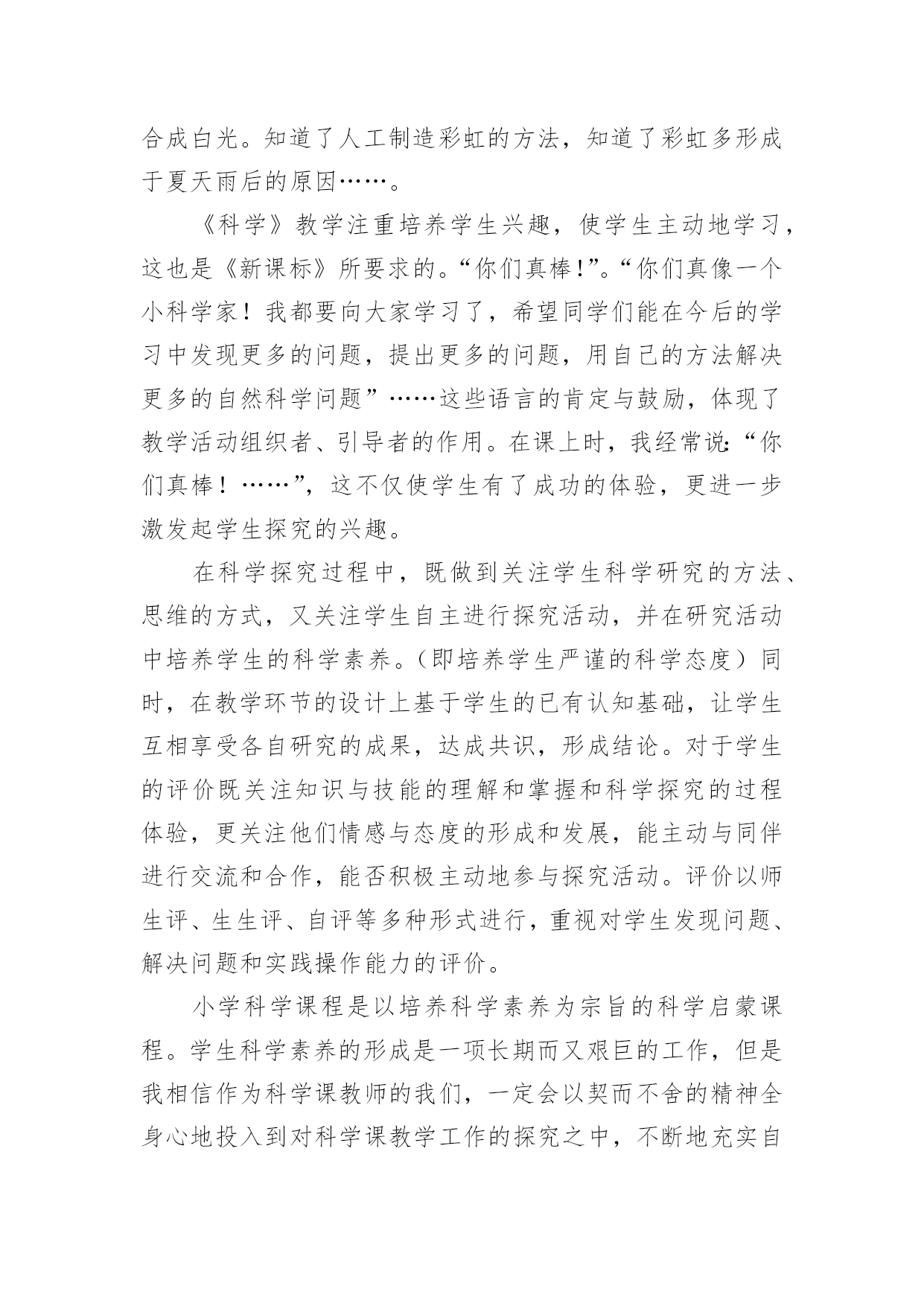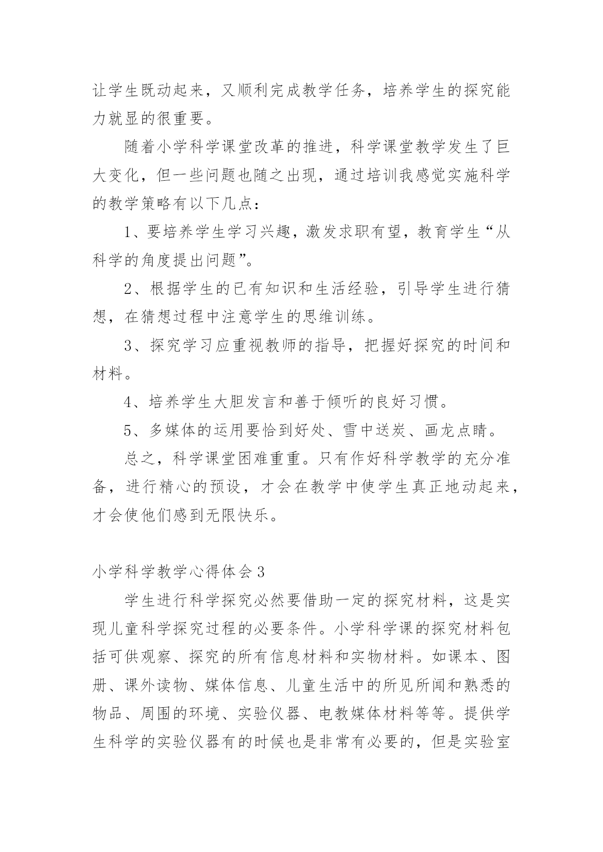 小学科学教学心得体会我们在一些事情上受到启发后,可用写心得体会的方式将其记录下来,这样就可以通过不断总结,丰富我们的思想。那么心得体会怎么写才能感染读者呢?以下是小编为大家收集的小学科学教学心得体会,希望对大家有所帮助。小学科学教学心得体会1这次国培我有幸看到老师们绘声绘色的精彩课堂,使我受益匪浅,课堂教学中,体现了以下几个优点:一、教学目标明确语文教学的总目标是:使学生具有适应实际需要的识字写字能力、阅读能力、写作能力、口语交际能力、发展学生的智力,培养学生的情操。每节课的教学目标是这总目标的一部分。语文教学过程是一个训练的过程,包括字、词、句、段、篇和听、说、读、写的基本功训练。落实“知识与能力、方法与过程、情感态度与价值观”三维教学目标是新课程标准对一节语文课的基本要求。上一堂课,教师首先要做到教学目标明确,语文基本功训练的目标明确,传授那些知识,进行那些语文基本功训练,每一项知识、训练达到什么程度,都应十分明确、具体。读、围绕目标,展开教学活动,落实读写训练。二、新课程概念在课堂上得到了充分体现。1、重视了学生的朗读教学,提倡多角度、有创意的阅读,还有范读、指导读等,在读中悟,悟中读,解决一些浅显的问题,找出自己疑惑得地方??利用阅读拓展思维空间,提高了阅读质量,也加强了学生阅读理解的能力。2、老师注重培养了学生的理解能力、语感能力和思维能力。谭雪梅老师在《只有一个地球》一文结尾中抑扬顿挫的朗读和激情昂扬的总结,到现在让人记忆犹新,人物形象活灵活现的展现在眼前。每位教师都在学生读完课文后,留给学生自由发言的时间,说说自己读懂了什么,感悟到了什么?学生不明白的问题都创设思考的空间和气氛,给学生思考的机会,让学生自主探究合作学习,培养了他们的思维能力和语言的表达能力。注重了培养学生运用语言、积累语言的能力,语言训练严格扎实。三、教学过程,要能重点突出,难点突破,体现语文学科的特点,培养学生的语文素养。1、删繁就重,从容指导。以前我存在这样一些教学误区:总感觉一堂课给我的时间不够,时间到了却还有好多的内容没有传达给学生,其实这样的认识是错误的,并不是给你的时间不够,而是你没有充分利用好和把握好时间。一堂成功的语文课,并不在于老师讲了多少,而在于学生在你这堂课上他掌握了多少、吸收了多少?而我们很多老师常犯一些认识性错误。所以我认为应删去很多多余的知识,做到敢于有所放弃。格式塔心理学家认为:我们每一个人都有一种追求“简洁”的心理,同样在课堂教学中,教师确定教学目标时,即应充分体现“简洁”的原则,选取较小的切入点,使自己的讲课有章有法,“以小见大”,突出重点。2、使用多媒体,以“趣”带“动”以培养学生学习的“兴趣”带动学生“主动”学习。爱因斯坦说:“兴趣是最好的老师。”古人云,知之者,不如好知者;好知者,不如乐知者。我个人认为我的教学总目标就是一个“趣”字,而不是灌输式或填压式的教学模式。一堂成功的语文课还在于学生是否有兴趣学。“趣”贯穿于整个课堂,教师利用多媒体,形象直观的呈现课文内容,学的人是否乐“趣”,就要看你的教学策略问题,然而其终极目标就是达到读、说、写的能力。如果你的教学方法一成不变,千篇1律,那么这时学生对你,对这门课的兴趣就会减弱感到语文学习的枯燥乏味,久而久之就会反感。这时就需要老师不断的转变教学方法,提高学生的学习兴趣。3、教学过程中,还注重培养了学生创新思维的培养。在“读”“练”环节中,培养创新精神。“读”“练”的就是学生自主的学习活动。教师善于引导,学生大胆质疑,对问题敢于求异创新,提出自己的独生简介见解,培养学生的创新精神。四、课堂中,鼓励性语言的使用和积极评价的效果。五、教学艺术。通过这次学习,我深刻地感受到了语文教学的魅力所在,尤其是多媒体设计教学的效果既创设了教学情景,激发了学生的学习兴趣,又使课堂结构环环相扣。总之要学习的地方太多了,在以后的学习中,就需要我重新塑造自己,提升自己,努力探索,完善自己,让自己能拥有足够的知识和能力去胜任小学语文的教学。小学科学教学心得体会220xx年3月30日,我很荣幸的参加了20xx年小学科学新教科版教材教法培训,使我收获很多,获益匪浅。回首培训的足迹,发现自己的教育观念得到了洗礼,教育科学理论学习得到了升华,课堂教学艺术研究获得了新感悟,眼界开阔了,思考问题能站在更高的角度,许多疑问得到了启发解决……新的科学课程改革使课堂充满了活力,充分调动了各个层面参与教学改革的积极性和主动性。从教师层面上看,科学学科与其他学科相比,更具有开放性和生成性,这就对任课的教师提出了更高的要求。作为一名科学教师,必须具有渊博的科学知识,熟练的实验操作技能,良好的思维品质特别是科学教师,更应当掌握现代教育教学理论(如多元智能理论、网络互动学习方式等),掌握现代教育教学技术。从学生