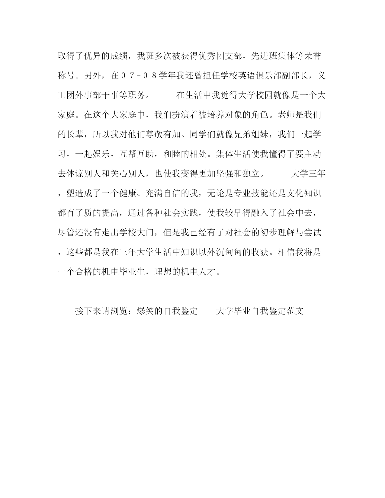 PAGE此资料由网络收集而来,如有侵权请告知上传者立即删除。资料共分享,我们负责传递知识。2020机电大学生自我鉴定大学生一般都会被要求做大学三年自我鉴定,既然是大学生,那么大学生的自我鉴定的要求就会更高,下面我们就去参考一下2020机电大学生自我鉴定的范文,希望对您有帮助,欢迎浏览。在大学三年这个重要阶段,我经历了身心成熟和知识的积累,生活过得充实而有意义。我抱着“全力以赴,做到最好”的宗旨思想品质,知识水平、工作能力方面都有了很大的提高在思想上我不断用先进的理论武装自己的头脑,热爱祖国,拥护中国共产党的领导,坚持四项基本原则;自觉遵守《学生行为准则》和学校规则制度,尊敬师长,团结同学,关系集体;思想上和行动上与党中央保持一致,积极主动地向党组织靠拢并被评为学校入党积极份子.学习方面,我觉得大学生的首要任务还是学好知识,所以在学习上我踏踏实实,一点也不放松,并取得了优异的成绩,获学校07-08学年二等奖学金,国家励志奖学金。但对于我们机电专业的学生来说,光光学好书本上的知识是远远不够的。于是我利用课余时间经常阅览机电类的书籍,并参加了一些机电专业的技能考证,获得了电工中级,数控车中级证书。在工作方面,在大学三年里我始终担任班里的团支部书记。在职期间我认真地传达上级团组织的决议和指示,结合班级具体情况认真地开展工作。并积极协助其他班干认真做好班级管理工作,取得了优异的成绩,我班多次被获得优秀团支部,先进班集体等荣誉称号。另外,在07-08学年我还曾担任学校英语俱乐部副部长,义工团外事部干事等职务。在生活中我觉得大学校园就像是一个大家庭。在这个大家庭中,我们扮演着被培养对象的角色。老师是我们的长辈,所以我对他们尊敬有加。同学们就像兄弟姐妹,我们一起学习,一起娱乐,互帮互助,和睦的相处。集体生活使我懂得了要主动去体谅别人和关心别人,也使我变得更加坚强和独立。大学三年,塑造成了一个健康、充满自信的我,无论是专业技能还是文化知识都有了质的提高,通过各种社会实践,使我较早得融入了社会中去,尽管还没有走出学校大门,但是我已经有了对社会的初步理解与尝试,这些都是我在三年大学生活中知识以外沉甸甸的收获。相信我将是一个合格的机电毕业生,理想的机电人才。接下来请浏览:爆笑的自我鉴定大学毕业自我鉴定范文