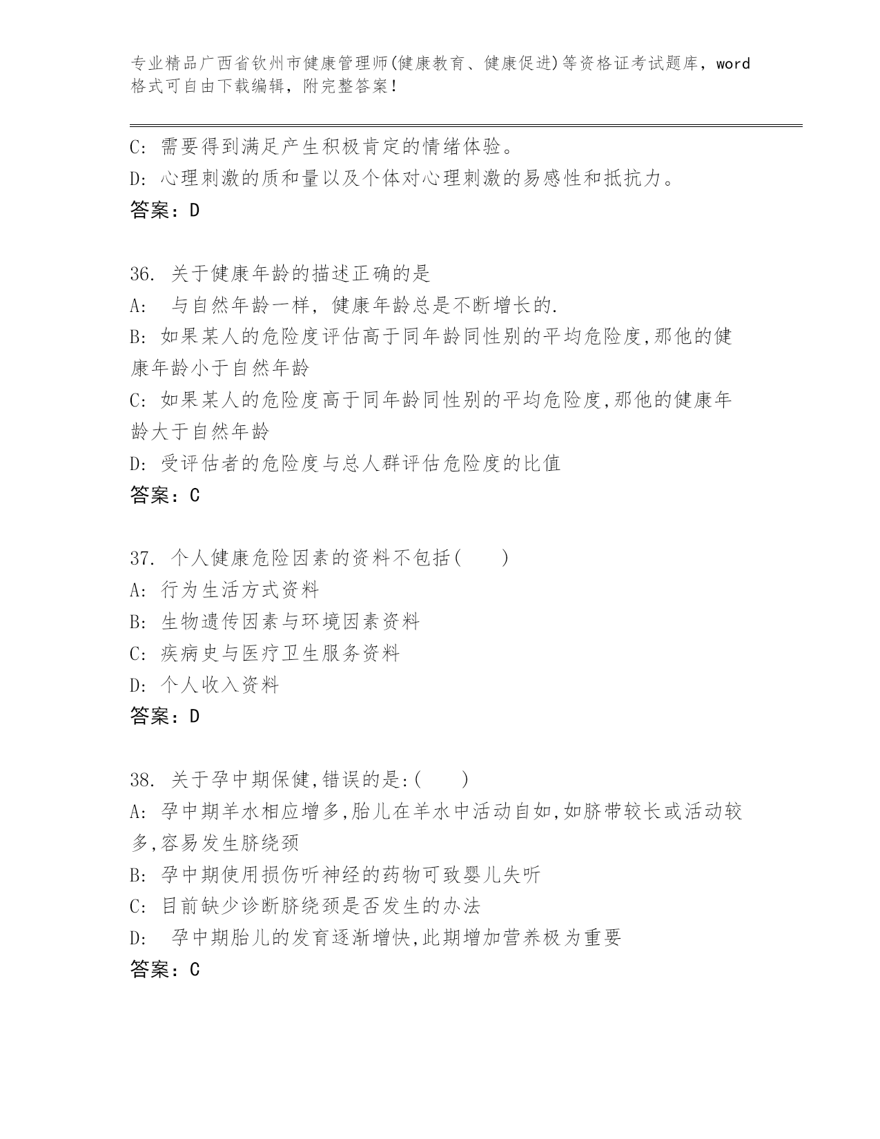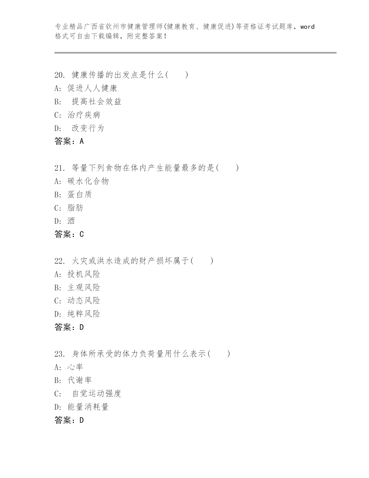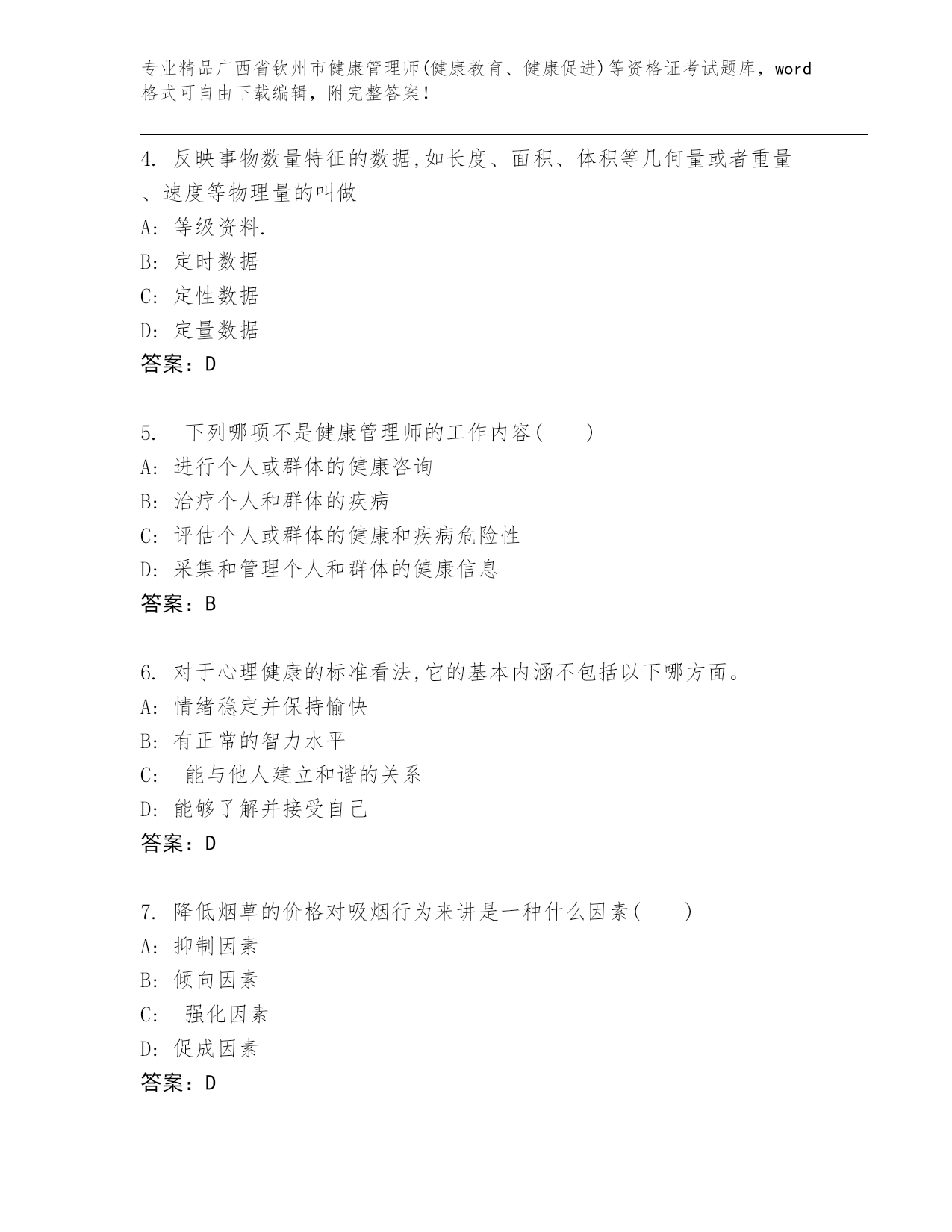 精编广西省钦州市健康管理师(健康教育、健康促进)等资格证考试(黄金题型).docx