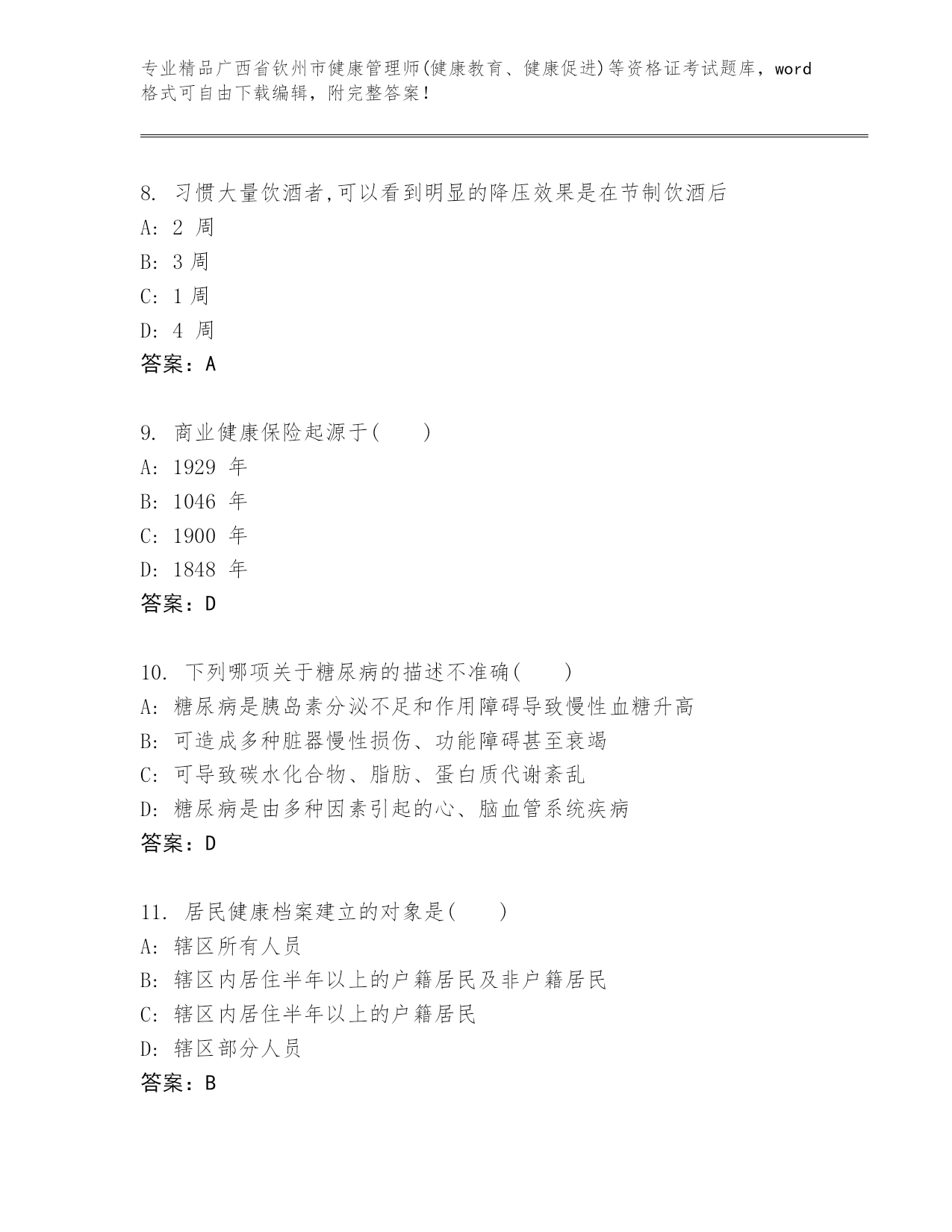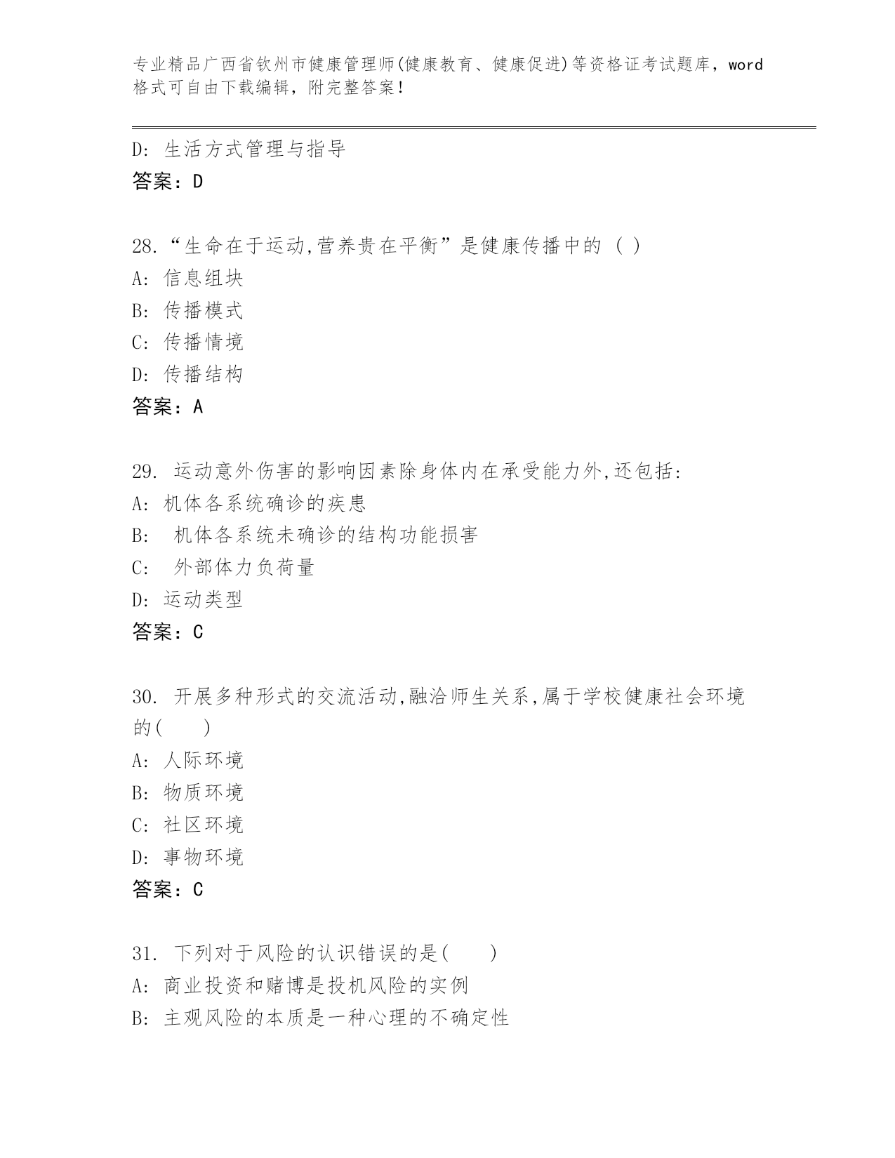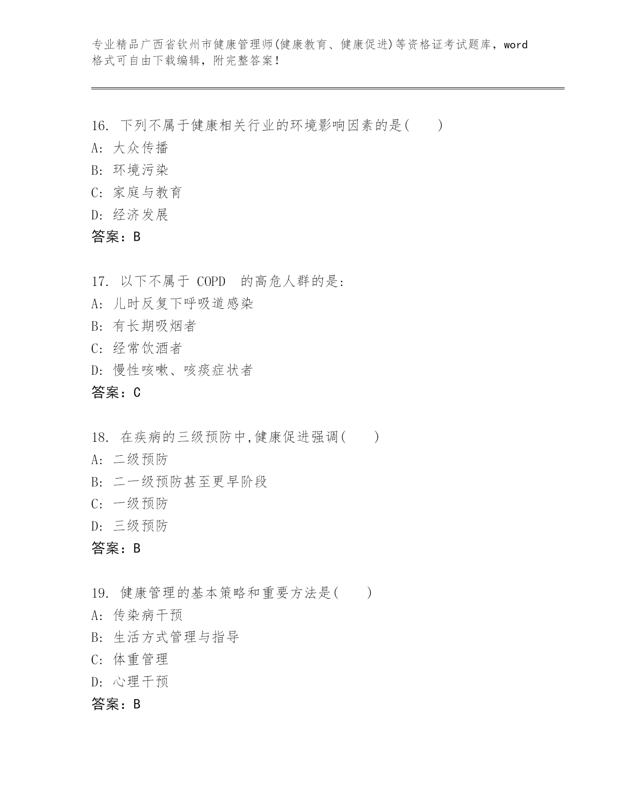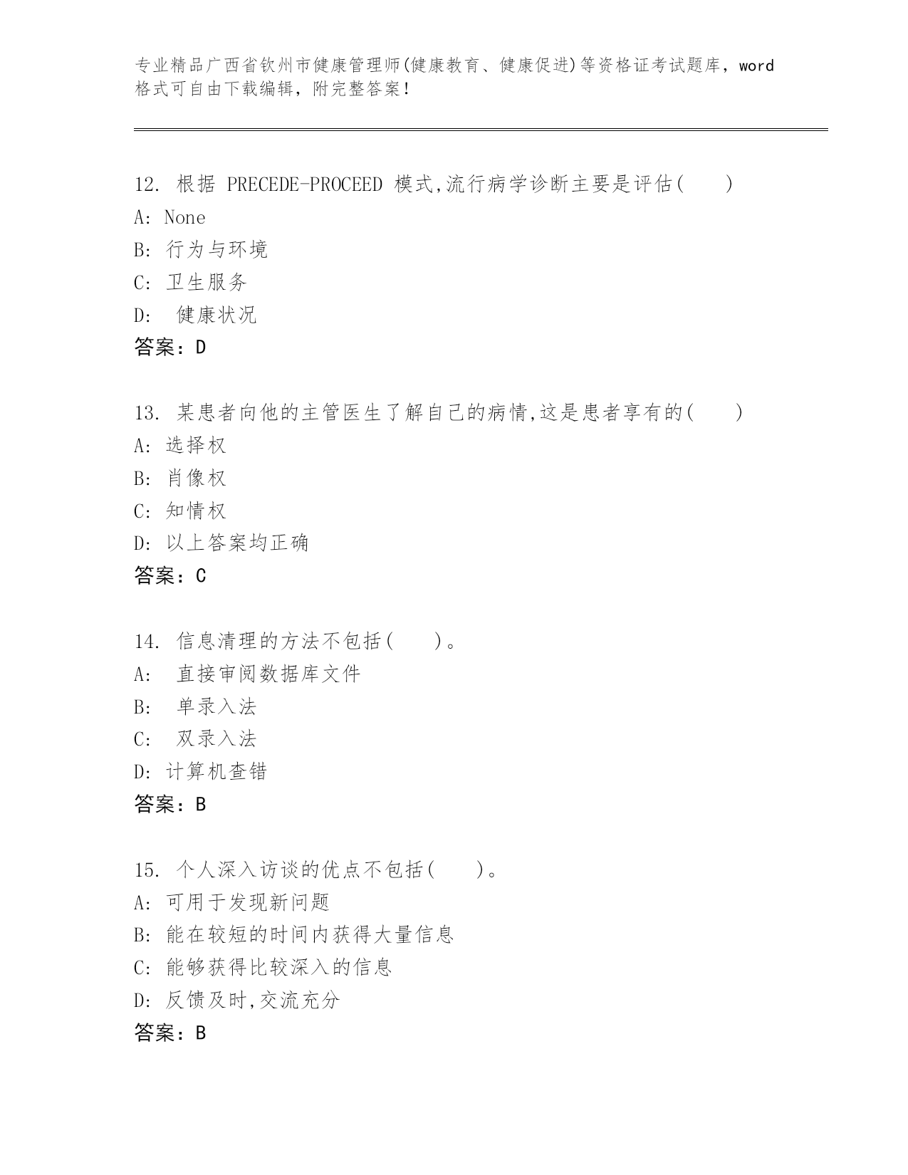 精编广西省钦州市健康管理师(健康教育、健康促进)等资格证考试(黄金题型)