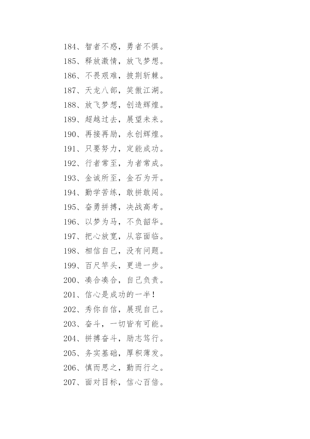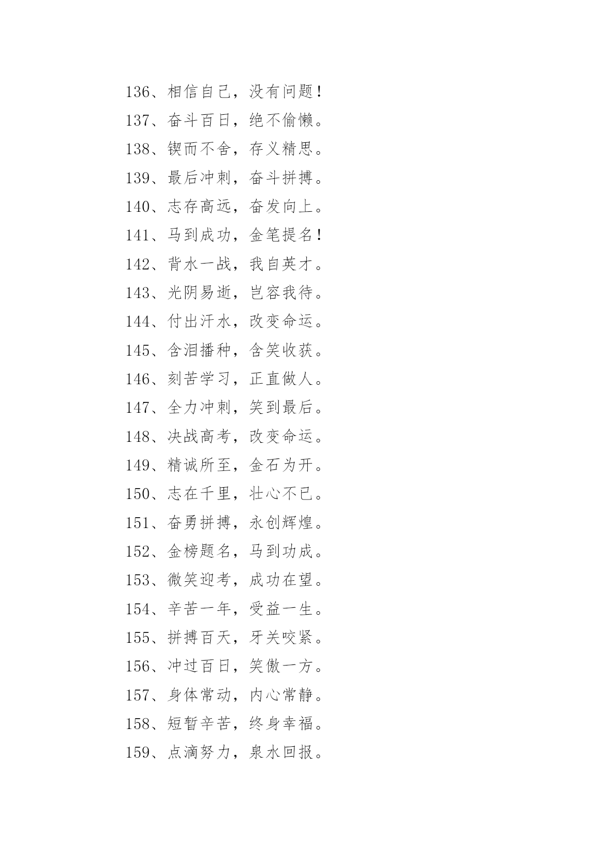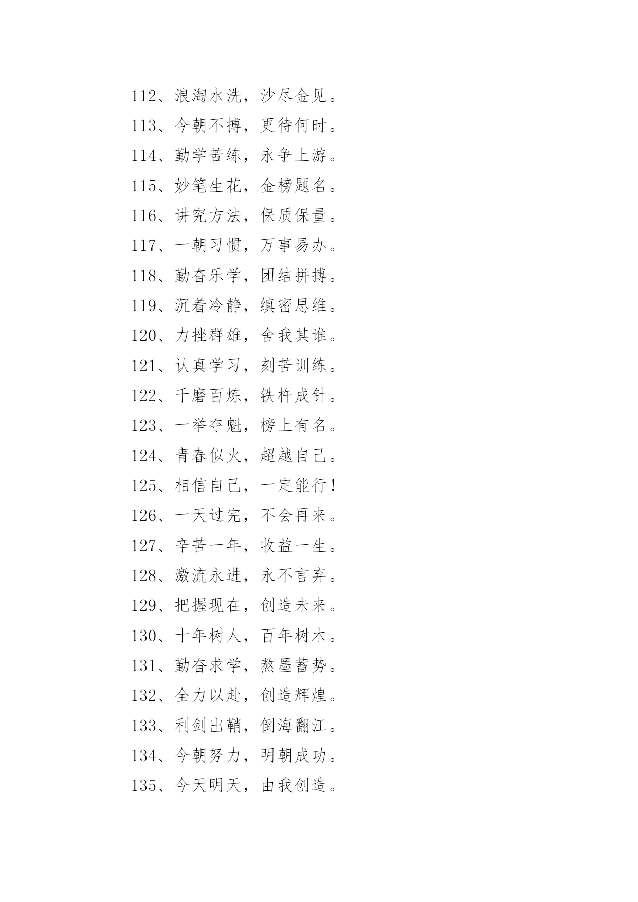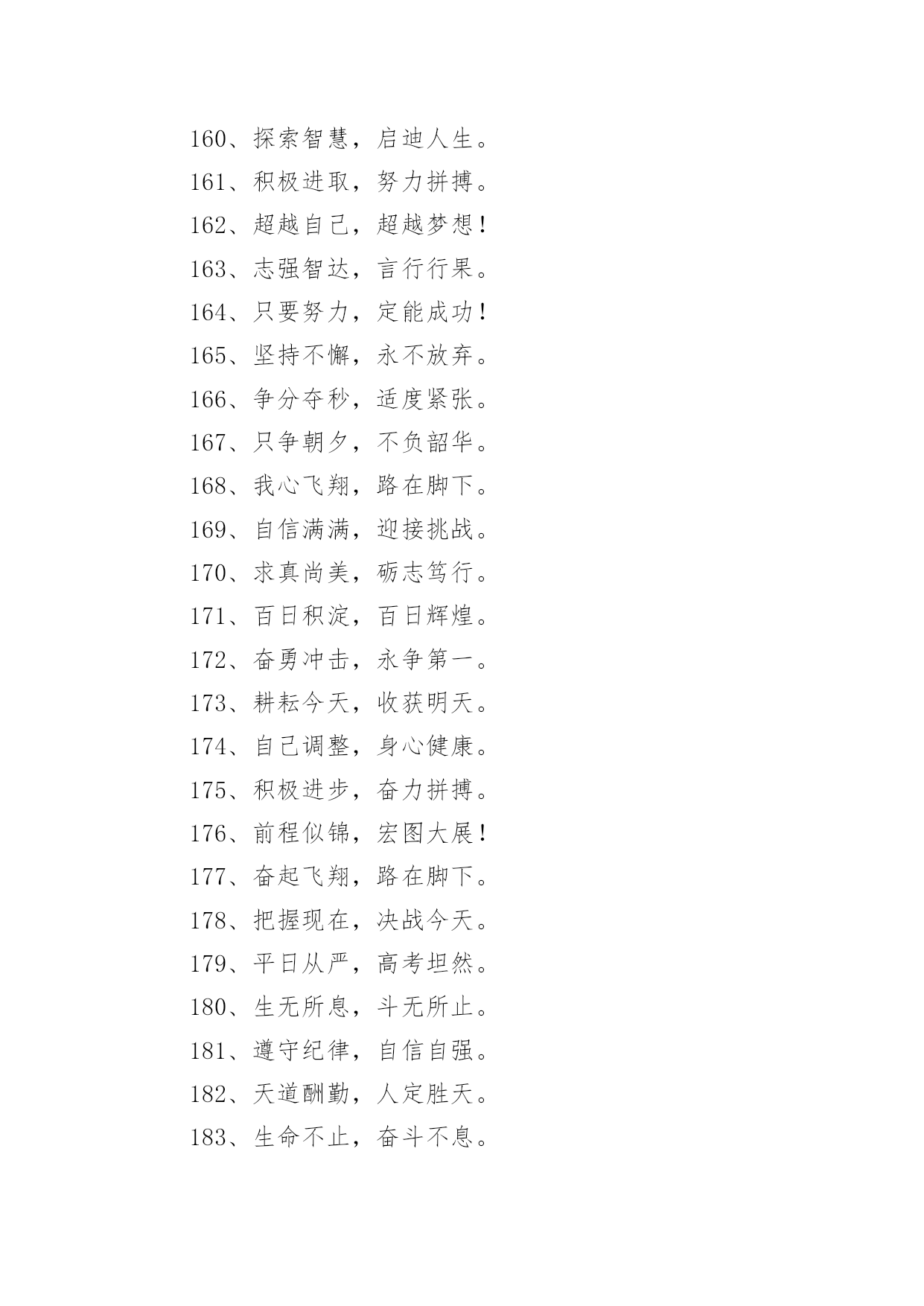 为高考加油的横幅口号为高考加油的横幅口号(通用370句)在日常的学习、工作、生活中,大家总少不了接触一些耳熟能详的口号吧,口号要在受众的心目中形成一定程度的印记,就要使之句式简短,容易记忆。其实很多朋友都不太清楚什么样的口号才是好的口号,以下是小编收集整理的为高考加油的横幅口号(通用370句),希望能够帮助到大家。1、我拼命,我怕谁。2、吃苦受累视死如归!3、不经风雨,怎见彩虹?4、我高考我自信我成功!5、我心飞翔,路在脚下。6、对命运承诺,对承诺负责7、把握现在、就是创造未来。8、拼一载春秋,搏一生无悔。9、明天金榜提名,舍我其谁。10、遇难心不慌,遇易心更细。11、努力造就实力,态度决定高度12、我因X班而自豪,X班因我而骄傲13、做一题会一题,一题决定命运。14、努力就能成功,坚持确保胜利。15、宁可血流成河,也不落榜一个。16、拼一分高一分,一分成就终生。17、无才无以立足,不苦不能成才。18、精神成就事业,态度决定一切。19、贵在坚持、难在坚持、成在坚持20、再苦再累不掉队,再难再险不放弃21、精神成人,知识成才,态度成全。22、我自信,我出色:我拼搏,我成功!23、把汗水变成珍珠,把梦想变成现实!24、有来路,没退路;留退路,是绝路。25、要成功,先发疯,下定决心往前冲!26、今天多一份拼搏、明天多几份欢笑。27、拼搏与高三齐飞,勤奋与成功一色。28、春风吹,战鼓擂,今年高考谁怕谁。29、高三高考高目标,苦学善学上好学。30、静下来,铸我实力;拼上去,亮我风采。31、忘时,忘物,忘我。诚实,朴实,踏实。32、我自信,故我成功、我行,我一定能行。33、站在新起点,迎接新挑战,创造新成绩。34、拼搏高考,今生无悔;越过高三,追求卓越!35、不苦不累,高三无味;不拼不搏,高三白活。36、乐学实学,挑战高考;勤勉向上,成就自己。37、太阳每天都是新的,你是否每天都在努力。38、张扬乐学乐思的个性,坚守不骄不躁的心态。39、眼泪不是我们的答案,拼搏才是我们的选择。40、山高不厌攀,水深不厌潜,学精不厌苦:追求!41、人活着要呼吸。呼者,出一口气;吸者,争一口气42、有大目标,须有大动作;有大追求,须有大改变。43、狠抓基础是成功的基础,持之以恒是胜利的保证。44、因为我不能,所以一定要;因为一定要,所以一定能。45、保持平常心,营造好环境,扬起常笑脸,轻松迎高考。46、对于世界,我微不足道,但对于我自己,我就是全部。47、拧成一股绳,搏尽一份力,狠下一条心,共圆一个梦。48、挑战人生是我无悔的选择,决胜高考是我不懈的追求。49、每天都是一个起点,每天都有一点进步,每天都有一点收获!50、作业考试化,考试高考化,将平时考试当高考,高考考试当平时。51、请老师放心,我是你最骄傲的学子;请父母放心,我是你们最争气的孩子。52、立志高远,脚踏实地;刻苦钻研,勤学苦思;稳定心态,不馁不弃;全力以赴,夺取胜利。53、体胖还须勤锻炼,人丑就要多读书。54、只求少丢分,不说得高分!55、别人能做到的事,自己也可以做到。56、做人,心胸要宽广,容纳各种负面情绪。57、激情澎湃高考不败、斗志昂扬数我最强。58、三年寒窗仅在此一搏,九经沙场望凯旋而归。59、站在新起点,迎接新挑战,创造新成绩。60、寒窗十载,数日将决高下,豪气冲天,看我金榜题名。61、今日的书呆,明日的天才。62、六月捷报喜气飞扬,报考志愿实现梦想。63、勇于开始,才能找到成功的路。64、懒惰等于将自己淘汰,勤劳的蜜蜂没有时间悲哀。65、不要轻言放弃否则对不起自己。66、成功的聪明人太多啦,我必须为笨蛋争口气。67、丹青不知老将至,贫贱于我如浮云。68、人最好的朋友是自己的十个手指。69、做一题,会一题,一题决定命运。70、冬将尽,春可期!归来时,你已成长!71、你易他也易,就看谁细心,你难他也难,就看谁专心。72、常说口里顺,常做手不笨。73、最怕一生碌碌无为,还安慰自己平凡可贵。74、敏而好学,不耻下问。75、血狼精神,与我同在!76、不要认为自己比别人做得好,即便你很出色。77、努力和遗憾,哪个更让人痛苦?78、君子坦荡荡,小人长戚戚。79、秣马厉兵,卧薪尝胆,破釜沉舟。80、二十的奋斗只为一朝高考,卷土重复读未可知。81、不要让庸俗的小人阻碍我的志向。82、如果你是那样的人,我真的瞧不起你。83、每个人都有一个激动人心的青春,每个人都有一个丰富多彩的青春。84、不让别人受苦,是情商的最高境界。85、百日许愿汇报妈妈的恩情,在六月的考场感谢老师的恩情。86、不死就要战斗到底,高考谁怕谁!87、梦在,只要做了,就能走。88、如果你通过了考试,你就能成功。89、高考我来了,虽然我剩下的时间不多,但我自信未来就在我手上。90、呕心沥血,卧薪尝胆,定将折桂步蟾宫。百炼成钢,十年