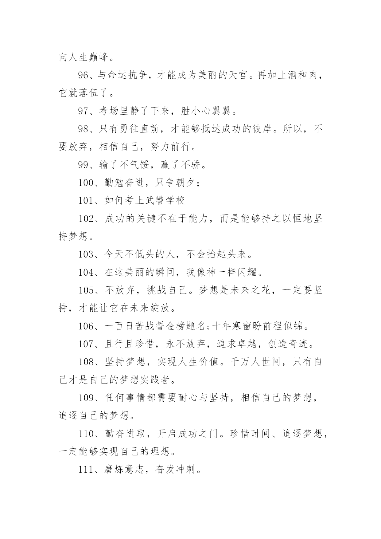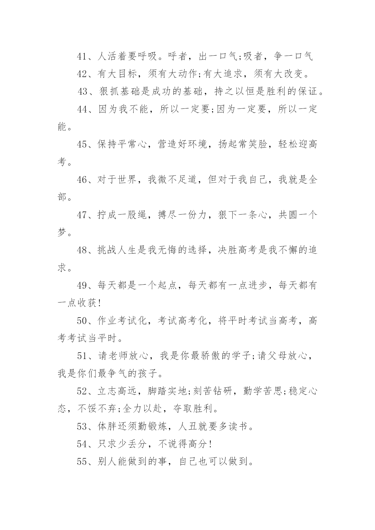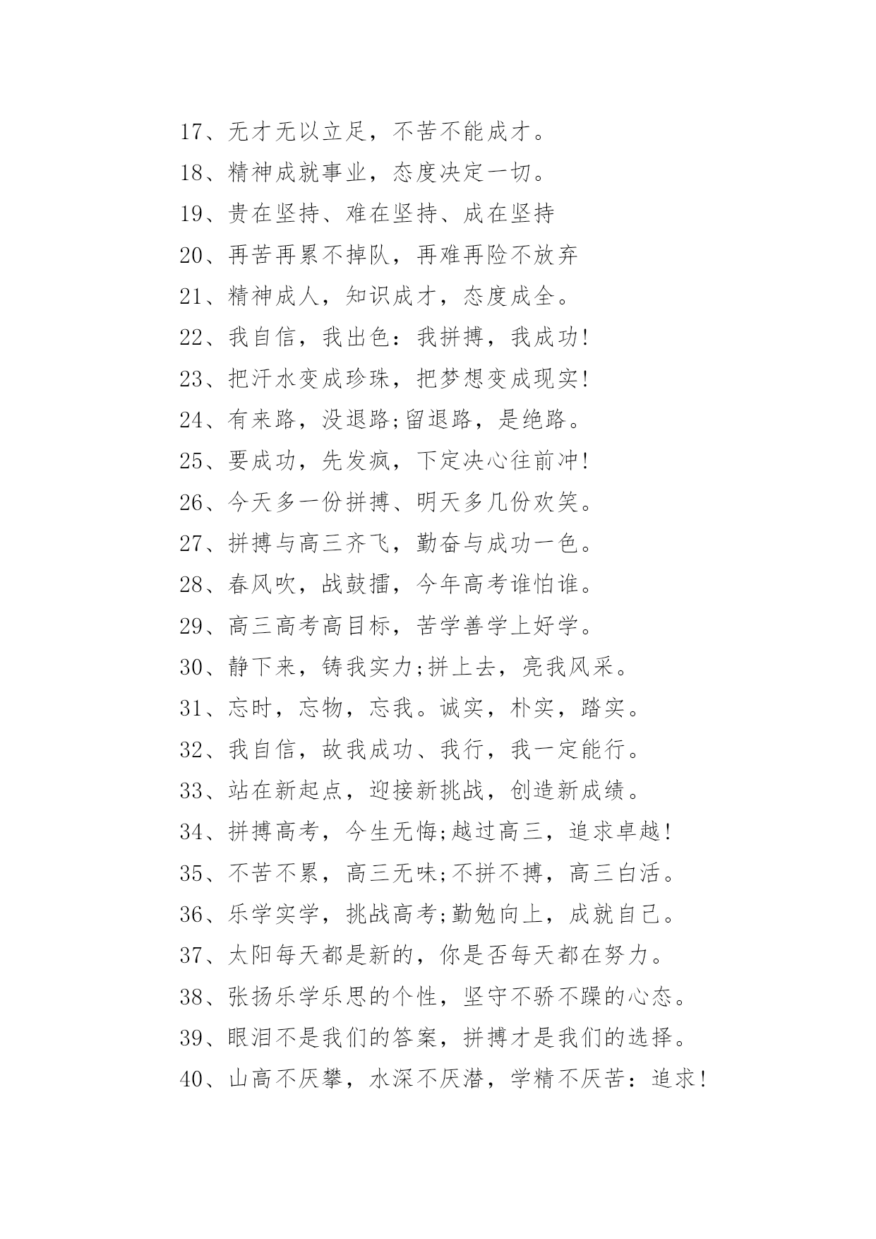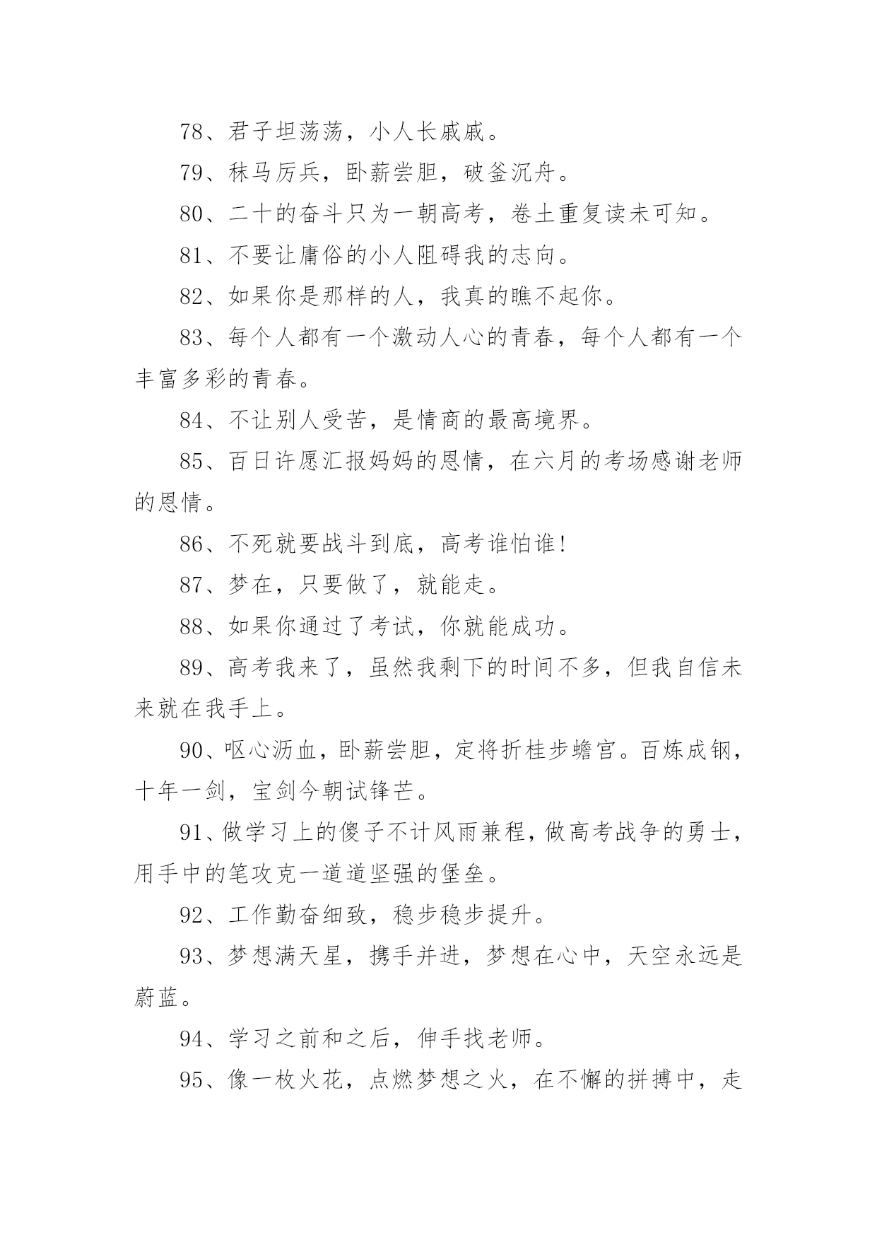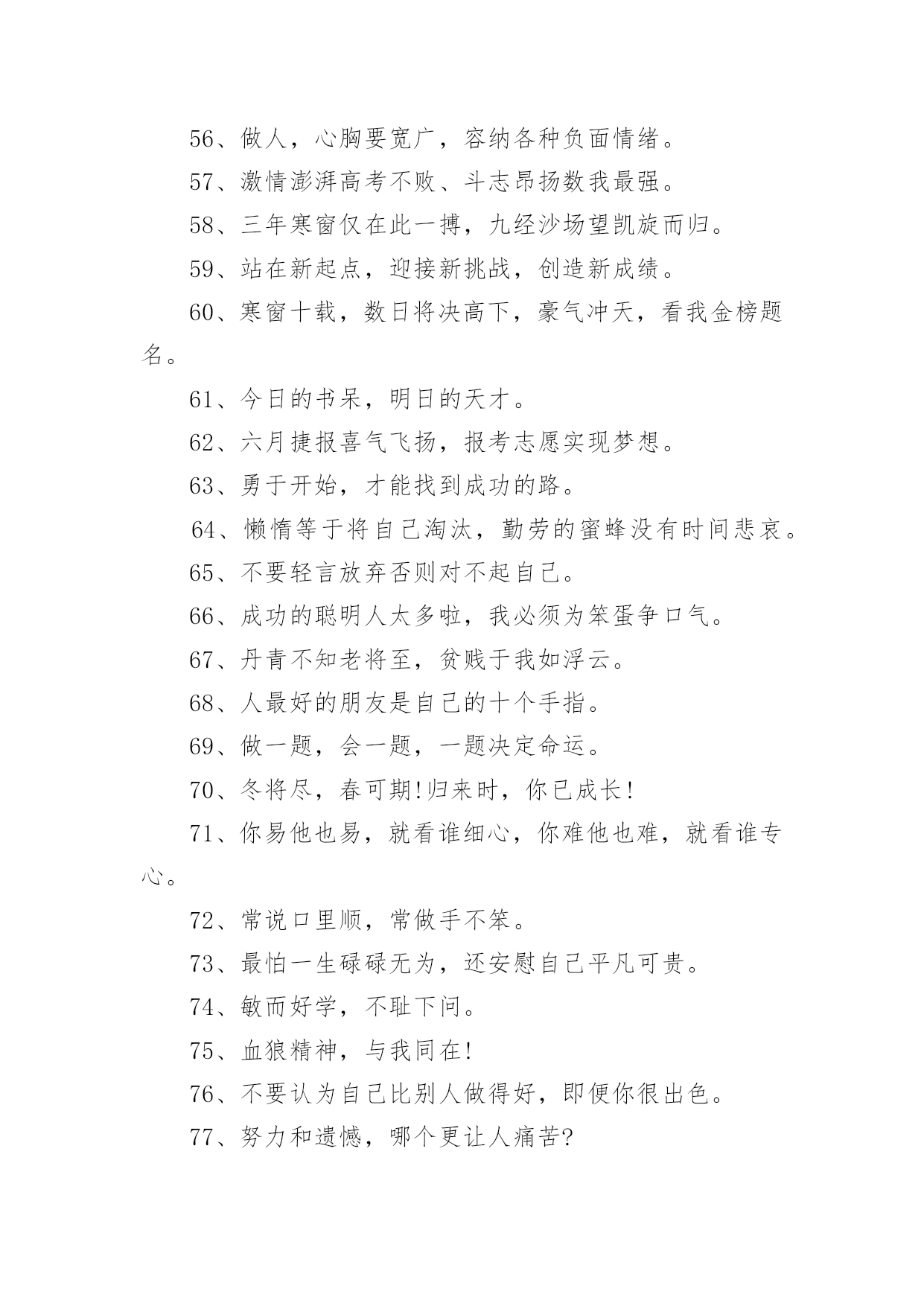 为高考加油的横幅口号为高考加油的横幅口号(通用370句)在日常的学习、工作、生活中,大家总少不了接触一些耳熟能详的口号吧,口号要在受众的心目中形成一定程度的印记,就要使之句式简短,容易记忆。其实很多朋友都不太清楚什么样的口号才是好的口号,以下是小编收集整理的为高考加油的横幅口号(通用370句),希望能够帮助到大家。1、我拼命,我怕谁。2、吃苦受累视死如归!3、不经风雨,怎见彩虹?4、我高考我自信我成功!5、我心飞翔,路在脚下。6、对命运承诺,对承诺负责7、把握现在、就是创造未来。8、拼一载春秋,搏一生无悔。9、明天金榜提名,舍我其谁。10、遇难心不慌,遇易心更细。11、努力造就实力,态度决定高度12、我因X班而自豪,X班因我而骄傲13、做一题会一题,一题决定命运。14、努力就能成功,坚持确保胜利。15、宁可血流成河,也不落榜一个。16、拼一分高一分,一分成就终生。17、无才无以立足,不苦不能成才。18、精神成就事业,态度决定一切。19、贵在坚持、难在坚持、成在坚持20、再苦再累不掉队,再难再险不放弃21、精神成人,知识成才,态度成全。22、我自信,我出色:我拼搏,我成功!23、把汗水变成珍珠,把梦想变成现实!24、有来路,没退路;留退路,是绝路。25、要成功,先发疯,下定决心往前冲!26、今天多一份拼搏、明天多几份欢笑。27、拼搏与高三齐飞,勤奋与成功一色。28、春风吹,战鼓擂,今年高考谁怕谁。29、高三高考高目标,苦学善学上好学。30、静下来,铸我实力;拼上去,亮我风采。31、忘时,忘物,忘我。诚实,朴实,踏实。32、我自信,故我成功、我行,我一定能行。33、站在新起点,迎接新挑战,创造新成绩。34、拼搏高考,今生无悔;越过高三,追求卓越!35、不苦不累,高三无味;不拼不搏,高三白活。36、乐学实学,挑战高考;勤勉向上,成就自己。37、太阳每天都是新的,你是否每天都在努力。38、张扬乐学乐思的个性,坚守不骄不躁的心态。39、眼泪不是我们的答案,拼搏才是我们的选择。40、山高不厌攀,水深不厌潜,学精不厌苦:追求!41、人活着要呼吸。呼者,出一口气;吸者,争一口气42、有大目标,须有大动作;有大追求,须有大改变。43、狠抓基础是成功的基础,持之以恒是胜利的保证。44、因为我不能,所以一定要;因为一定要,所以一定能。45、保持平常心,营造好环境,扬起常笑脸,轻松迎高考。46、对于世界,我微不足道,但对于我自己,我就是全部。47、拧成一股绳,搏尽一份力,狠下一条心,共圆一个梦。48、挑战人生是我无悔的选择,决胜高考是我不懈的追求。49、每天都是一个起点,每天都有一点进步,每天都有一点收获!50、作业考试化,考试高考化,将平时考试当高考,高考考试当平时。51、请老师放心,我是你最骄傲的学子;请父母放心,我是你们最争气的孩子。52、立志高远,脚踏实地;刻苦钻研,勤学苦思;稳定心态,不馁不弃;全力以赴,夺取胜利。53、体胖还须勤锻炼,人丑就要多读书。54、只求少丢分,不说得高分!55、别人能做到的事,自己也可以做到。56、做人,心胸要宽广,容纳各种负面情绪。57、激情澎湃高考不败、斗志昂扬数我最强。58、三年寒窗仅在此一搏,九经沙场望凯旋而归。59、站在新起点,迎接新挑战,创造新成绩。60、寒窗十载,数日将决高下,豪气冲天,看我金榜题名。61、今日的书呆,明日的天才。62、六月捷报喜气飞扬,报考志愿实现梦想。63、勇于开始,才能找到成功的路。64、懒惰等于将自己淘汰,勤劳的蜜蜂没有时间悲哀。65、不要轻言放弃否则对不起自己。66、成功的聪明人太多啦,我必须为笨蛋争口气。67、丹青不知老将至,贫贱于我如浮云。68、人最好的朋友是自己的十个手指。69、做一题,会一题,一题决定命运。70、冬将尽,春可期!归来时,你已成长!71、你易他也易,就看谁细心,你难他也难,就看谁专心。72、常说口里顺,常做手不笨。73、最怕一生碌碌无为,还安慰自己平凡可贵。74、敏而好学,不耻下问。75、血狼精神,与我同在!76、不要认为自己比别人做得好,即便你很出色。77、努力和遗憾,哪个更让人痛苦?78、君子坦荡荡,小人长戚戚。79、秣马厉兵,卧薪尝胆,破釜沉舟。80、二十的奋斗只为一朝高考,卷土重复读未可知。81、不要让庸俗的小人阻碍我的志向。82、如果你是那样的人,我真的瞧不起你。83、每个人都有一个激动人心的青春,每个人都有一个丰富多彩的青春。84、不让别人受苦,是情商的最高境界。85、百日许愿汇报妈妈的恩情,在六月的考场感谢老师的恩情。86、不死就要战斗到底,高考谁怕谁!87、梦在,只要做了,就能走。88、如果你通过了考试,你就能成功。89、高考我来了,虽然我剩下的时间不多,但我自信未来就在我手上。90、呕心沥血,卧薪尝胆,定将折桂步蟾宫。百炼成钢,十年