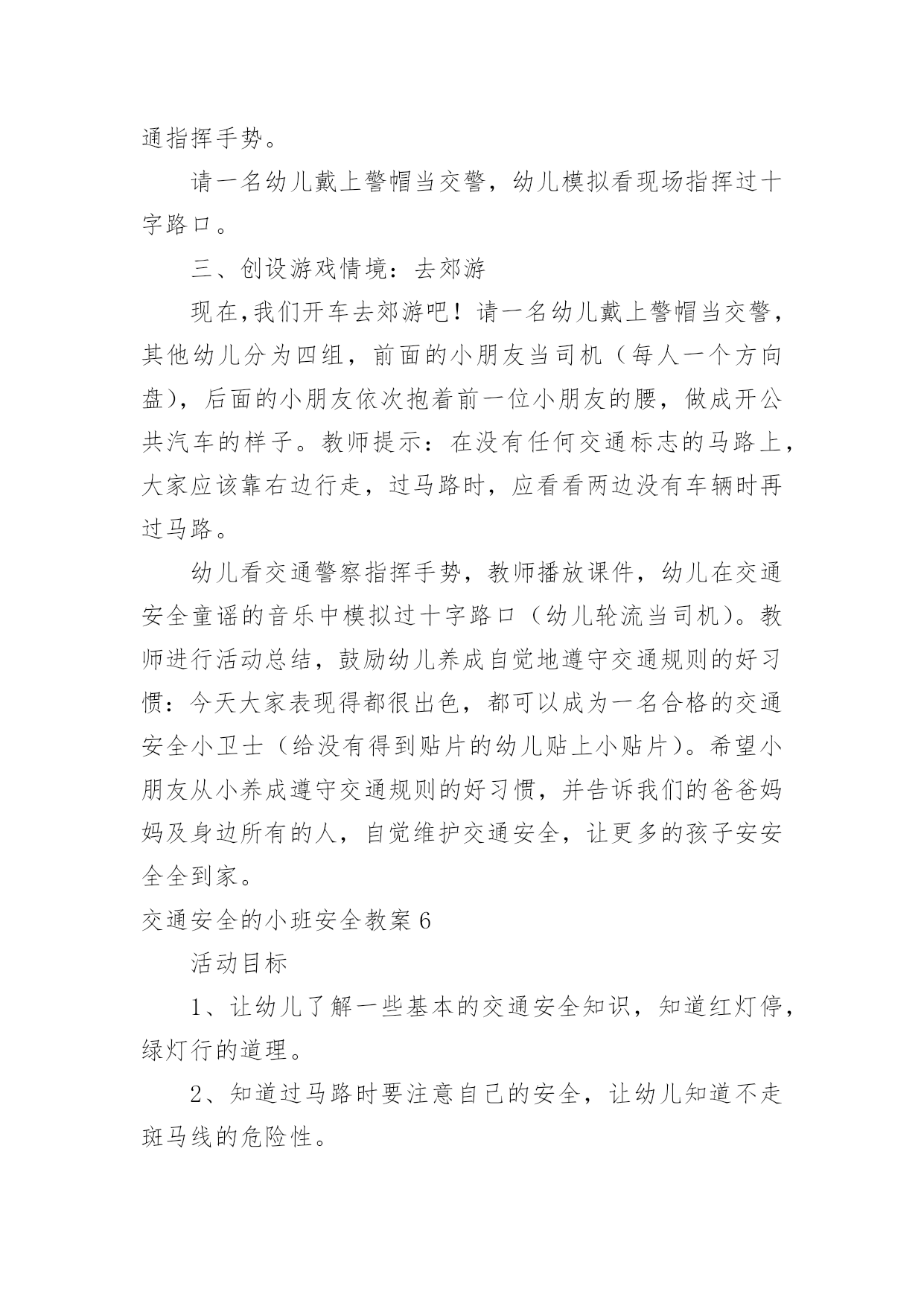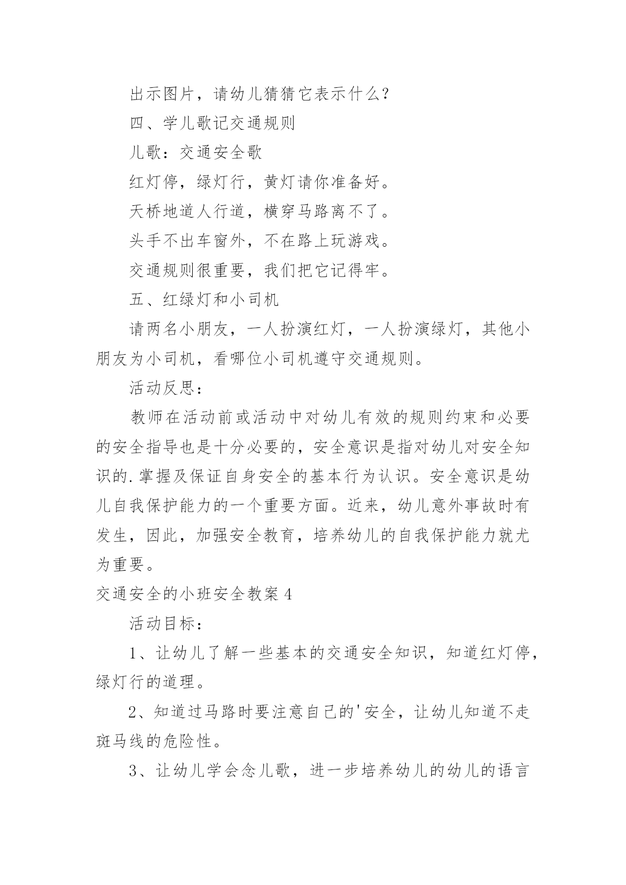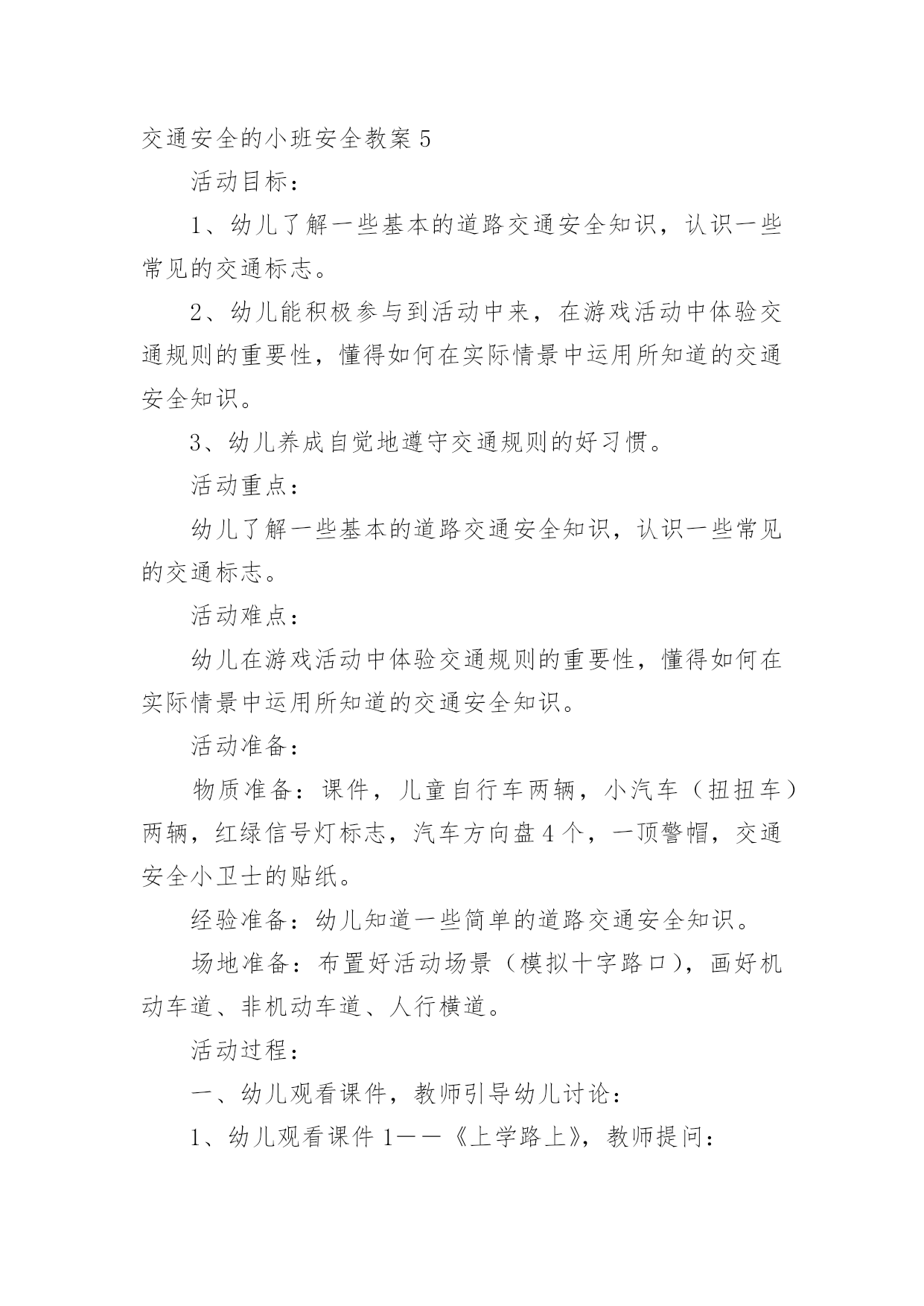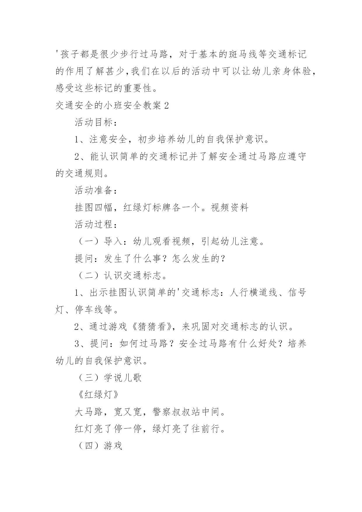 交通安全的小班安全教案交通安全的小班安全教案作为一位杰出的教职工,通常需要用到教案来辅助教学,教案是实施教学的主要依据,有着至关重要的作用。那么优秀的教案是什么样的呢?下面是小编收集整理的交通安全的小班安全教案,希望对大家有所帮助。交通安全的小班安全教案1活动目标:1、了解信号灯、斑马线、天桥等交通设施的功能,能遵守基本的交通规则,在交通设施的帮助下安全通行。2、能在游戏中巩固基本的交通规则。活动准备:1、信号灯、斑马线、天桥图卡。2、在教室里布置道路场景,包括若干辆小汽车、用纸画出的斑马线、信号灯、用平衡木充当过街天桥。3、教学挂图和幼儿用书。活动过程:一、出示图卡,唤起幼儿已有经验,导入活动。教师:(1)小朋友们,这是什么?你在哪里看见过这些东西?(2)这些都是在马路上经常看到的东西,他们可以帮助和保护人们安全通行,叫做交通设施。二、使用道具布置道路场景,引导幼儿观看情景表演,了解常见交通设施的功能。教师:爸爸送丫丫去幼儿园,他们一路上会经过哪些交通设施呢?小朋友,一起来看一看吧。(1)在情景表演中了解信号灯和斑马线的作用。旁白:爸爸和丫丫站在那路边,他们想过马路。马路对面有个信号灯,这个信号灯是帮助我们过马路的,他会告诉我们红灯停,绿灯行,黄灯亮了等一等。(2)绿灯亮啦可以走了,等等你看地上有什么?好多白线好像斑马身上的花纹一样。这就是斑马线。“条条斑马线,连着路两边,过街线内走,大家才安全。是保护我们安全通行的,我们一起走斑马线过马路吧。(3)没有斑马线怎么过马路呢?你看,这是天桥,它使行人从车辆的上面通行,避开了车辆,避免了被车撞到的危险,所以天桥也是保护我们安全的交通设施。“空中一座大桥,横跨马路架牢,行人桥上走过,汽车桥下奔跑。三、邀请幼儿扮演行人在情境中游戏,参与表演。活动反思:这是一节关于交通安全意识和体能游戏相结合的活动,主要通过游戏、儿歌等形式引导幼儿认识红绿灯以及一些常见的交通标记,培养幼儿遵守交通规则的意识。这次活动过程中学习儿歌环节我应该放到第一个环节。这个问题我之前也有想过,我当时的想法是把谈话放在第一环节能吸引孩子注意和兴趣,能让活动更好的进行,现在的'孩子都是很少步行过马路,对于基本的斑马线等交通标记的作用了解甚少,我们在以后的活动中可以让幼儿亲身体验,感受这些标记的重要性。交通安全的小班安全教案2活动目标:1、注意安全,初步培养幼儿的自我保护意识。2、能认识简单的交通标记并了解安全通过马路应遵守的交通规则。活动准备:挂图四幅,红绿灯标牌各一个。视频资料活动过程:(一)导入:幼儿观看视频,引起幼儿注意。提问:发生了什么事?怎么发生的?(二)认识交通标志。1、出示挂图认识简单的'交通标志:人行横道线、信号灯、停车线等。2、通过游戏《猜猜看》,来巩固对交通标志的认识。3、提问:如何过马路?安全过马路有什么好处?培养幼儿的自我保护意识。(三)学说儿歌《红绿灯》大马路,宽又宽,警察叔叔站中间。红灯亮了停一停,绿灯亮了往前行。(四)游戏小朋友们想不想玩红绿灯的游戏,师幼一起玩游戏。老师扮成交警叔叔,出示红绿灯标志让幼儿进一步巩固认识红绿灯及其作用。活动延伸:绘画红绿灯。交通安全的小班安全教案3活动目标:1、教幼儿学习一些交通规则,认识一些交通安全标志。2、幼儿能从小养成遵守交通规则的习惯。3、培养幼儿敏锐的观察能力。4、遵守社会行为规则,不做“禁止”的事。5、加强幼儿的安全意识。活动准备:情景图片五张。红绿灯标志各一张,交通标志图五张。活动过程:一、猜谜语,导入新课。红绿灯和斑马线,可结合班内墙上的斑马线图案介绍斑马线的作用。二、结合情景图片,学习交通规则。1、幼儿自由举手回答,自己还知道哪些交通规则?2、幼儿说出来的可结合图片讲解,没想到的出示图片,说说图片上的幼儿做的对不对,应该怎样做才是遵守交通规则。三、认识交通安全标志。出示图片,请幼儿猜猜它表示什么?四、学儿歌记交通规则儿歌:交通安全歌红灯停,绿灯行,黄灯请你准备好。天桥地道人行道,横穿马路离不了。头手不出车窗外,不在路上玩游戏。交通规则很重要,我们把它记得牢。五、红绿灯和小司机请两名小朋友,一人扮演红灯,一人扮演绿灯,其他小朋友为小司机,看哪位小司机遵守交通规则。活动反思:教师在活动前或活动中对幼儿有效的规则约束和必要的安全指导也是十分必要的,安全意识是指对幼儿对安全知识的.掌握及保证自身安全的基本行为认识。安全意识是幼儿自我保护能力的一个重要方面。近来,幼儿意外事故时有发生,因此,加强安全教育,培养幼儿的自我保护能力就尤为重要。交通安全的小班安全教案4活动目标:1、让幼儿了解一些基本的交通安全知识,知道红灯停,绿灯行的道理。2、知道过马路时要注意自己的'安全,让幼儿知道不走斑马线的危险性。3、让幼儿学会念儿歌,进一步培养幼儿的幼儿的语言