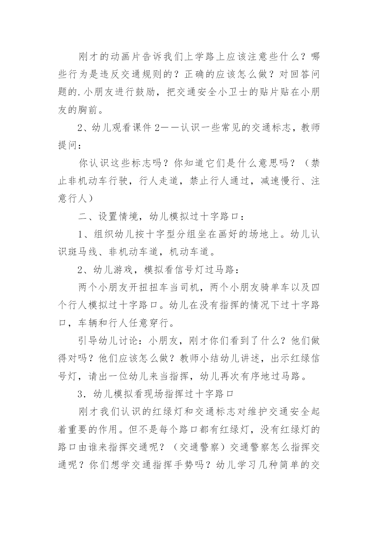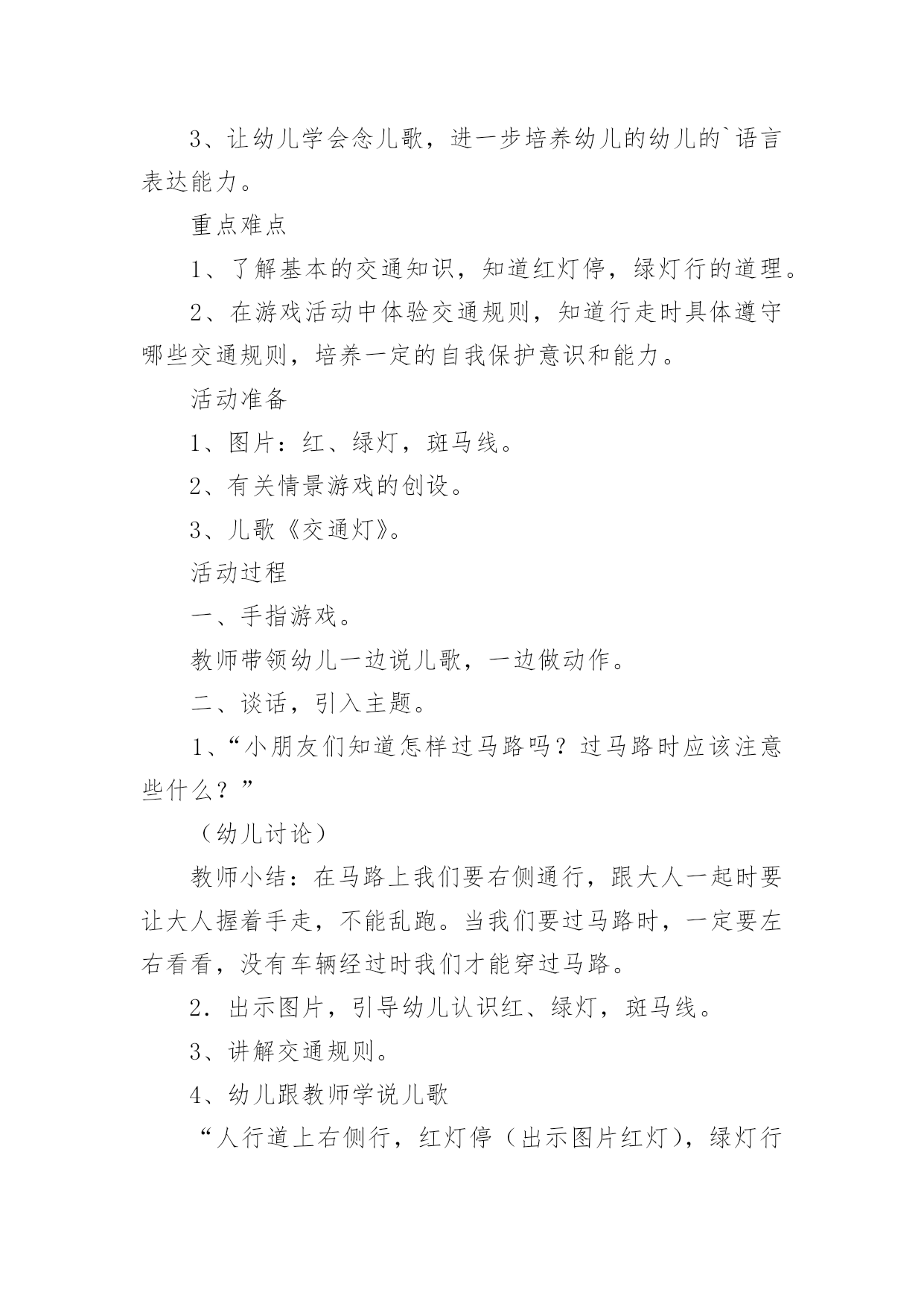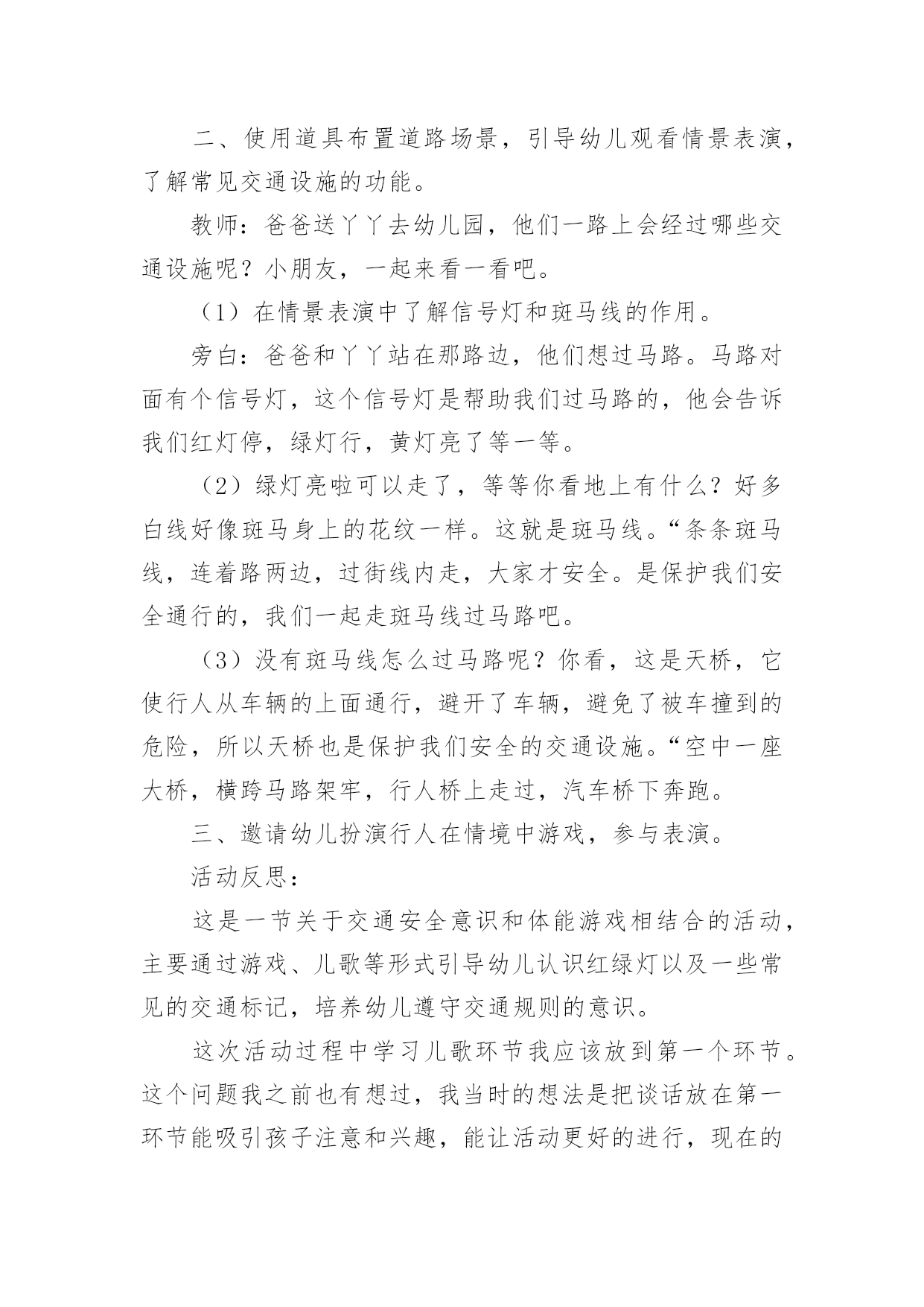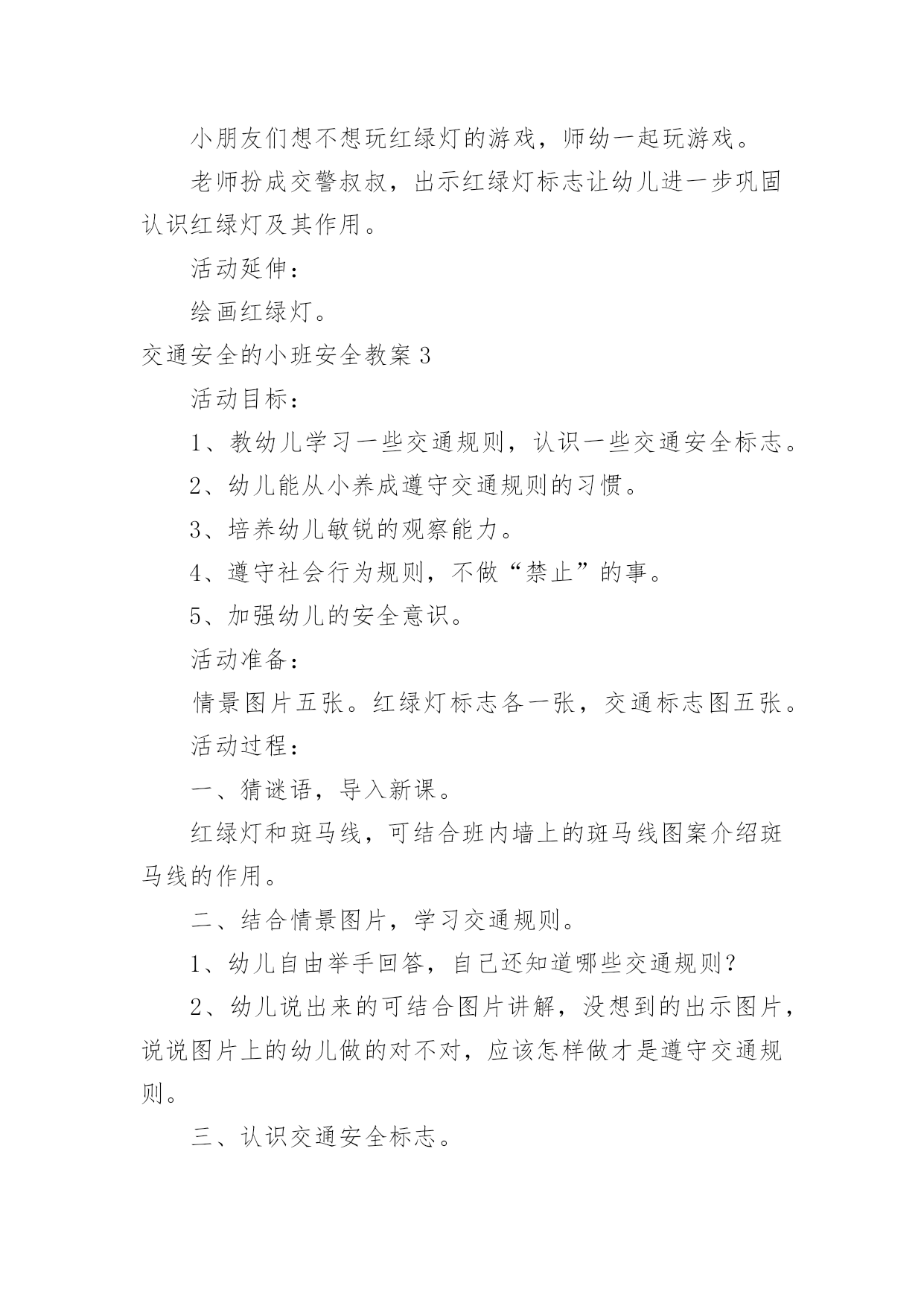 交通安全的小班安全教案交通安全的小班安全教案作为一位杰出的教职工,通常需要用到教案来辅助教学,教案是实施教学的主要依据,有着至关重要的作用。那么优秀的教案是什么样的呢?下面是小编收集整理的交通安全的小班安全教案,希望对大家有所帮助。交通安全的小班安全教案1活动目标:1、了解信号灯、斑马线、天桥等交通设施的功能,能遵守基本的交通规则,在交通设施的帮助下安全通行。2、能在游戏中巩固基本的交通规则。活动准备:1、信号灯、斑马线、天桥图卡。2、在教室里布置道路场景,包括若干辆小汽车、用纸画出的斑马线、信号灯、用平衡木充当过街天桥。3、教学挂图和幼儿用书。活动过程:一、出示图卡,唤起幼儿已有经验,导入活动。教师:(1)小朋友们,这是什么?你在哪里看见过这些东西?(2)这些都是在马路上经常看到的东西,他们可以帮助和保护人们安全通行,叫做交通设施。二、使用道具布置道路场景,引导幼儿观看情景表演,了解常见交通设施的功能。教师:爸爸送丫丫去幼儿园,他们一路上会经过哪些交通设施呢?小朋友,一起来看一看吧。(1)在情景表演中了解信号灯和斑马线的作用。旁白:爸爸和丫丫站在那路边,他们想过马路。马路对面有个信号灯,这个信号灯是帮助我们过马路的,他会告诉我们红灯停,绿灯行,黄灯亮了等一等。(2)绿灯亮啦可以走了,等等你看地上有什么?好多白线好像斑马身上的花纹一样。这就是斑马线。“条条斑马线,连着路两边,过街线内走,大家才安全。是保护我们安全通行的,我们一起走斑马线过马路吧。(3)没有斑马线怎么过马路呢?你看,这是天桥,它使行人从车辆的上面通行,避开了车辆,避免了被车撞到的危险,所以天桥也是保护我们安全的交通设施。“空中一座大桥,横跨马路架牢,行人桥上走过,汽车桥下奔跑。三、邀请幼儿扮演行人在情境中游戏,参与表演。活动反思:这是一节关于交通安全意识和体能游戏相结合的活动,主要通过游戏、儿歌等形式引导幼儿认识红绿灯以及一些常见的交通标记,培养幼儿遵守交通规则的意识。这次活动过程中学习儿歌环节我应该放到第一个环节。这个问题我之前也有想过,我当时的想法是把谈话放在第一环节能吸引孩子注意和兴趣,能让活动更好的进行,现在的'孩子都是很少步行过马路,对于基本的斑马线等交通标记的作用了解甚少,我们在以后的活动中可以让幼儿亲身体验,感受这些标记的重要性。交通安全的小班安全教案2活动目标:1、注意安全,初步培养幼儿的自我保护意识。2、能认识简单的交通标记并了解安全通过马路应遵守的交通规则。活动准备:挂图四幅,红绿灯标牌各一个。视频资料活动过程:(一)导入:幼儿观看视频,引起幼儿注意。提问:发生了什么事?怎么发生的?(二)认识交通标志。1、出示挂图认识简单的'交通标志:人行横道线、信号灯、停车线等。2、通过游戏《猜猜看》,来巩固对交通标志的认识。3、提问:如何过马路?安全过马路有什么好处?培养幼儿的自我保护意识。(三)学说儿歌《红绿灯》大马路,宽又宽,警察叔叔站中间。红灯亮了停一停,绿灯亮了往前行。(四)游戏小朋友们想不想玩红绿灯的游戏,师幼一起玩游戏。老师扮成交警叔叔,出示红绿灯标志让幼儿进一步巩固认识红绿灯及其作用。活动延伸:绘画红绿灯。交通安全的小班安全教案3活动目标:1、教幼儿学习一些交通规则,认识一些交通安全标志。2、幼儿能从小养成遵守交通规则的习惯。3、培养幼儿敏锐的观察能力。4、遵守社会行为规则,不做“禁止”的事。5、加强幼儿的安全意识。活动准备:情景图片五张。红绿灯标志各一张,交通标志图五张。活动过程:一、猜谜语,导入新课。红绿灯和斑马线,可结合班内墙上的斑马线图案介绍斑马线的作用。二、结合情景图片,学习交通规则。1、幼儿自由举手回答,自己还知道哪些交通规则?2、幼儿说出来的可结合图片讲解,没想到的出示图片,说说图片上的幼儿做的对不对,应该怎样做才是遵守交通规则。三、认识交通安全标志。出示图片,请幼儿猜猜它表示什么?四、学儿歌记交通规则儿歌:交通安全歌红灯停,绿灯行,黄灯请你准备好。天桥地道人行道,横穿马路离不了。头手不出车窗外,不在路上玩游戏。交通规则很重要,我们把它记得牢。五、红绿灯和小司机请两名小朋友,一人扮演红灯,一人扮演绿灯,其他小朋友为小司机,看哪位小司机遵守交通规则。活动反思:教师在活动前或活动中对幼儿有效的规则约束和必要的安全指导也是十分必要的,安全意识是指对幼儿对安全知识的.掌握及保证自身安全的基本行为认识。安全意识是幼儿自我保护能力的一个重要方面。近来,幼儿意外事故时有发生,因此,加强安全教育,培养幼儿的自我保护能力就尤为重要。交通安全的小班安全教案4活动目标:1、让幼儿了解一些基本的交通安全知识,知道红灯停,绿灯行的道理。2、知道过马路时要注意自己的'安全,让幼儿知道不走斑马线的危险性。3、让幼儿学会念儿歌,进一步培养幼儿的幼儿的语言