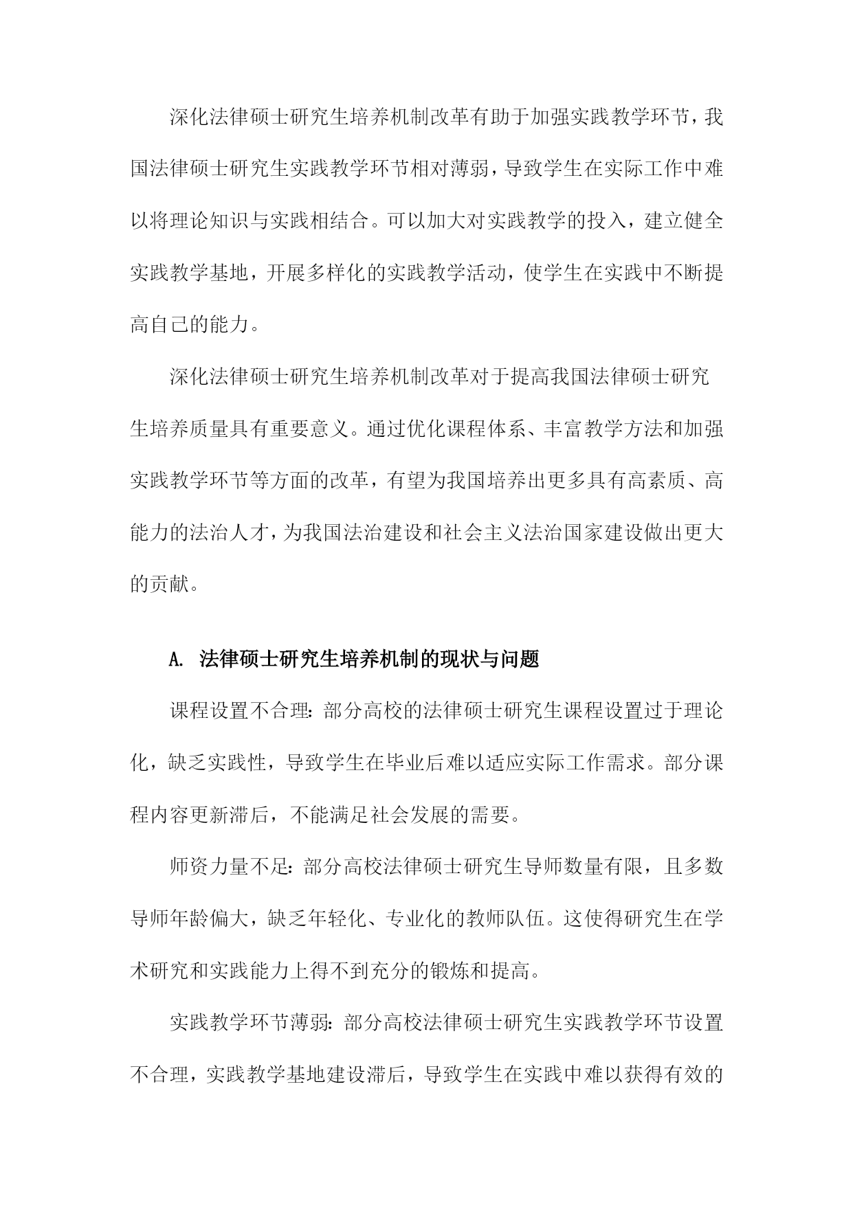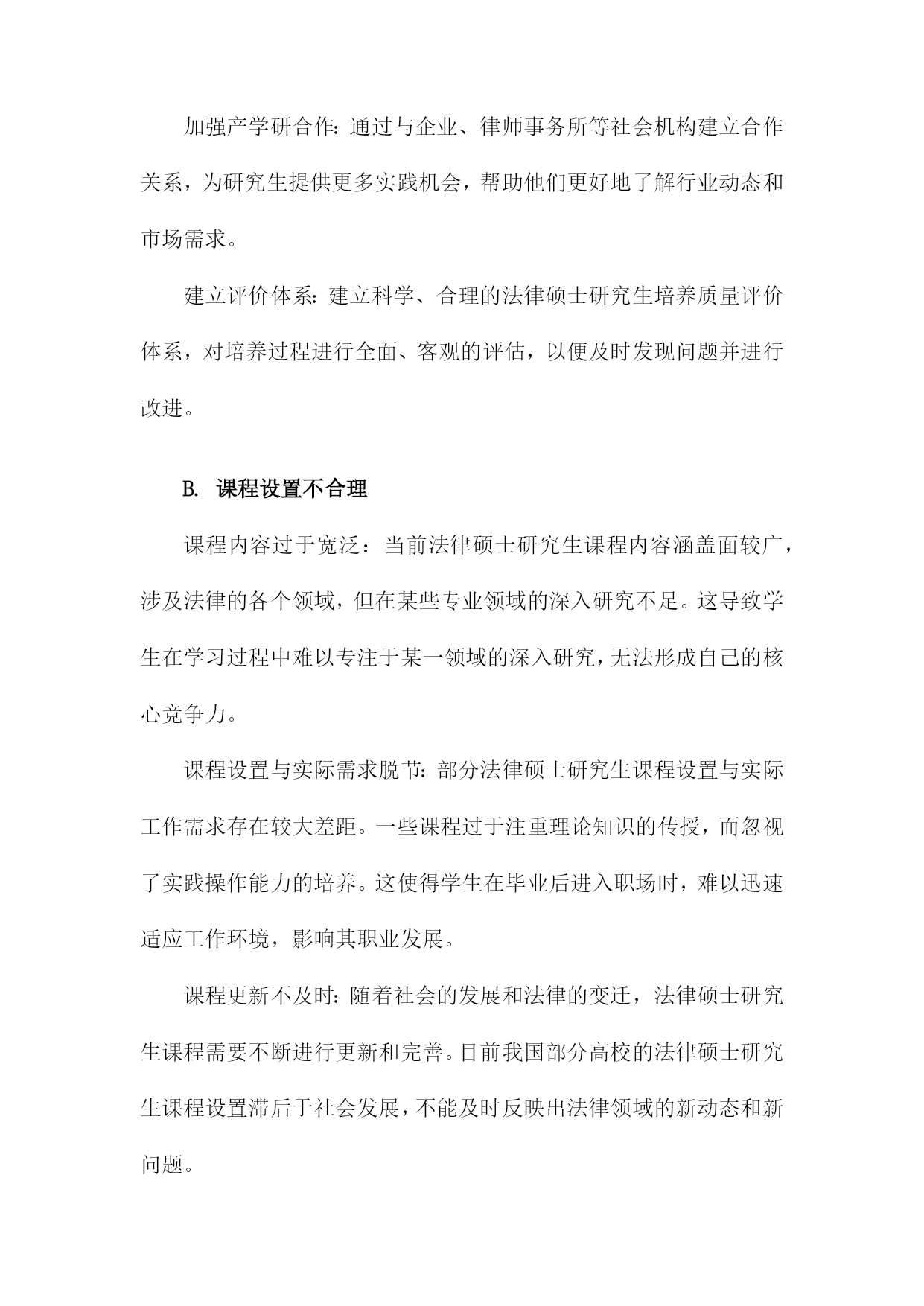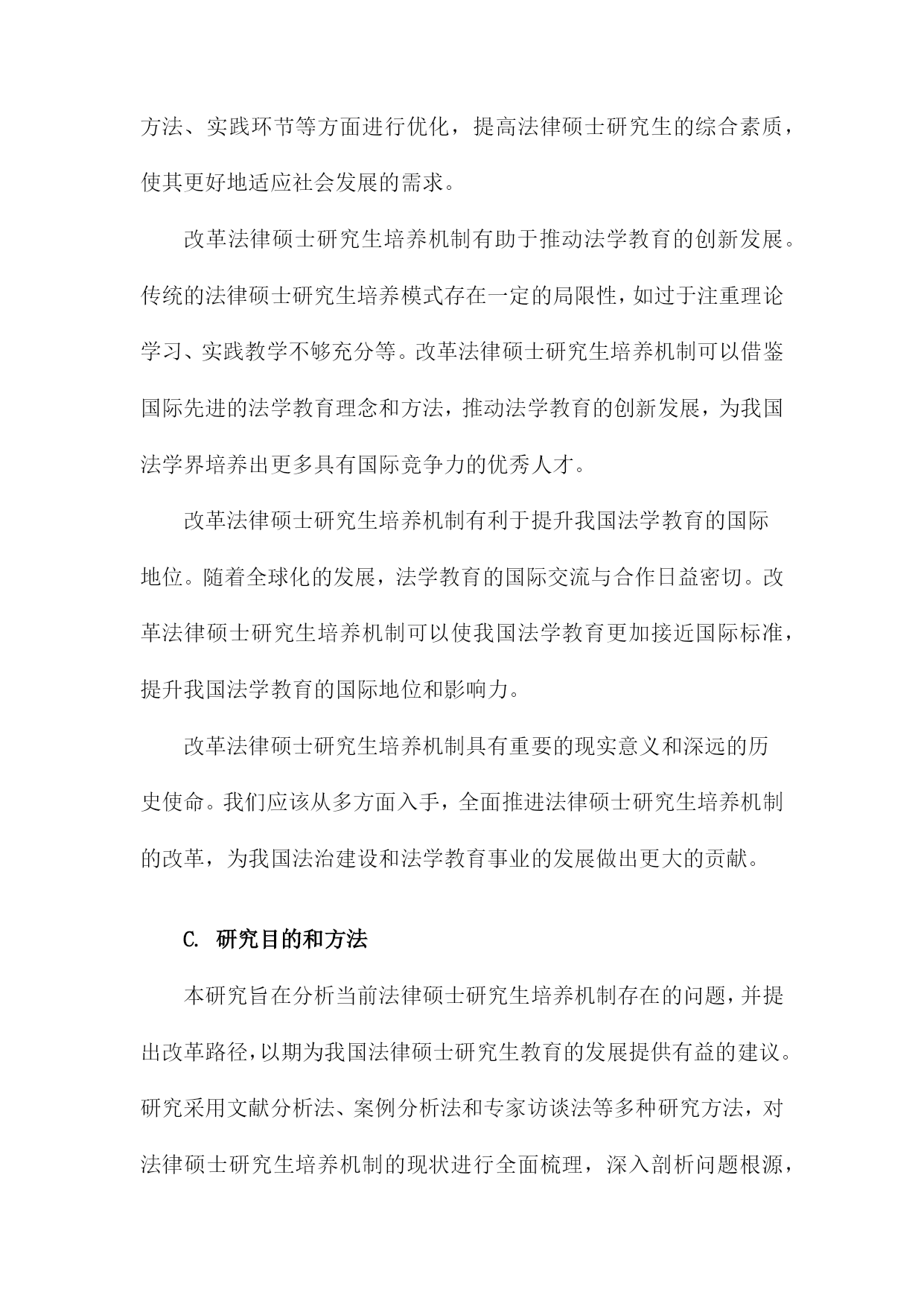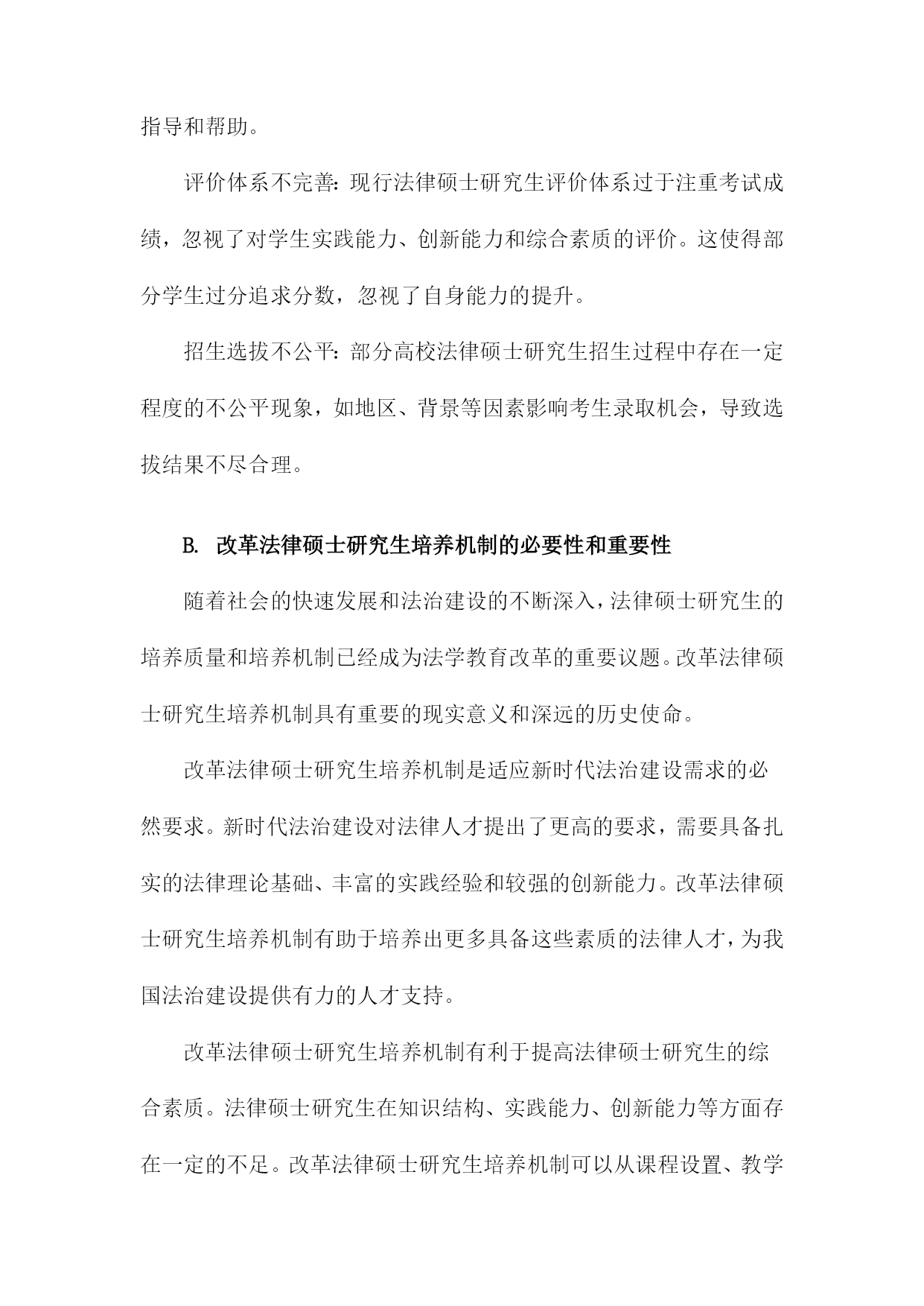 法律硕士研究生培养机制改革路径一、背景和意义随着社会的发展和法治建设的深入推进,法律硕士研究生教育在我国的地位日益凸显。培养一批具有较高政治素质、专业能力和创新精神的法律硕士研究生,对于提高我国法治建设和社会主义法治国家建设水平具有重要意义。当前我国法律硕士研究生培养机制存在一定的问题,如课程设置不合理、教学方法单实践教学环节薄弱等,这些问题制约了法律硕士研究生培养质量的提高。深化法律硕士研究生培养机制改革,对于推动我国法治建设进程具有重要的现实意义。深化法律硕士研究生培养机制改革有助于优化课程体系,我国法律硕士研究生课程设置存在一定的重复性和冗余性,导致学生在学习过程中缺乏针对性和实用性。可以对课程体系进行调整和优化,使之更加符合法律硕士研究生的培养需求,提高课程的针对性和实用性。深化法律硕士研究生培养机制改革有助于丰富教学方法,我国法律硕士研究生教学方法主要依赖于传统的讲授式教学,这种教学方式难以激发学生的学习兴趣和积极性。可以引入多元化的教学方法,如案例教学、讨论式教学、模拟法庭等,使教学更加生动有趣,提高学生的学习效果。深化法律硕士研究生培养机制改革有助于加强实践教学环节,我国法律硕士研究生实践教学环节相对薄弱,导致学生在实际工作中难以将理论知识与实践相结合。可以加大对实践教学的投入,建立健全实践教学基地,开展多样化的实践教学活动,使学生在实践中不断提高自己的能力。深化法律硕士研究生培养机制改革对于提高我国法律硕士研究生培养质量具有重要意义。通过优化课程体系、丰富教学方法和加强实践教学环节等方面的改革,有望为我国培养出更多具有高素质、高能力的法治人才,为我国法治建设和社会主义法治国家建设做出更大的贡献。A.法律硕士研究生培养机制的现状与问题课程设置不合理:部分高校的法律硕士研究生课程设置过于理论化,缺乏实践性,导致学生在毕业后难以适应实际工作需求。部分课程内容更新滞后,不能满足社会发展的需要。师资力量不足:部分高校法律硕士研究生导师数量有限,且多数导师年龄偏大,缺乏年轻化、专业化的教师队伍。这使得研究生在学术研究和实践能力上得不到充分的锻炼和提高。实践教学环节薄弱:部分高校法律硕士研究生实践教学环节设置不合理,实践教学基地建设滞后,导致学生在实践中难以获得有效的指导和帮助。评价体系不完善:现行法律硕士研究生评价体系过于注重考试成绩,忽视了对学生实践能力、创新能力和综合素质的评价。这使得部分学生过分追求分数,忽视了自身能力的提升。招生选拔不公平:部分高校法律硕士研究生招生过程中存在一定程度的不公平现象,如地区、背景等因素影响考生录取机会,导致选拔结果不尽合理。B.改革法律硕士研究生培养机制的必要性和重要性随着社会的快速发展和法治建设的不断深入,法律硕士研究生的培养质量和培养机制已经成为法学教育改革的重要议题。改革法律硕士研究生培养机制具有重要的现实意义和深远的历史使命。改革法律硕士研究生培养机制是适应新时代法治建设需求的必然要求。新时代法治建设对法律人才提出了更高的要求,需要具备扎实的法律理论基础、丰富的实践经验和较强的创新能力。改革法律硕士研究生培养机制有助于培养出更多具备这些素质的法律人才,为我国法治建设提供有力的人才支持。改革法律硕士研究生培养机制有利于提高法律硕士研究生的综合素质。法律硕士研究生在知识结构、实践能力、创新能力等方面存在一定的不足。改革法律硕士研究生培养机制可以从课程设置、教学方法、实践环节等方面进行优化,提高法律硕士研究生的综合素质,使其更好地适应社会发展的需求。改革法律硕士研究生培养机制有助于推动法学教育的创新发展。传统的法律硕士研究生培养模式存在一定的局限性,如过于注重理论学习、实践教学不够充分等。改革法律硕士研究生培养机制可以借鉴国际先进的法学教育理念和方法,推动法学教育的创新发展,为我国法学界培养出更多具有国际竞争力的优秀人才。改革法律硕士研究生培养机制有利于提升我国法学教育的国际地位。随着全球化的发展,法学教育的国际交流与合作日益密切。改革法律硕士研究生培养机制可以使我国法学教育更加接近国际标准,提升我国法学教育的国际地位和影响力。改革法律硕士研究生培养机制具有重要的现实意义和深远的历史使命。我们应该从多方面入手,全面推进法律硕士研究生培养机制的改革,为我国法治建设和法学教育事业的发展做出更大的贡献。C.研究目的和方法本研究旨在分析当前法律硕士研究生培养机制存在的问题,并提出改革路径,以期为我国法律硕士研究生教育的发展提供有益的建议。研究采用文献分析法、案例分析法和专家访谈法等多种研究方法,对法律硕士研究生培养机制的现状进行全面梳理,深入剖析问题根源,为改革提供理论依据和实践参考。通过对国内外相关文献的梳理,了解法律硕士研究生培养机制的理论体系