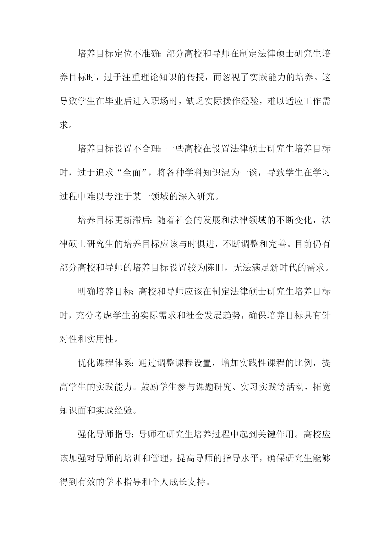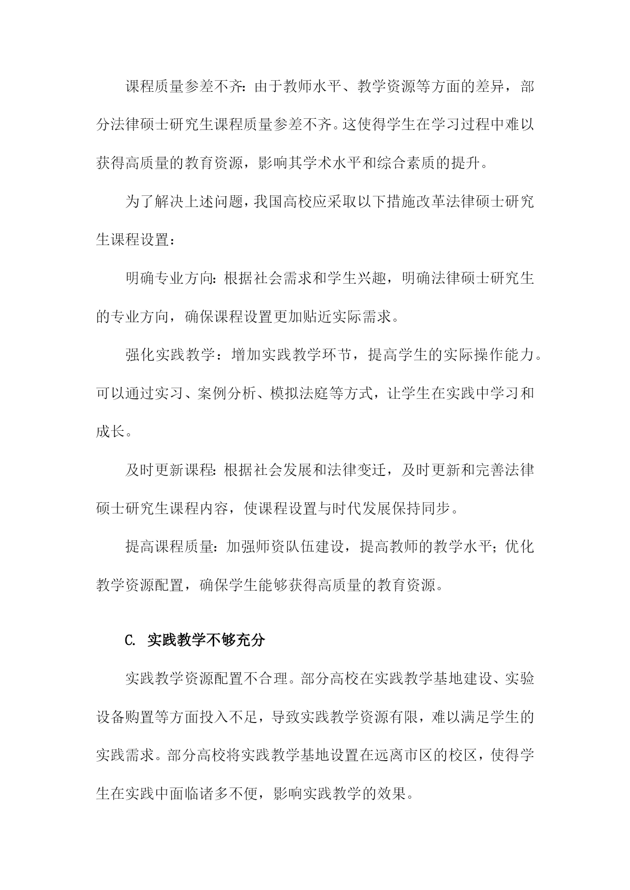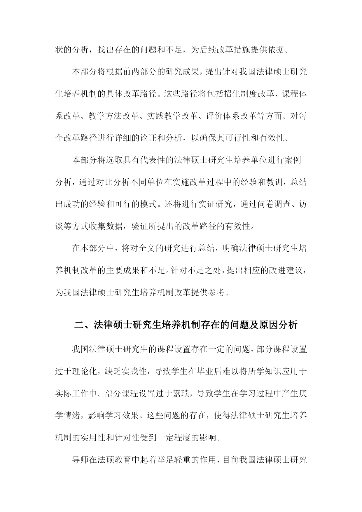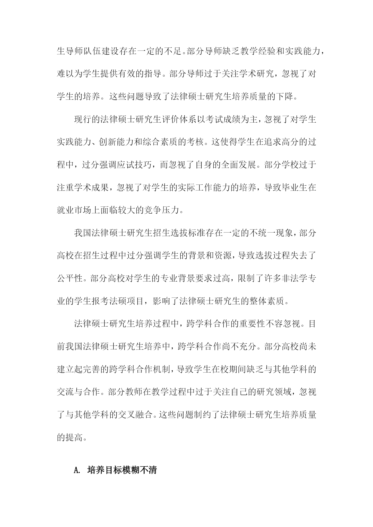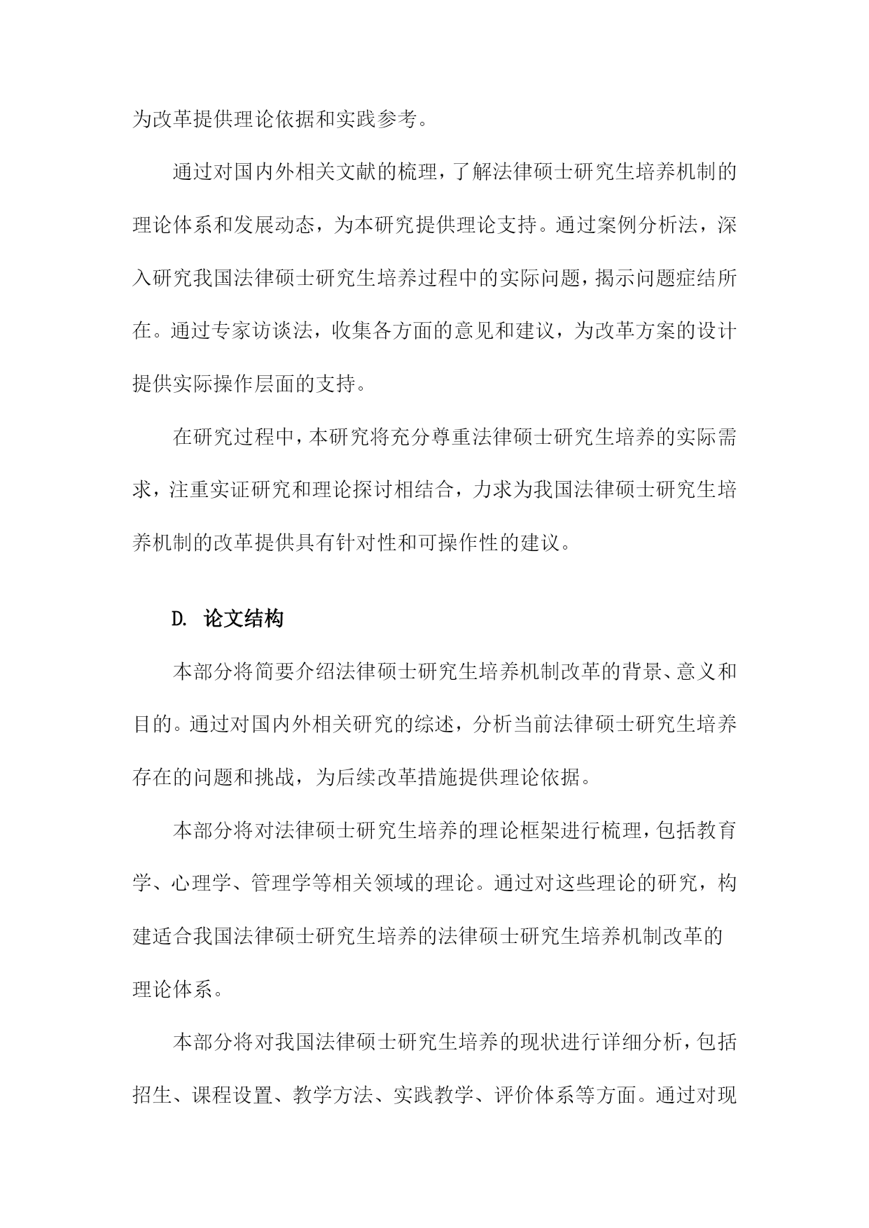 法律硕士研究生培养机制改革路径一、背景和意义随着社会的发展和法治建设的深入推进,法律硕士研究生教育在我国的地位日益凸显。培养一批具有较高政治素质、专业能力和创新精神的法律硕士研究生,对于提高我国法治建设和社会主义法治国家建设水平具有重要意义。当前我国法律硕士研究生培养机制存在一定的问题,如课程设置不合理、教学方法单实践教学环节薄弱等,这些问题制约了法律硕士研究生培养质量的提高。深化法律硕士研究生培养机制改革,对于推动我国法治建设进程具有重要的现实意义。深化法律硕士研究生培养机制改革有助于优化课程体系,我国法律硕士研究生课程设置存在一定的重复性和冗余性,导致学生在学习过程中缺乏针对性和实用性。可以对课程体系进行调整和优化,使之更加符合法律硕士研究生的培养需求,提高课程的针对性和实用性。深化法律硕士研究生培养机制改革有助于丰富教学方法,我国法律硕士研究生教学方法主要依赖于传统的讲授式教学,这种教学方式难以激发学生的学习兴趣和积极性。可以引入多元化的教学方法,如案例教学、讨论式教学、模拟法庭等,使教学更加生动有趣,提高学生的学习效果。深化法律硕士研究生培养机制改革有助于加强实践教学环节,我国法律硕士研究生实践教学环节相对薄弱,导致学生在实际工作中难以将理论知识与实践相结合。可以加大对实践教学的投入,建立健全实践教学基地,开展多样化的实践教学活动,使学生在实践中不断提高自己的能力。深化法律硕士研究生培养机制改革对于提高我国法律硕士研究生培养质量具有重要意义。通过优化课程体系、丰富教学方法和加强实践教学环节等方面的改革,有望为我国培养出更多具有高素质、高能力的法治人才,为我国法治建设和社会主义法治国家建设做出更大的贡献。A.法律硕士研究生培养机制的现状与问题课程设置不合理:部分高校的法律硕士研究生课程设置过于理论化,缺乏实践性,导致学生在毕业后难以适应实际工作需求。部分课程内容更新滞后,不能满足社会发展的需要。师资力量不足:部分高校法律硕士研究生导师数量有限,且多数导师年龄偏大,缺乏年轻化、专业化的教师队伍。这使得研究生在学术研究和实践能力上得不到充分的锻炼和提高。实践教学环节薄弱:部分高校法律硕士研究生实践教学环节设置不合理,实践教学基地建设滞后,导致学生在实践中难以获得有效的指导和帮助。评价体系不完善:现行法律硕士研究生评价体系过于注重考试成绩,忽视了对学生实践能力、创新能力和综合素质的评价。这使得部分学生过分追求分数,忽视了自身能力的提升。招生选拔不公平:部分高校法律硕士研究生招生过程中存在一定程度的不公平现象,如地区、背景等因素影响考生录取机会,导致选拔结果不尽合理。B.改革法律硕士研究生培养机制的必要性和重要性随着社会的快速发展和法治建设的不断深入,法律硕士研究生的培养质量和培养机制已经成为法学教育改革的重要议题。改革法律硕士研究生培养机制具有重要的现实意义和深远的历史使命。改革法律硕士研究生培养机制是适应新时代法治建设需求的必然要求。新时代法治建设对法律人才提出了更高的要求,需要具备扎实的法律理论基础、丰富的实践经验和较强的创新能力。改革法律硕士研究生培养机制有助于培养出更多具备这些素质的法律人才,为我国法治建设提供有力的人才支持。改革法律硕士研究生培养机制有利于提高法律硕士研究生的综合素质。法律硕士研究生在知识结构、实践能力、创新能力等方面存在一定的不足。改革法律硕士研究生培养机制可以从课程设置、教学方法、实践环节等方面进行优化,提高法律硕士研究生的综合素质,使其更好地适应社会发展的需求。改革法律硕士研究生培养机制有助于推动法学教育的创新发展。传统的法律硕士研究生培养模式存在一定的局限性,如过于注重理论学习、实践教学不够充分等。改革法律硕士研究生培养机制可以借鉴国际先进的法学教育理念和方法,推动法学教育的创新发展,为我国法学界培养出更多具有国际竞争力的优秀人才。改革法律硕士研究生培养机制有利于提升我国法学教育的国际地位。随着全球化的发展,法学教育的国际交流与合作日益密切。改革法律硕士研究生培养机制可以使我国法学教育更加接近国际标准,提升我国法学教育的国际地位和影响力。改革法律硕士研究生培养机制具有重要的现实意义和深远的历史使命。我们应该从多方面入手,全面推进法律硕士研究生培养机制的改革,为我国法治建设和法学教育事业的发展做出更大的贡献。C.研究目的和方法本研究旨在分析当前法律硕士研究生培养机制存在的问题,并提出改革路径,以期为我国法律硕士研究生教育的发展提供有益的建议。研究采用文献分析法、案例分析法和专家访谈法等多种研究方法,对法律硕士研究生培养机制的现状进行全面梳理,深入剖析问题根源,为改革提供理论依据和实践参考。通过对国内外相关文献的梳理,了解法律硕士研究生培养机制的理论体系