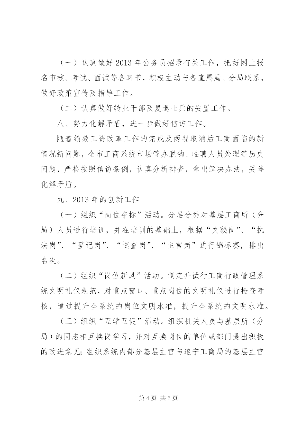 第PAGE\*Arabic\*MERGEFORMAT5页共NUMPAGES\*MERGEFORMAT5页工商局人事教育工作要点2013年,全市人事教育工作的总体思路是。以十七届四中全会精神为指导针,紧紧围绕市局党组的决策部署和省局人教处的指示要求,进一步规范干部人事管理,扎实抓好教育培训工作,深入开展文明创建活动,积极推进基层规范化建设,细致做好老干部服务工作,切实加强自身建设,提高综合素质,以饱满的精神状态完成各项工作任务。一、进一步加强市以下工商系统领导班子建设(一)进一步加强市以下工商系统领导班子思想政治建设,增强领导班子的凝聚力和战斗力。认真学习党的十七届四中全会精神,贯彻落实科学发展观、加强党的建设。(二)进一步加强领导班子组织建设。按照提高素质、优化结构、增强活力的要求,认真调整充实各直属局、分局领导班子。(三)进一步加强领导班子作风建设。认真开好民主生活会,切实解决班子中存在的主要问题。认真落实基层联系点制度,坚持深入基层调查研究,帮助基层解决实际问题。(四)进一步加强后备干部队伍建设。加强对后备干部的教育培训工作,提高后备干部的思想政治水平、业务工作能力、领导方法和领导艺术,促进后备干部队伍建设。要加强对后备干部的考察了解,加强管理,建立后备干部定期谈话制度,及时掌握后备干部的情况。二、继续推进干部人事制度改革,不断强化对干部工作的监督管理(一)继续推进干部人事制度改革。积极推行党组讨论干部任免事项投票表决制度。制定岗位绩效考核制度、不称职、不胜任现职干部的认定标准和调整办法等,选择部分直属局、分局和工商所(分局)进行试点,待试点取得经验后再推广。(二)进一步加大对干部工作的监督管理力度。特别是对各直属局、分局执行《条例》的情况进行监督,拟于7月上旬对直属局、分局选拔任用干部工作和职数管理进行一次检查,对发现不按照《条例》规定的程序和标准任用干部、擅自超职数配备干部的,将向市局党组汇报,情况严重的,必须严肃处理。(三)深化干部人事制度改革,在加强人员管理,提高人员积极性方面作出有益尝试。三、全面做好市、县工商局机构改革和事业单位人事制度改革工作(一)按照省局要求,做好市局机关机构改革及新“三定”的细化落实工作。(二)指导直属局、分局全面推进机构改革和事业单位人事制度改革工作。四、进一步加强教育培训工作(一)完成教育培训基地建设,确保“一市一所一基地”建设全面完成,构建起覆盖全系统的基层工商干部教育培训长效机制。(二)认真组织参加各级各类教育培训。2月下旬组织基层分局(所)长培训班,8月份认真组织领导干部读书班、中青年干部培训班、机关干部素质教育活动,组织基层岗位夺标活动。五、进一步加强基层建设工作(一)出台基层工商所建设的相关文件,以省局文明工商所考核细则为抓手,继续推进文明工商所考核创建工作,进一步推动全系统基层全面建设。(二)组织基层业务骨干到四川遂宁工商局交流学习。(三)树立全市工商系统基层服务经济发展典型。六、切实抓好事业单位绩效工资改革,认真做好机关事业单位工资滚动升级和全系统规范津补贴工作(一)按照省局和地方人事组织部门的相关要求,做好事业单位绩效工资改革工作。(二)认真做好机关公务员和事业单位工资滚动升级工作和全系统津贴补贴规范工作。(三)进一步完善人事教育信息化工作。学习推广使用干部人事软件和工资管理软件,分析研究统计数据,为开发工商系统人力资源提供参考。七、认真做好公务员招录和转业干部及复退士兵安置工作(一)认真做好2013年公务员招录有关工作,把好网上报名审核、考试、面试等各环节,积极主动与各直属局、分局联系,做好政策宣传及指导工作。(二)认真做好转业干部及复退士兵的安置工作。八、努力化解矛盾,进一步做好信访工作。随着绩效工资改革工作的完成及两费取消后工商面临的新情况新问题,全市工商系统市场管办脱钩、临聘人员处理等历史问题,严格按照信访条例,认真分析排查,拿出解决办法,妥善化解矛盾。九、2013年的创新工作(一)组织“岗位夺标”活动。分层分类对基层工商所(分局)人员进行培训,并在培训的基础上,根据“文秘岗”、“执法岗”、“登记岗”、“巡查岗”、“主官岗”进行锦标赛,排出名次。(二)组织“岗位新风”活动。制定并试行工商行政管理系统文明礼仪规范,对重点窗口、重点岗位的文明礼仪进行检查考核,通过提升全系统的岗位文明水准,提升全系统的文明水准。(三)组织“互学互促”活动。组织机关人员与基层所(分局)的同志相互换岗学习,并对互换岗位的单位或部门提出积极的改进意见;组织系统内部分基层主官与遂宁工商局的基层主官换岗学习,并对所学习的单位的工作提出积极建议。