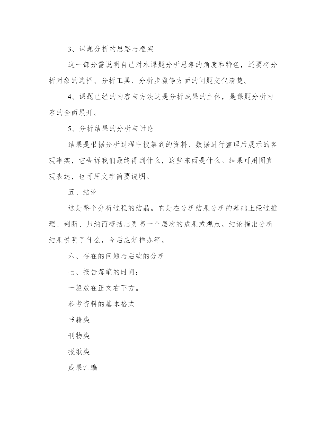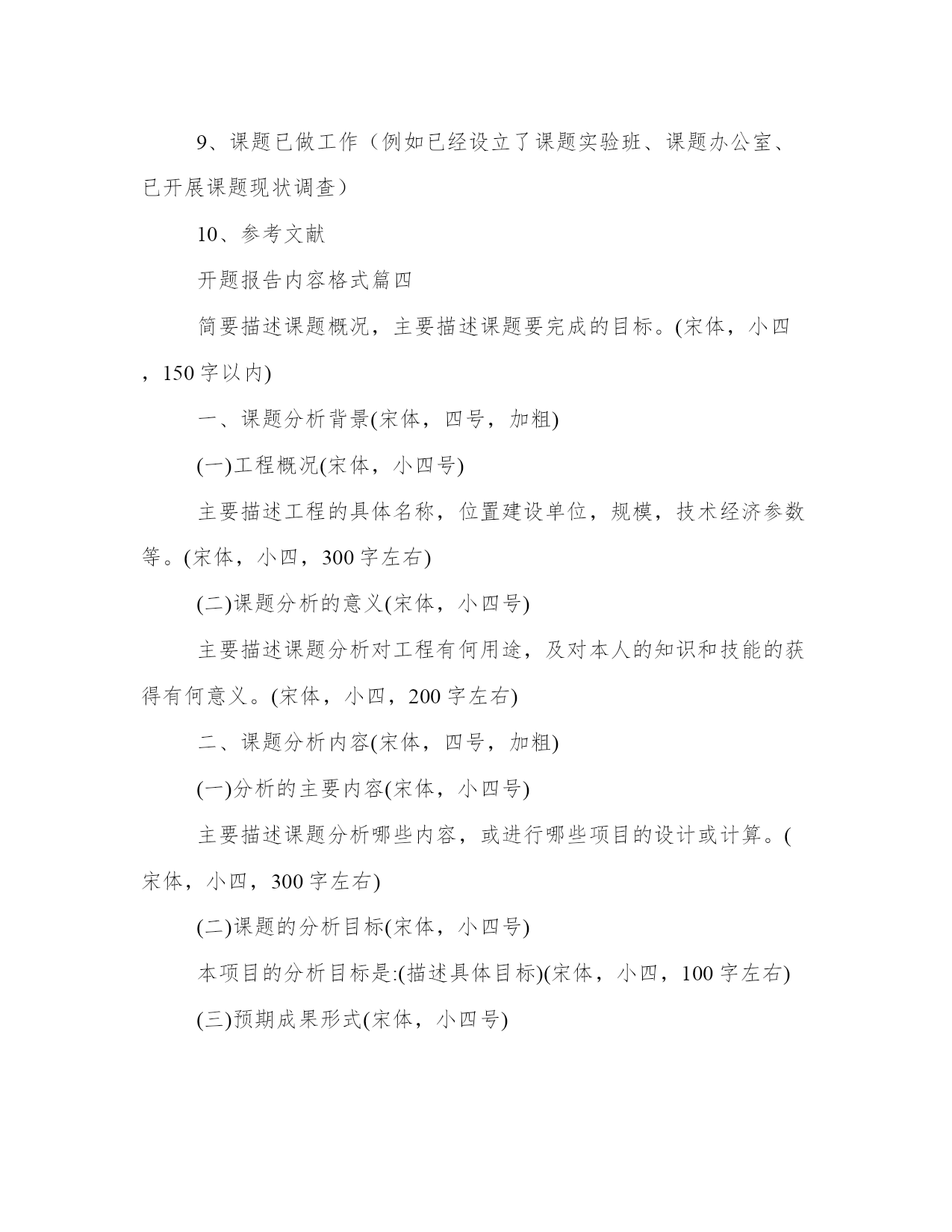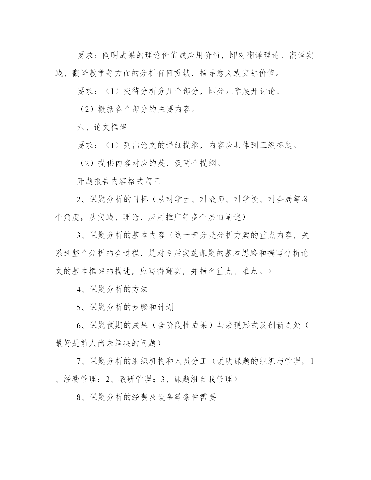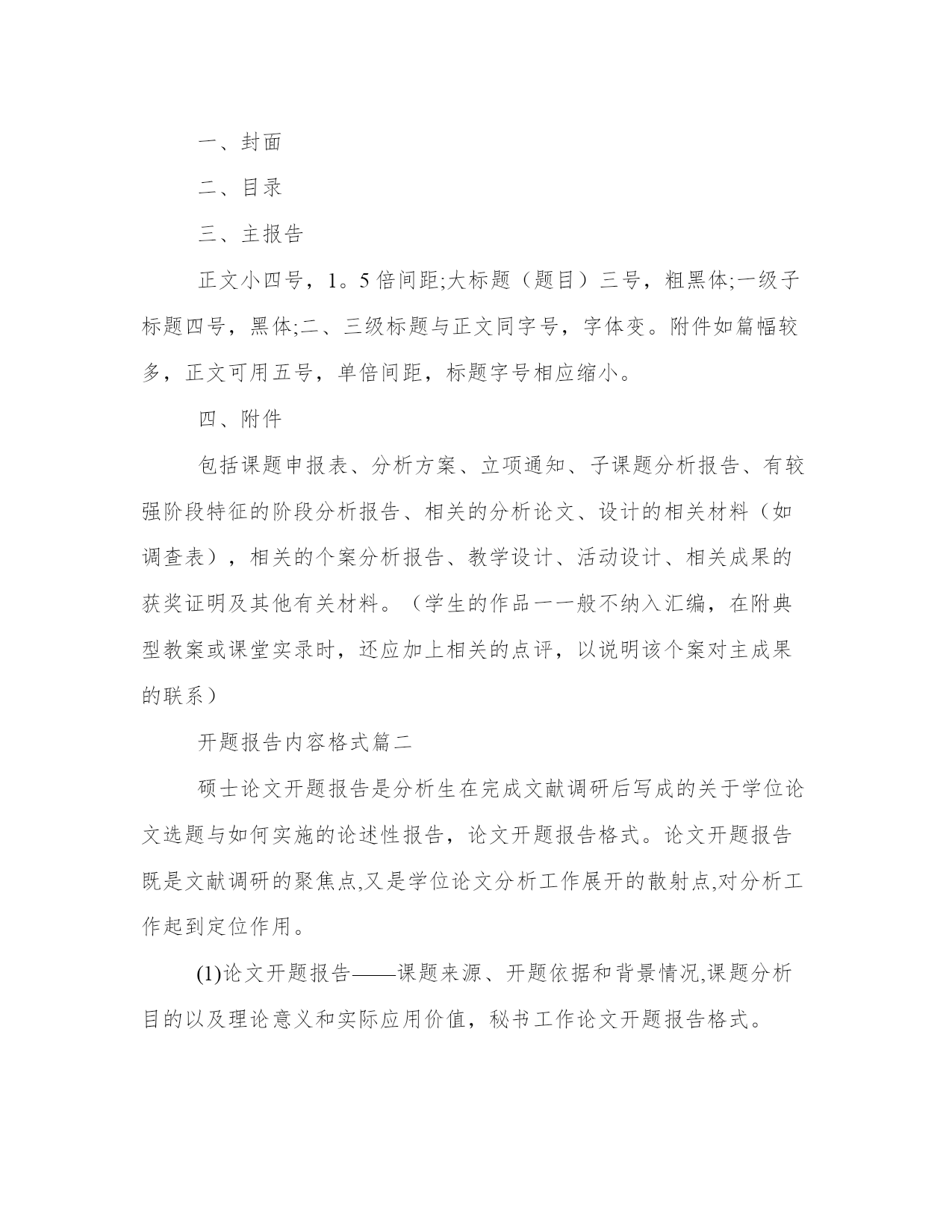 2024年开题报告内容格式(7篇)在经济发展迅速的今天,报告不再是罕见的东西,报告中提到的所有信息应该是准确无误的。报告书写有哪些要求呢?我们怎样才能写好一篇报告呢?以下是我为大家搜集的报告范文,仅供参考,一起来看看吧开题报告内容格式篇一一、题目。要求明确、鲜明、简练、醒目。一般不用副标题,字数不宜过长。二、摘要。要求准确、精练、简朴地概括全文内容。三、引言(或前言、问题的提出)。引言不是分析报告的主体部分,因此要简明扼要。内容包括:1、提出分析的问题;2、介绍分析的背景;3、指出分析的目的;4、阐明分析的假设;5、说明分析的意义。2、仪器设备的应用;3、相关因素和无关因素的控制;4、操作程序与方法;5、操作性概念的界定;6、分析结果的统计方法。1、用不同形式表达分析结果;2、描述统计的显著性水平差异;3、分析结果。六、讨论(或小结)。这也是分析报告的主体部分。其内容:1、本课题分析方法的科学性;2、本课题分析结果的可靠性;3、本分析成果的价值;4、本课题目前分析的局限性;5、进一步分析的建议。七、结论。这是分析报告的精髓部分。文字要简练、措词、慎重、严谨、逻辑性强。主要内容:1、分析解决了什么问题,还有哪些问题没有解决;2、分析结果说明了什么问题,是否实现了原来的假设;3、指出要进一步分析的问题。八、参考文献。九、附录。如调查表、测量结果表等。课题分析报告撰写的基本要求一、标题可使用比正文大1—2号的字型与变化了的字体(黑体)来排列,上空2—3行,下空1—2行。二、署名接标题下一行,一般写上“××单位课题组”,在右上角打上一个“﹡”,然后在首页文末划一横线下面加注,也注上“﹡”号相呼应。加注时要标明课题的级别、性质、归属、立题年份、负责人姓名、成员(顾问)姓名、分析报告的撰写者以及一些谢辞。也可单独列一页,或放置正文末尾括号中,将具体的工作与成员予以说明。三、内容摘要和关键词内容摘要是对分析报告中所描述的背景、采用的主要方法、形成的结论与提出的新见解的简要说明,以100—300字为宜,接着“××单位课题组”空1—2行,其中“内容摘要”用中括号,变体字。关键词除了帮助检索之外,还在于可提醒本分析报告的阅读者着意理解所列词语,以2—5个为宜,紧接着“内容摘要”,其中“关键词”也用中括号,变体字。四、正文正文是教育科研报告的.主体部分,包括以下几个方面:1、问题的提出⑴是揭示问题或困难;⑵是分析的目的和意义⑶是分析现状的综述⑷是本课题关键概念的界定。2、课题分析目标目标的确定与后文的分析效果分析的思路要一致,有一定的联系。3、课题分析的思路与框架这一部分需说明自己对本课题分析思路的角度和特色,还要将分析对象的选择、分析工具、分析步骤等方面的问题交代清楚。4、课题已经的内容与方法这是分析成果的主体,是课题分析内容的全面展开。5、分析结果的分析与讨论结果是根据分析过程中搜集到的资料、数据进行整理后展示的客观事实,它告诉我们最终得到什么,这些东西是什么。结果可用图直观表达,也可用文字简要说明。五、结论这是整个分析过程的结晶。它是在分析结果分析的基础上经过推理、判断、归纳而概括出更高一个层次的成果或观点。结论指出分析结果说明了什么,今后应怎样办等。六、存在的问题与后续的分析七、报告落笔的时间:一般放在正文右下方。参考资料的基本格式书籍类刊物类报纸类成果汇编一、封面二、目录三、主报告正文小四号,1。5倍间距;大标题(题目)三号,粗黑体;一级子标题四号,黑体;二、三级标题与正文同字号,字体变。附件如篇幅较多,正文可用五号,单倍间距,标题字号相应缩小。四、附件包括课题申报表、分析方案、立项通知、子课题分析报告、有较强阶段特征的阶段分析报告、相关的分析论文、设计的相关材料(如调查表),相关的个案分析报告、教学设计、活动设计、相关成果的获奖证明及其他有关材料。(学生的作品一一般不纳入汇编,在附典型教案或课堂实录时,还应加上相关的点评,以说明该个案对主成果的联系)开题报告内容格式篇二硕士论文开题报告是分析生在完成文献调研后写成的关于学位论文选题与如何实施的论述性报告,论文开题报告格式。论文开题报告既是文献调研的聚焦点,又是学位论文分析工作展开的散射点,对分析工作起到定位作用。(1)论文开题报告——课题来源、开题依据和背景情况,课题分析目的以及理论意义和实际应用价值,秘书工作论文开题报告格式。(2)论文开题报告——文献综述。在阅读规定文献量(不少于50篇,其中外文文献占40%以上)的基础上,着重阐述该分析课题国内外的分析现状及发展动态,同时介绍查阅文献的范围以及查阅方式、手段。(3)论文开题报告——主要分析内容。