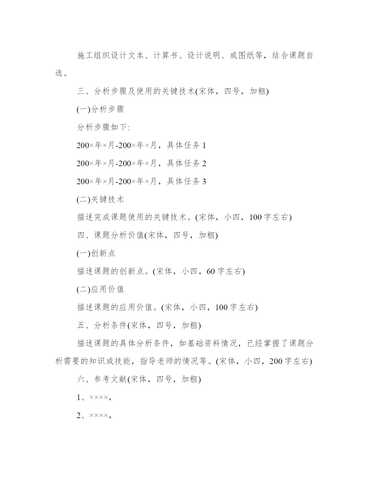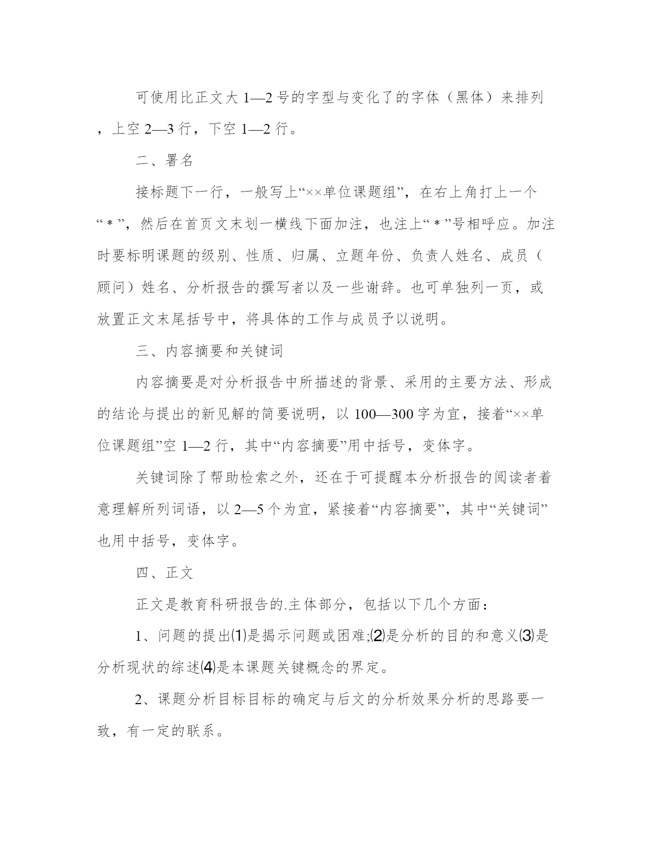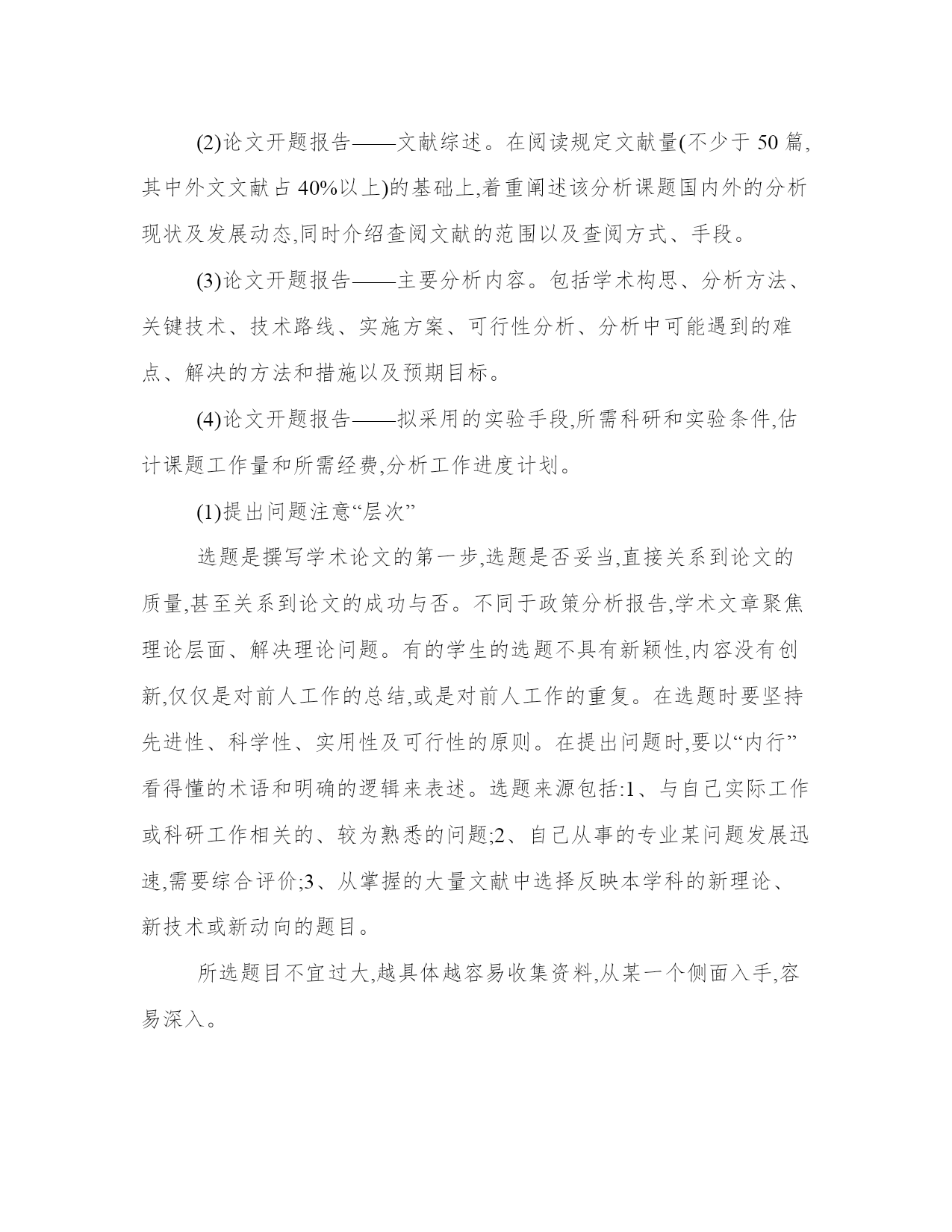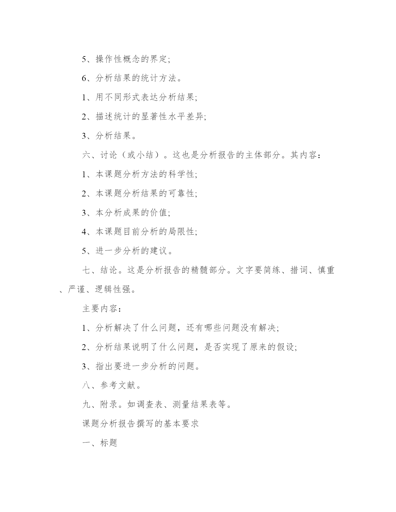2024年开题报告内容格式(7篇)在经济发展迅速的今天,报告不再是罕见的东西,报告中提到的所有信息应该是准确无误的。报告书写有哪些要求呢?我们怎样才能写好一篇报告呢?以下是我为大家搜集的报告范文,仅供参考,一起来看看吧开题报告内容格式篇一一、题目。要求明确、鲜明、简练、醒目。一般不用副标题,字数不宜过长。二、摘要。要求准确、精练、简朴地概括全文内容。三、引言(或前言、问题的提出)。引言不是分析报告的主体部分,因此要简明扼要。内容包括:1、提出分析的问题;2、介绍分析的背景;3、指出分析的目的;4、阐明分析的假设;5、说明分析的意义。2、仪器设备的应用;3、相关因素和无关因素的控制;4、操作程序与方法;5、操作性概念的界定;6、分析结果的统计方法。1、用不同形式表达分析结果;2、描述统计的显著性水平差异;3、分析结果。六、讨论(或小结)。这也是分析报告的主体部分。其内容:1、本课题分析方法的科学性;2、本课题分析结果的可靠性;3、本分析成果的价值;4、本课题目前分析的局限性;5、进一步分析的建议。七、结论。这是分析报告的精髓部分。文字要简练、措词、慎重、严谨、逻辑性强。主要内容:1、分析解决了什么问题,还有哪些问题没有解决;2、分析结果说明了什么问题,是否实现了原来的假设;3、指出要进一步分析的问题。八、参考文献。九、附录。如调查表、测量结果表等。课题分析报告撰写的基本要求一、标题可使用比正文大1—2号的字型与变化了的字体(黑体)来排列,上空2—3行,下空1—2行。二、署名接标题下一行,一般写上“××单位课题组”,在右上角打上一个“﹡”,然后在首页文末划一横线下面加注,也注上“﹡”号相呼应。加注时要标明课题的级别、性质、归属、立题年份、负责人姓名、成员(顾问)姓名、分析报告的撰写者以及一些谢辞。也可单独列一页,或放置正文末尾括号中,将具体的工作与成员予以说明。三、内容摘要和关键词内容摘要是对分析报告中所描述的背景、采用的主要方法、形成的结论与提出的新见解的简要说明,以100—300字为宜,接着“××单位课题组”空1—2行,其中“内容摘要”用中括号,变体字。关键词除了帮助检索之外,还在于可提醒本分析报告的阅读者着意理解所列词语,以2—5个为宜,紧接着“内容摘要”,其中“关键词”也用中括号,变体字。四、正文正文是教育科研报告的.主体部分,包括以下几个方面:1、问题的提出⑴是揭示问题或困难;⑵是分析的目的和意义⑶是分析现状的综述⑷是本课题关键概念的界定。2、课题分析目标目标的确定与后文的分析效果分析的思路要一致,有一定的联系。3、课题分析的思路与框架这一部分需说明自己对本课题分析思路的角度和特色,还要将分析对象的选择、分析工具、分析步骤等方面的问题交代清楚。4、课题已经的内容与方法这是分析成果的主体,是课题分析内容的全面展开。5、分析结果的分析与讨论结果是根据分析过程中搜集到的资料、数据进行整理后展示的客观事实,它告诉我们最终得到什么,这些东西是什么。结果可用图直观表达,也可用文字简要说明。五、结论这是整个分析过程的结晶。它是在分析结果分析的基础上经过推理、判断、归纳而概括出更高一个层次的成果或观点。结论指出分析结果说明了什么,今后应怎样办等。六、存在的问题与后续的分析七、报告落笔的时间:一般放在正文右下方。参考资料的基本格式书籍类刊物类报纸类成果汇编一、封面二、目录三、主报告正文小四号,1。5倍间距;大标题(题目)三号,粗黑体;一级子标题四号,黑体;二、三级标题与正文同字号,字体变。附件如篇幅较多,正文可用五号,单倍间距,标题字号相应缩小。四、附件包括课题申报表、分析方案、立项通知、子课题分析报告、有较强阶段特征的阶段分析报告、相关的分析论文、设计的相关材料(如调查表),相关的个案分析报告、教学设计、活动设计、相关成果的获奖证明及其他有关材料。(学生的作品一一般不纳入汇编,在附典型教案或课堂实录时,还应加上相关的点评,以说明该个案对主成果的联系)开题报告内容格式篇二硕士论文开题报告是分析生在完成文献调研后写成的关于学位论文选题与如何实施的论述性报告,论文开题报告格式。论文开题报告既是文献调研的聚焦点,又是学位论文分析工作展开的散射点,对分析工作起到定位作用。(1)论文开题报告——课题来源、开题依据和背景情况,课题分析目的以及理论意义和实际应用价值,秘书工作论文开题报告格式。(2)论文开题报告——文献综述。在阅读规定文献量(不少于50篇,其中外文文献占40%以上)的基础上,着重阐述该分析课题国内外的分析现状及发展动态,同时介绍查阅文献的范围以及查阅方式、手段。(3)论文开题报告——主要分析内容。