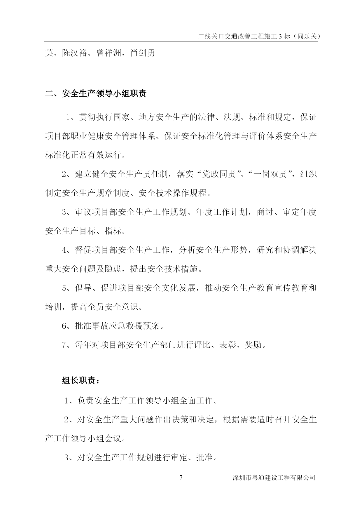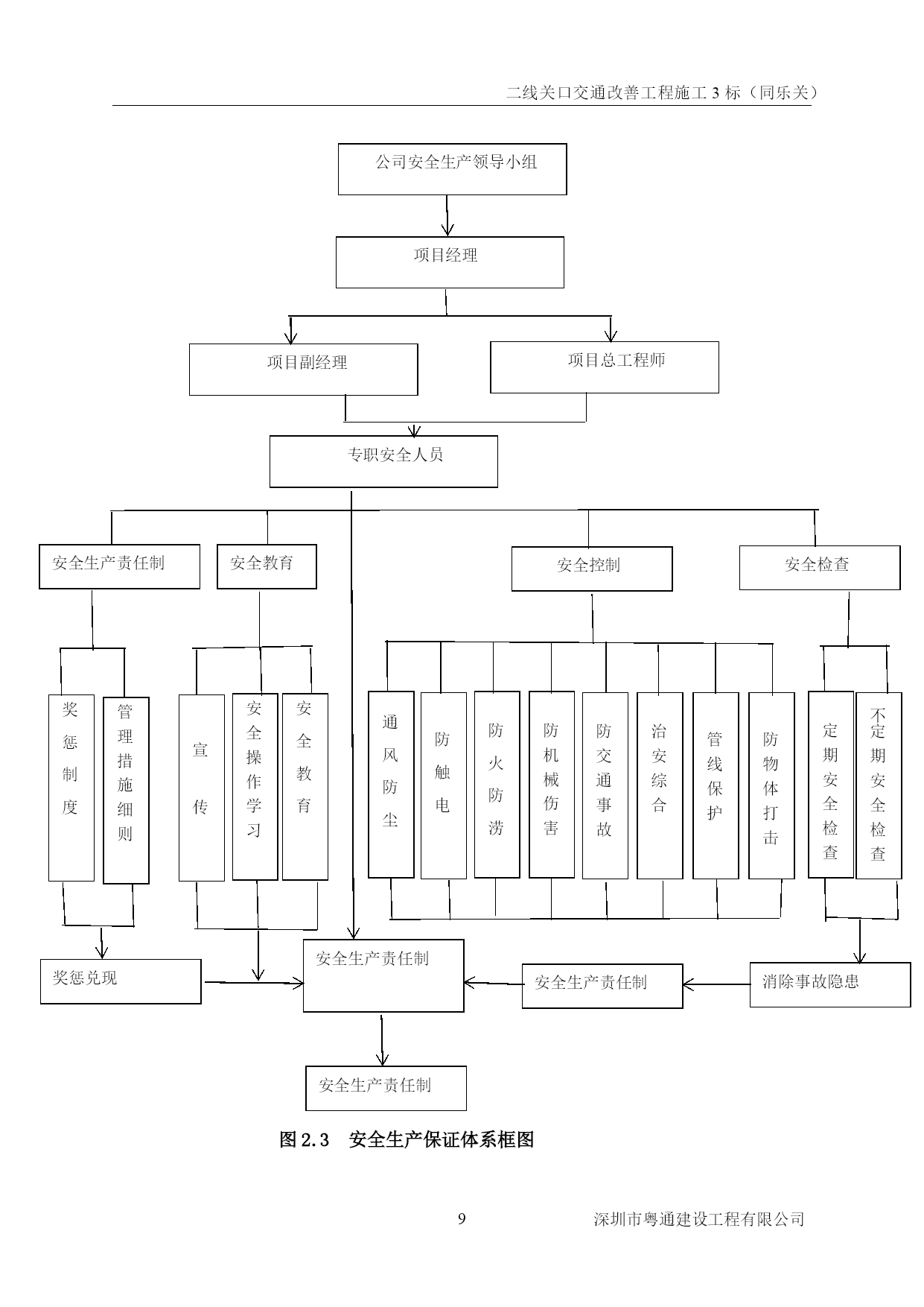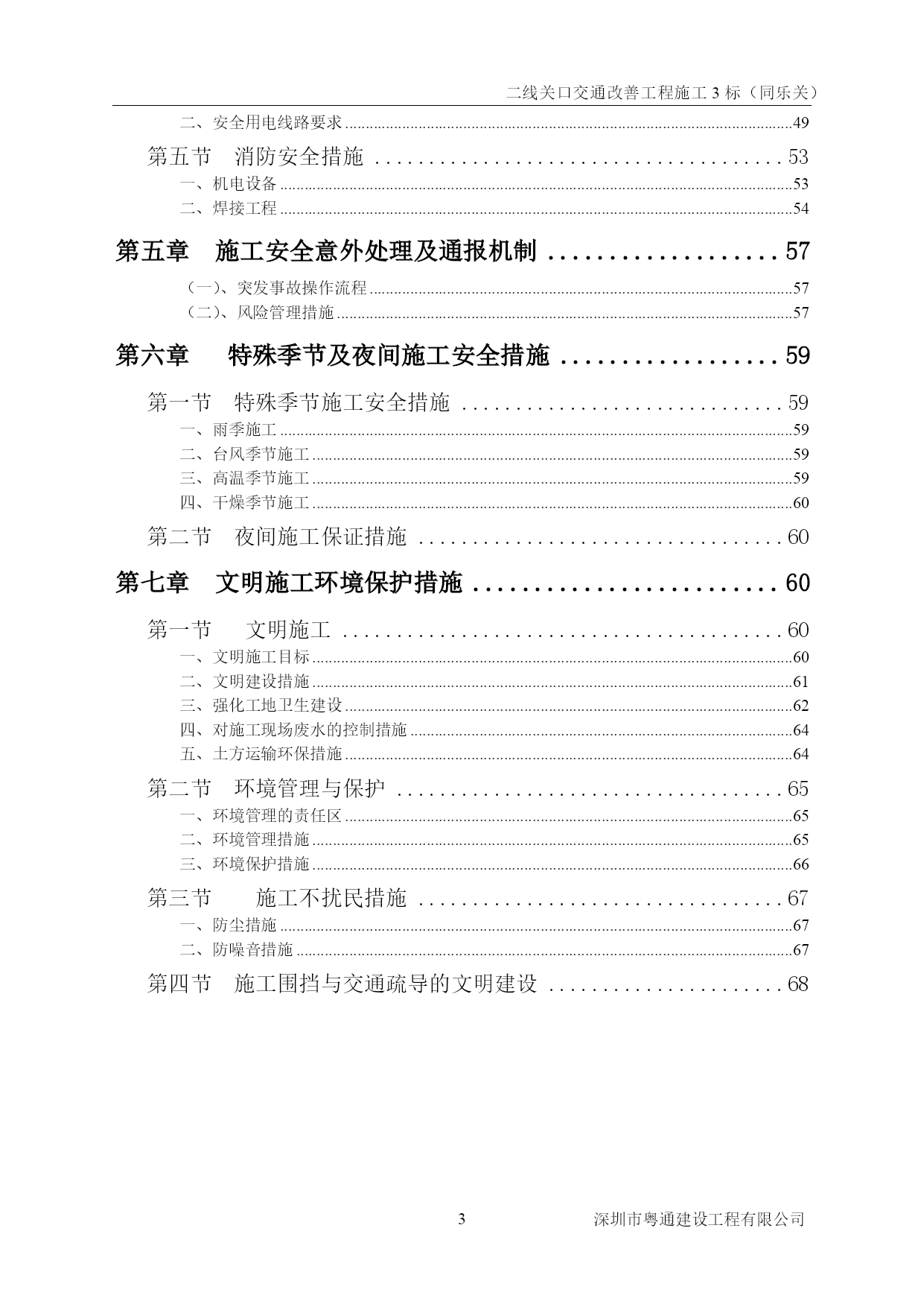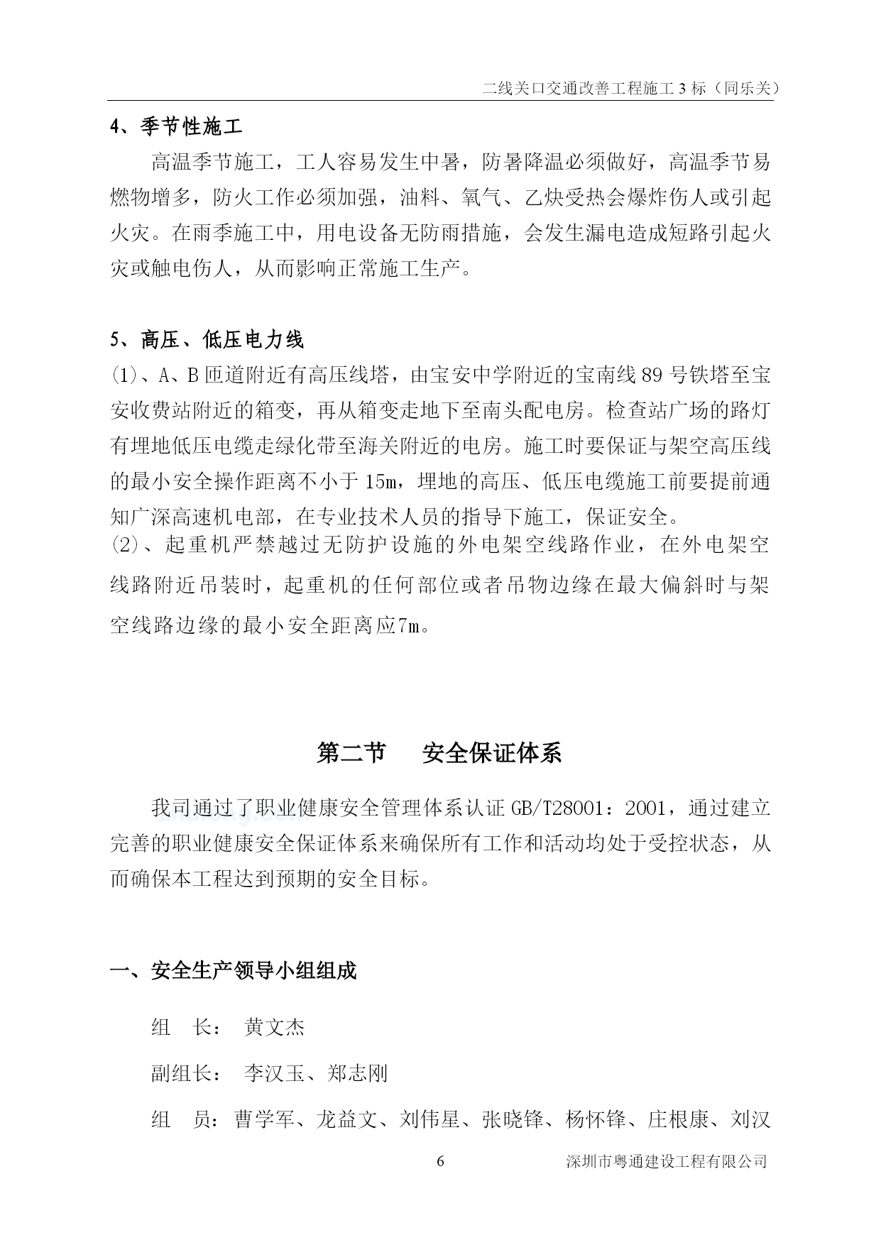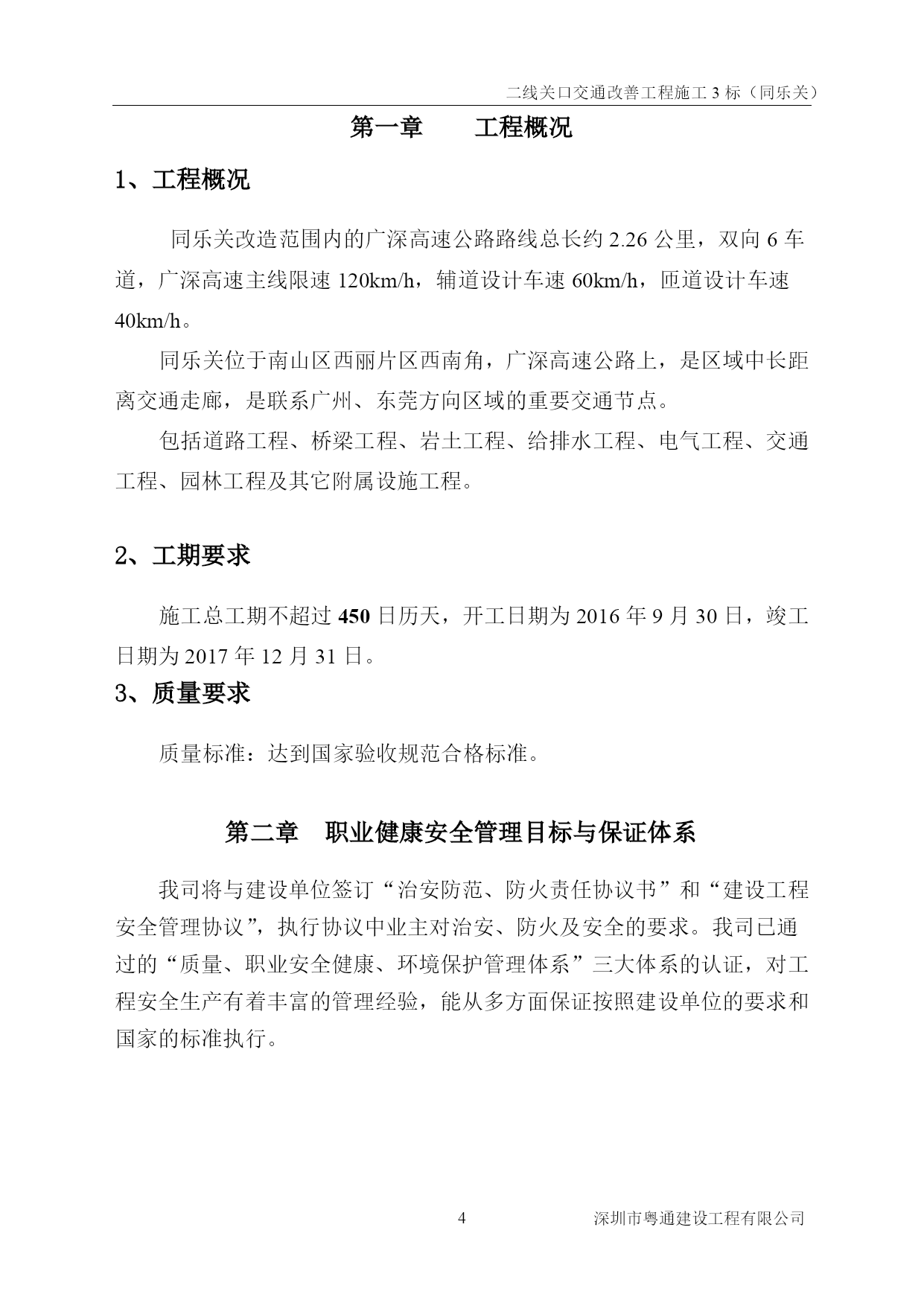 二线关口交通改善工程施工3标(同乐关)PAGEPAGE\*MERGEFORMAT0深圳市粤通建设工程有限公司二线关口交通改善工程施工3标(同乐关)编制:复核:审批:深圳市粤通建设工程有限公司2016年9月30日PAGE\*MERGEFORMAT9深圳市粤通建设工程有限公司目录TOC\h\z\t"标题1,1,标题2,2,标题3,3,样式标题2章节Char+宋体小四,2,样式施组标准正文,3,标题,1,样式第一章+段前:0.5行段后:0.5行,1"HYPERLINK\l_Toc30030第一章工程概况PAGEREF_Toc300305HYPERLINK\l_Toc871、工程概况PAGEREF_Toc875HYPERLINK\l_Toc206382、工期要求PAGEREF_Toc206385HYPERLINK\l_Toc103303、质量要求PAGEREF_Toc103305HYPERLINK\l_Toc12640第二章职业健康安全管理目标与保证体系PAGEREF_Toc126405HYPERLINK\l_Toc26574第一节安全目标及风险评价PAGEREF_Toc265746HYPERLINK\l_Toc2420一、安全目标PAGEREF_Toc24206HYPERLINK\l_Toc26974二、施工风险分析PAGEREF_Toc269746HYPERLINK\l_Toc32763第二节安全保证体系PAGEREF_Toc327637HYPERLINK\l_Toc19013一、安全生产领导小组组成PAGEREF_Toc190137HYPERLINK\l_Toc28023二、安全生产领导小组职责PAGEREF_Toc280238HYPERLINK\l_Toc14435三、职业健康安全保证体系PAGEREF_Toc144359HYPERLINK\l_Toc18950第三章职业健康安全的保证组织措施PAGEREF_Toc1895011HYPERLINK\l_Toc19995第一节安全生产责任制PAGEREF_Toc1999511HYPERLINK\l_Toc9811一、项目部总经理安全职责PAGEREF_Toc981111HYPERLINK\l_Toc497二、项目部副总经理(项目经理)安全职责PAGEREF_Toc49712HYPERLINK\l_Toc19765三、项目部副总经理(技术负责人)的安全职责PAGEREF_Toc1976512HYPERLINK\l_Toc28735四、项目部安全组长的安全职责PAGEREF_Toc2873514HYPERLINK\l_Toc23313五、项目部安全员的安全职责PAGEREF_Toc2331314HYPERLINK\l_Toc14207六、工程组长的安全职责PAGEREF_Toc1420716HYPERLINK\l_Toc16758七、班组长的安全职责PAGEREF_Toc1675816HYPERLINK\l_Toc9213六、工人的安全职责PAGEREF_Toc921317HYPERLINK\l_Toc8344第二节安全管理制度PAGEREF_Toc834417HYPERLINK\l_Toc3558一、编制安全生产技术措施制度PAGEREF_Toc355817HYPERLINK\l_Toc28044二、安全教育制度PAGEREF_Toc2804418HYPERLINK\l_Toc9495三、特殊工种职工实行持证上岗制度PAGEREF_Toc949518HYPERLINK\l_Toc21363四、安全技术措施制度PAGEREF_Toc2136318HYPERLINK\l_Toc22五、安全交底制度PAGEREF_Toc2218HYPERLINK\l_Toc28409六、班前安全活动制度PAGEREF_Toc2840919HYPERLINK\l_Toc12312七、安全检查制度PAGEREF_Toc1231219HYPERLINK\l_Toc16084八、现场防火管理制度PAGEREF_Toc1608425HYPERLIN