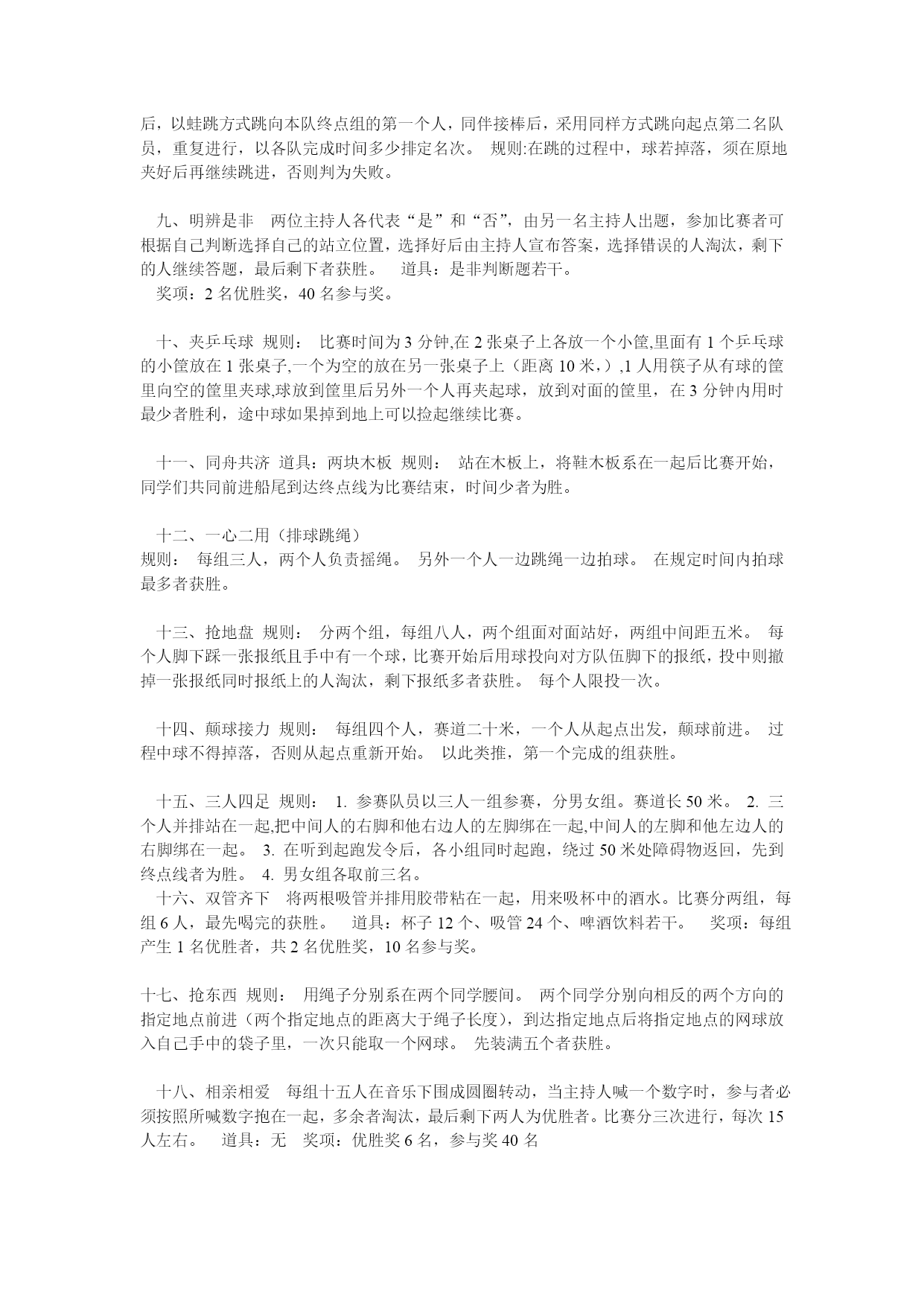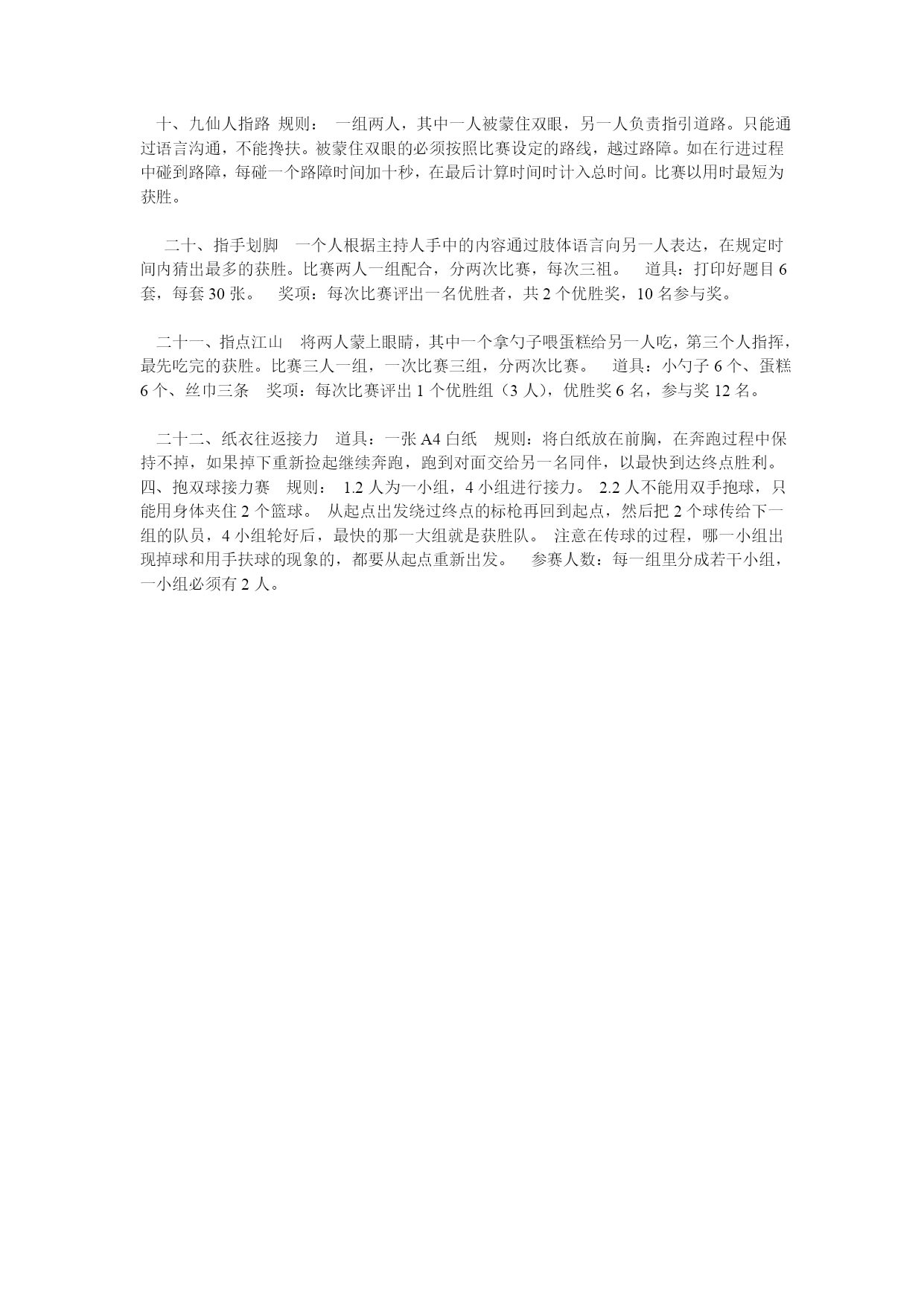 【深圳市中奥体育文化发展有限公司】HYPERLINK"http://www.kltd365.com"http://www.kltd365.com0755-25179936深圳中奥体育发展公司是专业策划组织趣味运动会,趣味体育活动,水上趣味运动会,体育营销、,运动会,体育比赛,企业文化活动、开盘奠基、企业庆典等一系活动策划的专业公司。趣味运动会方案一.摸石过河规则:每个运动员二块砖头,放在起点线后沿(纵向放置),听到裁判员发出“各就位”口令后,运动员两脚站在两块砖上,当裁判员鸣枪后,运动员即可起动,提起左脚(左右脚可自定),用手拿起原左脚踏的一块砖头,并放置前方(距离自定),左脚踏上前方砖头,提起右脚,用手拿起原右脚踏的一块砖并放至到前方(距离自定),右脚踏上前方木砖头,这样依此前进,直至最后一块砖头用手拿起人出终点线。途中如有脚落地,判为犯规,不记成绩。二、口口相传规则:每组八个人,可几组同时进行。一组每人之间间距五米排成一队,口中咬住两只筷子。第一个人开始用筷子固定好一个乒乓球,待比赛开始后走到(为了安全起见,参赛者不得跑步前行)第二个人旁边将乒乓球传给第二个人,传递过程中不得用手。否则取消比赛资格。中途掉落则返回上一个人从新开始,最先完成比赛者获胜。三、看我七十二变各队参加晚会的人员的所有衣物在十分钟内将本队的队长更换造型,评出,比赛分两组,每组8名副书记登台亮相,最后请每位队长用跟自己队专业相关的语言拜年,风格方式不限。道具:无奖项:最佳创意奖一名,最佳上镜奖一名,最佳模特奖一名,参与奖14名四、乒乓接力每组8人站成一列,前方站一主持人,每个参赛者口中咬一个勺子,比赛开始时第一个参赛者在勺子上放一个乒乓球前行,绕主持人一圈后回来将乒乓球放到第二个人勺子上,依此类推,最先完成的队获胜。比赛每组8人,一次比赛两组,分两次比赛。道具:勺子32个,乒乓球4个奖项:道具勺子五、托球跑规则:乒乓球必须放在乒乓球拍的中间,不能用手固定,每个人每次只能托一个球,从起点到终点,再从终点返回起点,球不掉在地上为有效,如果球在托送途中掉到地上,选手必须回到起点重来。在规定的赛程内用时最少者获胜。六、螃蟹赛跑规则:1.参赛队员一双人小组参赛,赛道长50米2.一次七组同时比赛,成纵队站在起点线。听到预备信号时,同组两人背对背用躯干夹抵住一篮球。听到开始信号后,两人像螃蟹状横着向终点线跑去,先完成的三队获胜。3.听到开始信号夹好球后方可离开起跑线4.中途球落地,必须从落地处夹起才能继续进行。5.抱球跑者取消比赛资格。七、反弹大灌篮规则:每队5人,一个网球、纸篓(纸篓背在背后)。跑到指定地点后将网球用力掷向地面,网球弹起来后用身后的纸篓接住,什么时间接住什么时间往回跑,以此类推完成比赛。最快完成五个回合获胜。八、脚夹球跳接力赛规则:1.共6人。分为2组,起点和终点各3人,两组相对站立,相距15米站成一路纵队,起点的第一人手拿接力棒,两脚夹一软式排球准备。当听到信号后,以蛙跳方式跳向本队终点组的第一个人,同伴接棒后,采用同样方式跳向起点第二名队员,重复进行,以各队完成时间多少排定名次。规则:在跳的过程中,球若掉落,须在原地夹好后再继续跳进,否则判为失败。九、明辨是非两位主持人各代表“是”和“否”,由另一名主持人出题,参加比赛者可根据自己判断选择自己的站立位置,选择好后由主持人宣布答案,选择错误的人淘汰,剩下的人继续答题,最后剩下者获胜。道具:是非判断题若干。奖项:2名优胜奖,40名参与奖。十、夹乒乓球规则:比赛时间为3分钟,在2张桌子上各放一个小筐,里面有1个乒乓球的小筐放在1张桌子,一个为空的放在另一张桌子上(距离10米,),1人用筷子从有球的筐里向空的筐里夹球,球放到筐里后另外一个人再夹起球,放到对面的筐里,在3分钟内用时最少者胜利,途中球如果掉到地上可以捡起继续比赛。十一、同舟共济道具:两块木板规则:站在木板上,将鞋木板系在一起后比赛开始,同学们共同前进船尾到达终点线为比赛结束,时间少者为胜。十二、一心二用(排球跳绳)规则:每组三人,两个人负责摇绳。另外一个人一边跳绳一边拍球。在规定时间内拍球最多者获胜。十三、抢地盘规则:分两个组,每组八人,两个组面对面站好,两组中间距五米。每个人脚下踩一张报纸且手中有一个球,比赛开始后用球投向对方队伍脚下的报纸,投中则撤掉一张报纸同时报纸上的人淘汰,剩下报纸多者获胜。每个人限投一次。十四、颠球接力规则:每组四个人,赛道二十米,一个人从起点出发,颠球前进。过程中球不得掉落,否则从起点重新开始。以此类推,第一个完成的组获胜。十五、三人四足规则:1.参赛队员以三人一组参赛,分男女组。赛道长50米。2.三个人并排站在一起,把中间人的右脚和他右