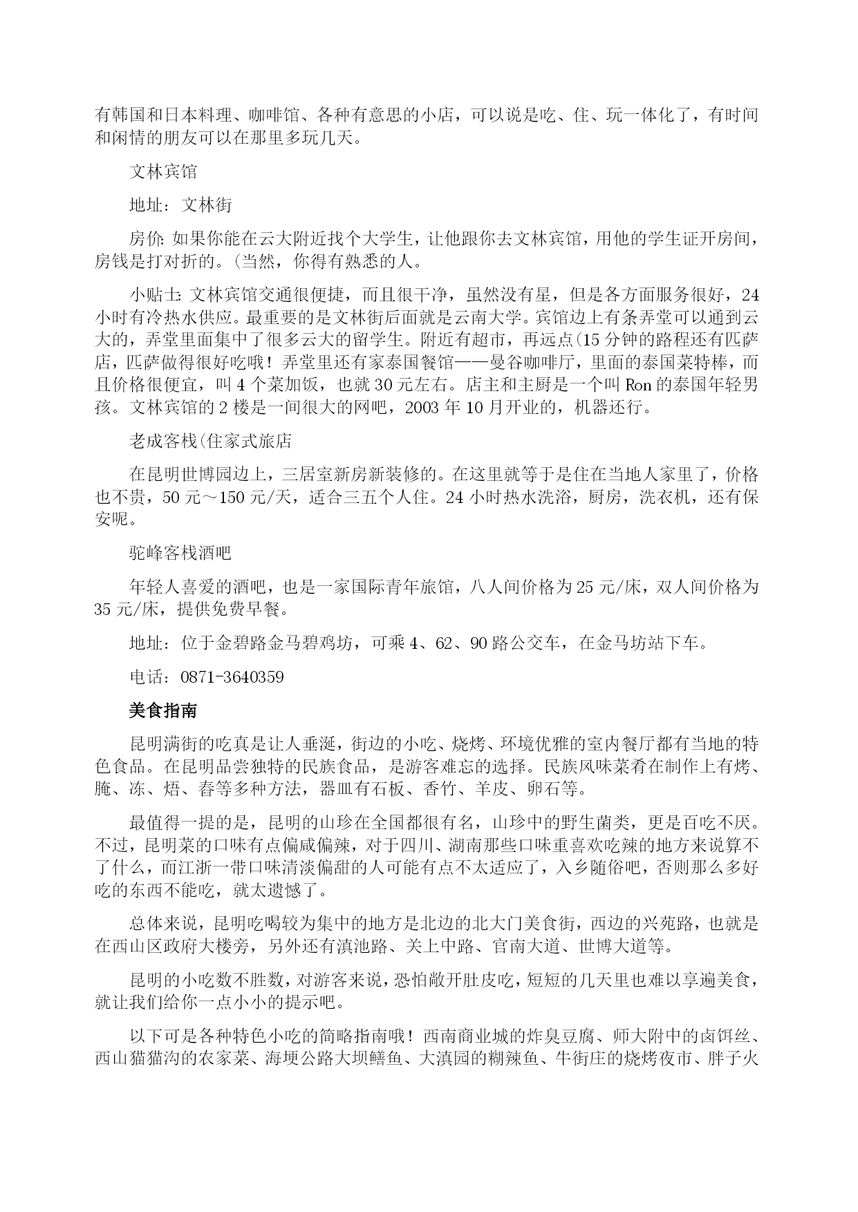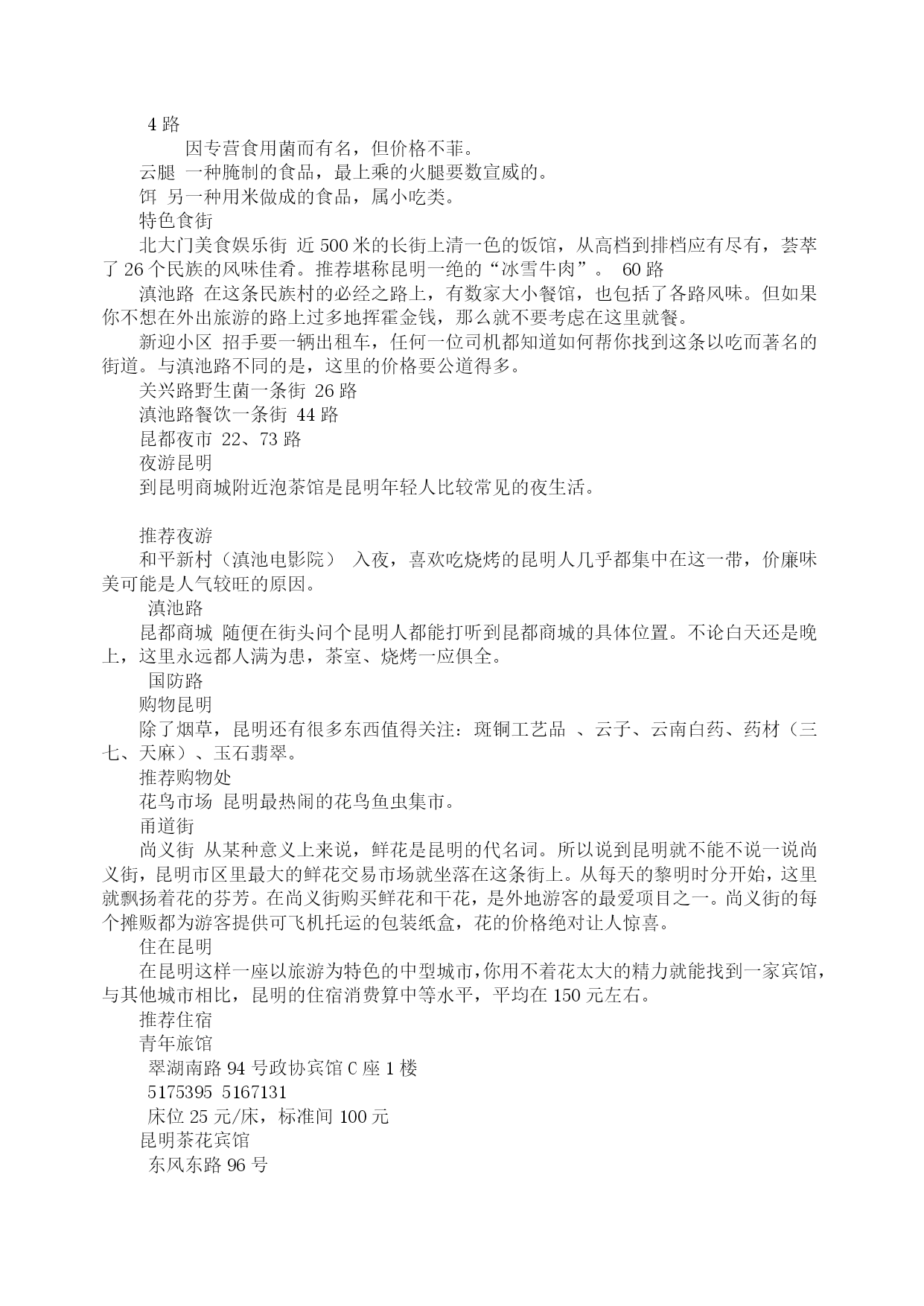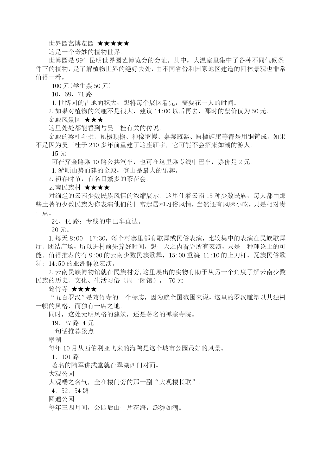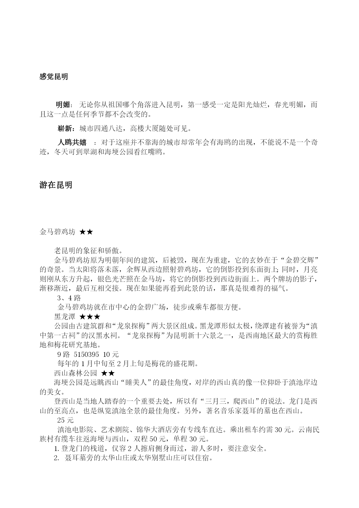 昆明:自助游攻略(2009年8月27日)分类:HYPERLINK"http://how.i.qunar.com/?cat=1201"\o"显示旅游小贴士的所有日志"旅游小贴士标签:HYPERLINK"http://how.i.qunar.com/?tag=%e4%ba%91%e5%8d%97"云南,HYPERLINK"http://how.i.qunar.com/?tag=%e4%ba%a4%e9%80%9a"交通,HYPERLINK"http://how.i.qunar.com/?tag=%e4%bd%8f"住,HYPERLINK"http://how.i.qunar.com/?tag=%e5%ae%9e%e7%94%a8"实用,HYPERLINK"http://how.i.qunar.com/?tag=%e6%94%bb%e7%95%a5"攻略,HYPERLINK"http://how.i.qunar.com/?tag=%e6%98%86%e6%98%8e"昆明,HYPERLINK"http://how.i.qunar.com/?tag=%e6%b0%94%e5%80%99"气候,HYPERLINK"http://how.i.qunar.com/?tag=%e7%be%8e%e9%a3%9f"美食关键词:悠闲:昆明人自来有休闲的习惯,那些没有尊严的小生意懒得做,推着三轮车满城卖水果的没有一个昆明人,包括擦皮鞋的,即使偶尔有几个下岗工人混于其中,也是两天便不见其踪影。教几句昆明话:昆明话属于北方方言,虽然听上去土气、不悦耳,但象声词特多,特别幽默生动,别有一番风味。熟悉几句本地话可让旅游更添趣味。1、称赞板扎2、惊叹埋埋散3、是不是咯是4、怎么咋咯5、滑稽太雀啦6、行为不良槽奈注意气候:1、雨伞、遮阳帽和防晒霜在昆明的小大商场里,一年四季都是热销商品,因为它们共同遮阳和避雨的作用。2、不论哪个季节到昆明,最好都带一件薄的羊毛衫或外套,因为天气变化无常,不注意保暖容易生病。昆明快速攻略:游线1(A线)世界园艺博览会会址(中餐)——金殿——新欢迎小区饭店一条街(晚餐)(B线)大观楼—-云南民族村(中餐)——金马碧鸡坊—–滇池路夜市游线2昆明—–石林(中餐)——九乡—–昆明游线3昆明—–轿子雪山(往返共3天)感觉昆明明媚:无论你从祖国哪个角落进入昆明,第一感受一定是阳光灿烂,春光明媚,而且这一点是任何季节都不会改变的。崭新:城市四通八达,高楼大厦随处可见。人鸥共嬉:对于这座并不靠海的城市却常年会有海鸥的出现,不能说不是一个奇迹,冬天可到翠湖和海埂公园看红嘴鸥。游在昆明金马碧鸡坊★★老昆明的象征和骄傲。金马碧鸡坊原为明朝年间的建筑,后被毁,现在为重建,它的玄妙在于“金碧交辉”的奇景。当太阳将落未落,余辉从西边照射碧鸡坊,它的倒影投到东面街上;同时,月亮则刚从东方升起,银色光芒照在金马坊,将它的倒影投到西边街面上。两个牌坊的影子,渐移渐近,最后互相交接。现在如果能再看到此景的话,那真是很难得的福气。3、4路金马碧鸡坊就在市中心的金碧广场,徒步或乘车都很方便。黑龙潭★★★公园由古建筑群和“龙泉探梅”两大景区组成。黑龙潭形似太极,绕潭建有被誉为“滇中第一古祠”的汉黑水祠。“龙泉探梅”为昆明新十六景之一,是西南地区最大的赏梅胜地和梅花研究基地。9路515039510元每年的1月中旬至2月上旬是梅花的盛花期。西山森林公园★★海埂公园是远眺西山“睡美人”的最佳角度,对岸的西山真的像一位仰卧于滇池岸边的美女。登西山是当地人踏春的一个重要去处,所以有“三月三,爬西山”的说法。龙门是西山的至高点,也是纵览滇池全景的最佳角度。另外,著名音乐家聂耳的墓也在西山。25元滇池电影院、艺术剧院、锦华大酒店旁有专线车直达。乘出租车约需30元。云南民族村有缆车往返海埂与西山,双程50元,单程30元。1.登龙门的栈道,仅容2人擦肩侧身而过,游人多时,要注意安全。2.聂耳墓旁的太华山庄或太华别墅山庄可以住宿。世界园艺博览园★★★★★这是一个奇妙的植物世界。世博园是99’昆明世界园艺博览会的会址。其中,大温室里集中了各种不同气候条件下的植物,是了解植物世界的绝好去处,由不同省份和国家地区建造的园林景观也非常值得一看。100元(学生票50元)10、69、71路1.世博园的占地面积大,想将每个展区看完,需要花一天的时间。2.如果对植物的兴趣不是很大,建议14:00以后再去,那时的票价仅为50元。金殿风景区★★★这里处处都能看到与吴三桂有关的传说。金殿的梁柱斗拱、瓦楞顶檐、神像罗幔、桌案瓶器、匾楹旌旗等都是用铜铸成。如果不是因为吴三桂于210多年前重建