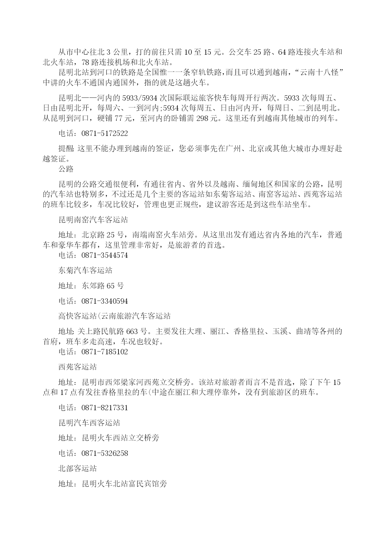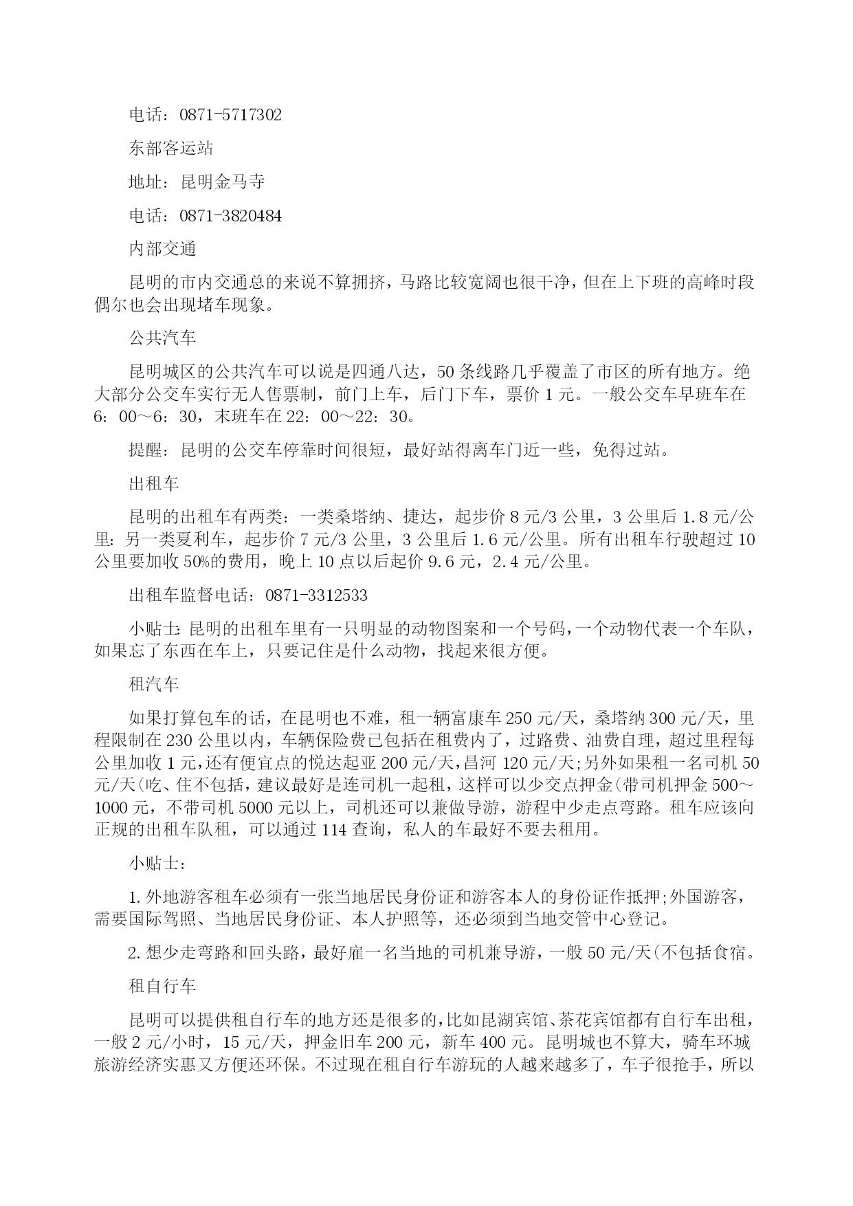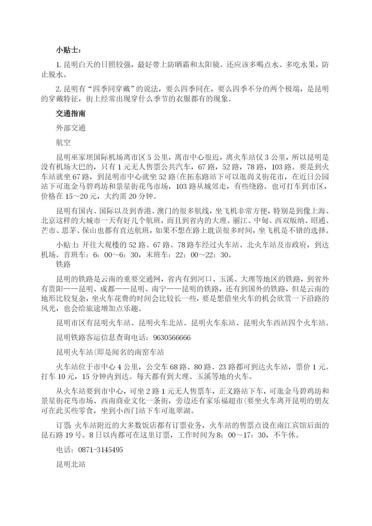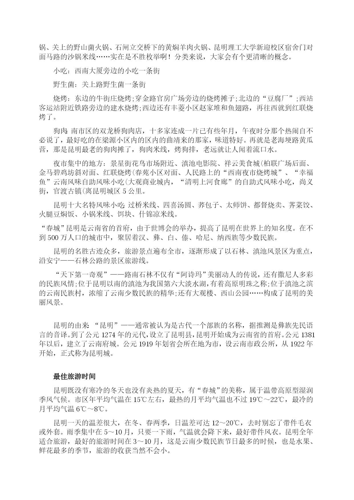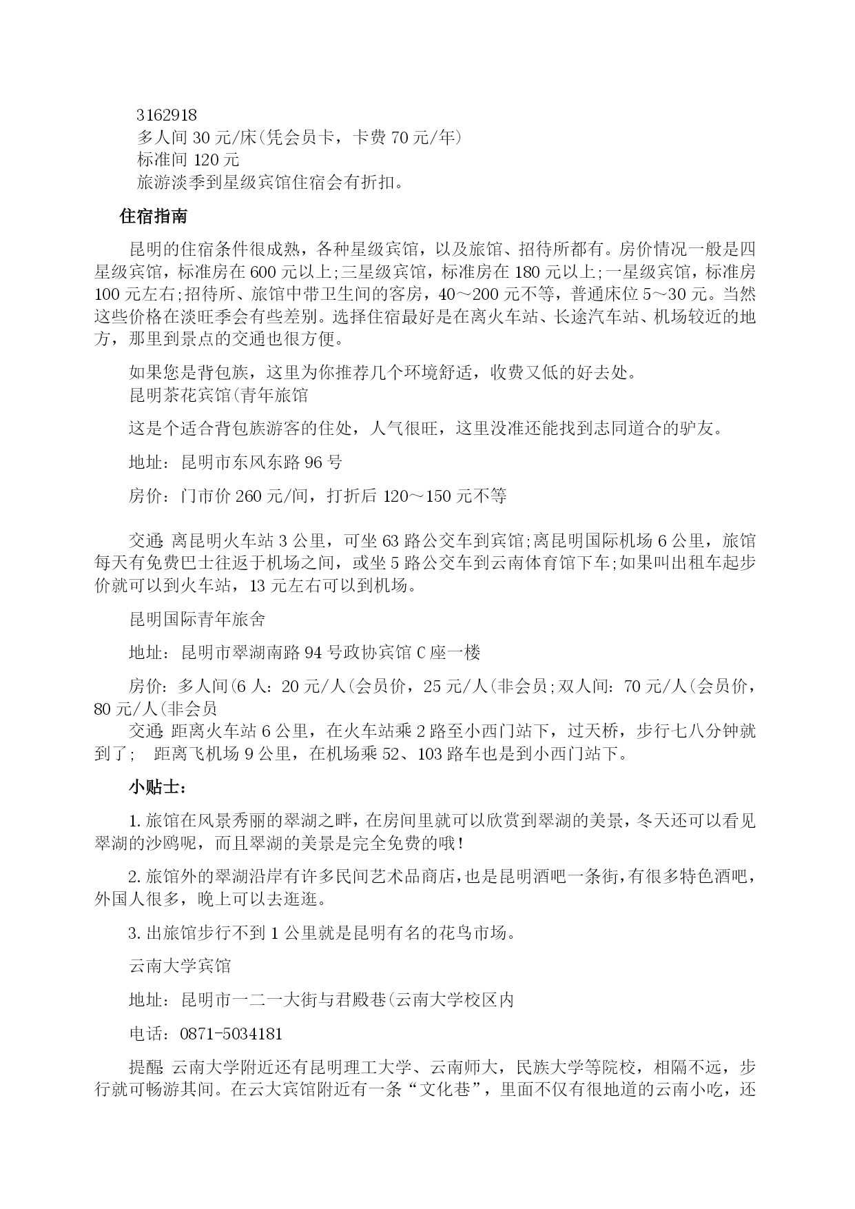 昆明:自助游攻略(2009年8月27日)分类:HYPERLINK"http://how.i.qunar.com/?cat=1201"\o"显示旅游小贴士的所有日志"旅游小贴士标签:HYPERLINK"http://how.i.qunar.com/?tag=%e4%ba%91%e5%8d%97"云南,HYPERLINK"http://how.i.qunar.com/?tag=%e4%ba%a4%e9%80%9a"交通,HYPERLINK"http://how.i.qunar.com/?tag=%e4%bd%8f"住,HYPERLINK"http://how.i.qunar.com/?tag=%e5%ae%9e%e7%94%a8"实用,HYPERLINK"http://how.i.qunar.com/?tag=%e6%94%bb%e7%95%a5"攻略,HYPERLINK"http://how.i.qunar.com/?tag=%e6%98%86%e6%98%8e"昆明,HYPERLINK"http://how.i.qunar.com/?tag=%e6%b0%94%e5%80%99"气候,HYPERLINK"http://how.i.qunar.com/?tag=%e7%be%8e%e9%a3%9f"美食关键词:悠闲:昆明人自来有休闲的习惯,那些没有尊严的小生意懒得做,推着三轮车满城卖水果的没有一个昆明人,包括擦皮鞋的,即使偶尔有几个下岗工人混于其中,也是两天便不见其踪影。教几句昆明话:昆明话属于北方方言,虽然听上去土气、不悦耳,但象声词特多,特别幽默生动,别有一番风味。熟悉几句本地话可让旅游更添趣味。1、称赞板扎2、惊叹埋埋散3、是不是咯是4、怎么咋咯5、滑稽太雀啦6、行为不良槽奈注意气候:1、雨伞、遮阳帽和防晒霜在昆明的小大商场里,一年四季都是热销商品,因为它们共同遮阳和避雨的作用。2、不论哪个季节到昆明,最好都带一件薄的羊毛衫或外套,因为天气变化无常,不注意保暖容易生病。昆明快速攻略:游线1(A线)世界园艺博览会会址(中餐)——金殿——新欢迎小区饭店一条街(晚餐)(B线)大观楼—-云南民族村(中餐)——金马碧鸡坊—–滇池路夜市游线2昆明—–石林(中餐)——九乡—–昆明游线3昆明—–轿子雪山(往返共3天)感觉昆明明媚:无论你从祖国哪个角落进入昆明,第一感受一定是阳光灿烂,春光明媚,而且这一点是任何季节都不会改变的。崭新:城市四通八达,高楼大厦随处可见。人鸥共嬉:对于这座并不靠海的城市却常年会有海鸥的出现,不能说不是一个奇迹,冬天可到翠湖和海埂公园看红嘴鸥。游在昆明金马碧鸡坊★★老昆明的象征和骄傲。金马碧鸡坊原为明朝年间的建筑,后被毁,现在为重建,它的玄妙在于“金碧交辉”的奇景。当太阳将落未落,余辉从西边照射碧鸡坊,它的倒影投到东面街上;同时,月亮则刚从东方升起,银色光芒照在金马坊,将它的倒影投到西边街面上。两个牌坊的影子,渐移渐近,最后互相交接。现在如果能再看到此景的话,那真是很难得的福气。3、4路金马碧鸡坊就在市中心的金碧广场,徒步或乘车都很方便。黑龙潭★★★公园由古建筑群和“龙泉探梅”两大景区组成。黑龙潭形似太极,绕潭建有被誉为“滇中第一古祠”的汉黑水祠。“龙泉探梅”为昆明新十六景之一,是西南地区最大的赏梅胜地和梅花研究基地。9路515039510元每年的1月中旬至2月上旬是梅花的盛花期。西山森林公园★★海埂公园是远眺西山“睡美人”的最佳角度,对岸的西山真的像一位仰卧于滇池岸边的美女。登西山是当地人踏春的一个重要去处,所以有“三月三,爬西山”的说法。龙门是西山的至高点,也是纵览滇池全景的最佳角度。另外,著名音乐家聂耳的墓也在西山。25元滇池电影院、艺术剧院、锦华大酒店旁有专线车直达。乘出租车约需30元。云南民族村有缆车往返海埂与西山,双程50元,单程30元。1.登龙门的栈道,仅容2人擦肩侧身而过,游人多时,要注意安全。2.聂耳墓旁的太华山庄或太华别墅山庄可以住宿。世界园艺博览园★★★★★这是一个奇妙的植物世界。世博园是99’昆明世界园艺博览会的会址。其中,大温室里集中了各种不同气候条件下的植物,是了解植物世界的绝好去处,由不同省份和国家地区建造的园林景观也非常值得一看。100元(学生票50元)10、69、71路1.世博园的占地面积大,想将每个展区看完,需要花一天的时间。2.如果对植物的兴趣不是很大,建议14:00以后再去,那时的票价仅为50元。金殿风景区★★★这里处处都能看到与吴三桂有关的传说。金殿的梁柱斗拱、瓦楞顶檐、神像罗幔、桌案瓶器、匾楹旌旗等都是用铜铸成。如果不是因为吴三桂于210多年前重建