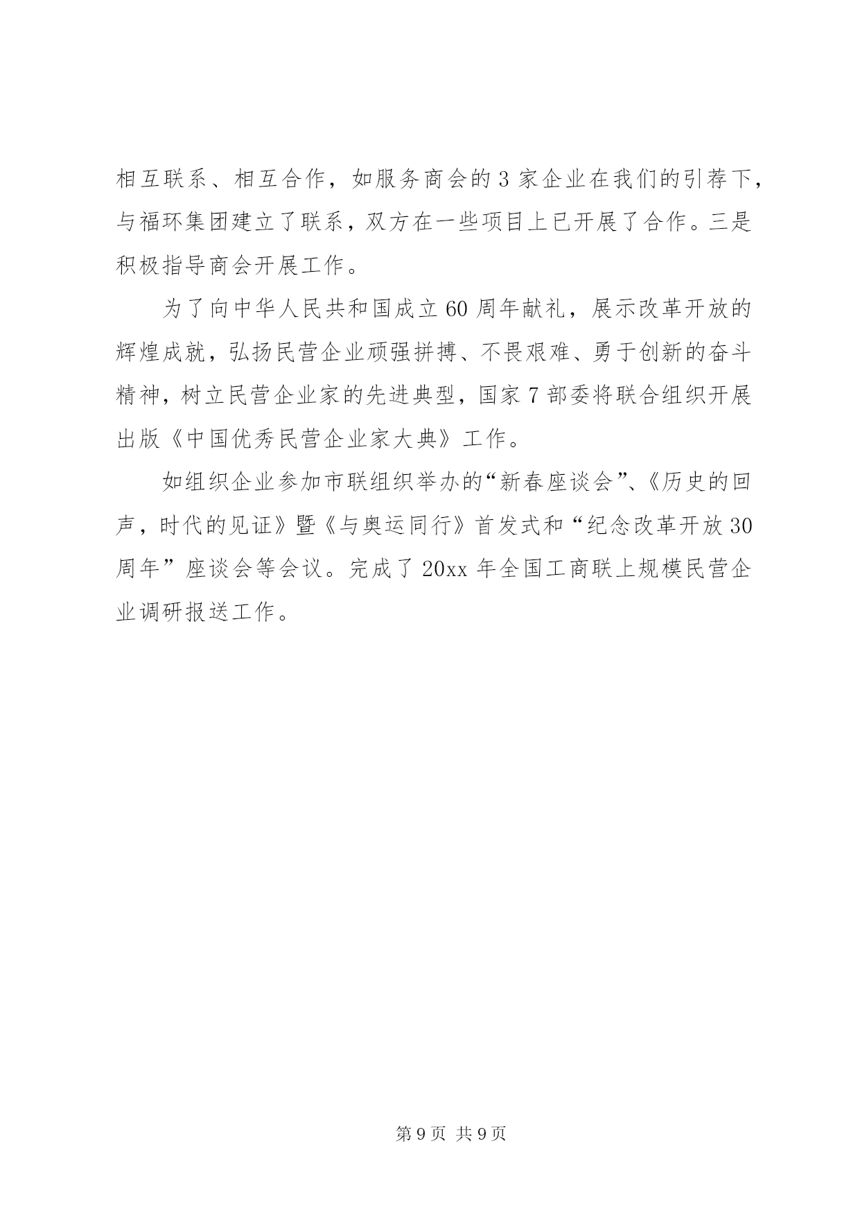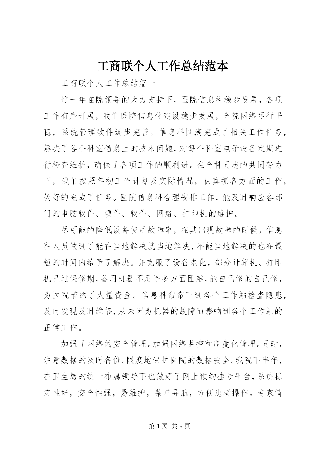 第PAGE\*Arabic\*MERGEFORMAT9页共NUMPAGES\*MERGEFORMAT9页工商联个人工作总结范本工商联个人工作总结篇一这一年在院领导的大力支持下,医院信息科稳步发展,各项工作有序开展,我们医院信息化建设稳步发展,全院网络运行平稳,系统管理软件逐步完善。信息科圆满完成了相关工作任务,解决了各个科室信息上的技术问题,对每个科室电子设备定期进行检查维护,确保了各项工作的顺利进。在全科同志的共同努力下,我们按照年初工作计划及实际情况,认真抓各方面的工作,较好的完成了任务。医院信息科合理安排工作,能及时响应各部门的电脑软件、硬件、软件、网络、打印机的维护。尽可能的降低设备使用故障率,在其出现故障的时候,信息科人员做到了能在当地解决就当地解决,不能当地解决的也在最短的时间内给予了解决。并克服了设备老化,部分计算机、打印机已过保修期,备用机器不足等多方面困难,能自己修的自己修,为医院节约了大量资金。信息科常常下到各个工作站检查隐患,及时发现及时维修,从未因为机器的故障而影响到各个工作站的正常工作。加强了网络的安全管理。加强网络监控和制度化管理。同时,注意数据的及时备份。限度地保护医院的数据安全。我院下半年,在卫生局的统一布属领导下也做好了网上预约挂号平台,系统稳定性好,安全性强,易维护,菜单导航,方便患者操作。专家情况介绍详细全面,有利于患者正确选择;通过选择专家,确定日期,患者实名,联系方式的录入,它一定程度上也有利于改善就医环境,促进“实名制”的推行,受到了不少患者的肯定和欢迎,如果专家出诊时间有调整,我们也会及时公布通知调整。全院电子开单,临检系统的投入使用,各个护士站均已安装条及时更新led电子显示屏信息公开,做好led电子显示屏定期维护,确保公示内容准确无误。信息科各项工作纷繁复杂,还有很多改进提高之处。有时候打印机,电脑等一些硬件维修时间较长,虽然备有备用的,但有时还是应付不过来,新的一年,信息科将继续提高各项工作水平,提升科室成员素质能力,规范化工作流程,完善工作内容,把信息科打造成领导的臂膀,并为各科室发展提供支持。我们必须在工作中积累经验和教训,不断摸索、不断改进,才能形成更加符合医院的信息化管理方法和制度,我想这将是一段非常艰难而漫长的道路。我院信息管理系统建设将步入一个新的阶段。怎样更好的为临床服务,不断提升系统的功能,适应临床医师的各种需求,是以后的工作重点。在保证基本业务的情况下,不断开拓新思路,完善系统,为医院的医疗业务作好信息保障。1、加强设备管理,定期检查、保养,做好设备的检修记录,加强信息化基础管理,全力保障全院电脑系统硬件、网络系统高效稳定运行,不发生人为原因导致的严重系统故障、数据丢失等事故。3.完善维护his程序。4.做好医院网站实时更新,维护工作。8.医院lis系统报告单自助打印功能的实现,我院门诊量逐年不断攀升,为了达到方便患者就诊的目的,医院门诊明年试点实现lis系统报告单的自助打印功能,医院lis系统已成为医院检验科和临床应用不可缺少的重要工具。9.加强计算机网络及数据安全保护措施,严格控制各类操作人员的访问权限,完善落实各项安全管理制度。对网络和系统进行监视维护,随时解决网络中出现的各种情况,并在适当时候,根据医院的需求,对网络实施改造和更新,保证网络正常运行;加强网络、系统设备的检测和维修,防微杜渐,保证网络和系统设备处于良好的工作状态,使其正常运行。在新的一年的工作中,我们将根据科室工作特点,持续改进服务质量。在工作中勇于创新,努力做到增强服务意识,规范服务行为。工商联个人工作总结篇二xx年全市工商联(商会)工作高举中国特色社会主义理论伟大旗帜,以邓小平理论和“xxxx”重要思想为指导,以学习贯彻党的xx大精神、全国工商联十大会议精神和全省县域经济工作会议精神为主线,坚持围绕中心服务大局,团结凝聚非公有制经济人士,引导非公有制经济人士积极承担社会责任;以改革创新精神加强自身建设,切实增强研究能力、办事能力、执行能力,具备与服务民营经济相适应的政策和理念水平,努力达到“两健康、两促进”的职责要求,不断提升了工商联(商会)机关形象。一、上半年主要工作1、在学习贯彻党的xx大精神、全国工商联十大会议精神和全省县域经济工作会议精神的基础上,以党风廉政宣传教育月活动为契机,认真学xxx同志在第xx届中纪委第二次全会上的重要讲话和都纪文[xx]15号文件精神、《市党员干部廉政节及第九个党风廉政建设宣传教育月活动方案》、宋书记在动员会上的讲话及案例分析等文件材料,机关全体党员、干部对照市纪委六届三次全体(扩大)会议精神和机关效能建设“七个严禁”、“五办作风”以及政府廉政工作暨增强执行力的要求,认真查摆存在的问题,并分析问题产生的根源,相应制定了改