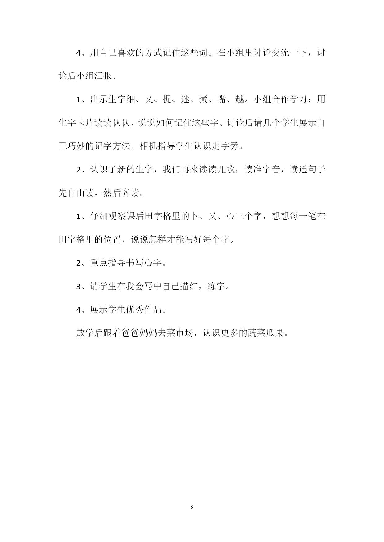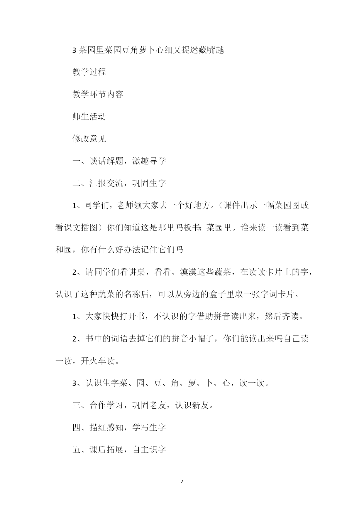PAGEPAGE3《菜园里》教学设计教学目标1、认识14个生字,会写卜、又、心、风、豆5个字。认识1个笔画卧钩和2个偏旁走字旁和风字框。2、能正确、流利的朗读儿歌,认识一些蔬菜,了解它们的一些特点。3、培养学生自主识字的能力。重点认识本课14个生字,认真、工整书写5个,能正确、流利地朗读课文。难点写好心、风教学仪器与媒体字、词卡片、多媒体课件教学基本思路识字教学应充分利用儿童的生活经验,注重教给识字方法,激励学生自主识字、合作识字、探究识字。板书设计3菜园里菜园豆角萝卜心细又捉迷藏嘴越教学过程教学环节内容师生活动修改意见一、谈话解题,激趣导学二、汇报交流,巩固生字1、同学们,老师领大家去一个好地方。(课件出示一幅菜园图或看课文插图)你们知道这是那里吗板书:菜园里。谁来读一读看到菜和园,你有什么好办法记住它们吗2、请同学们看讲桌,看看、漠漠这些蔬菜,在读读卡片上的字,认识了这种蔬菜的名称后,可以从旁边的盒子里取一张字词卡片。1、大家快快打开书,不认识的字借助拼音读出来,然后齐读。2、书中的词语去掉它们的拼音小帽子,你们能读出来吗自己读一读,开火车读。3、认识生字菜、园、豆、角、萝、卜、心,读一读。三、合作学习,巩固老友,认识新友。四、描红感知,学写生字五、课后拓展,自主识字4、用自己喜欢的方式记住这些词。在小组里讨论交流一下,讨论后小组汇报。1、出示生字细、又、捉、迷、藏、嘴、越。小组合作学习:用生字卡片读读认认,说说如何记住这些字。讨论后请几个学生展示自己巧妙的记字方法。相机指导学生认识走字旁。2、认识了新的生字,我们再来读读儿歌,读准字音,读通句子。先自由读,然后齐读。1、仔细观察课后田字格里的卜、又、心三个字,想想每一笔在田字格里的位置,说说怎样才能写好每个字。2、重点指导书写心字。3、请学生在我会写中自己描红,练字。4、展示学生优秀作品。放学后跟着爸爸妈妈去菜市场,认识更多的蔬菜瓜果。