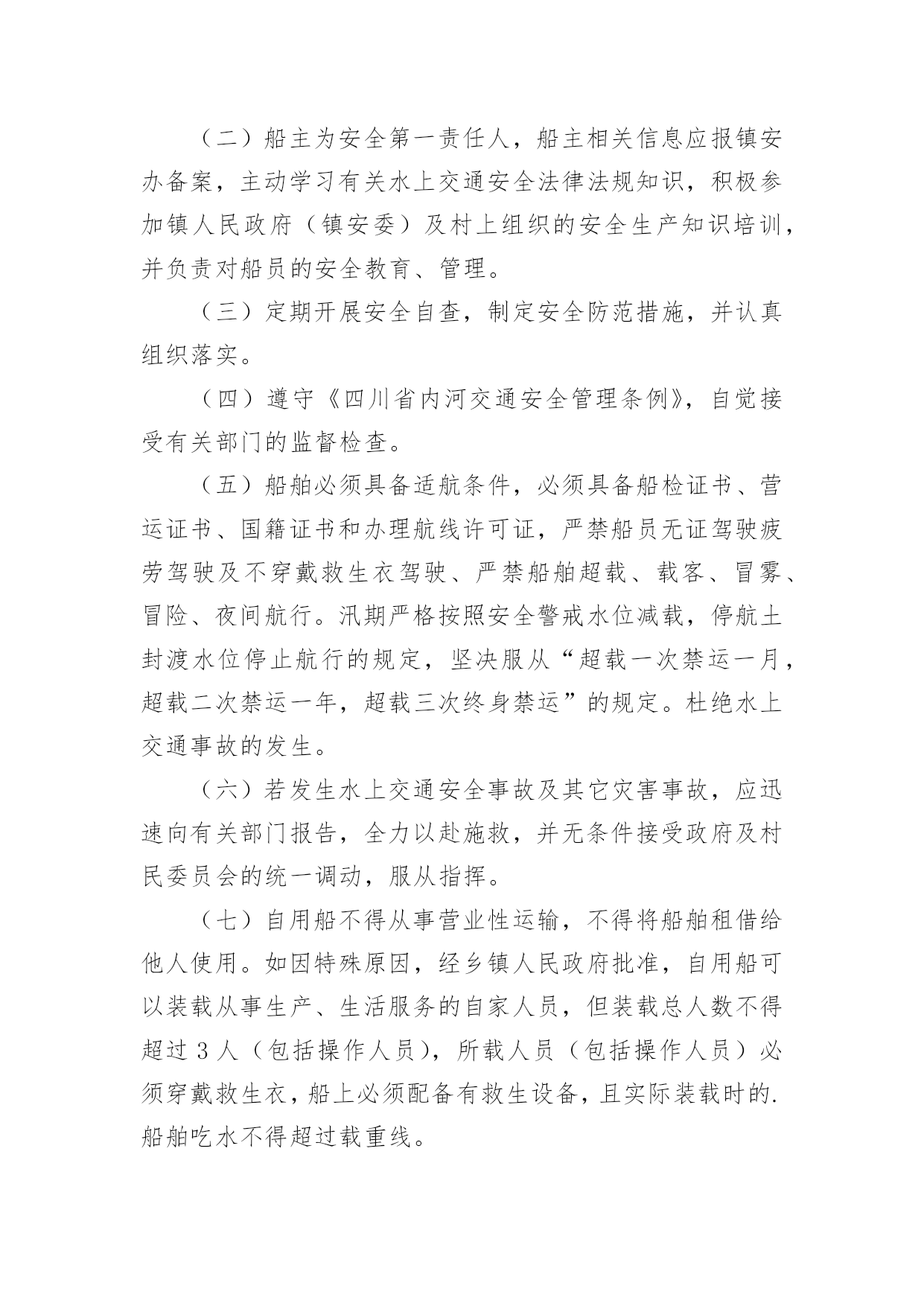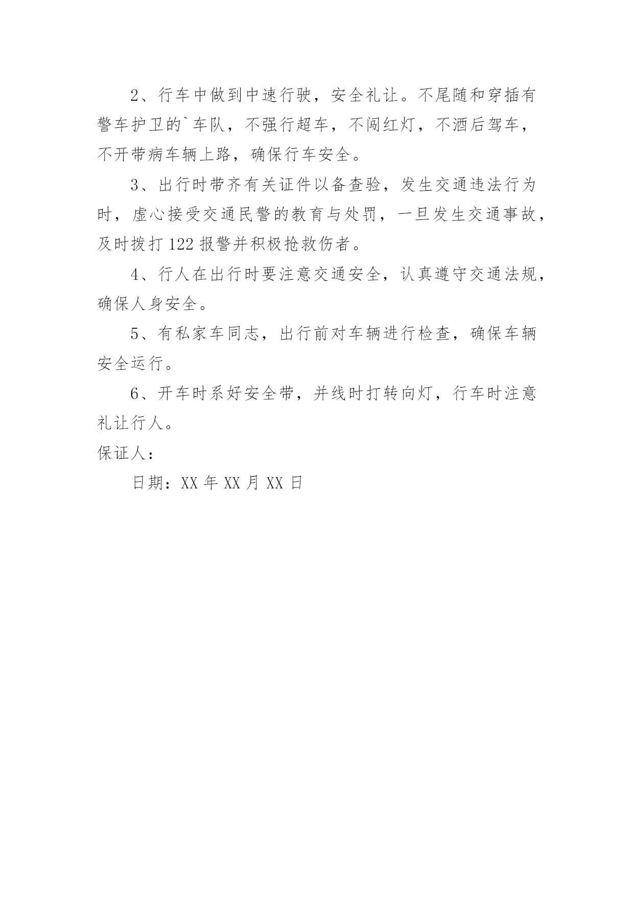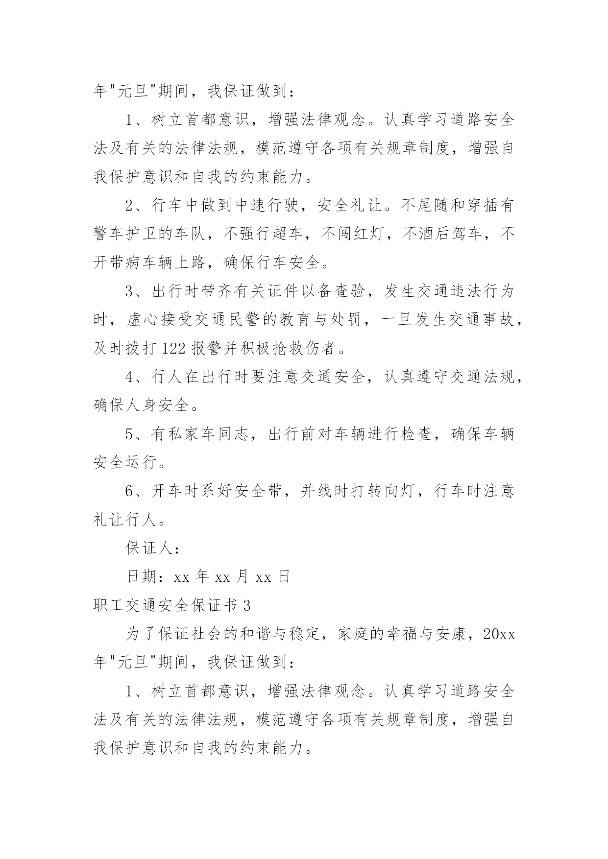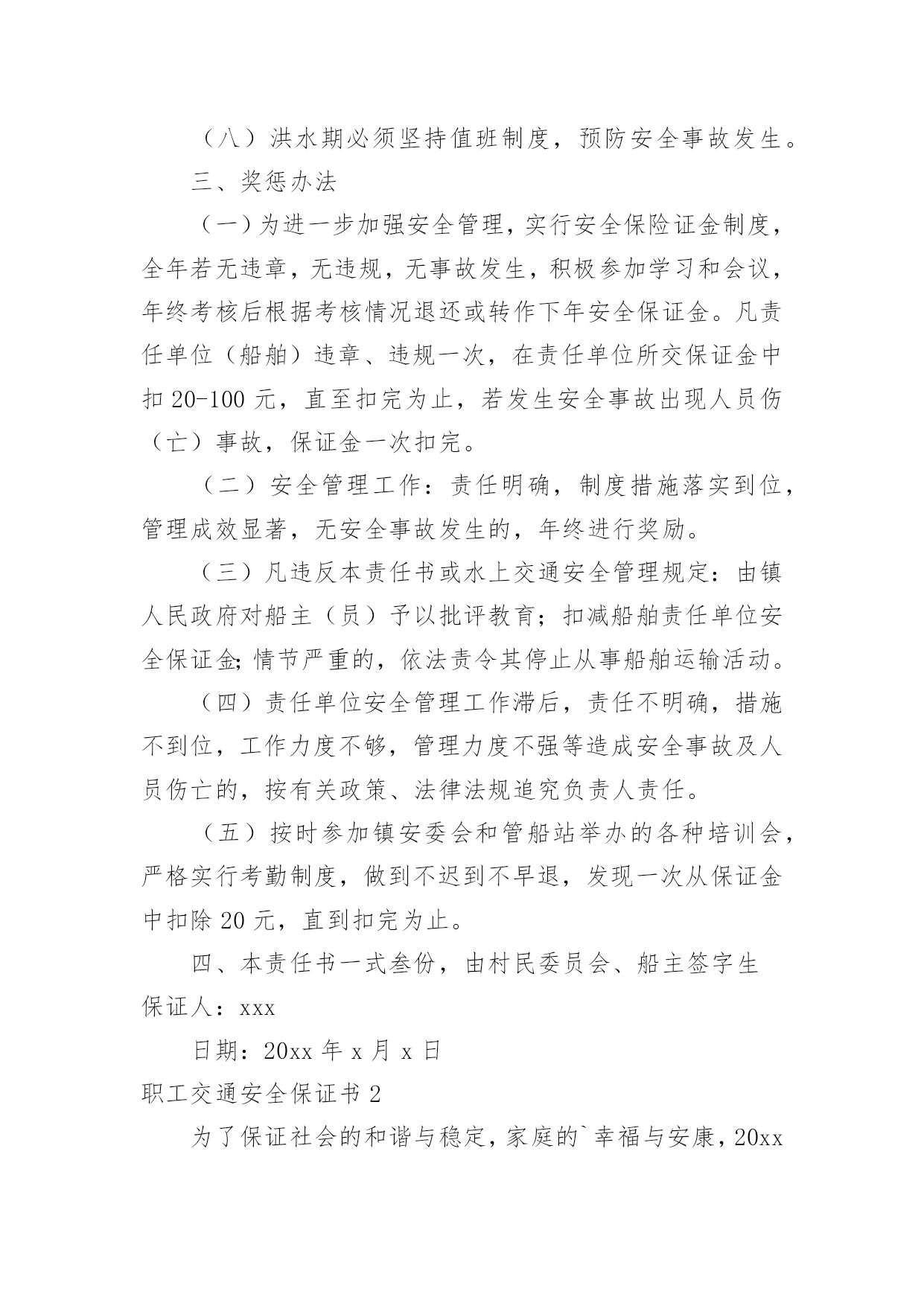 职工交通安全保证书职工交通安全保证书在我们平凡的日常里,保证书有着举足轻重的地位,保证书是以集体或个人名义以一种较为强烈的态度向上级组织、领导或个人表决心下保证时所使用的一种书信。那么,保证书到底怎么写才合适呢?下面是小编收集整理的职工交通安全保证书,欢迎大家分享。职工交通安全保证书1为认真贯彻落实《中华人民共和国内河交通安全管理条例》、《四川省安全生产条例》、《四川省水上交通安全管理条例》和有关水上安全工作会议及文件精神,坚持“安全第一,预防为主”的方针,加强水上安全管理,落实水上交通安全管理责任,遏制伤亡事故发生,特签运船舶安全目标责任书。一、安全目标不发生水上交通伤亡事故,不发生重特大险情和严重违法案件。二、责任内容(一)按照属地管理的原则,船舶必须服从永兴镇人民政府、镇安办和镇船管站及所在村的领导管理,自觉遵守水上交通安全法律法规,接受有关部门的监督检查。(二)船主为安全第一责任人,船主相关信息应报镇安办备案,主动学习有关水上交通安全法律法规知识,积极参加镇人民政府(镇安委)及村上组织的安全生产知识培训,并负责对船员的安全教育、管理。(三)定期开展安全自查,制定安全防范措施,并认真组织落实。(四)遵守《四川省内河交通安全管理条例》,自觉接受有关部门的监督检查。(五)船舶必须具备适航条件,必须具备船检证书、营运证书、国籍证书和办理航线许可证,严禁船员无证驾驶疲劳驾驶及不穿戴救生衣驾驶、严禁船舶超载、载客、冒雾、冒险、夜间航行。汛期严格按照安全警戒水位减载,停航土封渡水位停止航行的规定,坚决服从“超载一次禁运一月,超载二次禁运一年,超载三次终身禁运”的规定。杜绝水上交通事故的发生。(六)若发生水上交通安全事故及其它灾害事故,应迅速向有关部门报告,全力以赴施救,并无条件接受政府及村民委员会的统一调动,服从指挥。(七)自用船不得从事营业性运输,不得将船舶租借给他人使用。如因特殊原因,经乡镇人民政府批准,自用船可以装载从事生产、生活服务的自家人员,但装载总人数不得超过3人(包括操作人员),所载人员(包括操作人员)必须穿戴救生衣,船上必须配备有救生设备,且实际装载时的.船舶吃水不得超过载重线。(八)洪水期必须坚持值班制度,预防安全事故发生。三、奖惩办法(一)为进一步加强安全管理,实行安全保险证金制度,全年若无违章,无违规,无事故发生,积极参加学习和会议,年终考核后根据考核情况退还或转作下年安全保证金。凡责任单位(船舶)违章、违规一次,在责任单位所交保证金中扣20-100元,直至扣完为止,若发生安全事故出现人员伤(亡)事故,保证金一次扣完。(二)安全管理工作:责任明确,制度措施落实到位,管理成效显著,无安全事故发生的,年终进行奖励。(三)凡违反本责任书或水上交通安全管理规定:由镇人民政府对船主(员)予以批评教育;扣减船舶责任单位安全保证金;情节严重的,依法责令其停止从事船舶运输活动。(四)责任单位安全管理工作滞后,责任不明确,措施不到位,工作力度不够,管理力度不强等造成安全事故及人员伤亡的,按有关政策、法律法规追究负责人责任。(五)按时参加镇安委会和管船站举办的各种培训会,严格实行考勤制度,做到不迟到不早退,发现一次从保证金中扣除20元,直到扣完为止。四、本责任书一式叁份,由村民委员会、船主签字生保证人:xxx日期:20xx年x月x日职工交通安全保证书2为了保证社会的和谐与稳定,家庭的`幸福与安康,20xx年"元旦"期间,我保证做到:1、树立首都意识,增强法律观念。认真学习道路安全法及有关的法律法规,模范遵守各项有关规章制度,增强自我保护意识和自我的约束能力。2、行车中做到中速行驶,安全礼让。不尾随和穿插有警车护卫的车队,不强行超车,不闯红灯,不酒后驾车,不开带病车辆上路,确保行车安全。3、出行时带齐有关证件以备查验,发生交通违法行为时,虚心接受交通民警的教育与处罚,一旦发生交通事故,及时拨打122报警并积极抢救伤者。4、行人在出行时要注意交通安全,认真遵守交通法规,确保人身安全。5、有私家车同志,出行前对车辆进行检查,确保车辆安全运行。6、开车时系好安全带,并线时打转向灯,行车时注意礼让行人。保证人:日期:xx年xx月xx日职工交通安全保证书3为了保证社会的和谐与稳定,家庭的幸福与安康,20xx年"元旦"期间,我保证做到:1、树立首都意识,增强法律观念。认真学习道路安全法及有关的法律法规,模范遵守各项有关规章制度,增强自我保护意识和自我的约束能力。2、行车中做到中速行驶,安全礼让。不尾随和穿插有警车护卫的`车队,不强行超车,不闯红灯,不酒后驾车,不开带病车辆上路,确保行车安全。3、出行时带齐有关证件以备查验,发生交通违法行为时,虚心接受交通民警的教育与处罚,一旦发生交通事故,及时拨打122报警并积极抢救伤者。4、行人在出行时要