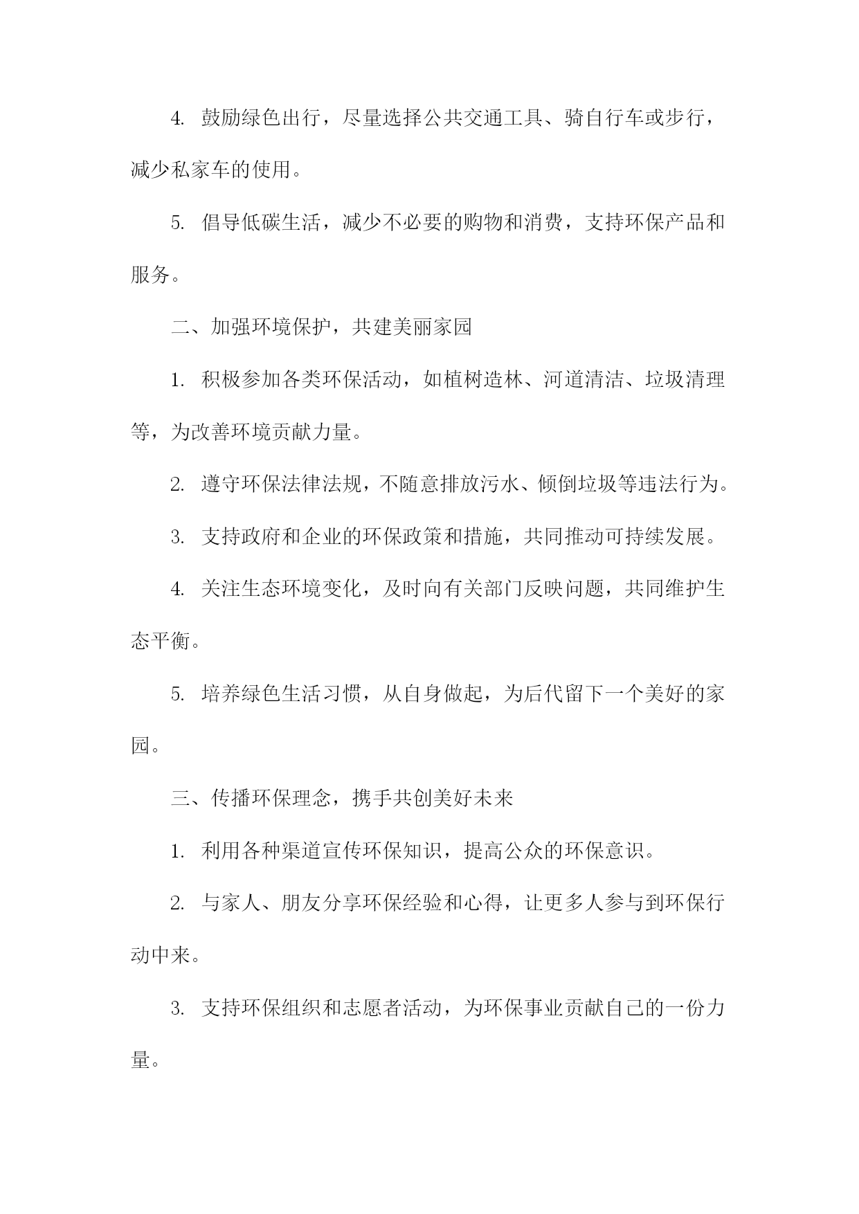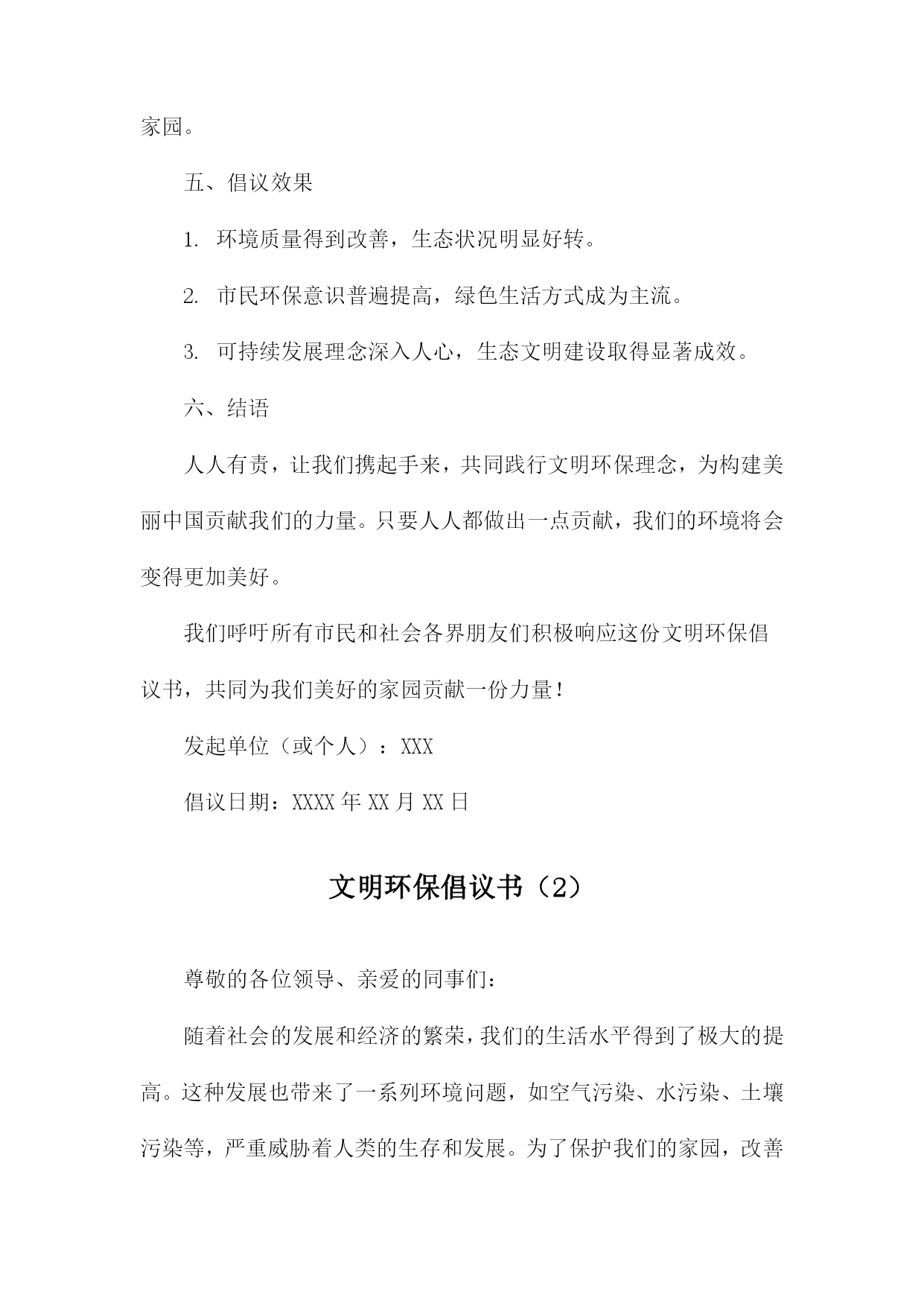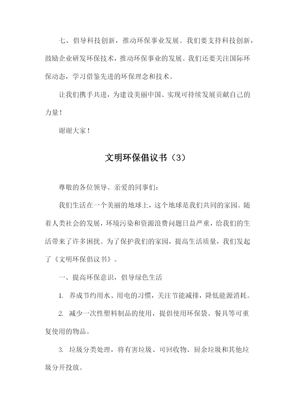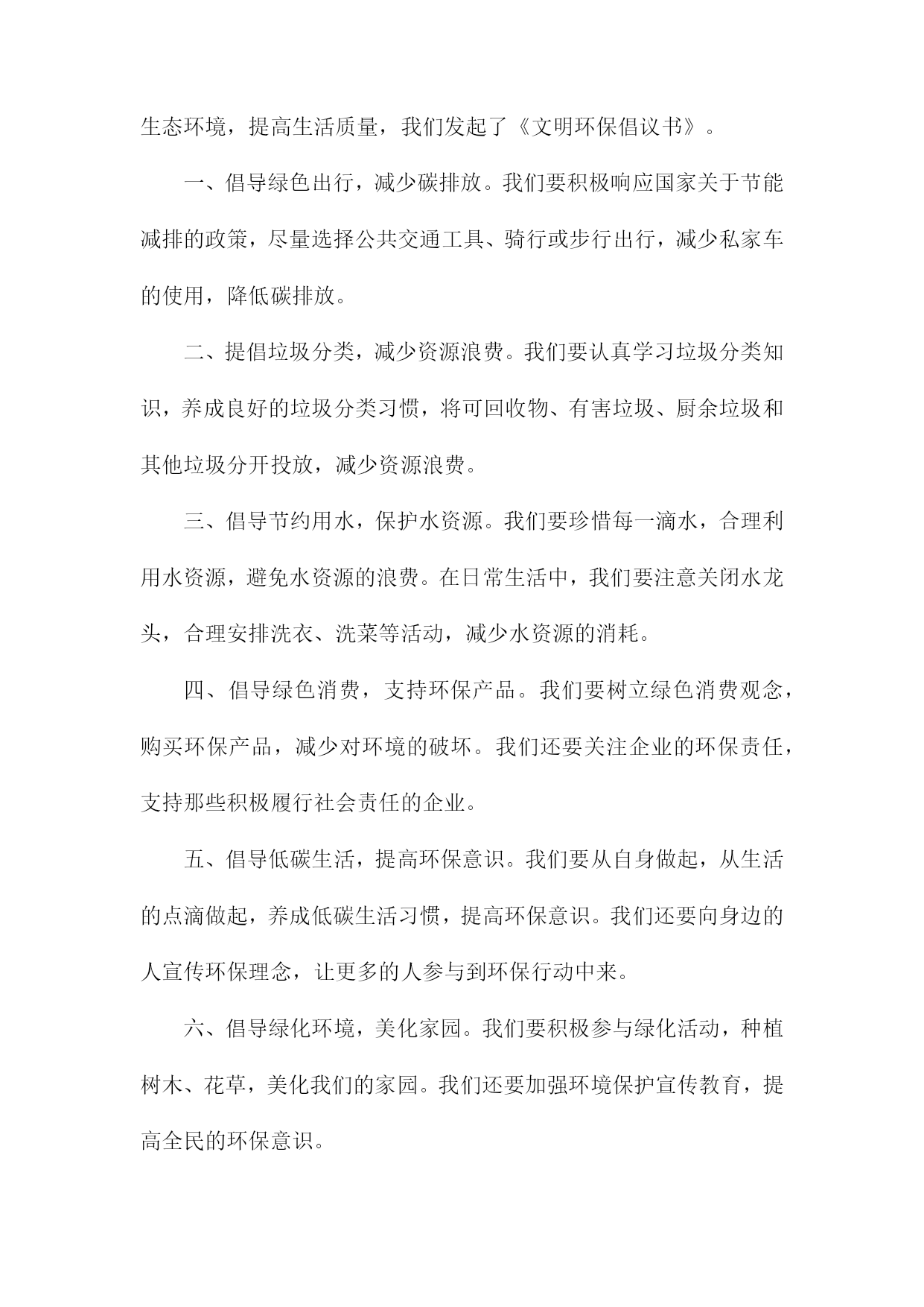 文明环保倡议书尊敬的各位市民、社会各界朋友们:我们身处一个美丽繁荣的国度,环境问题与我们息息相关。为了共同建设美好的家园,我们特发起这份文明环保倡议书,呼吁大家共同关注环保问题,积极参与环保行动,共同推动生态文明建设。一、倡议背景我国环境问题依然严峻,空气污染、水污染、土壤污染等问题频发。加之城市化进程加快,自然生态系统受到严重破坏,生态文明建设面临巨大挑战。我们急需采取行动,共同保护我们的家园。二、倡议目的本次倡议旨在提高公众的环保意识,倡导低碳生活,减少污染排放,保护生态环境,促进可持续发展。三、倡议内容1.倡导绿色消费:选择环保产品,减少使用一次性塑料制品,降低废弃物的产生。2.节能减排:合理使用电力,鼓励使用节能灯具、电器,减少能源消耗。3.低碳出行:尽量选择步行、骑行、公共交通等低碳出行方式,减少机动车排放。4.垃圾分类:认真执行垃圾分类政策,正确投放垃圾,促进资源回收利用。5.保护自然资源:不随意破坏植被,不捕捉野生动物,爱护自然环境。6.传播环保理念:通过各种渠道,宣传环保知识,提高身边人的环保意识。四、倡议号召我们呼吁所有市民和社会各界朋友们积极参与倡议活动,从自身做起,从点滴小事做起,共同为环保事业贡献力量。五、倡议支持措施1.政府应加强环保法律法规的制定和执行,提供政策支持和资金保障。2.企事业单位应落实环保责任,加强环境治理和节能减排工作。3.媒体应加大环保宣传力度,提高公众的环保意识和参与度。4.学校应加强对学生的环保教育,培养环保意识,引导学生参与环保活动。六、倡议效果展望通过大家的共同努力,必定能够在全社会形成关注环保、爱护环境的良好氛围。未来的中国将变得更加美丽、繁荣、和谐,人民群众将享有更加美好的生活。七、结语环保事业人人有责,让我们携手共进,为环保事业贡献一份力量。让我们共同守护美丽的家园,为子孙后代留下一片蓝天白云、绿水青山。发起单位(个人):XXX日期:XXXX年XX月XX日文明环保倡议书(1)尊敬的各位市民、社会各界朋友们:我们身处一个美丽的世界,环境保护是我们共同的责任。环境问题已经成为全球面临的严峻挑战,为了保护我们的家园,推动可持续发展,我们特发起这份文明环保倡议书。一、倡议背景随着城市化进程的加速,环境污染、生态破坏等问题日益突出,给我们的生活带来了诸多困扰。我们迫切需要采取行动,推动环保事业,共同构建美丽中国。二、倡议目的1.提高环保意识,倡导绿色生活。2.减少污染,保护生态环境。3.推广可持续发展理念,促进生态文明建设。三、倡议内容1.倡导低碳生活:减少碳排放,鼓励使用公共交通工具、骑行或步行出行。2.节约用水:珍惜水资源,提高用水效率。3.垃圾分类:学会正确分类投放垃圾,促进资源回收利用。4.绿色消费:选择环保产品,支持可持续发展。5.保护动植物及生态系统:尊重自然,杜绝非法捕猎、采摘行为。6.传播环保理念:通过各种渠道,宣传环保知识,提高公众的环保意识。四、倡议措施1.政府部门加强监管,制定相关政策和法规,推动环保工作。2.企业履行环保责任,加强环境治理和节能减排。3.社会各界积极参与,加强环保宣传教育,提高公众的环保意识和参与度。4.广大市民从自身做起,践行文明环保理念,共同保护我们的家园。五、倡议效果1.环境质量得到改善,生态状况明显好转。2.市民环保意识普遍提高,绿色生活方式成为主流。3.可持续发展理念深入人心,生态文明建设取得显著成效。六、结语人人有责,让我们携起手来,共同践行文明环保理念,为构建美丽中国贡献我们的力量。只要人人都做出一点贡献,我们的环境将会变得更加美好。我们呼吁所有市民和社会各界朋友们积极响应这份文明环保倡议书,共同为我们美好的家园贡献一份力量!发起单位(或个人):XXX倡议日期:XXXX年XX月XX日文明环保倡议书(2)尊敬的各位领导、亲爱的同事们:随着社会的发展和经济的繁荣,我们的生活水平得到了极大的提高。这种发展也带来了一系列环境问题,如空气污染、水污染、土壤污染等,严重威胁着人类的生存和发展。为了保护我们的家园,改善生态环境,提高生活质量,我们发起了《文明环保倡议书》。一、倡导绿色出行,减少碳排放。我们要积极响应国家关于节能减排的政策,尽量选择公共交通工具、骑行或步行出行,减少私家车的使用,降低碳排放。二、提倡垃圾分类,减少资源浪费。我们要认真学习垃圾分类知识,养成良好的垃圾分类习惯,将可回收物、有害垃圾、厨余垃圾和其他垃圾分开投放,减少资源浪费。三、倡导节约用水,保护水资源。我们要珍惜每一滴水,合理利用水资源,避免水资源的浪费。在日常生活中,我们要注意关闭水龙头,合理安排洗衣、洗菜等活动,减少水资源的消耗。四、倡