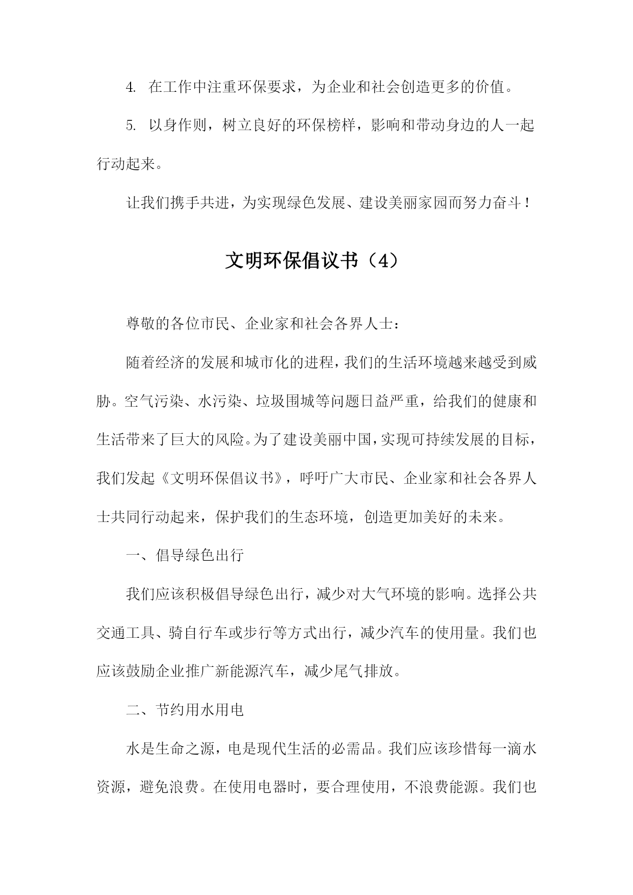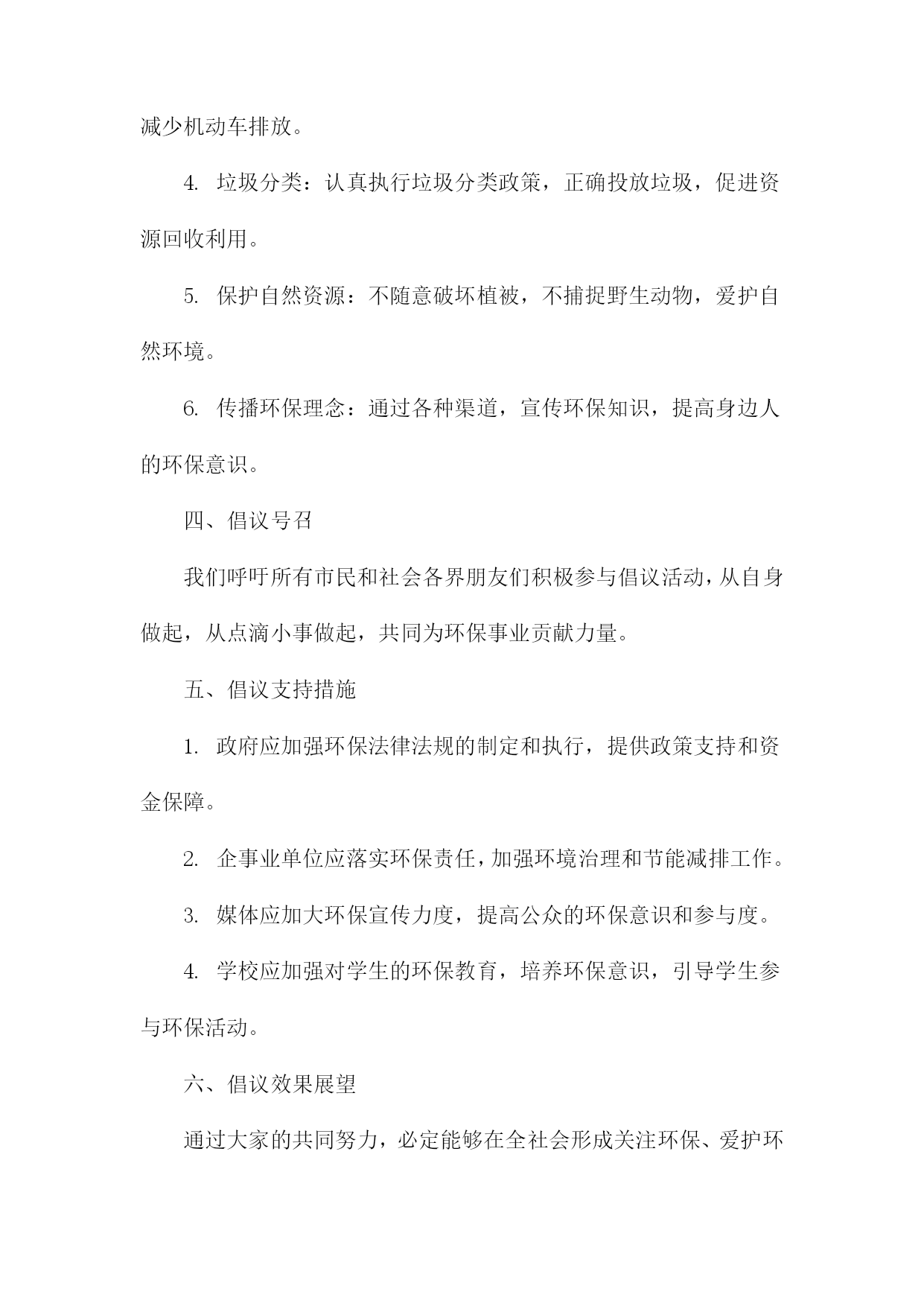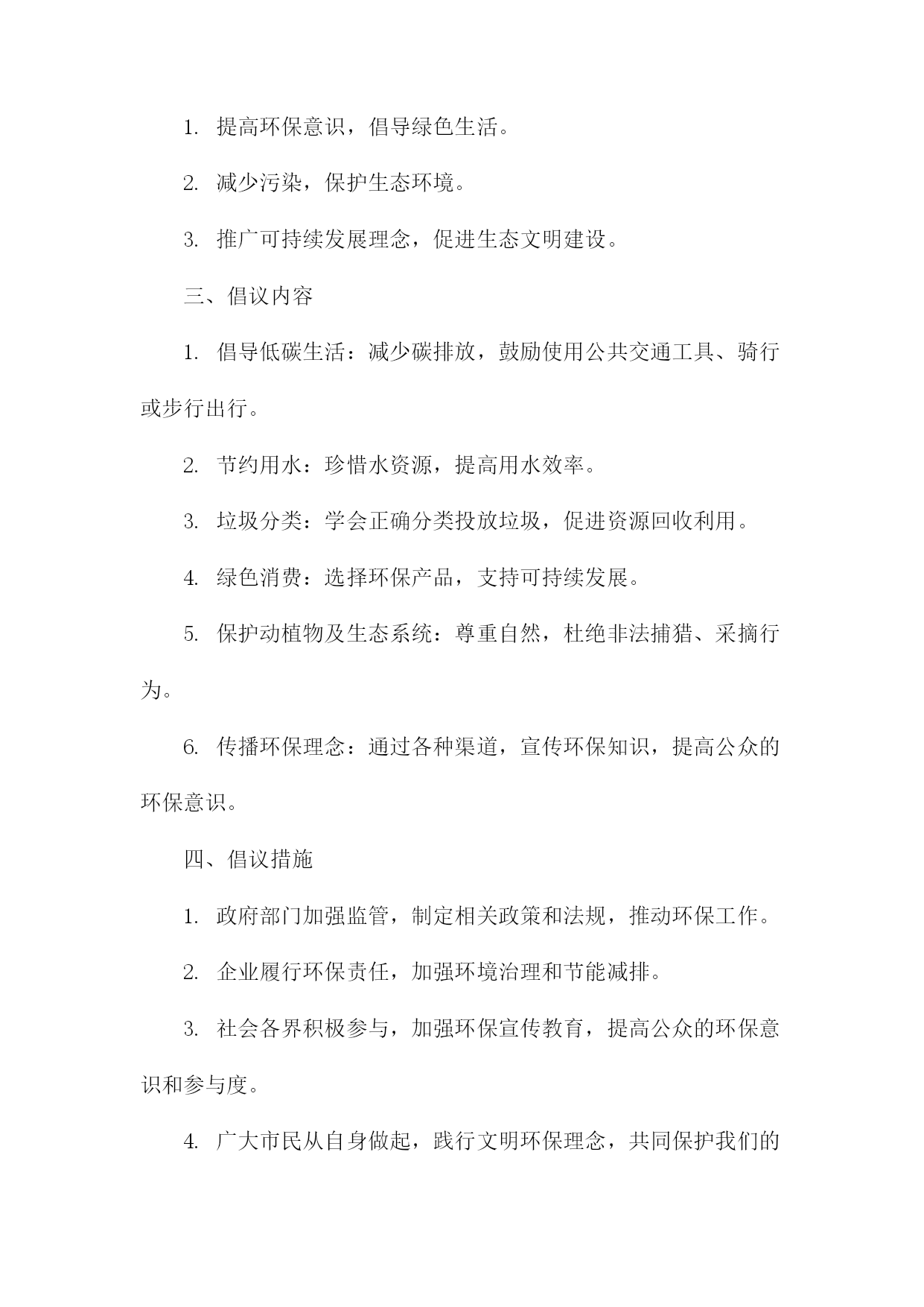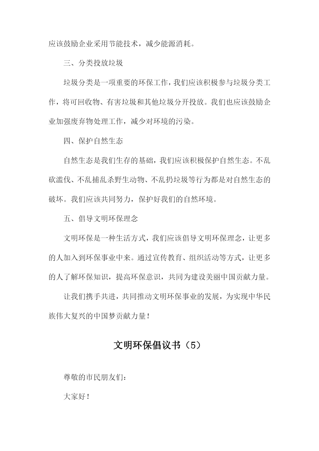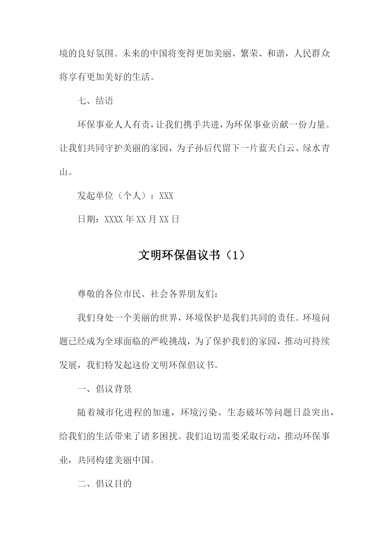 文明环保倡议书尊敬的各位市民、社会各界朋友们:我们身处一个美丽繁荣的国度,环境问题与我们息息相关。为了共同建设美好的家园,我们特发起这份文明环保倡议书,呼吁大家共同关注环保问题,积极参与环保行动,共同推动生态文明建设。一、倡议背景我国环境问题依然严峻,空气污染、水污染、土壤污染等问题频发。加之城市化进程加快,自然生态系统受到严重破坏,生态文明建设面临巨大挑战。我们急需采取行动,共同保护我们的家园。二、倡议目的本次倡议旨在提高公众的环保意识,倡导低碳生活,减少污染排放,保护生态环境,促进可持续发展。三、倡议内容1.倡导绿色消费:选择环保产品,减少使用一次性塑料制品,降低废弃物的产生。2.节能减排:合理使用电力,鼓励使用节能灯具、电器,减少能源消耗。3.低碳出行:尽量选择步行、骑行、公共交通等低碳出行方式,减少机动车排放。4.垃圾分类:认真执行垃圾分类政策,正确投放垃圾,促进资源回收利用。5.保护自然资源:不随意破坏植被,不捕捉野生动物,爱护自然环境。6.传播环保理念:通过各种渠道,宣传环保知识,提高身边人的环保意识。四、倡议号召我们呼吁所有市民和社会各界朋友们积极参与倡议活动,从自身做起,从点滴小事做起,共同为环保事业贡献力量。五、倡议支持措施1.政府应加强环保法律法规的制定和执行,提供政策支持和资金保障。2.企事业单位应落实环保责任,加强环境治理和节能减排工作。3.媒体应加大环保宣传力度,提高公众的环保意识和参与度。4.学校应加强对学生的环保教育,培养环保意识,引导学生参与环保活动。六、倡议效果展望通过大家的共同努力,必定能够在全社会形成关注环保、爱护环境的良好氛围。未来的中国将变得更加美丽、繁荣、和谐,人民群众将享有更加美好的生活。七、结语环保事业人人有责,让我们携手共进,为环保事业贡献一份力量。让我们共同守护美丽的家园,为子孙后代留下一片蓝天白云、绿水青山。发起单位(个人):XXX日期:XXXX年XX月XX日文明环保倡议书(1)尊敬的各位市民、社会各界朋友们:我们身处一个美丽的世界,环境保护是我们共同的责任。环境问题已经成为全球面临的严峻挑战,为了保护我们的家园,推动可持续发展,我们特发起这份文明环保倡议书。一、倡议背景随着城市化进程的加速,环境污染、生态破坏等问题日益突出,给我们的生活带来了诸多困扰。我们迫切需要采取行动,推动环保事业,共同构建美丽中国。二、倡议目的1.提高环保意识,倡导绿色生活。2.减少污染,保护生态环境。3.推广可持续发展理念,促进生态文明建设。三、倡议内容1.倡导低碳生活:减少碳排放,鼓励使用公共交通工具、骑行或步行出行。2.节约用水:珍惜水资源,提高用水效率。3.垃圾分类:学会正确分类投放垃圾,促进资源回收利用。4.绿色消费:选择环保产品,支持可持续发展。5.保护动植物及生态系统:尊重自然,杜绝非法捕猎、采摘行为。6.传播环保理念:通过各种渠道,宣传环保知识,提高公众的环保意识。四、倡议措施1.政府部门加强监管,制定相关政策和法规,推动环保工作。2.企业履行环保责任,加强环境治理和节能减排。3.社会各界积极参与,加强环保宣传教育,提高公众的环保意识和参与度。4.广大市民从自身做起,践行文明环保理念,共同保护我们的家园。五、倡议效果1.环境质量得到改善,生态状况明显好转。2.市民环保意识普遍提高,绿色生活方式成为主流。3.可持续发展理念深入人心,生态文明建设取得显著成效。六、结语人人有责,让我们携起手来,共同践行文明环保理念,为构建美丽中国贡献我们的力量。只要人人都做出一点贡献,我们的环境将会变得更加美好。我们呼吁所有市民和社会各界朋友们积极响应这份文明环保倡议书,共同为我们美好的家园贡献一份力量!发起单位(或个人):XXX倡议日期:XXXX年XX月XX日文明环保倡议书(2)尊敬的各位领导、亲爱的同事们:随着社会的发展和经济的繁荣,我们的生活水平得到了极大的提高。这种发展也带来了一系列环境问题,如空气污染、水污染、土壤污染等,严重威胁着人类的生存和发展。为了保护我们的家园,改善生态环境,提高生活质量,我们发起了《文明环保倡议书》。一、倡导绿色出行,减少碳排放。我们要积极响应国家关于节能减排的政策,尽量选择公共交通工具、骑行或步行出行,减少私家车的使用,降低碳排放。二、提倡垃圾分类,减少资源浪费。我们要认真学习垃圾分类知识,养成良好的垃圾分类习惯,将可回收物、有害垃圾、厨余垃圾和其他垃圾分开投放,减少资源浪费。三、倡导节约用水,保护水资源。我们要珍惜每一滴水,合理利用水资源,避免水资源的浪费。在日常生活中,我们要注意关闭水龙头,合理安排洗衣、洗菜等活动,减少水资源的消耗。四、倡