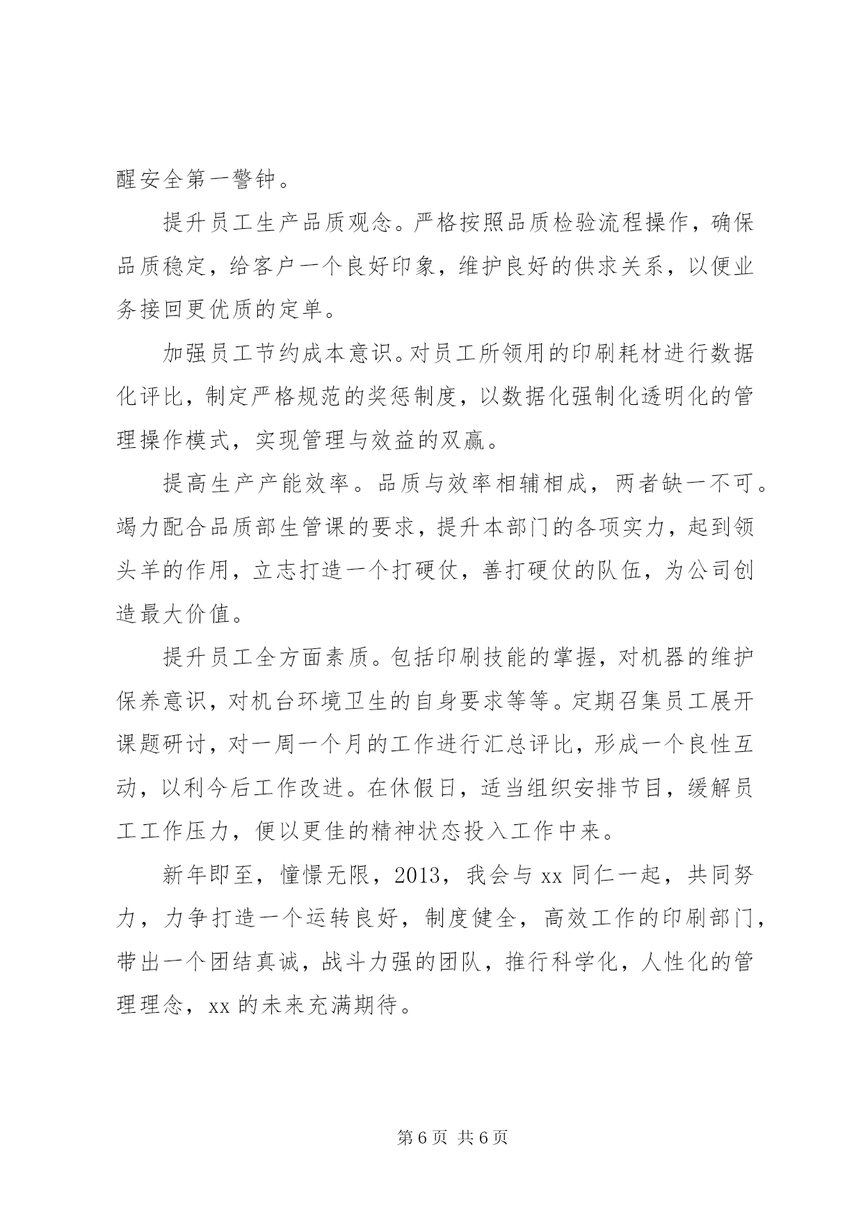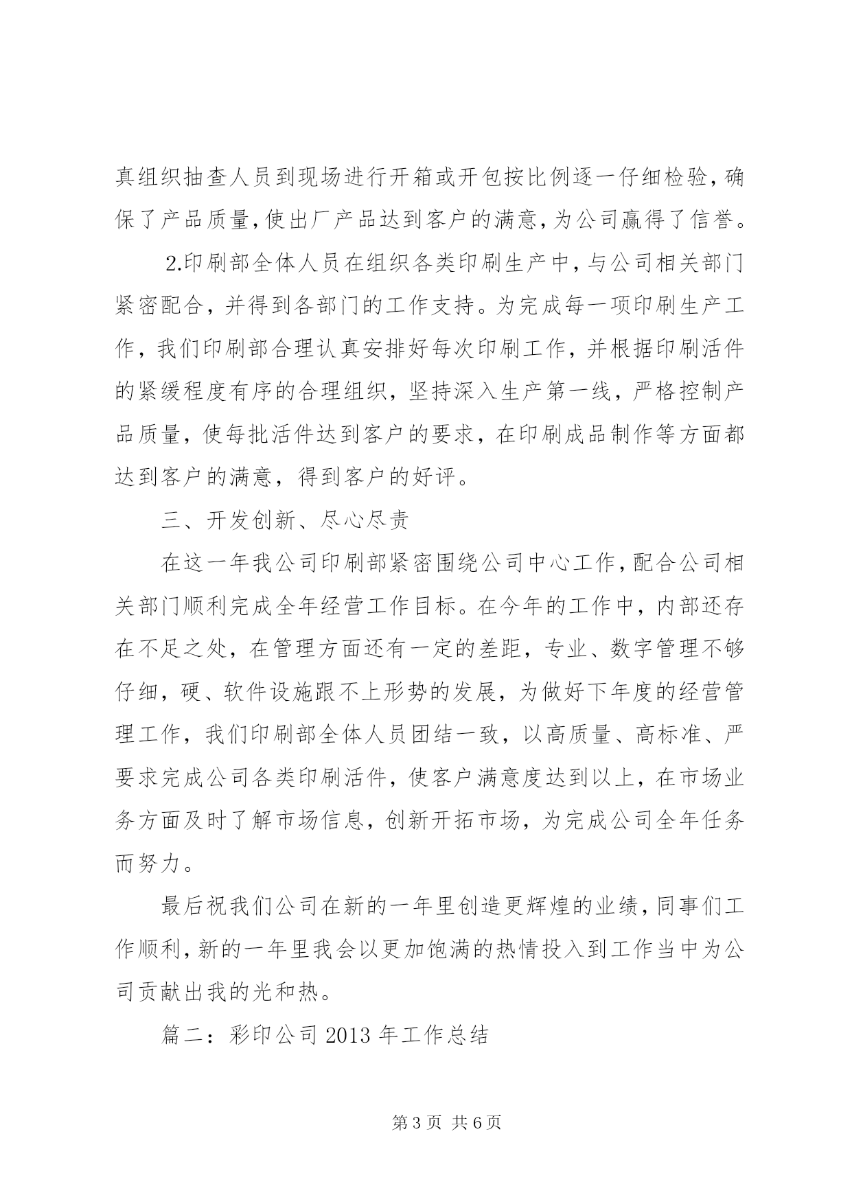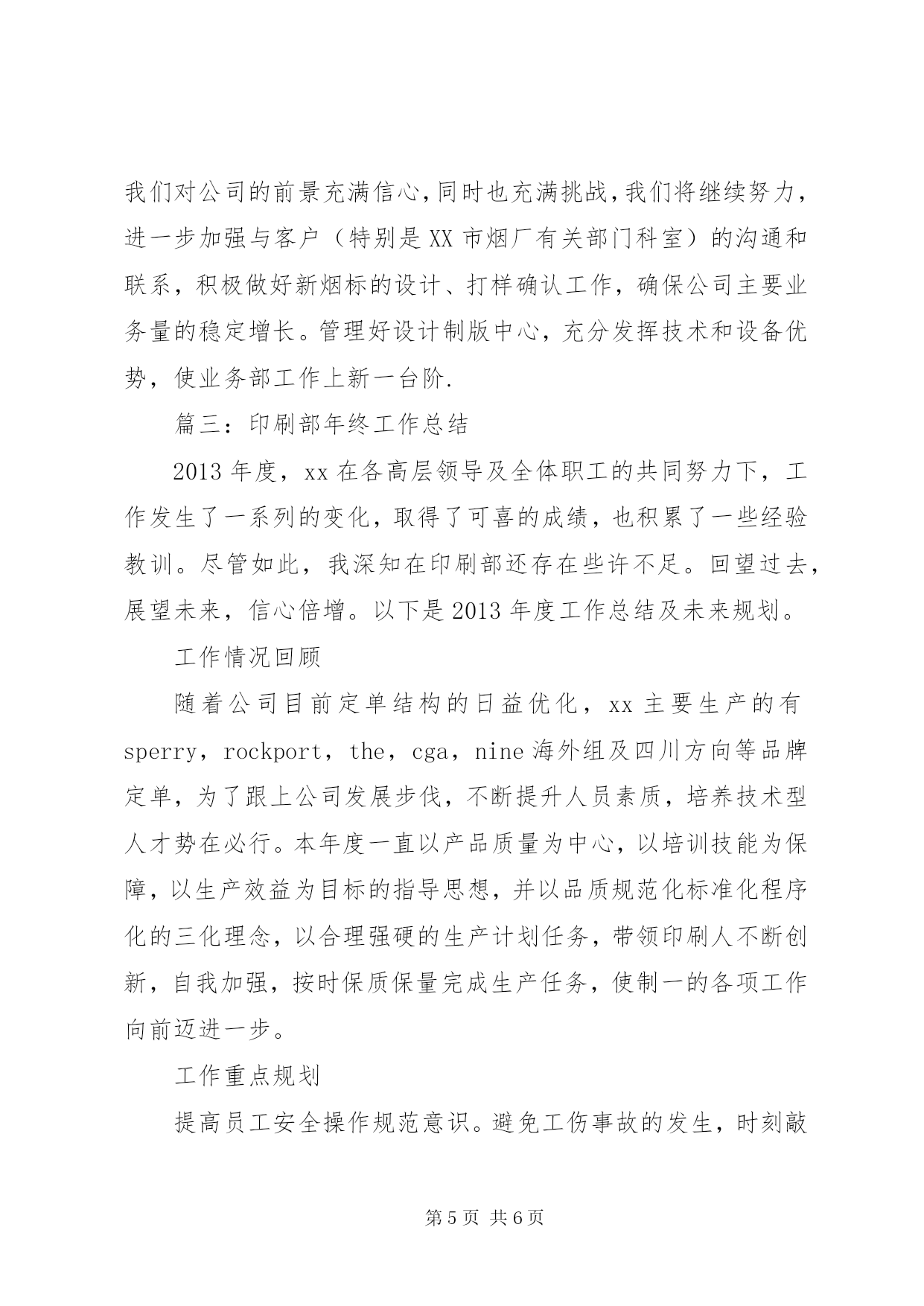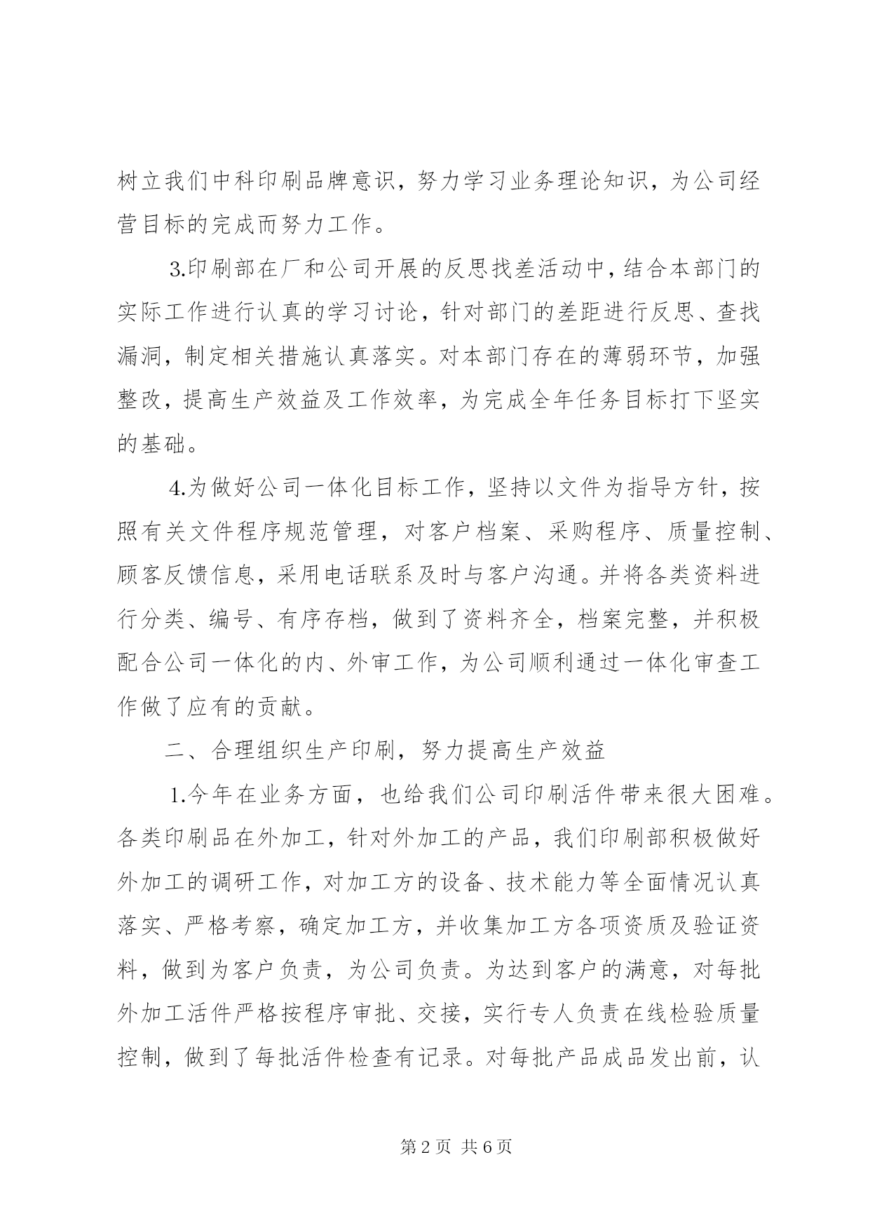 第PAGE\*Arabic\*MERGEFORMAT6页共NUMPAGES\*MERGEFORMAT6页印刷公司XX年度总结篇一:2013企业印刷部年终总结尊敬的各位领导同事们:大家上午好2013年就要过去了,回首过去的一年,我们印刷部一年来在公司的领导下,在配合公司转型发展的形势下,为认真努力完成公司制定的经营目标,紧紧围绕公司中心工作,完成全年利润目标,与各部门紧密配合,努力做好每一项工作,在全年的工作中取得了较好成绩,为公司全年工作目标尽心尽责的做出了贡献,现将一年来印刷部工作总结汇报如下:一、坚持理论学习,提高业务协调水平:⒈我们印刷部首先针对部门业务范围,认真学习公司下达的全年任务及方针政策,认真讨论目标的完成,并制定相关的执行措施;为努力完成全年工作目标任务,认真学习公司各类有关文件。坚持结合本职工作加强业务的理论学习,在工作的实践中提高业务技能水平。合理的安排生产,做到接到订单及时调度、合理组织,工作严谨有序,使每批活件产品按时完成交付,并做好客户的满意评价。⒉印刷部主要负责产品印刷调图,工艺、质量安排工作。为做好调图协调工作,我们印刷部严格按厂一体化文明内容,认真学习相关知识,提高业务能力,强化内部管理,提高质量意识,树立我们中科印刷品牌意识,努力学习业务理论知识,为公司经营目标的完成而努力工作。⒊印刷部在厂和公司开展的反思找差活动中,结合本部门的实际工作进行认真的学习讨论,针对部门的差距进行反思、查找漏洞,制定相关措施认真落实。对本部门存在的薄弱环节,加强整改,提高生产效益及工作效率,为完成全年任务目标打下坚实的基础。⒋为做好公司一体化目标工作,坚持以文件为指导方针,按照有关文件程序规范管理,对客户档案、采购程序、质量控制、顾客反馈信息,采用电话联系及时与客户沟通。并将各类资料进行分类、编号、有序存档,做到了资料齐全,档案完整,并积极配合公司一体化的内、外审工作,为公司顺利通过一体化审查工作做了应有的贡献。二、合理组织生产印刷,努力提高生产效益⒈今年在业务方面,也给我们公司印刷活件带来很大困难。各类印刷品在外加工,针对外加工的产品,我们印刷部积极做好外加工的调研工作,对加工方的设备、技术能力等全面情况认真落实、严格考察,确定加工方,并收集加工方各项资质及验证资料,做到为客户负责,为公司负责。为达到客户的满意,对每批外加工活件严格按程序审批、交接,实行专人负责在线检验质量控制,做到了每批活件检查有记录。对每批产品成品发出前,认真组织抽查人员到现场进行开箱或开包按比例逐一仔细检验,确保了产品质量,使出厂产品达到客户的满意,为公司赢得了信誉。⒉印刷部全体人员在组织各类印刷生产中,与公司相关部门紧密配合,并得到各部门的工作支持。为完成每一项印刷生产工作,我们印刷部合理认真安排好每次印刷工作,并根据印刷活件的紧缓程度有序的合理组织,坚持深入生产第一线,严格控制产品质量,使每批活件达到客户的要求,在印刷成品制作等方面都达到客户的满意,得到客户的好评。三、开发创新、尽心尽责在这一年我公司印刷部紧密围绕公司中心工作,配合公司相关部门顺利完成全年经营工作目标。在今年的工作中,内部还存在不足之处,在管理方面还有一定的差距,专业、数字管理不够仔细,硬、软件设施跟不上形势的发展,为做好下年度的经营管理工作,我们印刷部全体人员团结一致,以高质量、高标准、严要求完成公司各类印刷活件,使客户满意度达到以上,在市场业务方面及时了解市场信息,创新开拓市场,为完成公司全年任务而努力。最后祝我们公司在新的一年里创造更辉煌的业绩,同事们工作顺利,新的一年里我会以更加饱满的热情投入到工作当中为公司贡献出我的光和热。篇二:彩印公司2013年工作总结一、按照质量管理的要求,确定本部门的工作流程,严格按要求开展本部门的各项工作。二、理顺关系,确保业务部工作顺利开展。初步建立起本部门工作范围和职责,并明确部门各岗位职责和权限,顺利完成了纸张采购合同的移交,建立主要供应商档案,顺利完成iso文件的移交整理工作。三、服务于生产,积极做好车间生产及公司对外业务所需各种原辅材料的采购工作,及时与车间机台了解情况,及时处理所反映的材料使用问题,急生产之所急,较好的完成生产印刷,计划确保按时供货、保证客户生产所需。四、加强所属仓库的管理,确保原辅材料账、卡、物一致,加强对仓管员,搬运工的管理,做好防火、防盗工作,保证车间生产正常运行。提供五、积极拓展业务,公司对外承接了厦门烟厂友谊标、厦门冠兰彩印委托加工的红三环烟标盒,实现公司对外业务的突破,并加强与客户的沟通和联系,及时回笼货款,确保公司利益。六、规范采购行为,大宗纸张采购采取招标采购,努力降低采购成本。七、认真做好售后服务工作,加强与客户的沟通和联系,努力提高服务质量。综上所述,总结半年来