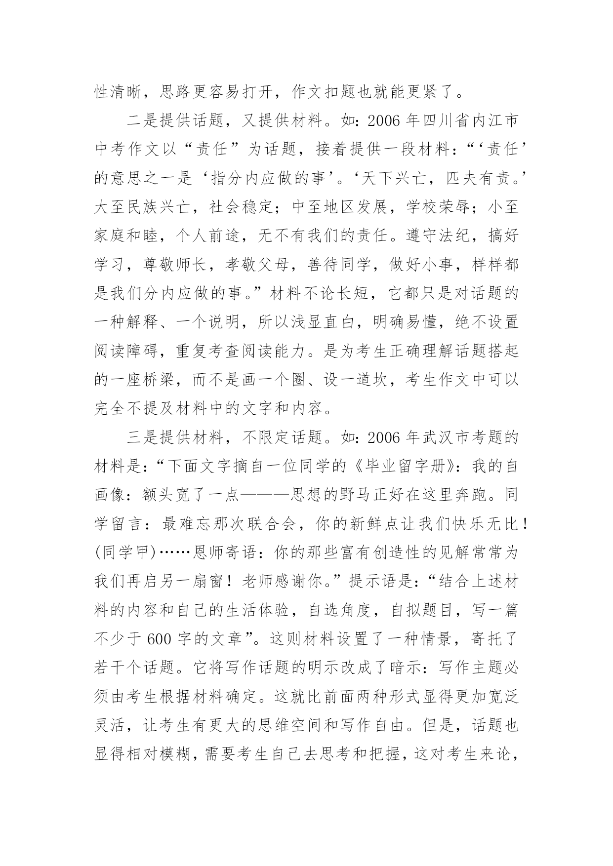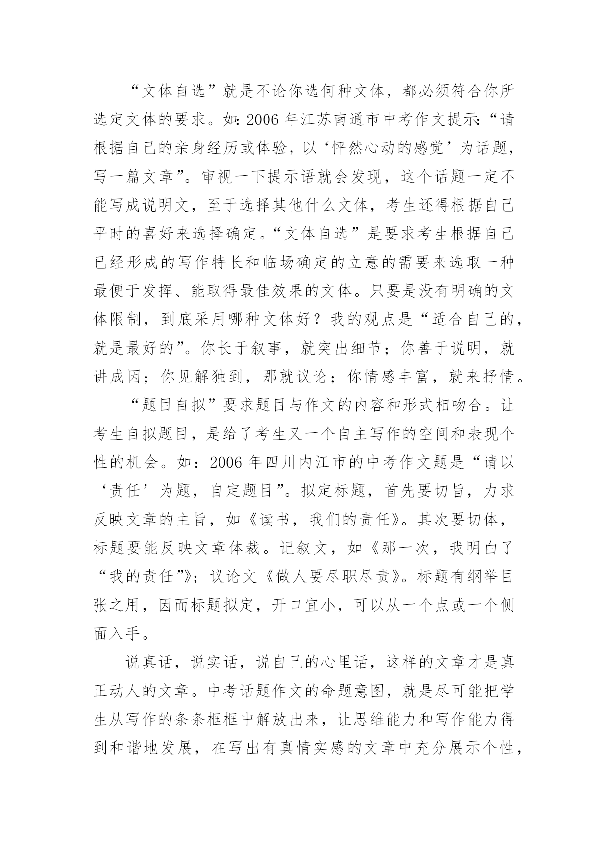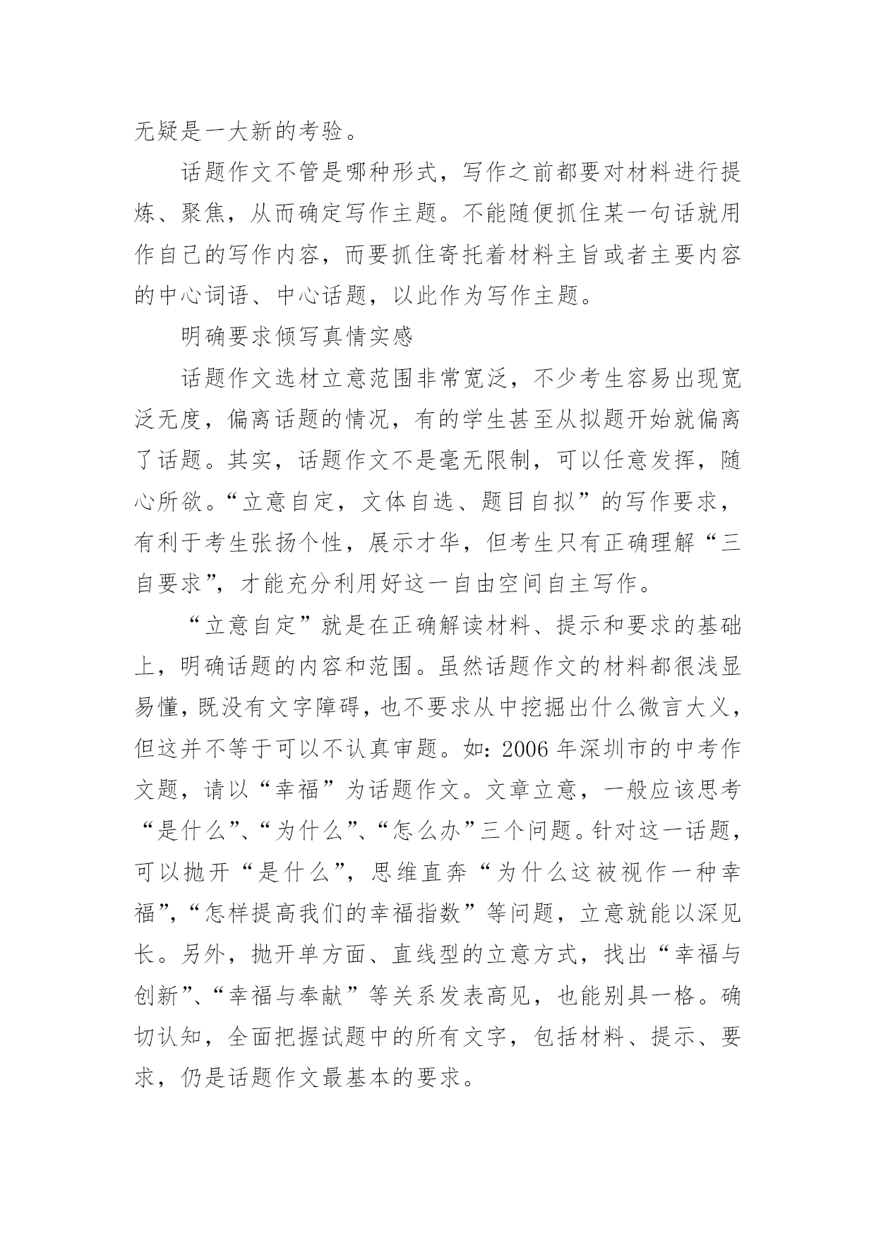 中考话题作文的特点与写作寒假对初三学生来说是提高自己作文水平的最好时间,中考的热门考点———话题作文该怎么写呢?话题作文的出现给考生提供了自主写作的广阔空间,考场作文命题形式也发生了相应的变化。据不完全统计,2006年中考,全国26个考区中有12个考区不约而同地将目光瞄准了话题作文。这说明话题作文深受广大师生的肯定和欢迎,在今后的教学和考试中,还有进一步使用、探索和开发的价值。即将参加中考的同学,写好话题作文是十分必要的。读懂材料准确确定主题话题作文是命题者提供话题而不限定立意(主题)和题目(标题),也不限定文体的作文。话题作文的形式目前主要有三种。一是提供话题,不提供材料。如:2006年湖南省长沙卷的“爱的传递”和“放心吧,有我们在”均为全命题作文。命题作文必须以提供的题目为作文标题,而话题作文却要自拟作文标题。但如果考生临场发挥不理想,一时找不到更合适的标题,而要求中又没有规定不得以话题为标题,可以直接以话题为标题。这样做不会文不对题,只可能出现题大文小和同题泛滥的问题。简便易行的做法是,以话题词语为中心,在其前后添加若干词语,组成一个标题。如:“历史铜镜中的亮点”、“漫谈亮点画廊”、“亮点背后的故事”等等。以话题词语“亮点”为中心,添加其他词语,使标题的指向性清晰,思路更容易打开,作文扣题也就能更紧了。二是提供话题,又提供材料。如:2006年四川省内江市中考作文以“责任”为话题,接着提供一段材料:“‘责任’的意思之一是‘指分内应做的事’。‘天下兴亡,匹夫有责。’大至民族兴亡,社会稳定;中至地区发展,学校荣辱;小至家庭和睦,个人前途,无不有我们的责任。遵守法纪,搞好学习,尊敬师长,孝敬父母,善待同学,做好小事,样样都是我们分内应做的事。”材料不论长短,它都只是对话题的一种解释、一个说明,所以浅显直白,明确易懂,绝不设置阅读障碍,重复考查阅读能力。是为考生正确理解话题搭起的一座桥梁,而不是画一个圈、设一道坎,考生作文中可以完全不提及材料中的文字和内容。三是提供材料,不限定话题。如:2006年武汉市考题的材料是:“下面文字摘自一位同学的《毕业留字册》:我的自画像:额头宽了一点———思想的野马正好在这里奔跑。同学留言:最难忘那次联合会,你的新鲜点让我们快乐无比!(同学甲)……恩师寄语:你的那些富有创造性的见解常常为我们再启另一扇窗!老师感谢你。”提示语是:“结合上述材料的内容和自己的生活体验,自选角度,自拟题目,写一篇不少于600字的文章”。这则材料设置了一种情景,寄托了若干个话题。它将写作话题的明示改成了暗示:写作主题必须由考生根据材料确定。这就比前面两种形式显得更加宽泛灵活,让考生有更大的思维空间和写作自由。但是,话题也显得相对模糊,需要考生自己去思考和把握,这对考生来论,无疑是一大新的考验。话题作文不管是哪种形式,写作之前都要对材料进行提炼、聚焦,从而确定写作主题。不能随便抓住某一句话就用作自己的写作内容,而要抓住寄托着材料主旨或者主要内容的中心词语、中心话题,以此作为写作主题。明确要求倾写真情实感话题作文选材立意范围非常宽泛,不少考生容易出现宽泛无度,偏离话题的情况,有的学生甚至从拟题开始就偏离了话题。其实,话题作文不是毫无限制,可以任意发挥,随心所欲。“立意自定,文体自选、题目自拟”的写作要求,有利于考生张扬个性,展示才华,但考生只有正确理解“三自要求”,才能充分利用好这一自由空间自主写作。“立意自定”就是在正确解读材料、提示和要求的基础上,明确话题的内容和范围。虽然话题作文的材料都很浅显易懂,既没有文字障碍,也不要求从中挖掘出什么微言大义,但这并不等于可以不认真审题。如:2006年深圳市的中考作文题,请以“幸福”为话题作文。文章立意,一般应该思考“是什么”、“为什么”、“怎么办”三个问题。针对这一话题,可以抛开“是什么”,思维直奔“为什么这被视作一种幸福”,“怎样提高我们的幸福指数”等问题,立意就能以深见长。另外,抛开单方面、直线型的立意方式,找出“幸福与创新”、“幸福与奉献”等关系发表高见,也能别具一格。确切认知,全面把握试题中的所有文字,包括材料、提示、要求,仍是话题作文最基本的要求。“文体自选”就是不论你选何种文体,都必须符合你所选定文体的要求。如:2006年江苏南通市中考作文提示:“请根据自己的亲身经历或体验,以‘怦然心动的感觉’为话题,写一篇文章”。审视一下提示语就会发现,这个话题一定不能写成说明文,至于选择其他什么文体,考生还得根据自己平时的喜好来选择确定。“文体自选”是要求考生根据自己已经形成的写作特长和临场确定的立意的需要来选取一种最便于发挥、能取得最佳效果的文体。只要是没有明确的文体限制,到底采用哪种文体好?我的观点是“适合自己的,就是最好的”。你长于叙事,就突出细节;你善于说明,就讲成因;你见