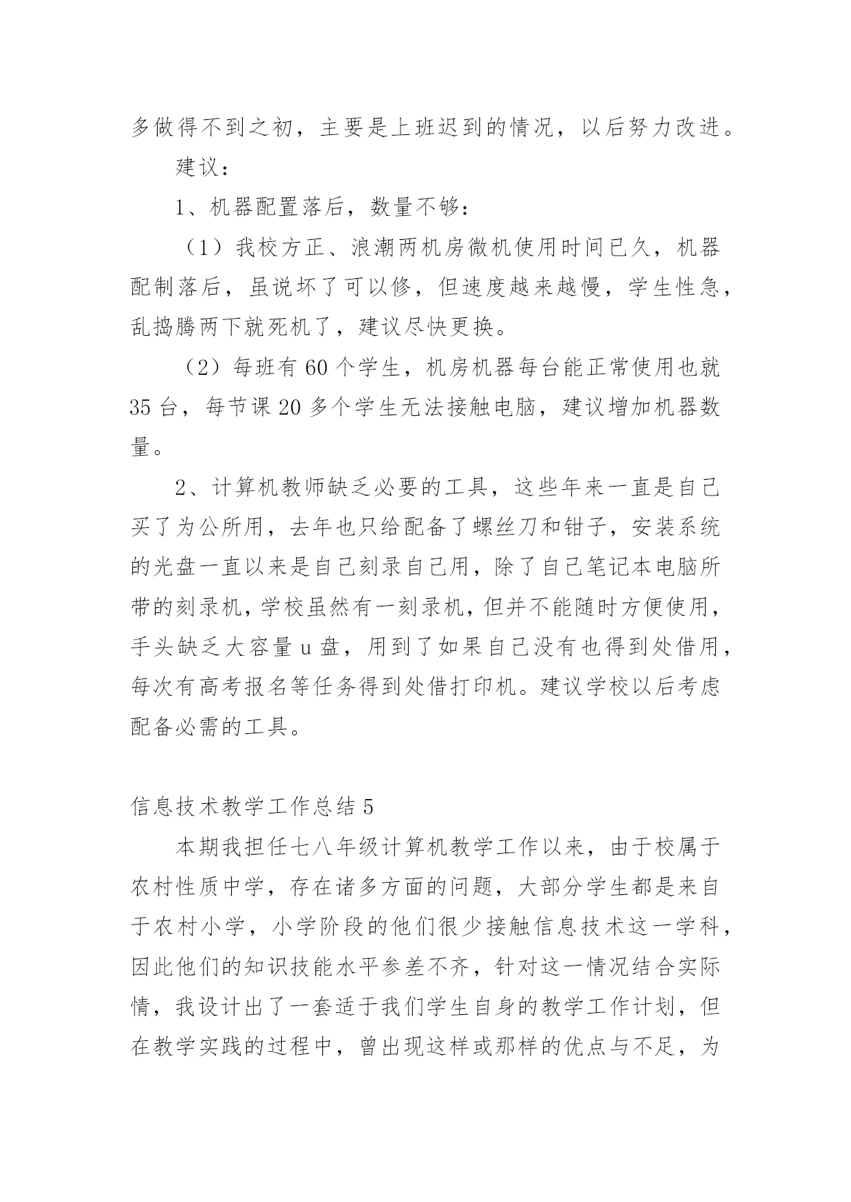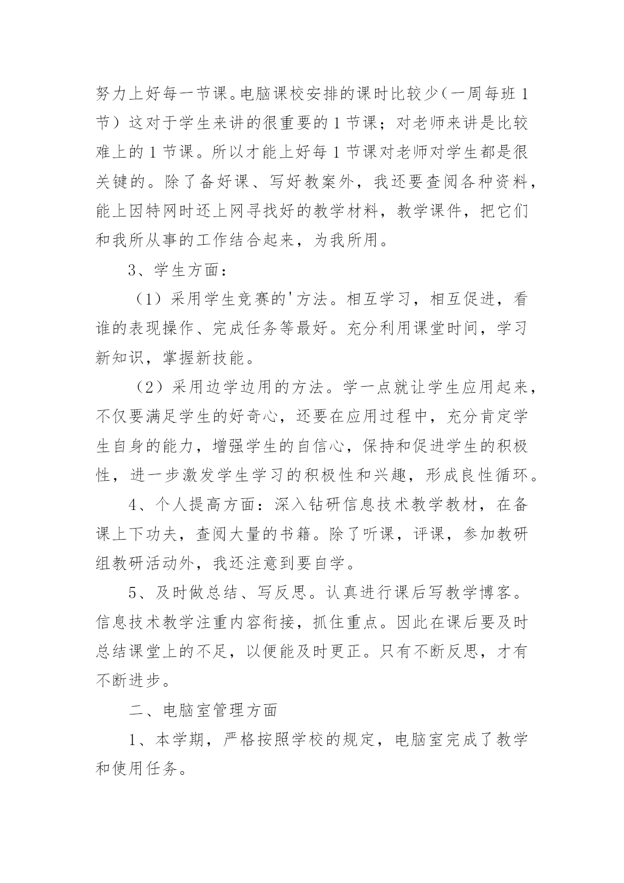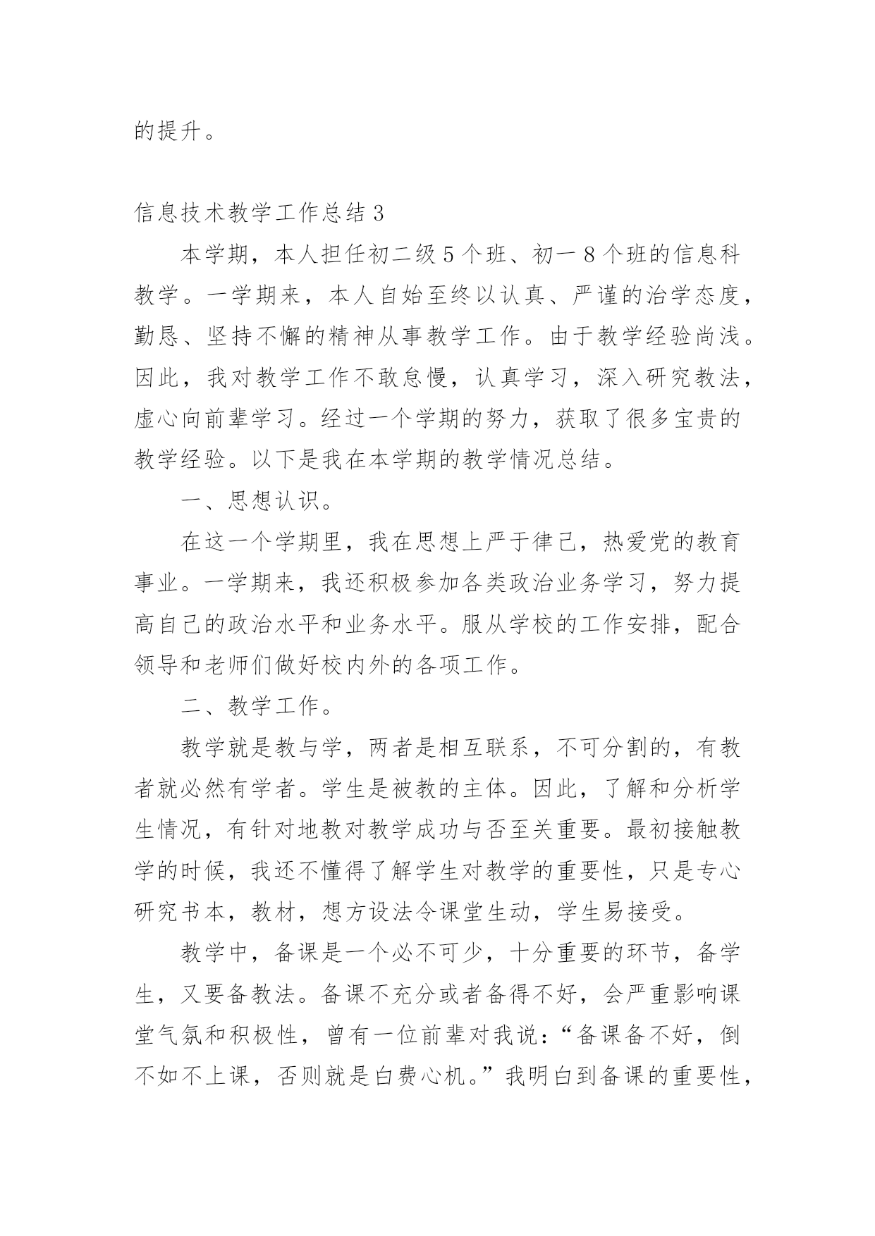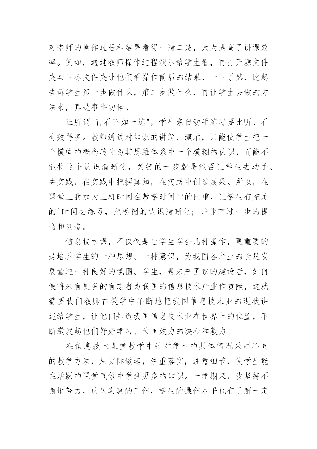 信息技术教学工作总结信息技术教学工作总结(15篇)总结是对取得的成绩、存在的问题及得到的经验和教训等方面情况进行评价与描述的一种书面材料,它可使零星的、肤浅的、表面的感性认知上升到全面的、系统的、本质的理性认识上来,不如立即行动起来写一份总结吧。你想知道总结怎么写吗?下面是小编收集整理的信息技术教学工作总结,欢迎阅读,希望大家能够喜欢。信息技术教学工作总结1本学期,我担任全校五年级两个班级的信息技术教学工作。在这一学期中经过我校领导及老师和学生的努力取得了可喜的成绩。当然在工作中我享受到收获喜悦,也在工作中发现一些存在的问题。我所享有的收获我会用于新学期的工作中,我所碰到的问题我要认真思考想办法解决。本学期我主要做了这一些工作:一、教学方面1、做到期初有计划,有教学进度,使教学工作能有条不紊地顺利进行下去;由于教学计划安排的比较好,所以并没有给工作带来影响,反而在一定程度上有利于教学工作的进行,使得大量电脑理论知识得于传授给学生。2、按照学校工作管理规定,认真备好课,写好教案,努力上好每一节课。电脑课校安排的课时比较少(一周每班1节)这对于学生来讲的很重要的1节课;对老师来讲是比较难上的1节课。所以才能上好每1节课对老师对学生都是很关键的。除了备好课、写好教案外,我还要查阅各种资料,能上因特网时还上网寻找好的教学材料,教学课件,把它们和我所从事的工作结合起来,为我所用。3、学生方面:(1)采用学生竞赛的'方法。相互学习,相互促进,看谁的表现操作、完成任务等最好。充分利用课堂时间,学习新知识,掌握新技能。(2)采用边学边用的方法。学一点就让学生应用起来,不仅要满足学生的好奇心,还要在应用过程中,充分肯定学生自身的能力,增强学生的自信心,保持和促进学生的积极性,进一步激发学生学习的积极性和兴趣,形成良性循环。4、个人提高方面:深入钻研信息技术教学教材,在备课上下功夫,查阅大量的书籍。除了听课,评课,参加教研组教研活动外,我还注意到要自学。5、及时做总结、写反思。认真进行课后写教学博客。信息技术教学注重内容衔接,抓住重点。因此在课后要及时总结课堂上的不足,以便能及时更正。只有不断反思,才有不断进步。二、电脑室管理方面1、本学期,严格按照学校的规定,电脑室完成了教学和使用任务。2、及时进行设备的维护。好的设备必须进行及时的维护,出现问题后马上进行检修。不让机器耽误学生使用和教学。3、认真打扫一个教室的卫生。每周进行拖地扫地。保持良好的卫生环境,让学生和老师有一个良好的学习和备课环境。4、坚持按照学校的要求进行工作。每天下班进行设备的检查和用电方面的检查。是否关闭了电源和门窗。5、计算机室的使用严格按照规章制度来完成。教师上完课及时进行卫生的打扫。定期进行设备的维护。三、存在的不足1、对差生多些关心,多点爱心,再多一些耐心,使他们在对计算机的认识上有更大进步。2、加强机房纪律和机器使用道德方面的教育,使学生不仅在班级集中注意力学习,在机房上机时也要按规定严格约束自己。3、教室卫生不太令人满意,由于各方面原因,每周教室打扫得不是很到位。回顾这学期从事信息技术的教学工作,我基本上是比较顺利地完成了教学任务。当然,在工作中也出现不如人意的事。但我相信在今后的教学中,处处留心,时时注意,不断创新,一定能将教学水平提高到一个新的高度,让学生能愉快地学习和掌握计算机技能。信息技术教学工作总结2这学期我担任五年级2个班的信息技术课,每周每班一课时,是小学阶段的必修课程,该课程的开设对于学生信息素养的提升,对终身学习能力的培养具有非常重要的意义。现阶段信息技术课的教学目标是主要培养学生掌握计算机操作技能,着眼于使学生掌握信息科学、信息技术的基本知识,注重培养学生信息采集、加工、发布等信息处理的基本技能,促进和提高学生主动利用信息技术和信息资源解决实际问题的能力,并用于学习和生活。本学期教学内容包括信息技术基础知识、电子表格等知识。一、不断学习提高个人素养积极参加学校组织的教学活动,提高自己的政治素质和理论素养,注重自己思想道德水平的提高。平时积极参加教研活动,在工作之余,学习网络管理和计算机维护的相关知识,努力提高个人的业务水平,为信息技术教学工作打下良好的基础。二、扎实细致地做好教学工作备课对于每门课程的教学而言,都是必不可少的环节,信息技术学科教学也不例外。在备课的过程中,我首先对所要教授的知识进行全面的研究、归纳、总结,并根据教授对象的不同特点找到教授的最佳方法与方式。在此基础上将所备内容在计算机上进行逐一推敲、验证、演练,以使一些空洞的知识具有可操作性;同时,还将每个知识点构造成一个操作性实例,通过对实例的演练让学生对知识点产生准确、完整的认识,由此得出相关的结论。从而做到对人、书、机三者进行有机结合的备课,本学期开始逐步完成电子教案。根据
