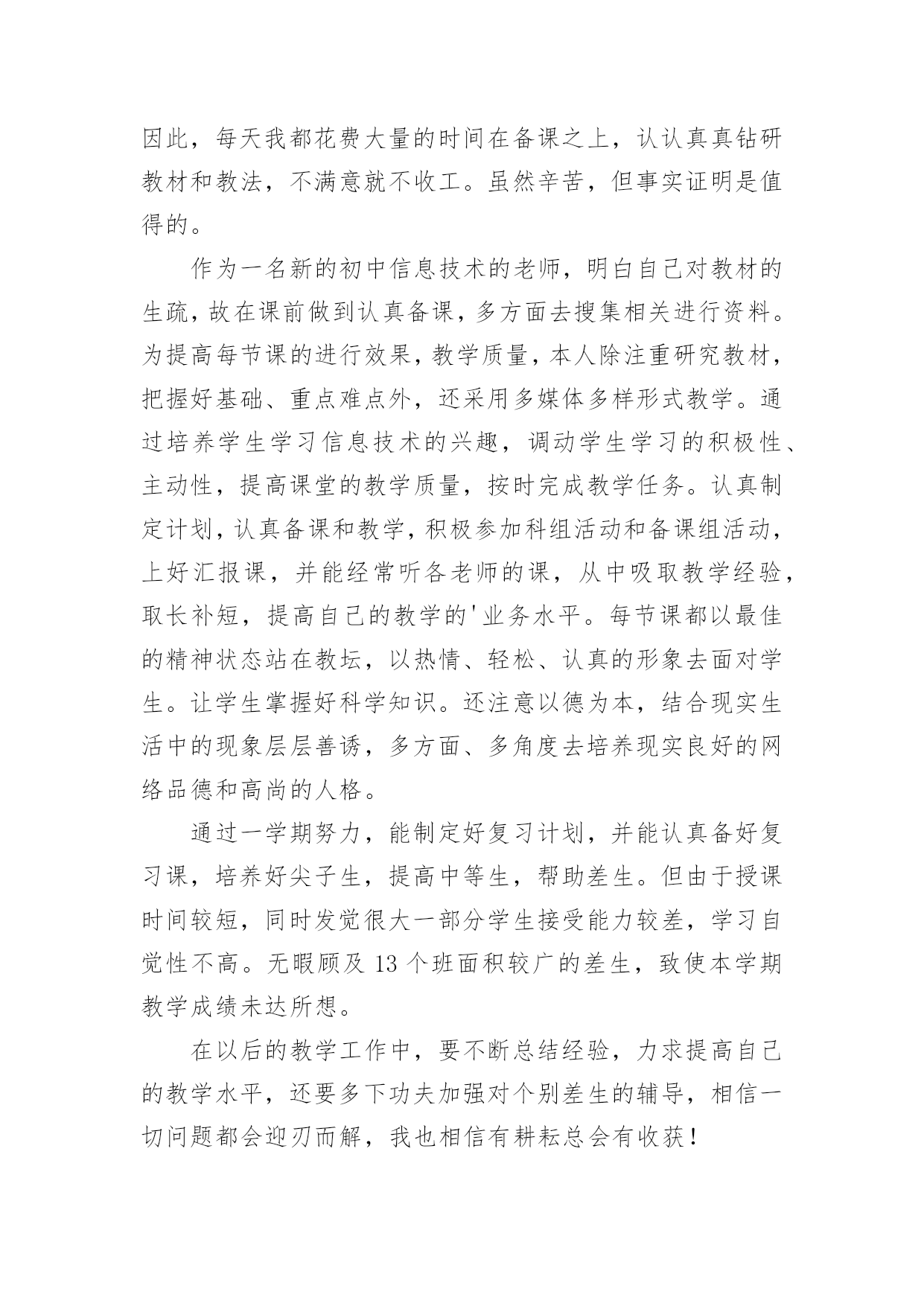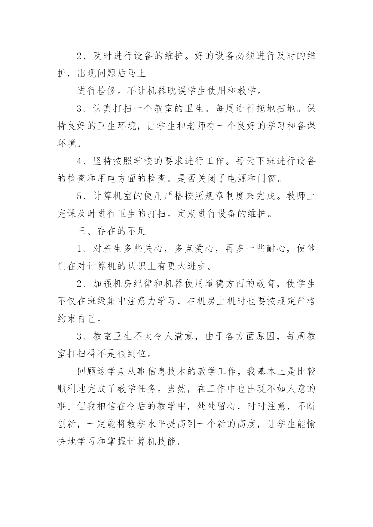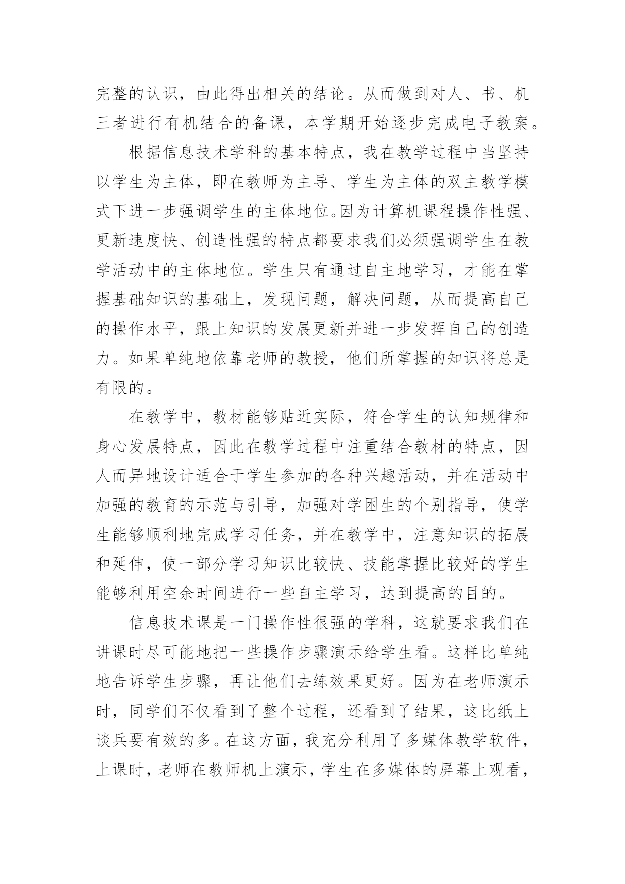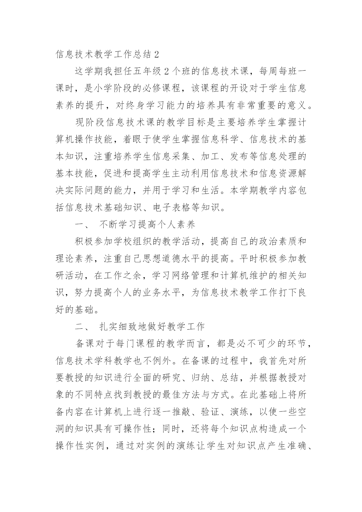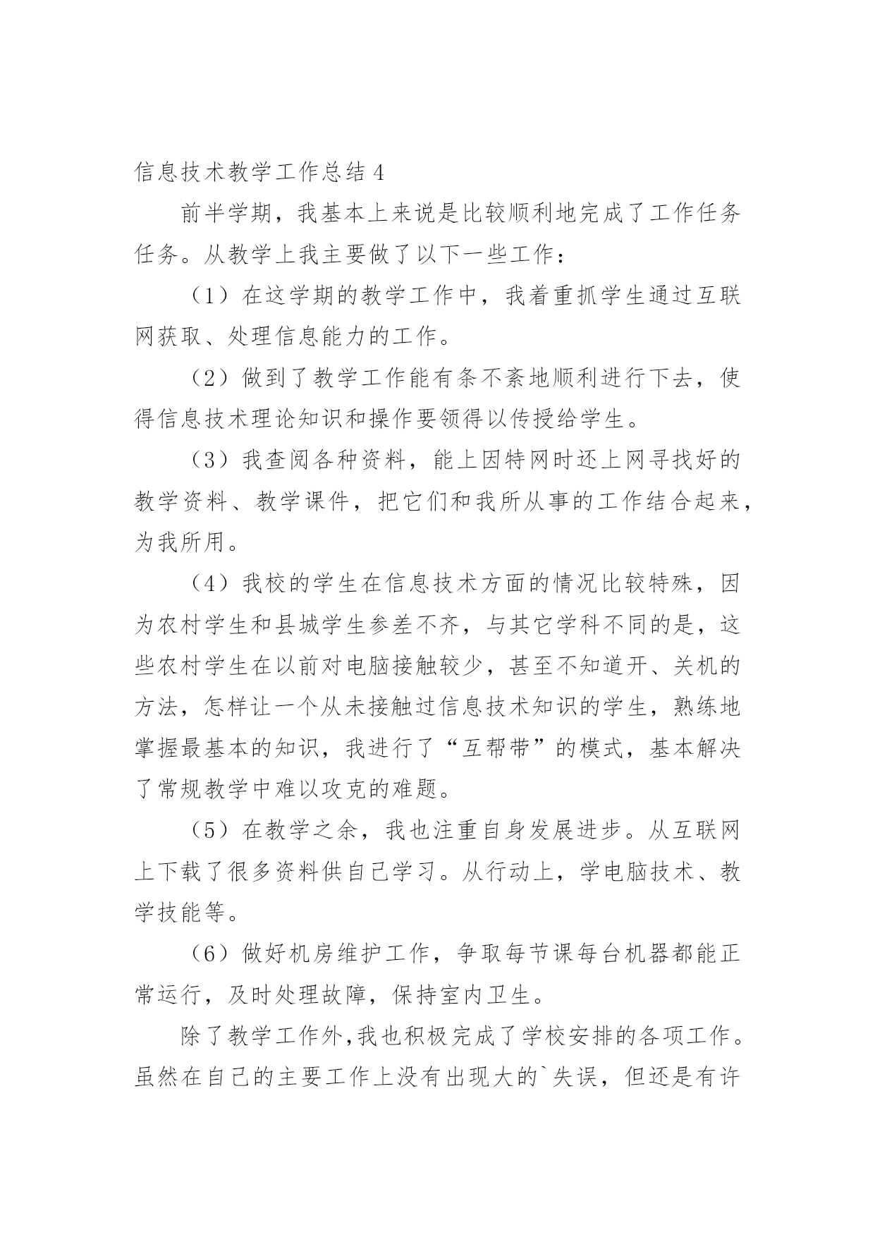 信息技术教学工作总结信息技术教学工作总结(15篇)总结是对取得的成绩、存在的问题及得到的经验和教训等方面情况进行评价与描述的一种书面材料,它可使零星的、肤浅的、表面的感性认知上升到全面的、系统的、本质的理性认识上来,不如立即行动起来写一份总结吧。你想知道总结怎么写吗?下面是小编收集整理的信息技术教学工作总结,欢迎阅读,希望大家能够喜欢。信息技术教学工作总结1本学期,我担任全校五年级两个班级的信息技术教学工作。在这一学期中经过我校领导及老师和学生的努力取得了可喜的成绩。当然在工作中我享受到收获喜悦,也在工作中发现一些存在的问题。我所享有的收获我会用于新学期的工作中,我所碰到的问题我要认真思考想办法解决。本学期我主要做了这一些工作:一、教学方面1、做到期初有计划,有教学进度,使教学工作能有条不紊地顺利进行下去;由于教学计划安排的比较好,所以并没有给工作带来影响,反而在一定程度上有利于教学工作的进行,使得大量电脑理论知识得于传授给学生。2、按照学校工作管理规定,认真备好课,写好教案,努力上好每一节课。电脑课校安排的课时比较少(一周每班1节)这对于学生来讲的很重要的1节课;对老师来讲是比较难上的1节课。所以才能上好每1节课对老师对学生都是很关键的。除了备好课、写好教案外,我还要查阅各种资料,能上因特网时还上网寻找好的教学材料,教学课件,把它们和我所从事的工作结合起来,为我所用。3、学生方面:(1)采用学生竞赛的'方法。相互学习,相互促进,看谁的表现操作、完成任务等最好。充分利用课堂时间,学习新知识,掌握新技能。(2)采用边学边用的方法。学一点就让学生应用起来,不仅要满足学生的好奇心,还要在应用过程中,充分肯定学生自身的能力,增强学生的自信心,保持和促进学生的积极性,进一步激发学生学习的积极性和兴趣,形成良性循环。4、个人提高方面:深入钻研信息技术教学教材,在备课上下功夫,查阅大量的书籍。除了听课,评课,参加教研组教研活动外,我还注意到要自学。5、及时做总结、写反思。认真进行课后写教学博客。信息技术教学注重内容衔接,抓住重点。因此在课后要及时总结课堂上的不足,以便能及时更正。只有不断反思,才有不断进步。二、电脑室管理方面1、本学期,严格按照学校的规定,电脑室完成了教学和使用任务。2、及时进行设备的维护。好的设备必须进行及时的维护,出现问题后马上进行检修。不让机器耽误学生使用和教学。3、认真打扫一个教室的卫生。每周进行拖地扫地。保持良好的卫生环境,让学生和老师有一个良好的学习和备课环境。4、坚持按照学校的要求进行工作。每天下班进行设备的检查和用电方面的检查。是否关闭了电源和门窗。5、计算机室的使用严格按照规章制度来完成。教师上完课及时进行卫生的打扫。定期进行设备的维护。三、存在的不足1、对差生多些关心,多点爱心,再多一些耐心,使他们在对计算机的认识上有更大进步。2、加强机房纪律和机器使用道德方面的教育,使学生不仅在班级集中注意力学习,在机房上机时也要按规定严格约束自己。3、教室卫生不太令人满意,由于各方面原因,每周教室打扫得不是很到位。回顾这学期从事信息技术的教学工作,我基本上是比较顺利地完成了教学任务。当然,在工作中也出现不如人意的事。但我相信在今后的教学中,处处留心,时时注意,不断创新,一定能将教学水平提高到一个新的高度,让学生能愉快地学习和掌握计算机技能。信息技术教学工作总结2这学期我担任五年级2个班的信息技术课,每周每班一课时,是小学阶段的必修课程,该课程的开设对于学生信息素养的提升,对终身学习能力的培养具有非常重要的意义。现阶段信息技术课的教学目标是主要培养学生掌握计算机操作技能,着眼于使学生掌握信息科学、信息技术的基本知识,注重培养学生信息采集、加工、发布等信息处理的基本技能,促进和提高学生主动利用信息技术和信息资源解决实际问题的能力,并用于学习和生活。本学期教学内容包括信息技术基础知识、电子表格等知识。一、不断学习提高个人素养积极参加学校组织的教学活动,提高自己的政治素质和理论素养,注重自己思想道德水平的提高。平时积极参加教研活动,在工作之余,学习网络管理和计算机维护的相关知识,努力提高个人的业务水平,为信息技术教学工作打下良好的基础。二、扎实细致地做好教学工作备课对于每门课程的教学而言,都是必不可少的环节,信息技术学科教学也不例外。在备课的过程中,我首先对所要教授的知识进行全面的研究、归纳、总结,并根据教授对象的不同特点找到教授的最佳方法与方式。在此基础上将所备内容在计算机上进行逐一推敲、验证、演练,以使一些空洞的知识具有可操作性;同时,还将每个知识点构造成一个操作性实例,通过对实例的演练让学生对知识点产生准确、完整的认识,由此得出相关的结论。从而做到对人、书、机三者进行有机结合的备课,本学期开始逐步完成电子教案。根据