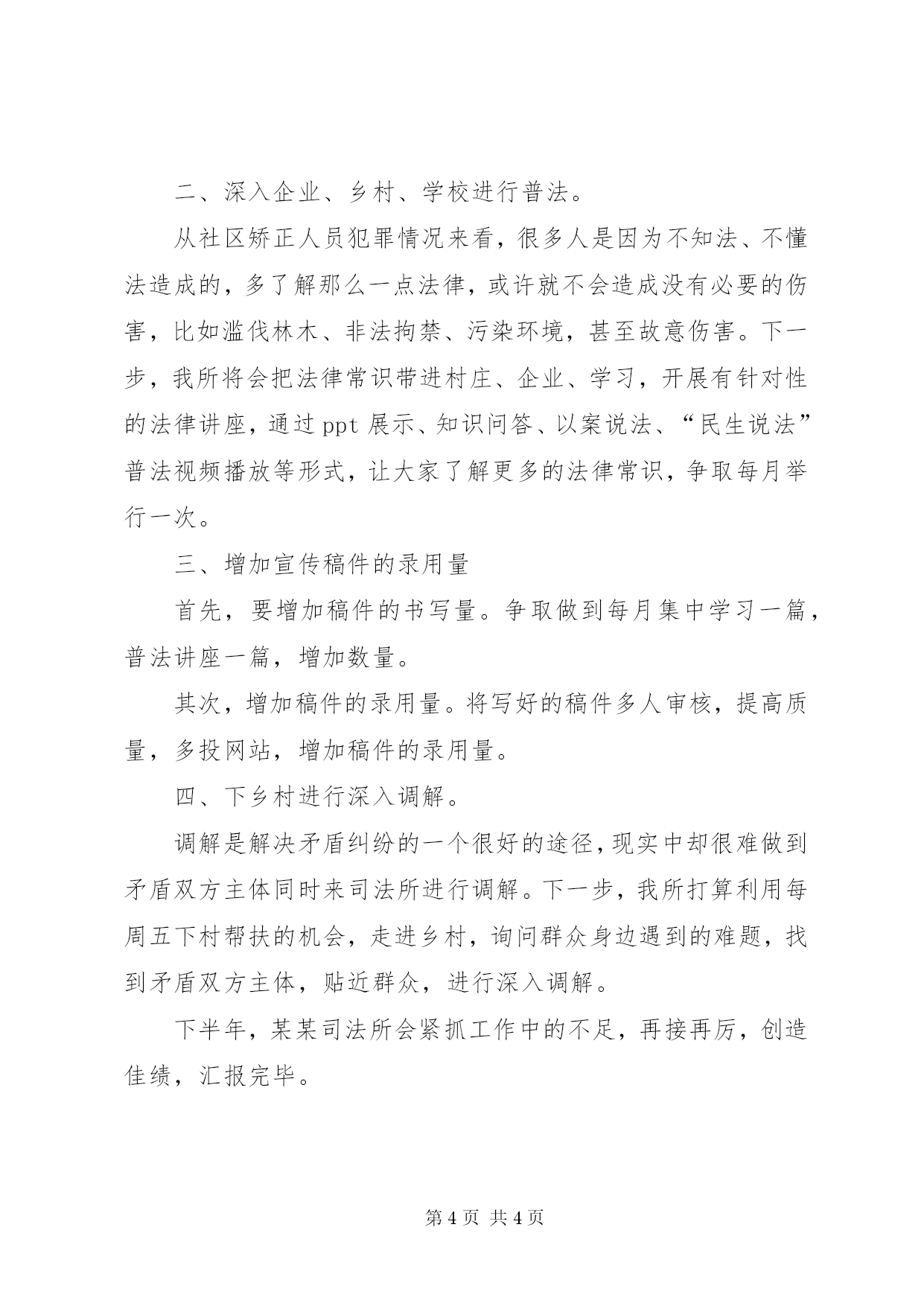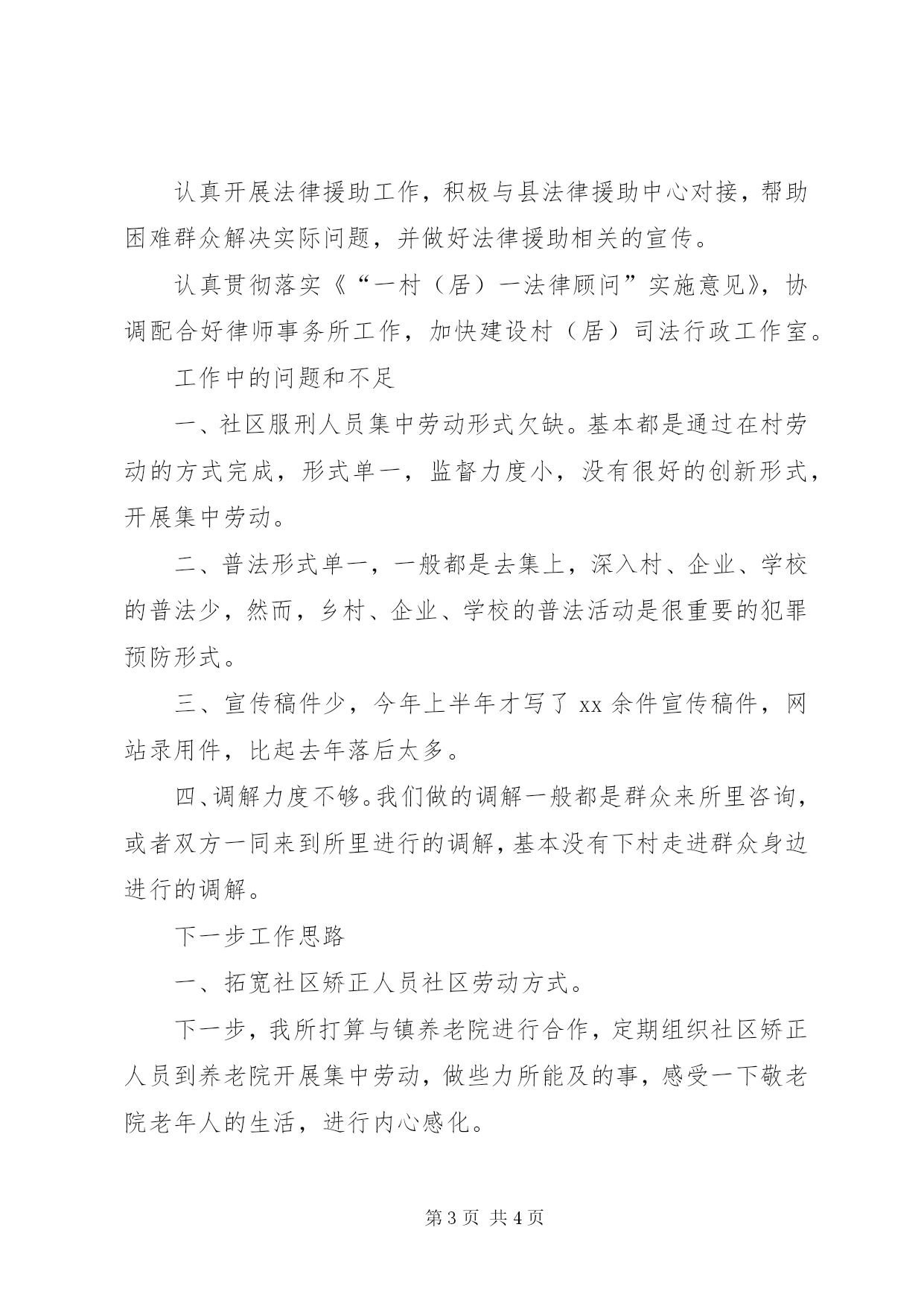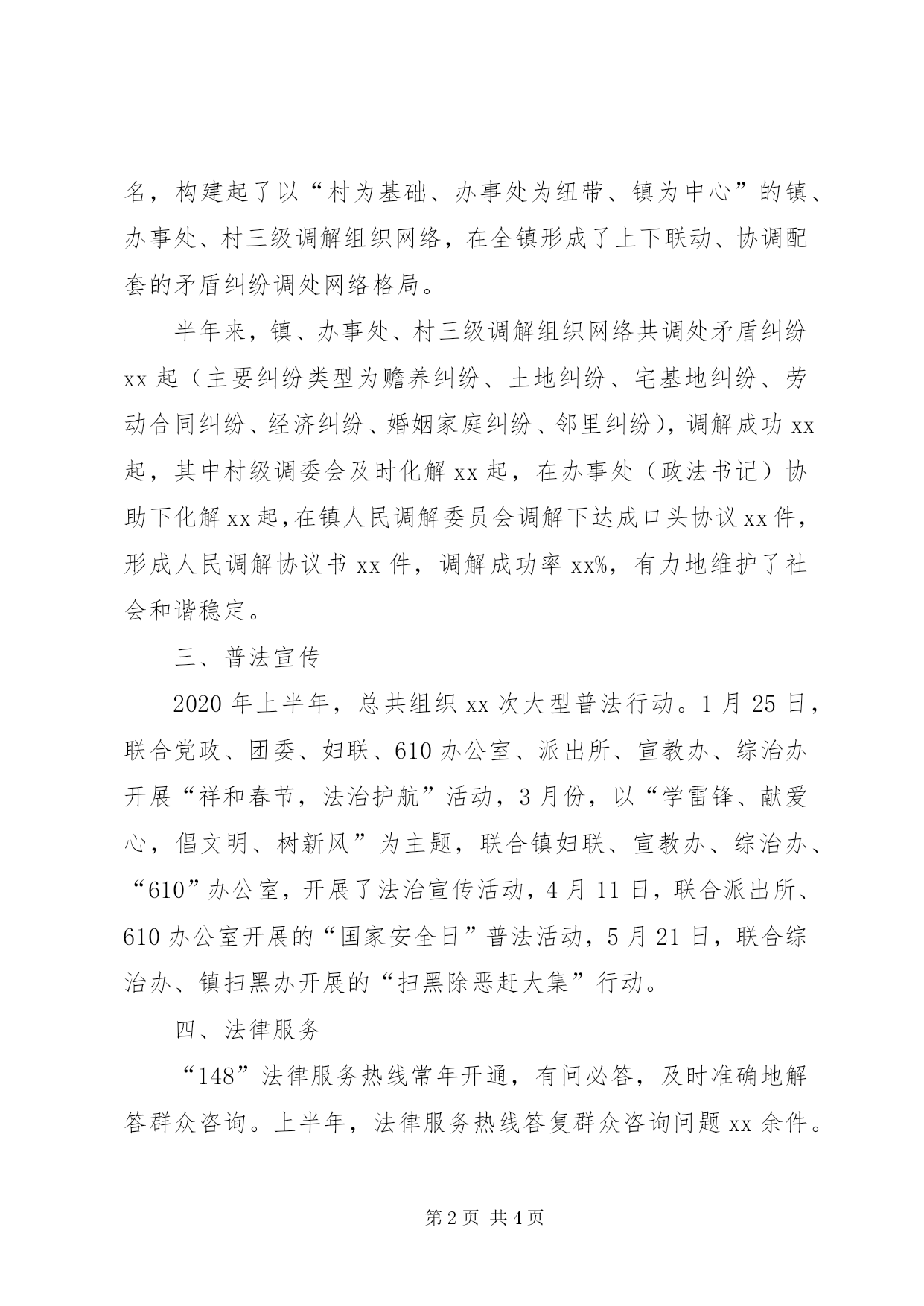第PAGE\*Arabic\*MERGEFORMAT4页共NUMPAGES\*MERGEFORMAT4页某某司法所XX年半年工作汇报2020年上半年,某某司法所根据县司法局的工作安排,在镇党委、政府的领导下,主要负责某某镇社区矫正、安置帮教人员管理,人民调解、普法宣传、法律援助、法律服务等工作,积极配合参与镇街扫黑除恶及其他工作。具体工作开展情况如下:一、两类人员管理两类人员管理是司法所的日常工作。目前为止,共接收社区矫正人员xx人,其中,解矫xx人,正在接受矫正管理矫正人员xx人,安置帮教人员xx名。两类人员都按照规定进行管理。社区矫正人员方面,落实入矫、解矫宣告程序,认真签署《社区矫正责任书》、《手机定位告知书》,每天手机定位核查其外出情况,要求每月来所报道一次,2018年8月开始,每月月底组织对社区矫正人员进行集中学习,宣讲法律知识。安置帮教方面,每季度进行电话核查,全面了解情况,完善档案。开展社区矫正安全隐患大排查专项活动,2020年4月份,我所对社区矫正人员所在村委及单位进行集中电话访查,并对本人进行当面谈话,全面了解情况,摸排安全隐患。二、人民调解人民调解网络健全完善,人民调解委员会组建率达到100%。全镇现有人民调解委员会xx个,调解小组xx个,人民调解员xx名,构建起了以“村为基础、办事处为纽带、镇为中心”的镇、办事处、村三级调解组织网络,在全镇形成了上下联动、协调配套的矛盾纠纷调处网络格局。半年来,镇、办事处、村三级调解组织网络共调处矛盾纠纷xx起(主要纠纷类型为赡养纠纷、土地纠纷、宅基地纠纷、劳动合同纠纷、经济纠纷、婚姻家庭纠纷、邻里纠纷),调解成功xx起,其中村级调委会及时化解xx起,在办事处(政法书记)协助下化解xx起,在镇人民调解委员会调解下达成口头协议xx件,形成人民调解协议书xx件,调解成功率xx%,有力地维护了社会和谐稳定。三、普法宣传2020年上半年,总共组织xx次大型普法行动。1月25日,联合党政、团委、妇联、610办公室、派出所、宣教办、综治办开展“祥和春节,法治护航”活动,3月份,以“学雷锋、献爱心,倡文明、树新风”为主题,联合镇妇联、宣教办、综治办、“610”办公室,开展了法治宣传活动,4月11日,联合派出所、610办公室开展的“国家安全日”普法活动,5月21日,联合综治办、镇扫黑办开展的“扫黑除恶赶大集”行动。四、法律服务“148”法律服务热线常年开通,有问必答,及时准确地解答群众咨询。上半年,法律服务热线答复群众咨询问题xx余件。认真开展法律援助工作,积极与县法律援助中心对接,帮助困难群众解决实际问题,并做好法律援助相关的宣传。认真贯彻落实《“一村(居)一法律顾问”实施意见》,协调配合好律师事务所工作,加快建设村(居)司法行政工作室。工作中的问题和不足一、社区服刑人员集中劳动形式欠缺。基本都是通过在村劳动的方式完成,形式单一,监督力度小,没有很好的创新形式,开展集中劳动。二、普法形式单一,一般都是去集上,深入村、企业、学校的普法少,然而,乡村、企业、学校的普法活动是很重要的犯罪预防形式。三、宣传稿件少,今年上半年才写了xx余件宣传稿件,网站录用件,比起去年落后太多。四、调解力度不够。我们做的调解一般都是群众来所里咨询,或者双方一同来到所里进行的调解,基本没有下村走进群众身边进行的调解。下一步工作思路一、拓宽社区矫正人员社区劳动方式。下一步,我所打算与镇养老院进行合作,定期组织社区矫正人员到养老院开展集中劳动,做些力所能及的事,感受一下敬老院老年人的生活,进行内心感化。二、深入企业、乡村、学校进行普法。从社区矫正人员犯罪情况来看,很多人是因为不知法、不懂法造成的,多了解那么一点法律,或许就不会造成没有必要的伤害,比如滥伐林木、非法拘禁、污染环境,甚至故意伤害。下一步,我所将会把法律常识带进村庄、企业、学习,开展有针对性的法律讲座,通过ppt展示、知识问答、以案说法、“民生说法”普法视频播放等形式,让大家了解更多的法律常识,争取每月举行一次。三、增加宣传稿件的录用量首先,要增加稿件的书写量。争取做到每月集中学习一篇,普法讲座一篇,增加数量。其次,增加稿件的录用量。将写好的稿件多人审核,提高质量,多投网站,增加稿件的录用量。四、下乡村进行深入调解。调解是解决矛盾纠纷的一个很好的途径,现实中却很难做到矛盾双方主体同时来司法所进行调解。下一步,我所打算利用每周五下村帮扶的机会,走进乡村,询问群众身边遇到的难题,找到矛盾双方主体,贴近群众,进行深入调解。下半年,某某司法所会紧抓工作中的不足,再接再厉,创造佳绩,汇报完毕。