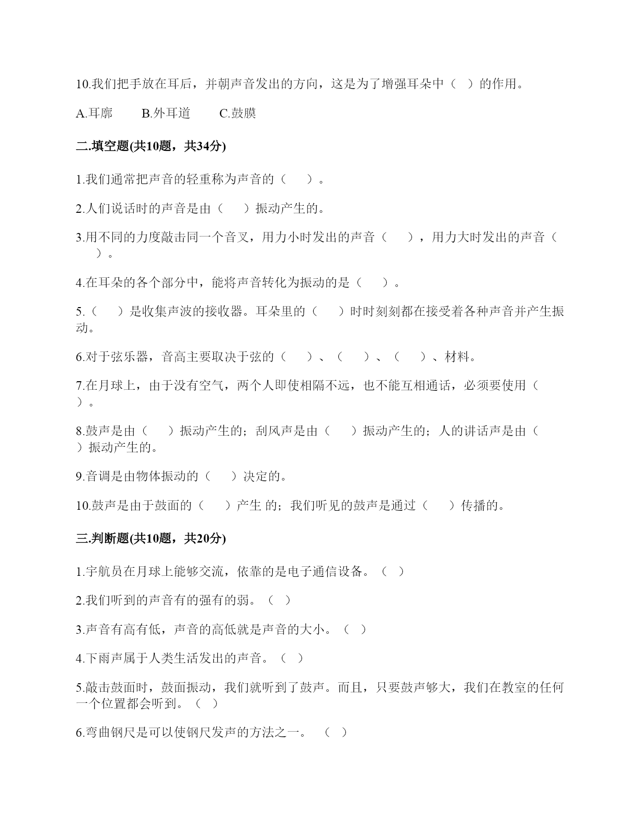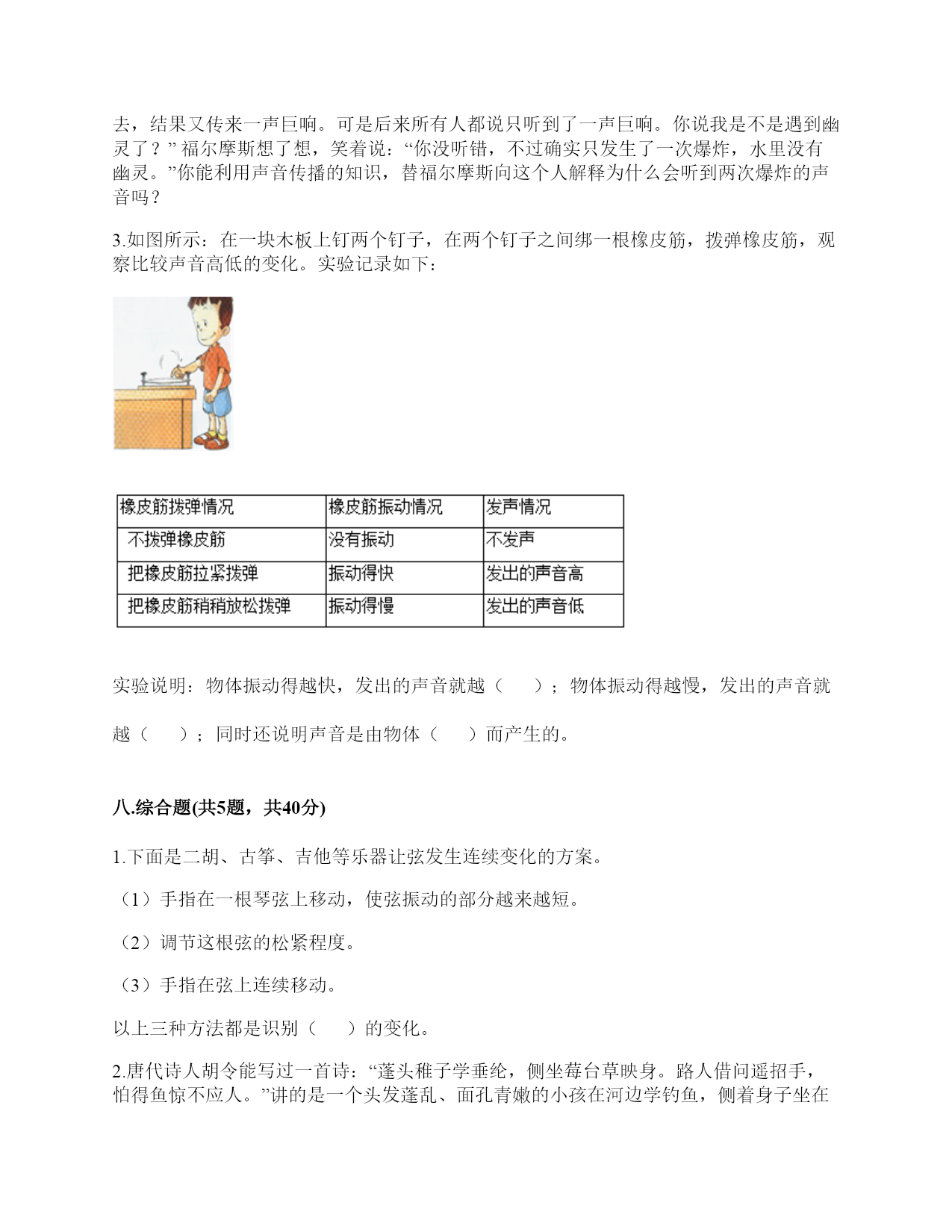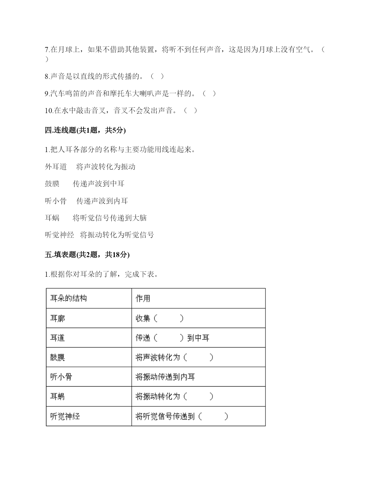 小学科学《声音》综合练习题一.选择题(共10题,共20分)1.我们读书时发出的声音是()振动而产生的。A.舌头B.嘴唇C.声带2.用棉线和纸杯制作的“土电话”,声音主要是通过()从话筒传到听筒的。A.空气B.棉线C.纸杯3.声音不能在()中传播。A.真空B.固体C.液体4.我们耳朵里的()即使是轻微的声音,它都会产生振动。A.听小骨B.鼓膜C.耳蜗5.下列关于声音说法正确的是()。A.声音可以在真空中传播B.声音可以在气体、液体和固体中向各个方向传播C.声音传播中遇到墙壁的阻挡就停止传播D.声音在水中比在空气中传播速度慢6.在我们耳朵里,时时刻刻都在接收各种声音并产生振动的结构是()。A.鼓膜B.听小骨C.听觉神经7.人体能感受振动的器官是()。A.眼B.鼻C.耳8.声音在下列哪种物质中传播是最快的()。A.空气B.水C.钢铁D.木头9.小明发现有一根琴弦声音有些低,他应该()。A.用力弹B.将这根琴弦调松一些C.将这根琴弦调紧一些10.我们把手放在耳后,并朝声音发出的方向,这是为了增强耳朵中()的作用。A.耳廓B.外耳道C.鼓膜二.填空题(共10题,共34分)1.我们通常把声音的轻重称为声音的()。2.人们说话时的声音是由()振动产生的。3.用不同的力度敲击同一个音叉,用力小时发出的声音(),用力大时发出的声音()。4.在耳朵的各个部分中,能将声音转化为振动的是()。5.()是收集声波的接收器。耳朵里的()时时刻刻都在接受着各种声音并产生振动。6.对于弦乐器,音高主要取决于弦的()、()、()、材料。7.在月球上,由于没有空气,两个人即使相隔不远,也不能互相通话,必须要使用()。8.鼓声是由()振动产生的;刮风声是由()振动产生的;人的讲话声是由()振动产生的。9.音调是由物体振动的()决定的。10.鼓声是由于鼓面的()产生的;我们听见的鼓声是通过()传播的。三.判断题(共10题,共20分)1.宇航员在月球上能够交流,依靠的是电子通信设备。()2.我们听到的声音有的强有的弱。()3.声音有高有低,声音的高低就是声音的大小。()4.下雨声属于人类生活发出的声音。()5.敲击鼓面时,鼓面振动,我们就听到了鼓声。而且,只要鼓声够大,我们在教室的任何一个位置都会听到。()6.弯曲钢尺是可以使钢尺发声的方法之一。()7.在月球上,如果不借助其他装置,将听不到任何声音,这是因为月球上没有空气。()8.声音是以直线的形式传播的。()9.汽车鸣笛的声音和摩托车大喇叭声是一样的。()10.在水中敲击音叉,音叉不会发出声音。()四.连线题(共1题,共5分)1.把人耳各部分的名称与主要功能用线连起来。外耳道将声波转化为振动鼓膜传递声波到中耳听小骨传递声波到内耳耳蜗将听觉信号传递到大脑听觉神经将振动转化为听觉信号五.填表题(共2题,共18分)1.根据你对耳朵的了解,完成下表。2.探究尺子发出声音的音高变化实验记录表。六.简答题(共5题,共27分)1.同根弦发出的声音高低变化的规律是什么?2.二胡只有两根弦,它是怎样发出高低不同、强弱不同的声音的?3.停止敲锣后,在一段时间内还能听到锣声,这是为什么?4.我们可以从哪几个方面对自制的小乐器进行评价?5.想一想,上课时坐在教室里能听到哪些声音?坐在教室里能听到的声音有?七.材料题(共3题,共19分)1.小明有3根长短相同,粗细不同的钢管,小丽说:“我可以闭上眼睛,只通过用相同的力敲击钢管就可以判断它们的粗细。”请解释其中的原理。2.某一天,有一个人找到福尔摩斯,说他碰上了幽灵。福尔摩斯觉得很好奇,就问他到底是怎么回事。乘客说:“我乘坐的客轮触礁沉没了,幸好我会游泳,才没有沉下云。就当我在水下朝求救生艇游云的时候,突然听见一声巨响,我连忙从水里出来向沉船方向看去,结果又传来一声巨响。可是后来所有人都说只听到了一声巨响。你说我是不是遇到幽灵了?”福尔摩斯想了想,笑着说:“你没听错,不过确实只发生了一次爆炸,水里没有幽灵。”你能利用声音传播的知识,替福尔摩斯向这个人解释为什么会听到两次爆炸的声音吗?3.如图所示:在一块木板上钉两个钉子,在两个钉子之间绑一根橡皮筋,拨弹橡皮筋,观察比较声音高低的变化。实验记录如下:实验说明:物体振动得越快,发出的声音就越();物体振动得越慢,发出的声音就越();同时还说明声音是由物体()而产生的。八.综合题(共5题,共40分)1.下面是二胡、古筝、吉他等乐器让弦发生连续变化的方案。(1)手指在一根琴弦上移动,使弦振动的部分越来越短。(2)调节这根弦的松紧程度。(3)手指在弦上连续移动。以上三种方法都是识别()的变化。2.唐