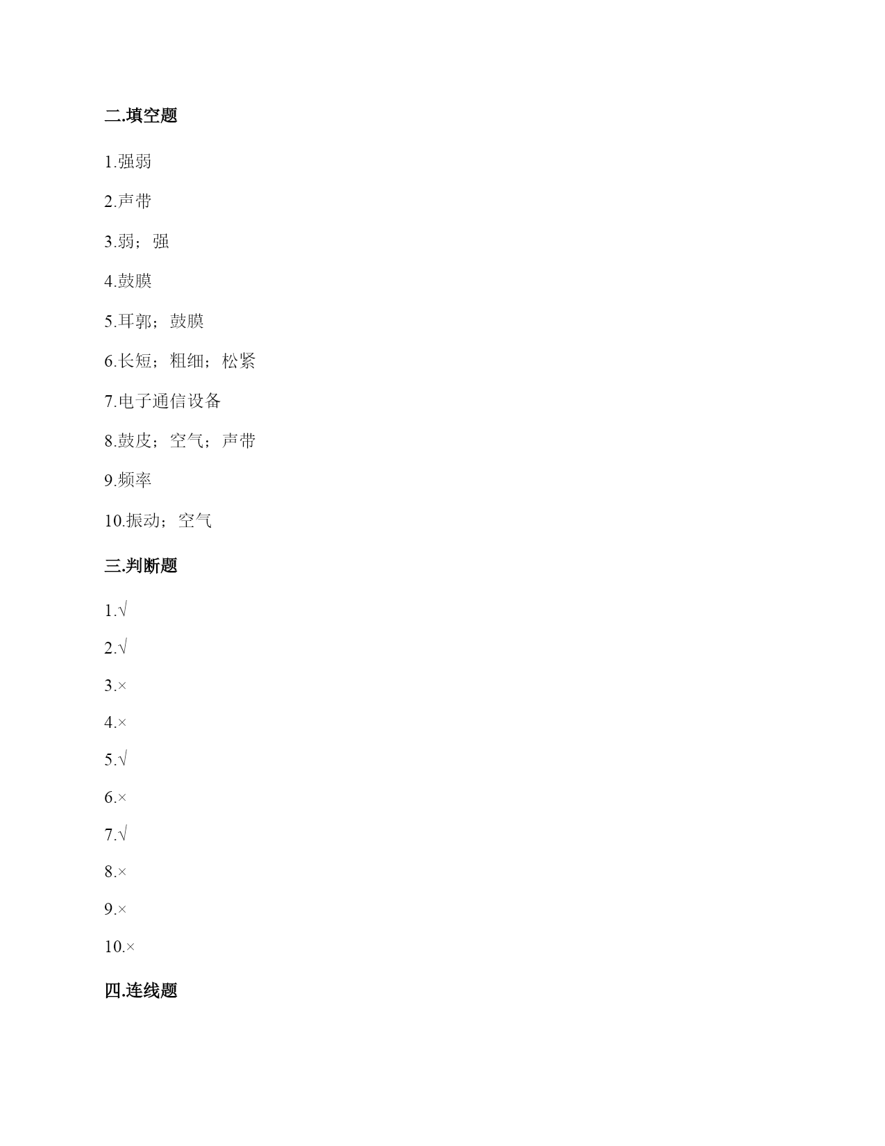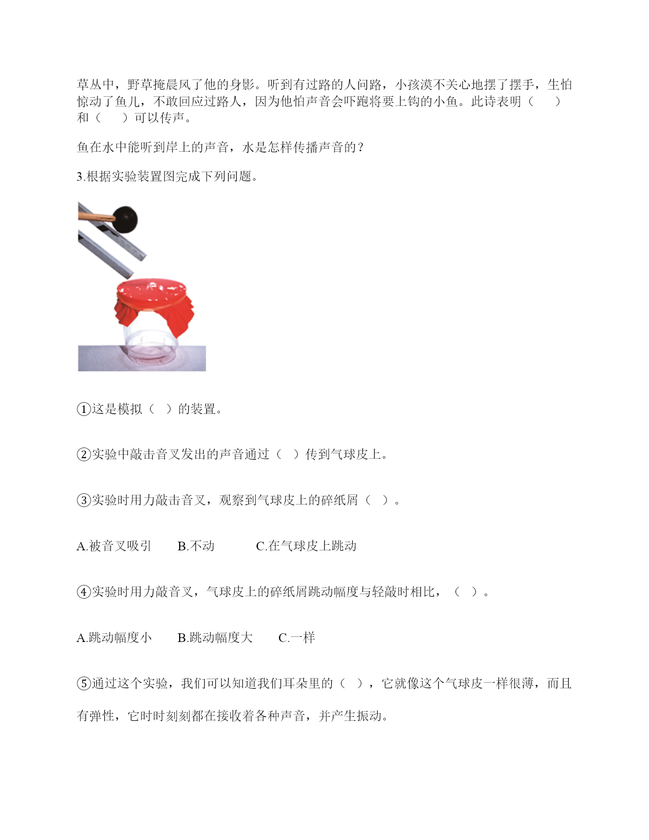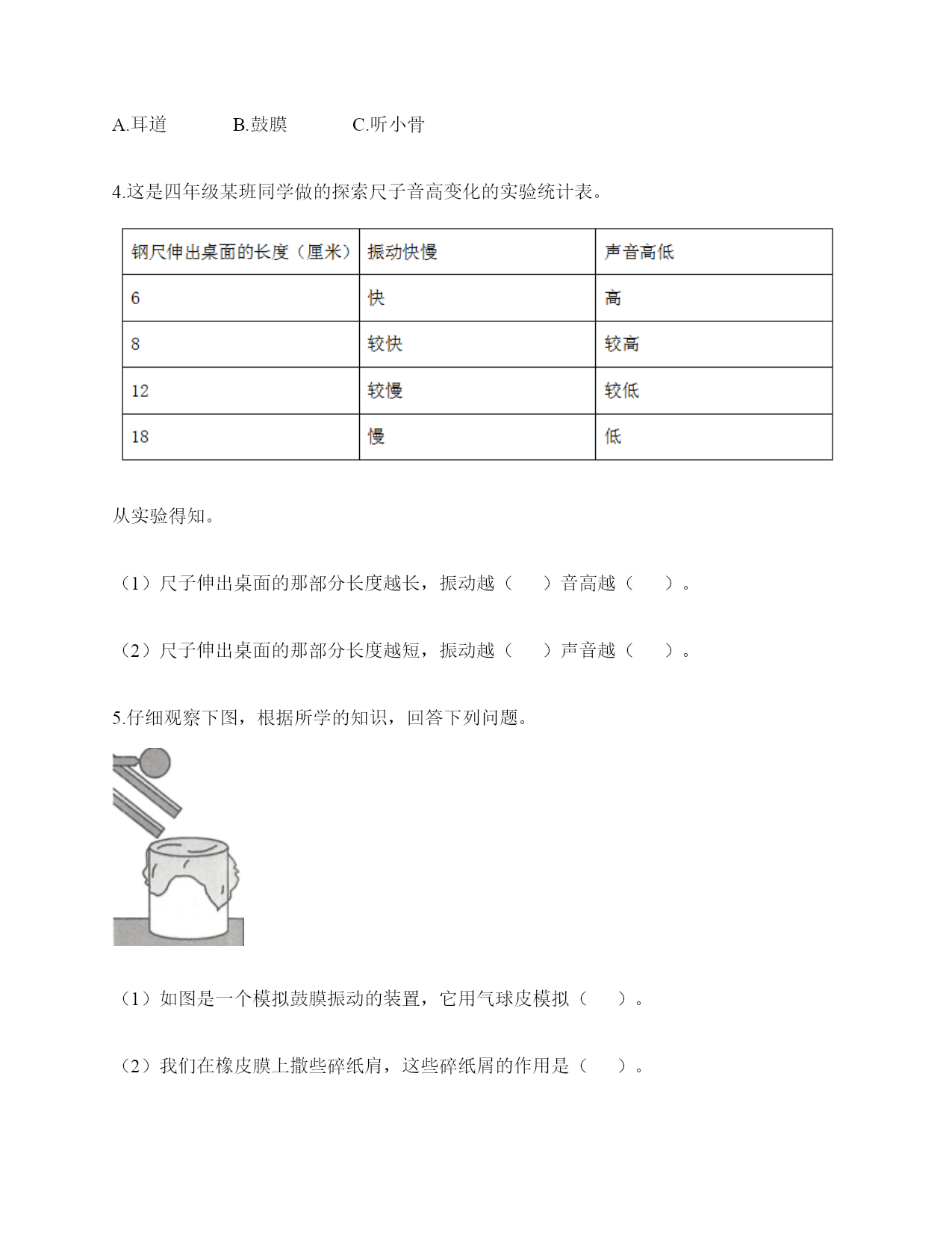 小学科学《声音》综合练习题一.选择题(共10题,共20分)1.我们读书时发出的声音是()振动而产生的。A.舌头B.嘴唇C.声带2.用棉线和纸杯制作的“土电话”,声音主要是通过()从话筒传到听筒的。A.空气B.棉线C.纸杯3.声音不能在()中传播。A.真空B.固体C.液体4.我们耳朵里的()即使是轻微的声音,它都会产生振动。A.听小骨B.鼓膜C.耳蜗5.下列关于声音说法正确的是()。A.声音可以在真空中传播B.声音可以在气体、液体和固体中向各个方向传播C.声音传播中遇到墙壁的阻挡就停止传播D.声音在水中比在空气中传播速度慢6.在我们耳朵里,时时刻刻都在接收各种声音并产生振动的结构是()。A.鼓膜B.听小骨C.听觉神经7.人体能感受振动的器官是()。A.眼B.鼻C.耳8.声音在下列哪种物质中传播是最快的()。A.空气B.水C.钢铁D.木头9.小明发现有一根琴弦声音有些低,他应该()。A.用力弹B.将这根琴弦调松一些C.将这根琴弦调紧一些10.我们把手放在耳后,并朝声音发出的方向,这是为了增强耳朵中()的作用。A.耳廓B.外耳道C.鼓膜二.填空题(共10题,共34分)1.我们通常把声音的轻重称为声音的()。2.人们说话时的声音是由()振动产生的。3.用不同的力度敲击同一个音叉,用力小时发出的声音(),用力大时发出的声音()。4.在耳朵的各个部分中,能将声音转化为振动的是()。5.()是收集声波的接收器。耳朵里的()时时刻刻都在接受着各种声音并产生振动。6.对于弦乐器,音高主要取决于弦的()、()、()、材料。7.在月球上,由于没有空气,两个人即使相隔不远,也不能互相通话,必须要使用()。8.鼓声是由()振动产生的;刮风声是由()振动产生的;人的讲话声是由()振动产生的。9.音调是由物体振动的()决定的。10.鼓声是由于鼓面的()产生的;我们听见的鼓声是通过()传播的。三.判断题(共10题,共20分)1.宇航员在月球上能够交流,依靠的是电子通信设备。()2.我们听到的声音有的强有的弱。()3.声音有高有低,声音的高低就是声音的大小。()4.下雨声属于人类生活发出的声音。()5.敲击鼓面时,鼓面振动,我们就听到了鼓声。而且,只要鼓声够大,我们在教室的任何一个位置都会听到。()6.弯曲钢尺是可以使钢尺发声的方法之一。()7.在月球上,如果不借助其他装置,将听不到任何声音,这是因为月球上没有空气。()8.声音是以直线的形式传播的。()9.汽车鸣笛的声音和摩托车大喇叭声是一样的。()10.在水中敲击音叉,音叉不会发出声音。()四.连线题(共1题,共5分)1.把人耳各部分的名称与主要功能用线连起来。外耳道将声波转化为振动鼓膜传递声波到中耳听小骨传递声波到内耳耳蜗将听觉信号传递到大脑听觉神经将振动转化为听觉信号五.填表题(共2题,共18分)1.根据你对耳朵的了解,完成下表。2.探究尺子发出声音的音高变化实验记录表。六.简答题(共5题,共27分)1.同根弦发出的声音高低变化的规律是什么?2.二胡只有两根弦,它是怎样发出高低不同、强弱不同的声音的?3.停止敲锣后,在一段时间内还能听到锣声,这是为什么?4.我们可以从哪几个方面对自制的小乐器进行评价?5.想一想,上课时坐在教室里能听到哪些声音?坐在教室里能听到的声音有?七.材料题(共3题,共19分)1.小明有3根长短相同,粗细不同的钢管,小丽说:“我可以闭上眼睛,只通过用相同的力敲击钢管就可以判断它们的粗细。”请解释其中的原理。2.某一天,有一个人找到福尔摩斯,说他碰上了幽灵。福尔摩斯觉得很好奇,就问他到底是怎么回事。乘客说:“我乘坐的客轮触礁沉没了,幸好我会游泳,才没有沉下云。就当我在水下朝求救生艇游云的时候,突然听见一声巨响,我连忙从水里出来向沉船方向看去,结果又传来一声巨响。可是后来所有人都说只听到了一声巨响。你说我是不是遇到幽灵了?”福尔摩斯想了想,笑着说:“你没听错,不过确实只发生了一次爆炸,水里没有幽灵。”你能利用声音传播的知识,替福尔摩斯向这个人解释为什么会听到两次爆炸的声音吗?3.如图所示:在一块木板上钉两个钉子,在两个钉子之间绑一根橡皮筋,拨弹橡皮筋,观察比较声音高低的变化。实验记录如下:实验说明:物体振动得越快,发出的声音就越();物体振动得越慢,发出的声音就越();同时还说明声音是由物体()而产生的。八.综合题(共5题,共40分)1.下面是二胡、古筝、吉他等乐器让弦发生连续变化的方案。(1)手指在一根琴弦上移动,使弦振动的部分越来越短。(2)调节这根弦的松紧程度。(3)手指在弦上连续移动。以上三种方法都是识别()的变化。2.唐
