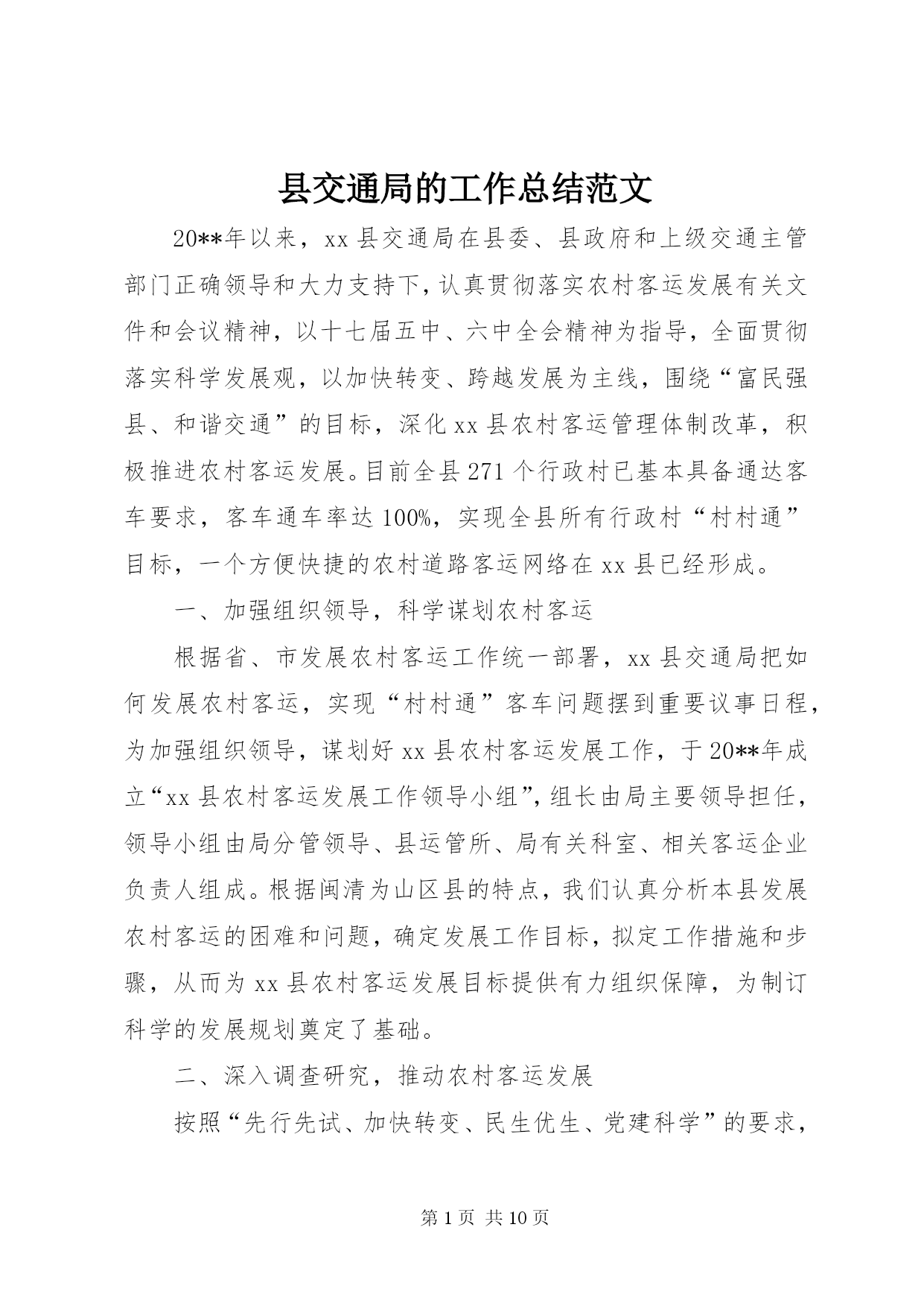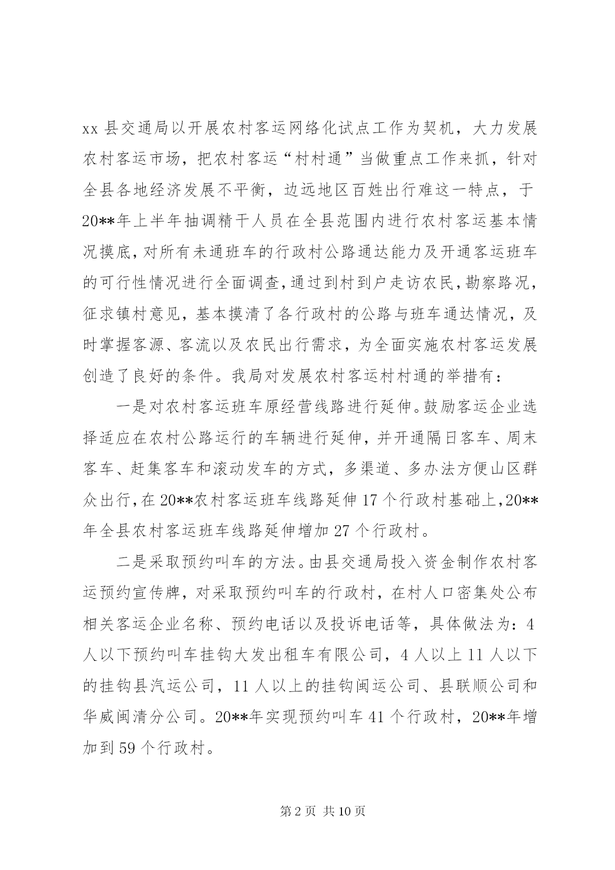 第PAGE\*Arabic\*MERGEFORMAT10页共NUMPAGES\*MERGEFORMAT10页县交通局的工作总结范文20**年以来,xx县交通局在县委、县政府和上级交通主管部门正确领导和大力支持下,认真贯彻落实农村客运发展有关文件和会议精神,以十七届五中、六中全会精神为指导,全面贯彻落实科学发展观,以加快转变、跨越发展为主线,围绕“富民强县、和谐交通”的目标,深化xx县农村客运管理体制改革,积极推进农村客运发展。目前全县271个行政村已基本具备通达客车要求,客车通车率达100%,实现全县所有行政村“村村通”目标,一个方便快捷的农村道路客运网络在xx县已经形成。一、加强组织领导,科学谋划农村客运根据省、市发展农村客运工作统一部署,xx县交通局把如何发展农村客运,实现“村村通”客车问题摆到重要议事日程,为加强组织领导,谋划好xx县农村客运发展工作,于20**年成立“xx县农村客运发展工作领导小组”,组长由局主要领导担任,领导小组由局分管领导、县运管所、局有关科室、相关客运企业负责人组成。根据闽清为山区县的特点,我们认真分析本县发展农村客运的困难和问题,确定发展工作目标,拟定工作措施和步骤,从而为xx县农村客运发展目标提供有力组织保障,为制订科学的发展规划奠定了基础。二、深入调查研究,推动农村客运发展按照“先行先试、加快转变、民生优生、党建科学”的要求,xx县交通局以开展农村客运网络化试点工作为契机,大力发展农村客运市场,把农村客运“村村通”当做重点工作来抓,针对全县各地经济发展不平衡,边远地区百姓出行难这一特点,于20**年上半年抽调精干人员在全县范围内进行农村客运基本情况摸底,对所有未通班车的行政村公路通达能力及开通客运班车的可行性情况进行全面调查,通过到村到户走访农民,勘察路况,征求镇村意见,基本摸清了各行政村的公路与班车通达情况,及时掌握客源、客流以及农民出行需求,为全面实施农村客运发展创造了良好的条件。我局对发展农村客运村村通的举措有:一是对农村客运班车原经营线路进行延伸。鼓励客运企业选择适应在农村公路运行的车辆进行延伸,并开通隔日客车、周末客车、赶集客车和滚动发车的方式,多渠道、多办法方便山区群众出行,在20**农村客运班车线路延伸17个行政村基础上,20**年全县农村客运班车线路延伸增加27个行政村。二是采取预约叫车的方法。由县交通局投入资金制作农村客运预约宣传牌,对采取预约叫车的行政村,在村人口密集处公布相关客运企业名称、预约电话以及投诉电话等,具体做法为:4人以下预约叫车挂钩大发出租车有限公司,4人以上ll人以下的挂钩县汽运公司,11人以上的挂钩闽运公司、县联顺公司和华威闽清分公司。20**年实现预约叫车41个行政村,20**年增加到59个行政村。三是实施农村道路安保工程建设。为了确保偏远山区人民群众出行安全,提高“村村通”班车安全系数,从2010年下半年开始,我局对农村道路安保工程建设高度重视,组织工程技术人员对具备开通农村客运班车的行政村道路进行逐一调查,落实施工进度,加大工程质量和安全监管。通过近两年大力实施农村道路安保工程建设,到20**年底已累计完成农村道路安保工程71条,完成建设里程309公里,完成投资达1200万元。四是新增、更新农村客运车辆。新增、更新农村客运车辆是xx市交通运输委员会今年为民办实事工程之一,我局为了更安全、更高效、更舒适地为广大农民出行服务,积极鼓励客运企业新增、更新农村客运车辆,为客运企业提供上门服务,最快捷给新增、更新客运车辆办理相关审批手续。到20**年底累计已新增、更新农村客运车辆达17辆,100%完成上级下达的任务指标。五是实施农村公路养护管理。为加强我县农村公路养护管理,经县政府批准,“xx县农村公路养护管理所”于7月份成立,同时《xx县农村公路养护管理实施细则》于9月份开始组织实施。机构建立和实施细则出台,使我县农村公路养护走上规范化、标准化道路,确保“县xx县管、乡道乡管、村道村管”的责任体系落实,使农村公路养护制度、机构、人员、经费得到保证。20**年我局已向各乡镇下拨农村公路养护资金49.75万元,使我县农村公路养护管理进一步得到改善,确保康庄工程建设成果的巩固。通过闽清交通系统上下不懈的努力,加强运输组织,采取各种行之有效的措施,在20**年实现全县251个行政村(通达率92.8%)通客运班车基础上,到20**年11月底实现全县271个行政村全部通客运班车,全面实现“村村通”计划,100%完成上级下达给我县农村客运行政村班车通达率的任务指标。针对xx县的特点,我局对发展农村客运工作深感责任重大,使命光荣。我们不断巩固和提高来之不易的成果,加大对农村公路建设改造、客运车辆投资和管理的力度,把服务群众出行做为我局今后工作的出