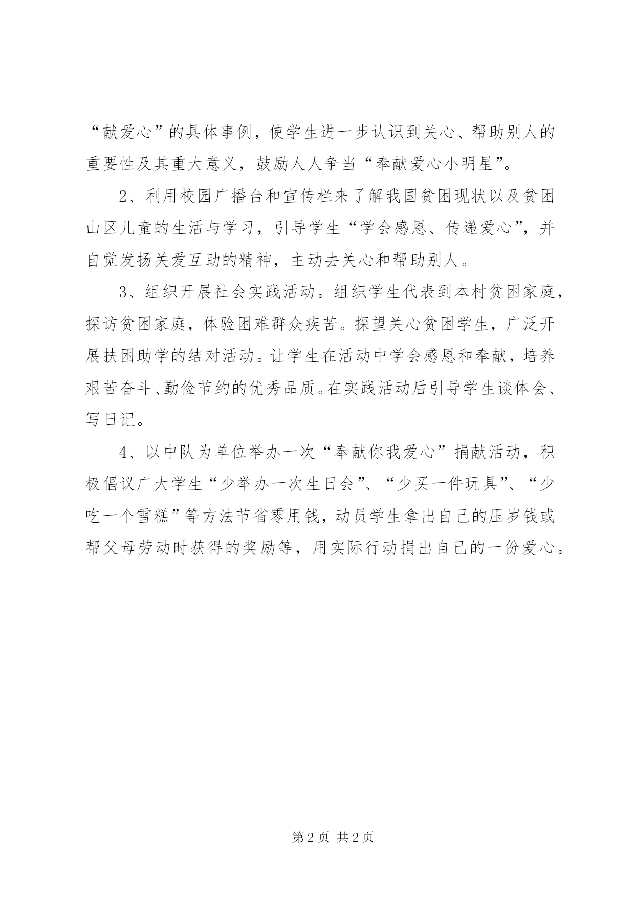 第PAGE\*Arabic\*MERGEFORMAT2页共NUMPAGES\*MERGEFORMAT2页小学扶贫日活动方案小学扶贫日活动方案10月17日是我国第三个扶贫日,,为开展好教育系统扶贫日活动,我校少先队大队部号召全体队员,开展“手拉手,爱心传递远方”少先队活动,活动以中队为单位,以不同形式开展活动。一、指导思想以邓小平理论、“三个代表”重要思想和科学发展观为指导,以促进城乡和谐协调发展、实现教育公平为目标,弘扬中华民族“扶贫济困、乐善好施”的传统美德,有效开展“扶贫济困日”和“奉献爱心扶贫助学”系列活动,为建设和谐社会作出积极贡献。二、活动目的结合社会主义核心价值观教育,加强对学生的国情教育,使学生关心贫困地区、贫困人群的发展,了解我国扶贫工作取得的成就和经验、党和政府扶贫开发方针政策,弘扬中华民族扶贫济困传统美德和友善互助核心品格,激励学生关注贫困地区、关爱贫困群众、支持扶贫工作,培育和践行社会主义核心价值观。三、活动安排1、各中队召开以“手拉手,爱心传递远方”为主题的队会活动。通过向学生介绍有关我省贫困地区的生活情况以及社会上“献爱心”的具体事例,使学生进一步认识到关心、帮助别人的重要性及其重大意义,鼓励人人争当“奉献爱心小明星”。2、利用校园广播台和宣传栏来了解我国贫困现状以及贫困山区儿童的生活与学习,引导学生“学会感恩、传递爱心”,并自觉发扬关爱互助的精神,主动去关心和帮助别人。3、组织开展社会实践活动。组织学生代表到本村贫困家庭,探访贫困家庭,体验困难群众疾苦。探望关心贫困学生,广泛开展扶困助学的结对活动。让学生在活动中学会感恩和奉献,培养艰苦奋斗、勤俭节约的优秀品质。在实践活动后引导学生谈体会、写日记。4、以中队为单位举办一次“奉献你我爱心”捐献活动,积极倡议广大学生“少举办一次生日会”、“少买一件玩具”、“少吃一个雪糕”等方法节省零用钱,动员学生拿出自己的压岁钱或帮父母劳动时获得的奖励等,用实际行动捐出自己的一份爱心。