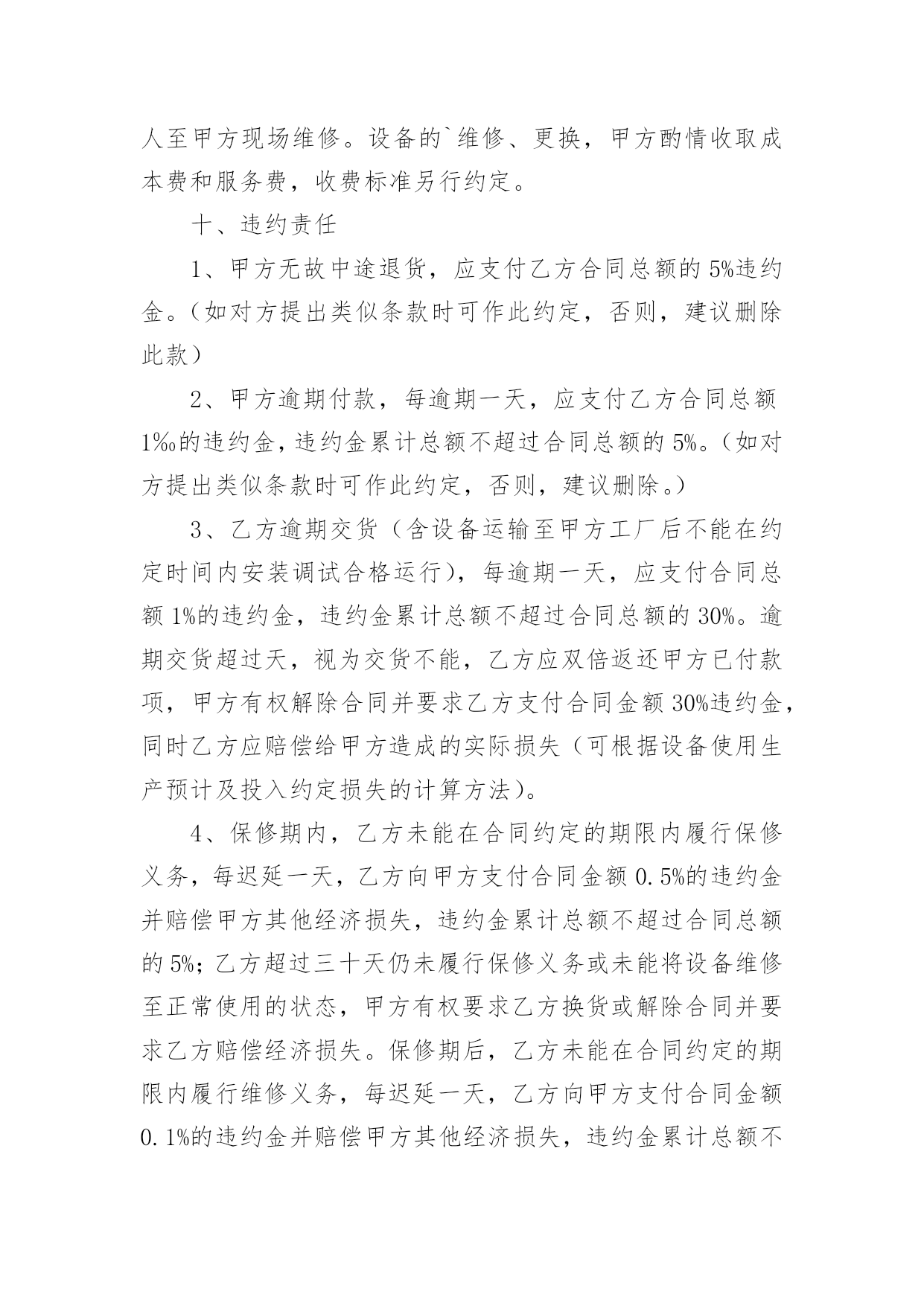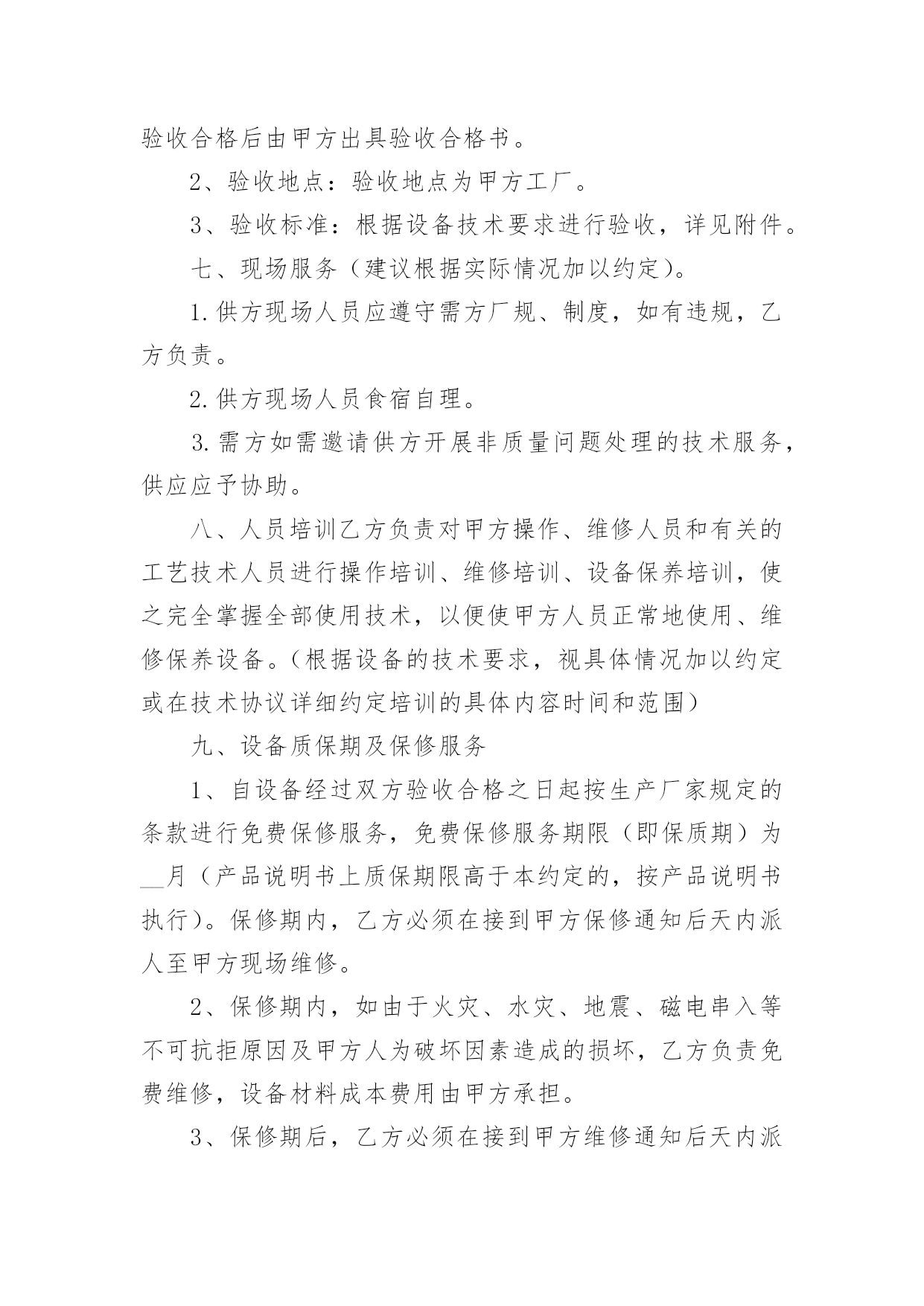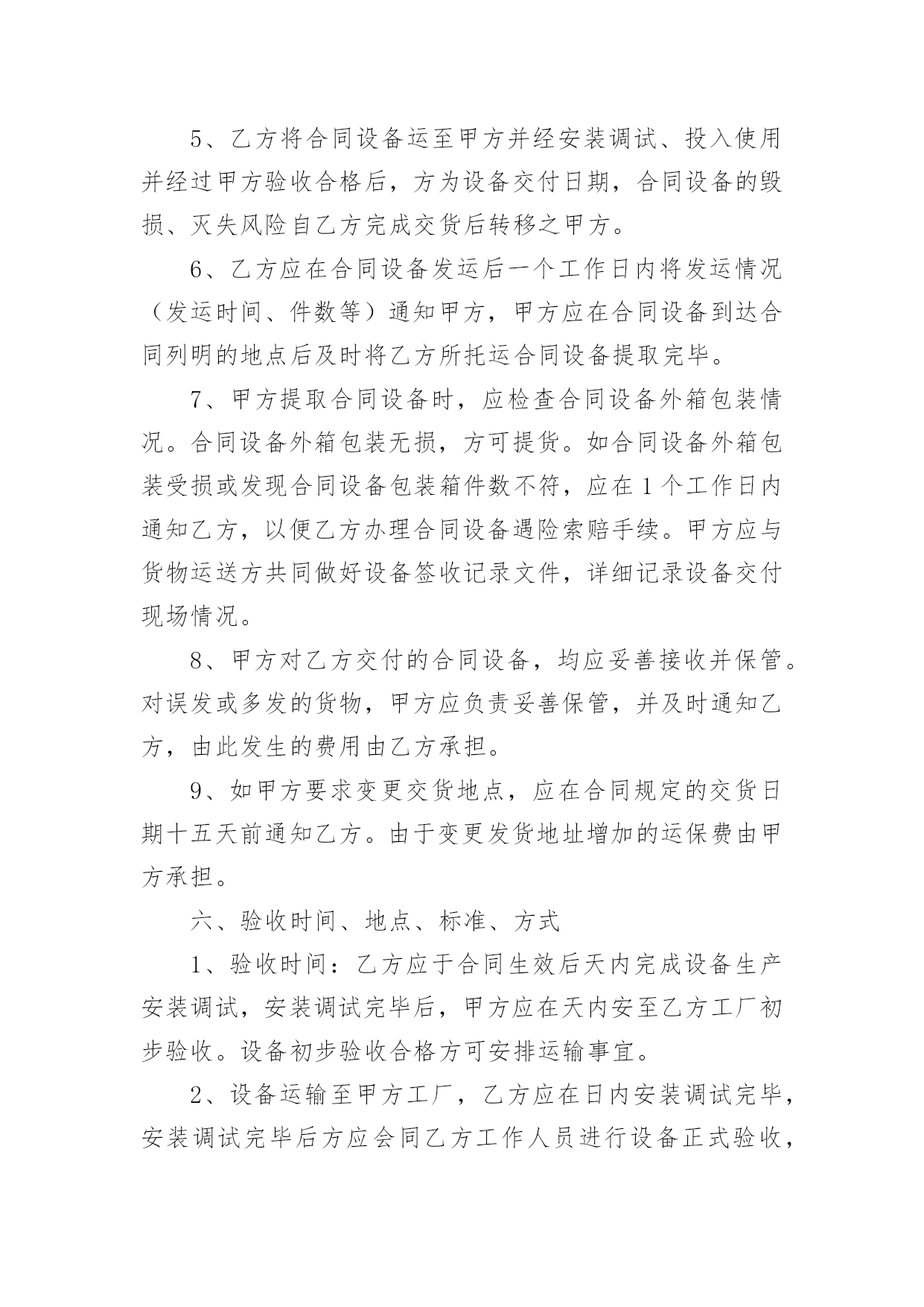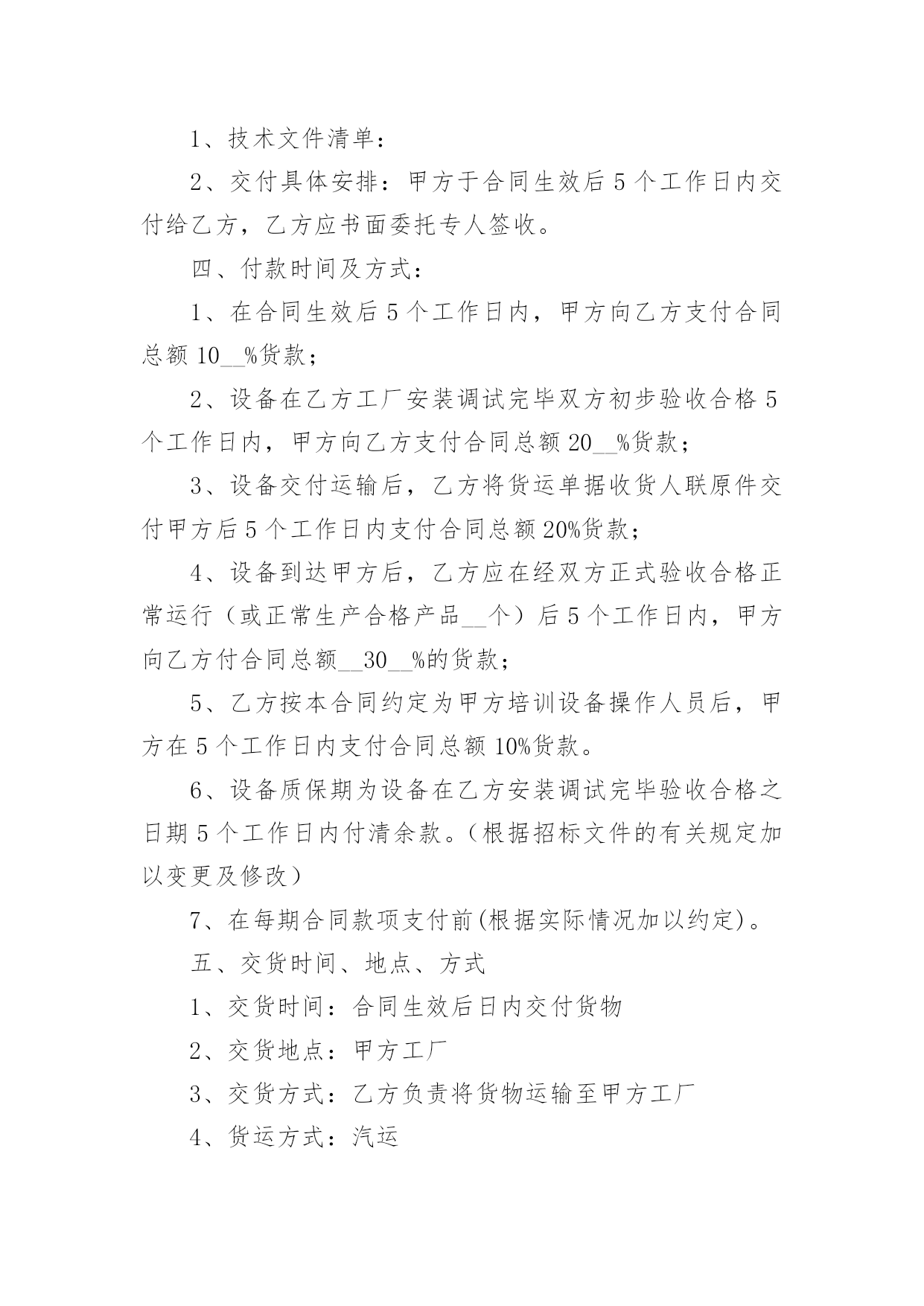 机械购销合同机械购销合同【精】在人民愈发重视法律的社会中,合同起到的作用越来越大,合同协调着人与人,人与事之间的关系。你所见过的合同是什么样的呢?下面是小编整理的机械购销合同,供大家参考借鉴,希望可以帮助到有需要的朋友。机械购销合同1购货单位:_________________(以下简称甲方)供货单位:_________________(以下简称乙方)签约地点:_________________履行地点:_____________________为增加甲乙双方的责任感,确保实现各自经济目的,依据《中华人民共和国合同法》规定及招投标文件之内容,甲乙双方经友好协商,就甲方向乙方购买达成如下协议:一、合同标的(名称、规格、型号、单价等)注:本合同单价包含税款,包装及运费,安装调试费用,人员培训费用及质保期内的服务费用。二、合同总金额:__万元,__大__写:人民币__万元整大__写:人民币__万元整三、设备技术要求文件交付:(按照技术部门具体安排填写)1、技术文件清单:2、交付具体安排:甲方于合同生效后5个工作日内交付给乙方,乙方应书面委托专人签收。四、付款时间及方式:1、在合同生效后5个工作日内,甲方向乙方支付合同总额10__%货款;2、设备在乙方工厂安装调试完毕双方初步验收合格5个工作日内,甲方向乙方支付合同总额20__%货款;3、设备交付运输后,乙方将货运单据收货人联原件交付甲方后5个工作日内支付合同总额20%货款;4、设备到达甲方后,乙方应在经双方正式验收合格正常运行(或正常生产合格产品__个)后5个工作日内,甲方向乙方付合同总额__30__%的货款;5、乙方按本合同约定为甲方培训设备操作人员后,甲方在5个工作日内支付合同总额10%货款。6、设备质保期为设备在乙方安装调试完毕验收合格之日期5个工作日内付清余款。(根据招标文件的有关规定加以变更及修改)7、在每期合同款项支付前(根据实际情况加以约定)。五、交货时间、地点、方式1、交货时间:合同生效后日内交付货物2、交货地点:甲方工厂3、交货方式:乙方负责将货物运输至甲方工厂4、货运方式:汽运5、乙方将合同设备运至甲方并经安装调试、投入使用并经过甲方验收合格后,方为设备交付日期,合同设备的毁损、灭失风险自乙方完成交货后转移之甲方。6、乙方应在合同设备发运后一个工作日内将发运情况(发运时间、件数等)通知甲方,甲方应在合同设备到达合同列明的地点后及时将乙方所托运合同设备提取完毕。7、甲方提取合同设备时,应检查合同设备外箱包装情况。合同设备外箱包装无损,方可提货。如合同设备外箱包装受损或发现合同设备包装箱件数不符,应在1个工作日内通知乙方,以便乙方办理合同设备遇险索赔手续。甲方应与货物运送方共同做好设备签收记录文件,详细记录设备交付现场情况。8、甲方对乙方交付的合同设备,均应妥善接收并保管。对误发或多发的货物,甲方应负责妥善保管,并及时通知乙方,由此发生的费用由乙方承担。9、如甲方要求变更交货地点,应在合同规定的交货日期十五天前通知乙方。由于变更发货地址增加的运保费由甲方承担。六、验收时间、地点、标准、方式1、验收时间:乙方应于合同生效后天内完成设备生产安装调试,安装调试完毕后,甲方应在天内安至乙方工厂初步验收。设备初步验收合格方可安排运输事宜。2、设备运输至甲方工厂,乙方应在日内安装调试完毕,安装调试完毕后方应会同乙方工作人员进行设备正式验收,验收合格后由甲方出具验收合格书。2、验收地点:验收地点为甲方工厂。3、验收标准:根据设备技术要求进行验收,详见附件。七、现场服务(建议根据实际情况加以约定)。1.供方现场人员应遵守需方厂规、制度,如有违规,乙方负责。2.供方现场人员食宿自理。3.需方如需邀请供方开展非质量问题处理的技术服务,供应应予协助。八、人员培训乙方负责对甲方操作、维修人员和有关的工艺技术人员进行操作培训、维修培训、设备保养培训,使之完全掌握全部使用技术,以便使甲方人员正常地使用、维修保养设备。(根据设备的技术要求,视具体情况加以约定或在技术协议详细约定培训的具体内容时间和范围)九、设备质保期及保修服务1、自设备经过双方验收合格之日起按生产厂家规定的条款进行免费保修服务,免费保修服务期限(即保质期)为__月(产品说明书上质保期限高于本约定的,按产品说明书执行)。保修期内,乙方必须在接到甲方保修通知后天内派人至甲方现场维修。2、保修期内,如由于火灾、水灾、地震、磁电串入等不可抗拒原因及甲方人为破坏因素造成的损坏,乙方负责免费维修,设备材料成本费用由甲方承担。3、保修期后,乙方必须在接到甲方维修通知后天内派人至甲方现场维修。设备的`维修、更换,甲方酌情收取成本费和服务费,收费标准另行约定。十、违约责任1、甲方无故中途退货,应支付乙方合同总额的5%违约金。(如对方提出类似条款