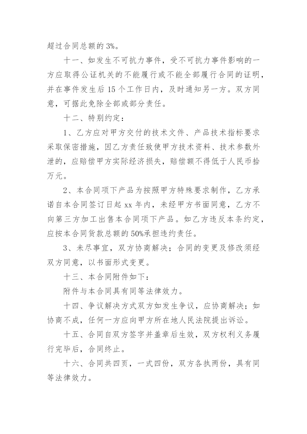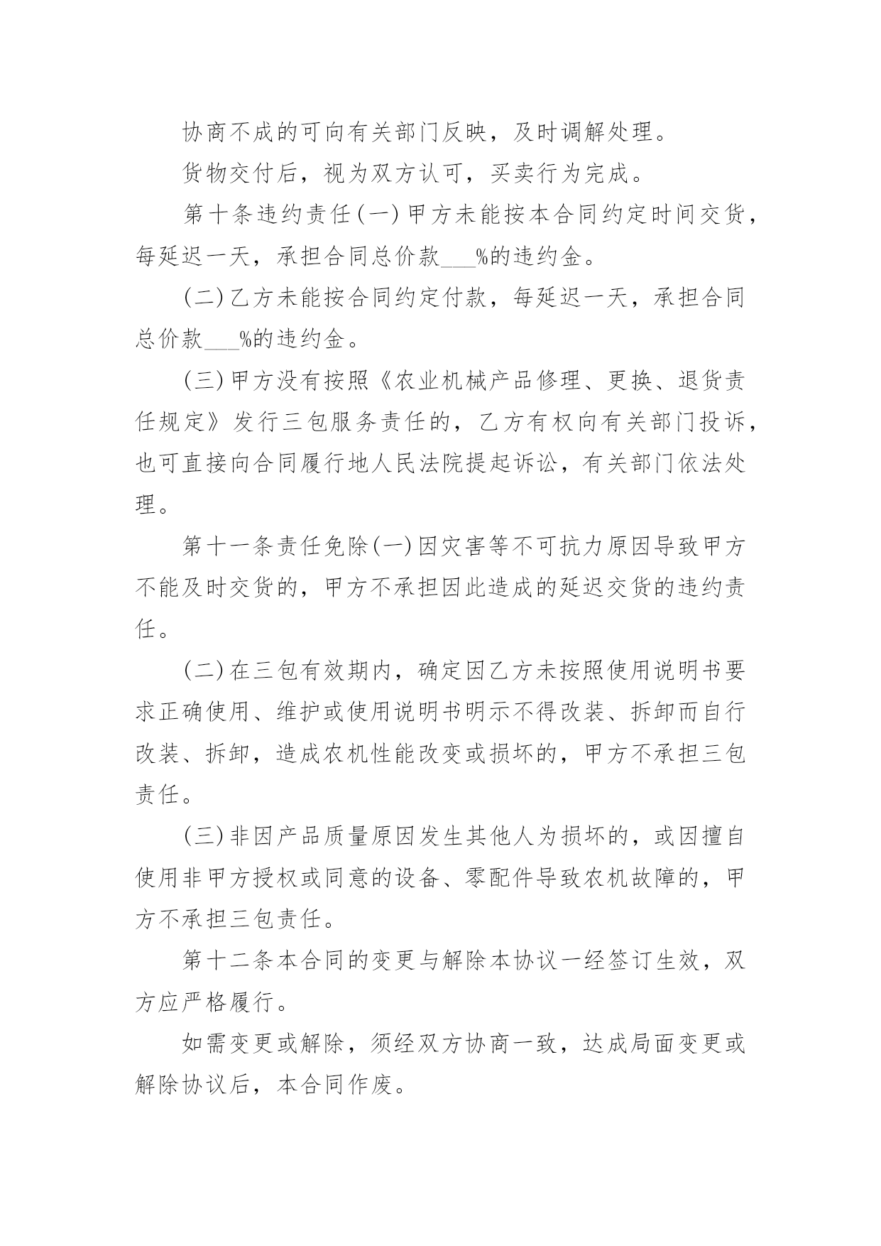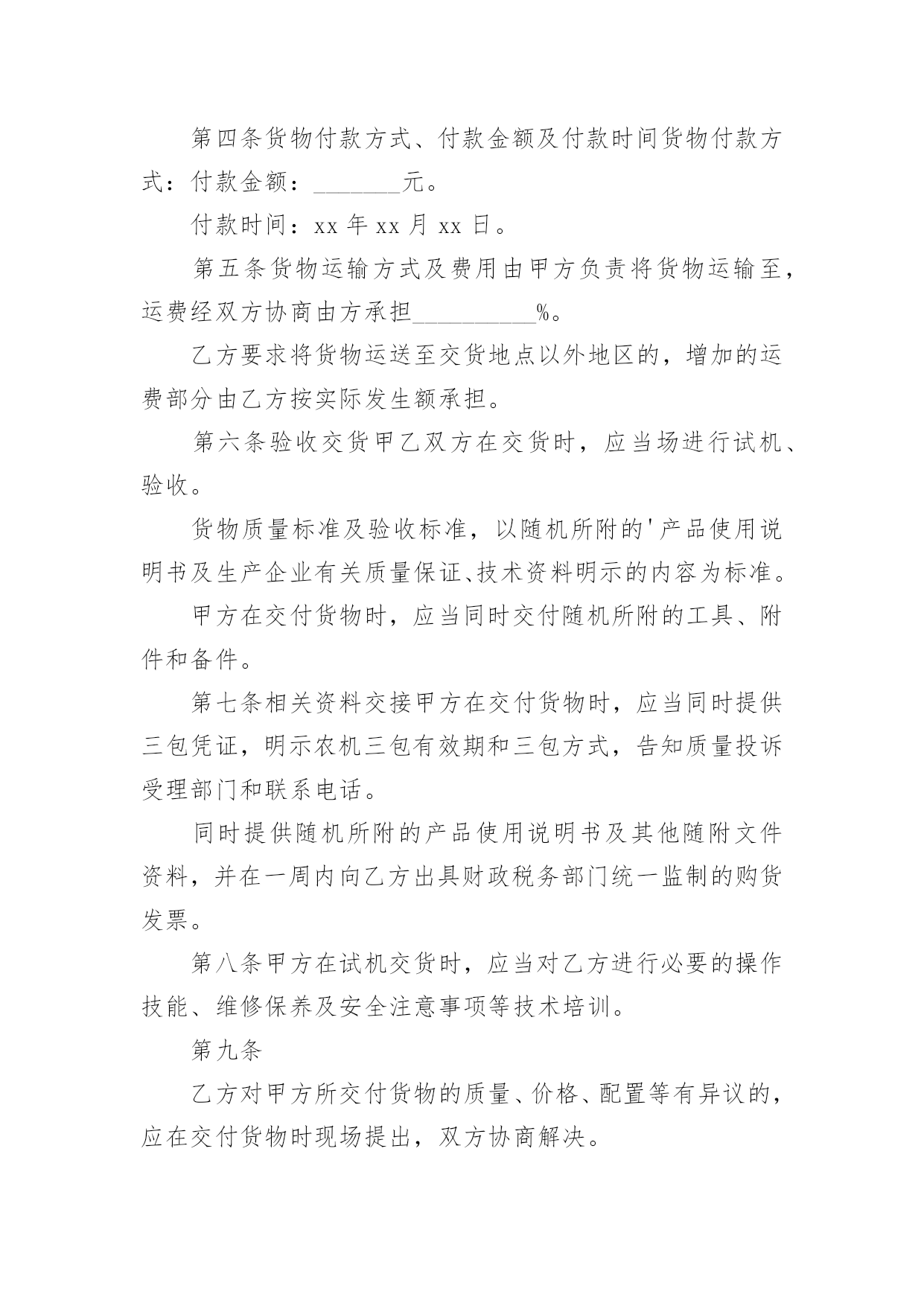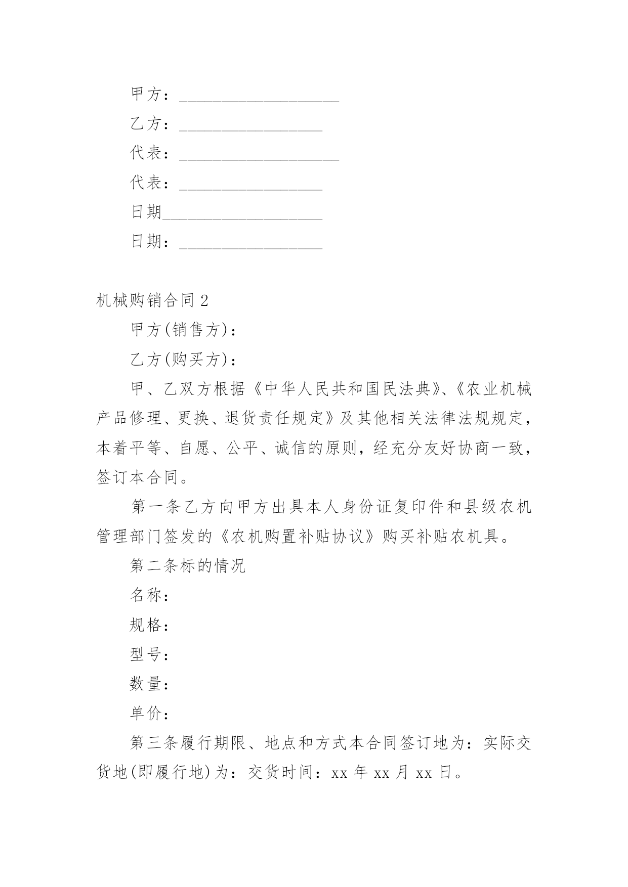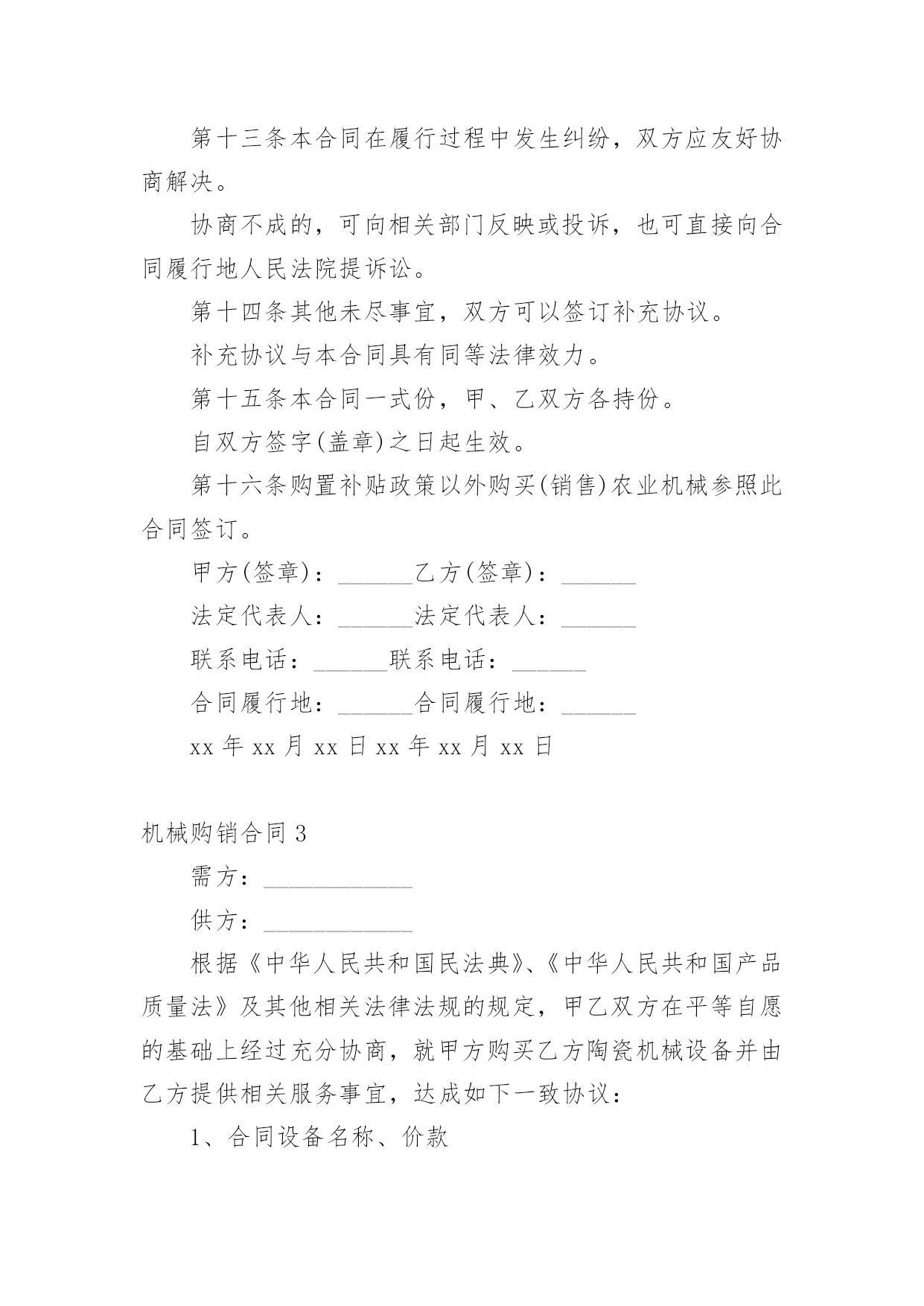 机械购销合同机械购销合同【精】在人民愈发重视法律的社会中,合同起到的作用越来越大,合同协调着人与人,人与事之间的关系。你所见过的合同是什么样的呢?下面是小编整理的机械购销合同,供大家参考借鉴,希望可以帮助到有需要的朋友。机械购销合同1购货单位:_________________(以下简称甲方)供货单位:_________________(以下简称乙方)签约地点:_________________履行地点:_____________________为增加甲乙双方的责任感,确保实现各自经济目的,依据《中华人民共和国合同法》规定及招投标文件之内容,甲乙双方经友好协商,就甲方向乙方购买达成如下协议:一、合同标的(名称、规格、型号、单价等)注:本合同单价包含税款,包装及运费,安装调试费用,人员培训费用及质保期内的服务费用。二、合同总金额:__万元,__大__写:人民币__万元整大__写:人民币__万元整三、设备技术要求文件交付:(按照技术部门具体安排填写)1、技术文件清单:2、交付具体安排:甲方于合同生效后5个工作日内交付给乙方,乙方应书面委托专人签收。四、付款时间及方式:1、在合同生效后5个工作日内,甲方向乙方支付合同总额10__%货款;2、设备在乙方工厂安装调试完毕双方初步验收合格5个工作日内,甲方向乙方支付合同总额20__%货款;3、设备交付运输后,乙方将货运单据收货人联原件交付甲方后5个工作日内支付合同总额20%货款;4、设备到达甲方后,乙方应在经双方正式验收合格正常运行(或正常生产合格产品__个)后5个工作日内,甲方向乙方付合同总额__30__%的货款;5、乙方按本合同约定为甲方培训设备操作人员后,甲方在5个工作日内支付合同总额10%货款。6、设备质保期为设备在乙方安装调试完毕验收合格之日期5个工作日内付清余款。(根据招标文件的有关规定加以变更及修改)7、在每期合同款项支付前(根据实际情况加以约定)。五、交货时间、地点、方式1、交货时间:合同生效后日内交付货物2、交货地点:甲方工厂3、交货方式:乙方负责将货物运输至甲方工厂4、货运方式:汽运5、乙方将合同设备运至甲方并经安装调试、投入使用并经过甲方验收合格后,方为设备交付日期,合同设备的毁损、灭失风险自乙方完成交货后转移之甲方。6、乙方应在合同设备发运后一个工作日内将发运情况(发运时间、件数等)通知甲方,甲方应在合同设备到达合同列明的地点后及时将乙方所托运合同设备提取完毕。7、甲方提取合同设备时,应检查合同设备外箱包装情况。合同设备外箱包装无损,方可提货。如合同设备外箱包装受损或发现合同设备包装箱件数不符,应在1个工作日内通知乙方,以便乙方办理合同设备遇险索赔手续。甲方应与货物运送方共同做好设备签收记录文件,详细记录设备交付现场情况。8、甲方对乙方交付的合同设备,均应妥善接收并保管。对误发或多发的货物,甲方应负责妥善保管,并及时通知乙方,由此发生的费用由乙方承担。9、如甲方要求变更交货地点,应在合同规定的交货日期十五天前通知乙方。由于变更发货地址增加的运保费由甲方承担。六、验收时间、地点、标准、方式1、验收时间:乙方应于合同生效后天内完成设备生产安装调试,安装调试完毕后,甲方应在天内安至乙方工厂初步验收。设备初步验收合格方可安排运输事宜。2、设备运输至甲方工厂,乙方应在日内安装调试完毕,安装调试完毕后方应会同乙方工作人员进行设备正式验收,验收合格后由甲方出具验收合格书。2、验收地点:验收地点为甲方工厂。3、验收标准:根据设备技术要求进行验收,详见附件。七、现场服务(建议根据实际情况加以约定)。1.供方现场人员应遵守需方厂规、制度,如有违规,乙方负责。2.供方现场人员食宿自理。3.需方如需邀请供方开展非质量问题处理的技术服务,供应应予协助。八、人员培训乙方负责对甲方操作、维修人员和有关的工艺技术人员进行操作培训、维修培训、设备保养培训,使之完全掌握全部使用技术,以便使甲方人员正常地使用、维修保养设备。(根据设备的技术要求,视具体情况加以约定或在技术协议详细约定培训的具体内容时间和范围)九、设备质保期及保修服务1、自设备经过双方验收合格之日起按生产厂家规定的条款进行免费保修服务,免费保修服务期限(即保质期)为__月(产品说明书上质保期限高于本约定的,按产品说明书执行)。保修期内,乙方必须在接到甲方保修通知后天内派人至甲方现场维修。2、保修期内,如由于火灾、水灾、地震、磁电串入等不可抗拒原因及甲方人为破坏因素造成的损坏,乙方负责免费维修,设备材料成本费用由甲方承担。3、保修期后,乙方必须在接到甲方维修通知后天内派人至甲方现场维修。设备的`维修、更换,甲方酌情收取成本费和服务费,收费标准另行约定。十、违约责任1、甲方无故中途退货,应支付乙方合同总额的5%违约金。(如对方提出类似条款