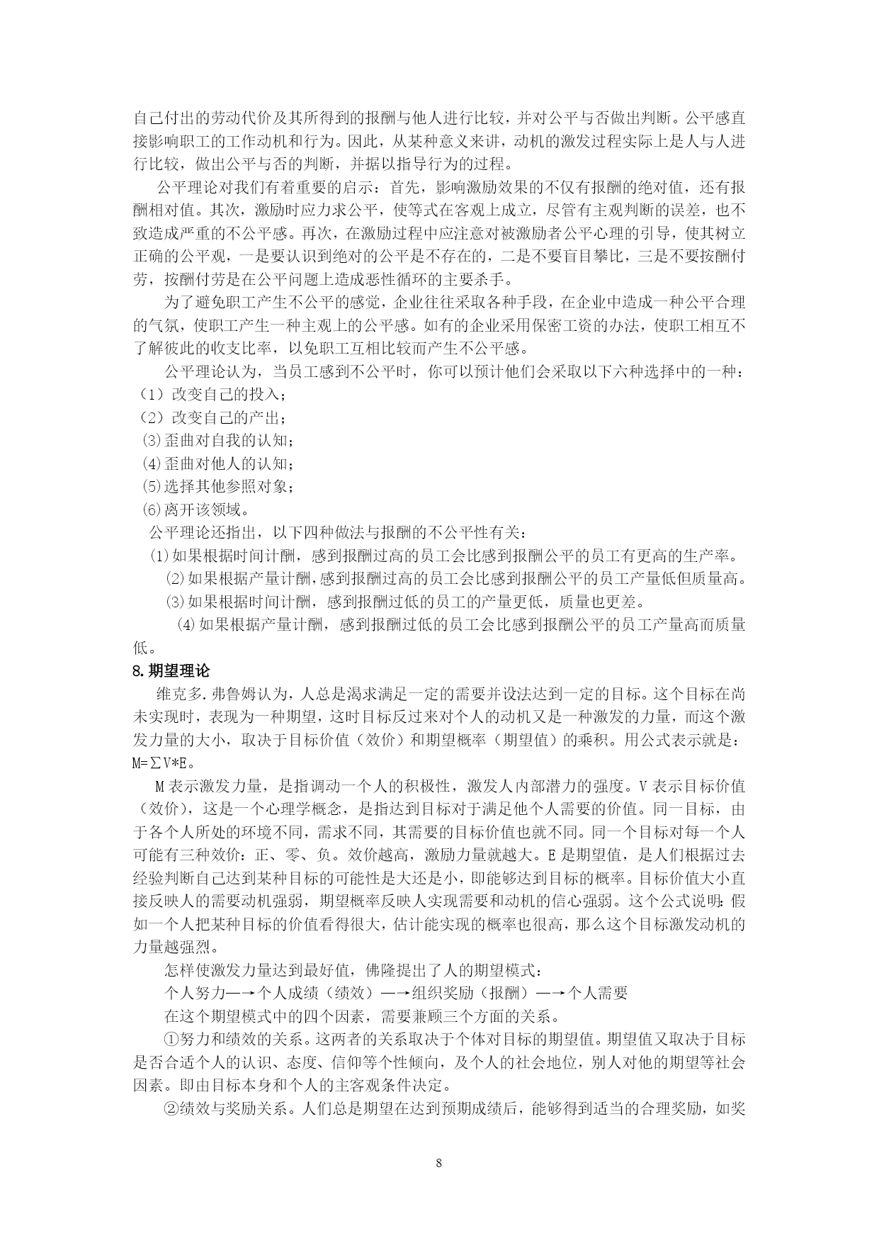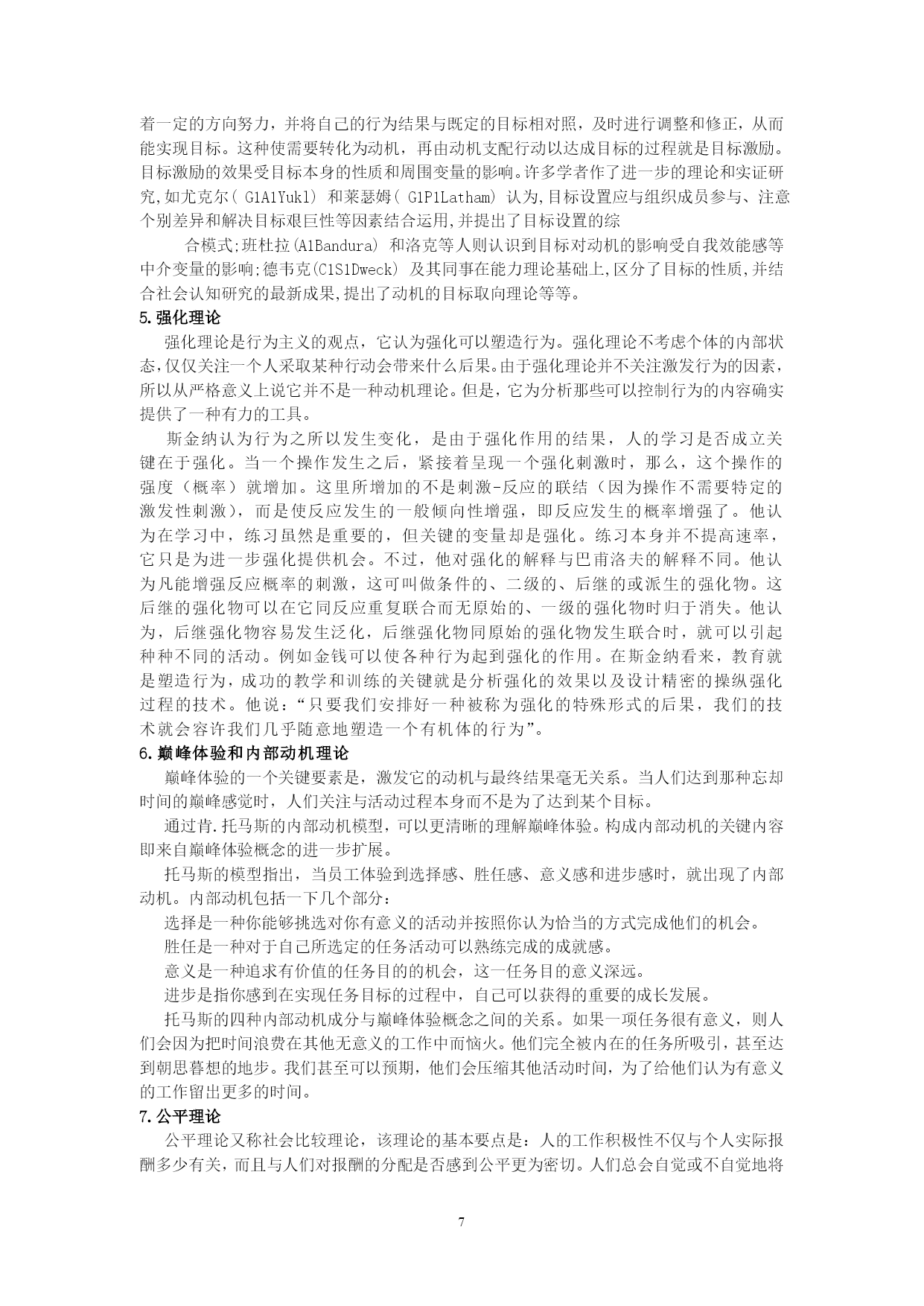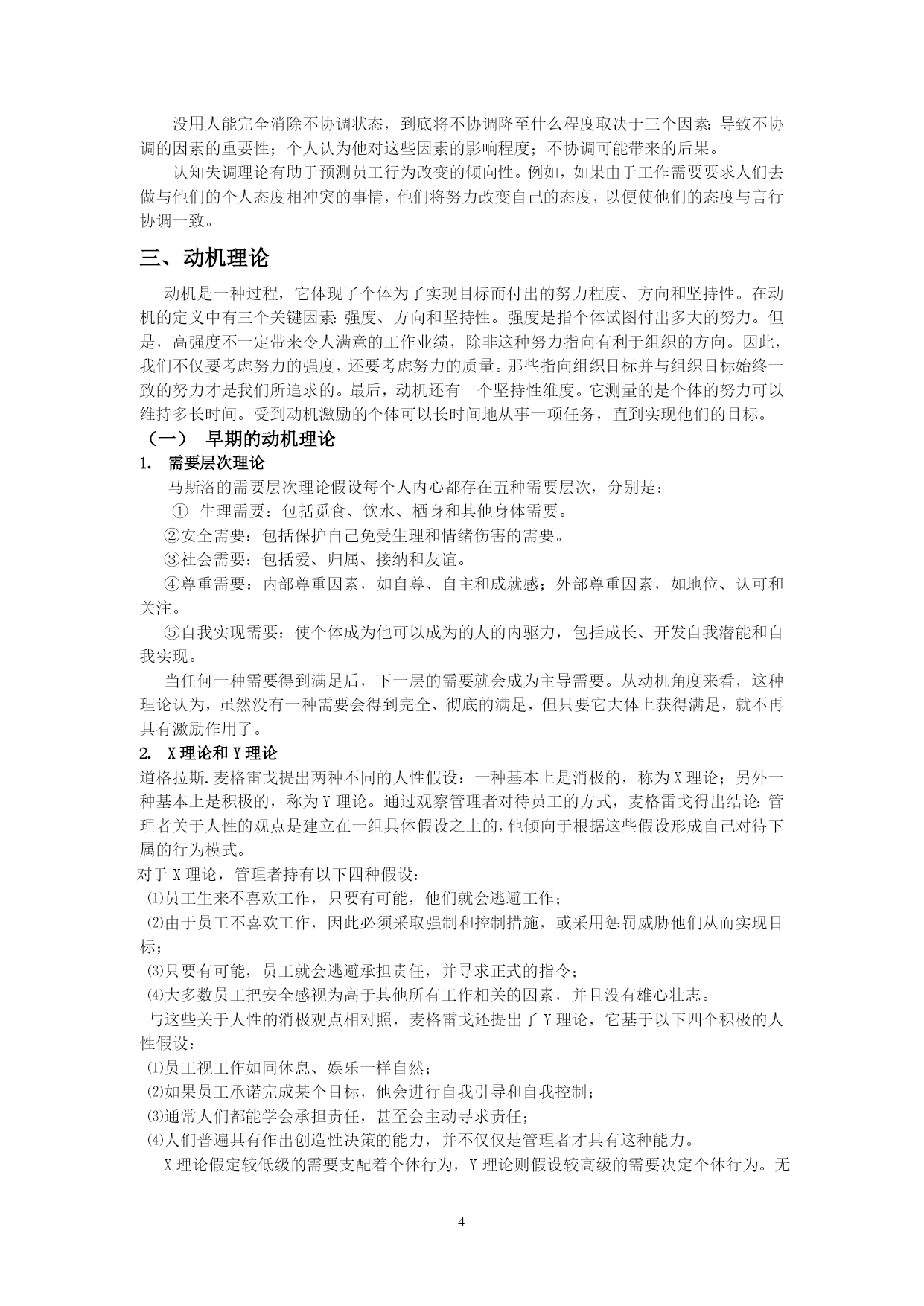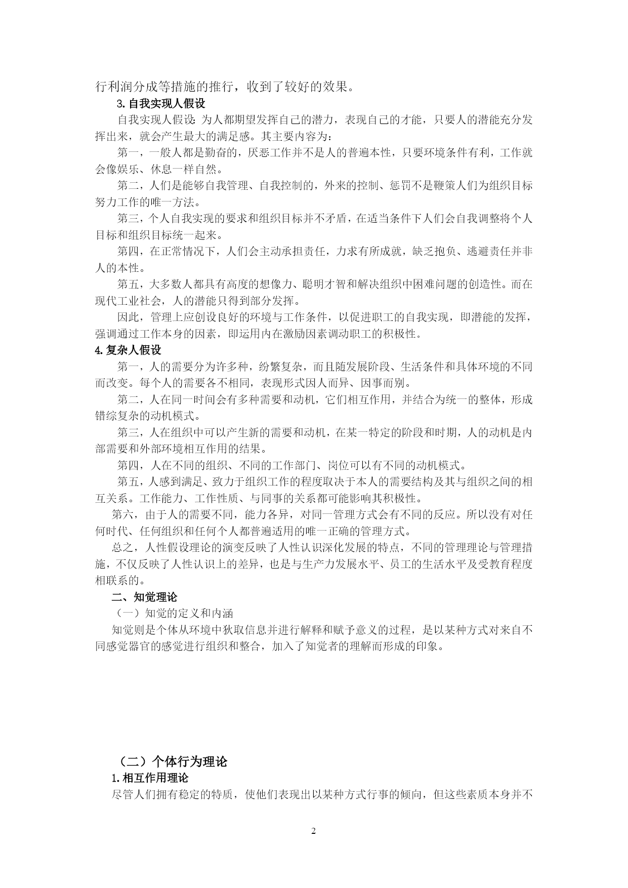 组织行为学理论综述摘要:关键词:一、个体心理与行为理论(一)人性假设理论1.“经济人”假设经济人假设内容:人在本质是是追求经济利益和物质利益的,因此,要调动工人的积极性,大幅度的提高工资是必要的。“经济人”的假设起源于享乐主义,认为人的行为就是为了获得最大的经济利益,工作的目的是为了得到经济报酬。它的主要内容包括一下几个方面:第一、一般人生性懒惰,尽可能地少做工作第二、人们缺乏雄心壮志,不愿承担责任,宁愿被人领导第三、人们天生就以自我为中心,对组织的需要漠不关心第四、人们的本性是反对变革第五、大多数人为满足基本生理需要和安全需要,将选择那些经济上获利最大的事情去做。第六、人群大致分为两类,多数人符合上述假设;少数人能克制自己,这些人应负起管理的责任。具有这种人性假设的管理者试图通过外力的刺激来提高员工的工作热情,他们着重于通过满足人们的低层次需要来激励员工,而置自尊、自我实现等高层次需要于罔顾。2.社会人假设“社会人”假设是梅奥等人依据霍桑试验的结果提出来的。这一假设认为,人们最重视的是工作中与周围人的友好相处,物质利益是相对次要的因素。其基本内容包括以下几个方面:第一、交往需要是人们行为的主要动机,是人与人之间形成认同感的主要因素。第二、工业革命以来,专业化分工和机械化使劳动失去了内在的乐趣而趋于单调,因此必须从工作的社会意义上寻找安慰。第三、非正式组织通过人际关系所形成的影响力,比正式组织的管理措施和奖励对人具有更大的影响。第四、组织领导者应当满足职工归属、交往和友谊的需要,工作效率会随着职工社会需要的满足程度而提高。这一理论对西方的组织管理方式有很大影响,诸如建立劳资联合委员会、实行利润分成等措施的推行,收到了较好的效果。3.自我实现人假设自我实现人假设:为人都期望发挥自己的潜力,表现自己的才能,只要人的潜能充分发挥出来,就会产生最大的满足感。其主要内容为:第一,一般人都是勤奋的,厌恶工作并不是人的普遍本性,只要环境条件有利,工作就会像娱乐、休息一样自然。第二,人们是能够自我管理、自我控制的,外来的控制、惩罚不是鞭策人们为组织目标努力工作的唯一方法。第三,个人自我实现的要求和组织目标并不矛盾,在适当条件下人们会自我调整将个人目标和组织目标统一起来。第四,在正常情况下,人们会主动承担责任,力求有所成就,缺乏抱负、逃避责任并非人的本性。第五,大多数人都具有高度的想像力、聪明才智和解决组织中困难问题的创造性。而在现代工业社会,人的潜能只得到部分发挥。因此,管理上应创设良好的环境与工作条件,以促进职工的自我实现,即潜能的发挥,强调通过工作本身的因素,即运用内在激励因素调动职工的积极性。4.复杂人假设第一,人的需要分为许多种,纷繁复杂,而且随发展阶段、生活条件和具体环境的不同而改变。每个人的需要各不相同,表现形式因人而异、因事而别。第二,人在同一时间会有多种需要和动机,它们相互作用,并结合为统一的整体,形成错综复杂的动机模式。第三,人在组织中可以产生新的需要和动机,在某一特定的阶段和时期,人的动机是内部需要和外部环境相互作用的结果。第四,人在不同的组织、不同的工作部门、岗位可以有不同的动机模式。第五,人感到满足、致力于组织工作的程度取决于本人的需要结构及其与组织之间的相互关系。工作能力、工作性质、与同事的关系都可能影响其积极性。第六,由于人的需要不同,能力各异,对同一管理方式会有不同的反应。所以没有对任何时代、任何组织和任何个人都普遍适用的唯一正确的管理方式。总之,人性假设理论的演变反映了人性认识深化发展的特点,不同的管理理论与管理措施,不仅反映了人性认识上的差异,也是与生产力发展水平、员工的生活水平及受教育程度相联系的。二、知觉理论(一)知觉的定义和内涵知觉则是个体从环境中狄取信息并进行解释和赋予意义的过程,是以某种方式对来自不同感觉器官的感觉进行组织和整合,加入了知觉者的理解而形成的印象。(二)个体行为理论1.相互作用理论尽管人们拥有稳定的特质,使他们表现出以某种方式行事的倾向,但这些素质本身并不能完全决定某个人在某种特定环境下如何行为。环境还带来一个人可能会如何行为的影响要素。个人因素和环境因素两者在一起影响行为。换句话说,行为通常是个人所拥有的特征(他的知识、能力、技能和人格)和这个人身处其中的环境的性质两者的共同结果。这个观点被成为“相互作用理论”。2.凯利的因果性归因理论社会科学家感兴趣的关键问题是:人们如何判断某些人的行为究竟是内部原因还是外部原因引起的?凯利的因果性归因理论提出了对这个问题的回答。根据这个概念,我们对内部还是对外部原因的判断取决于三种信息。它们是:第一,一致性。其他人以我们所判断的那个人同