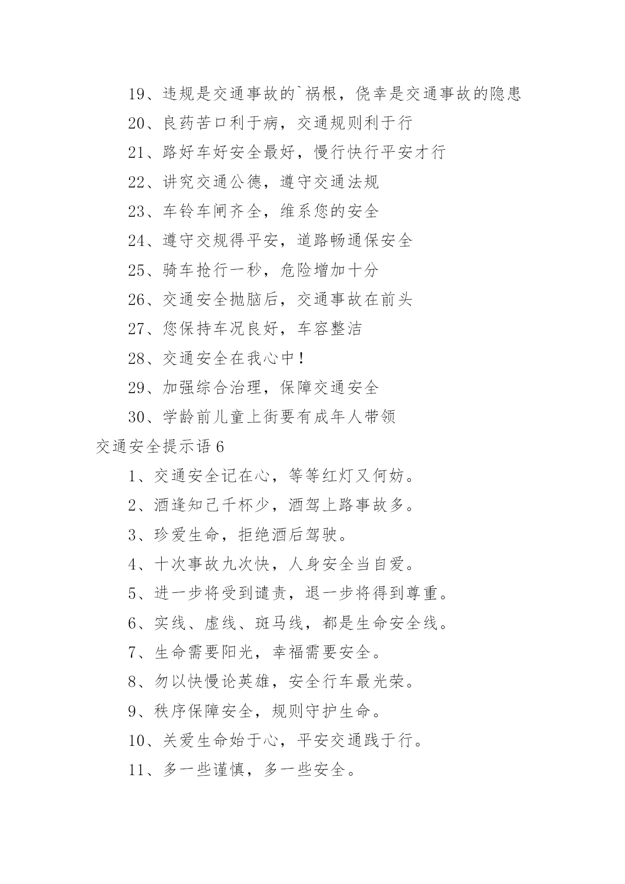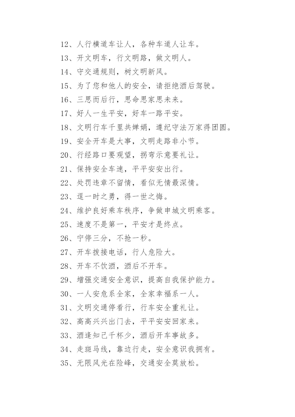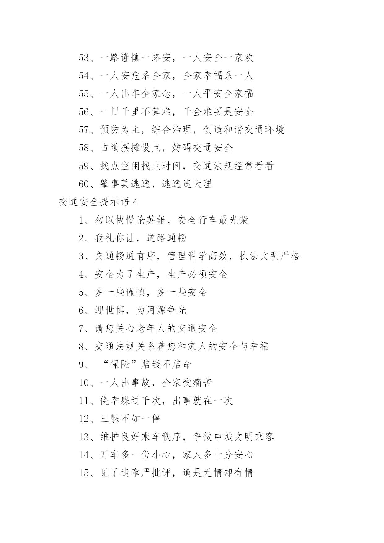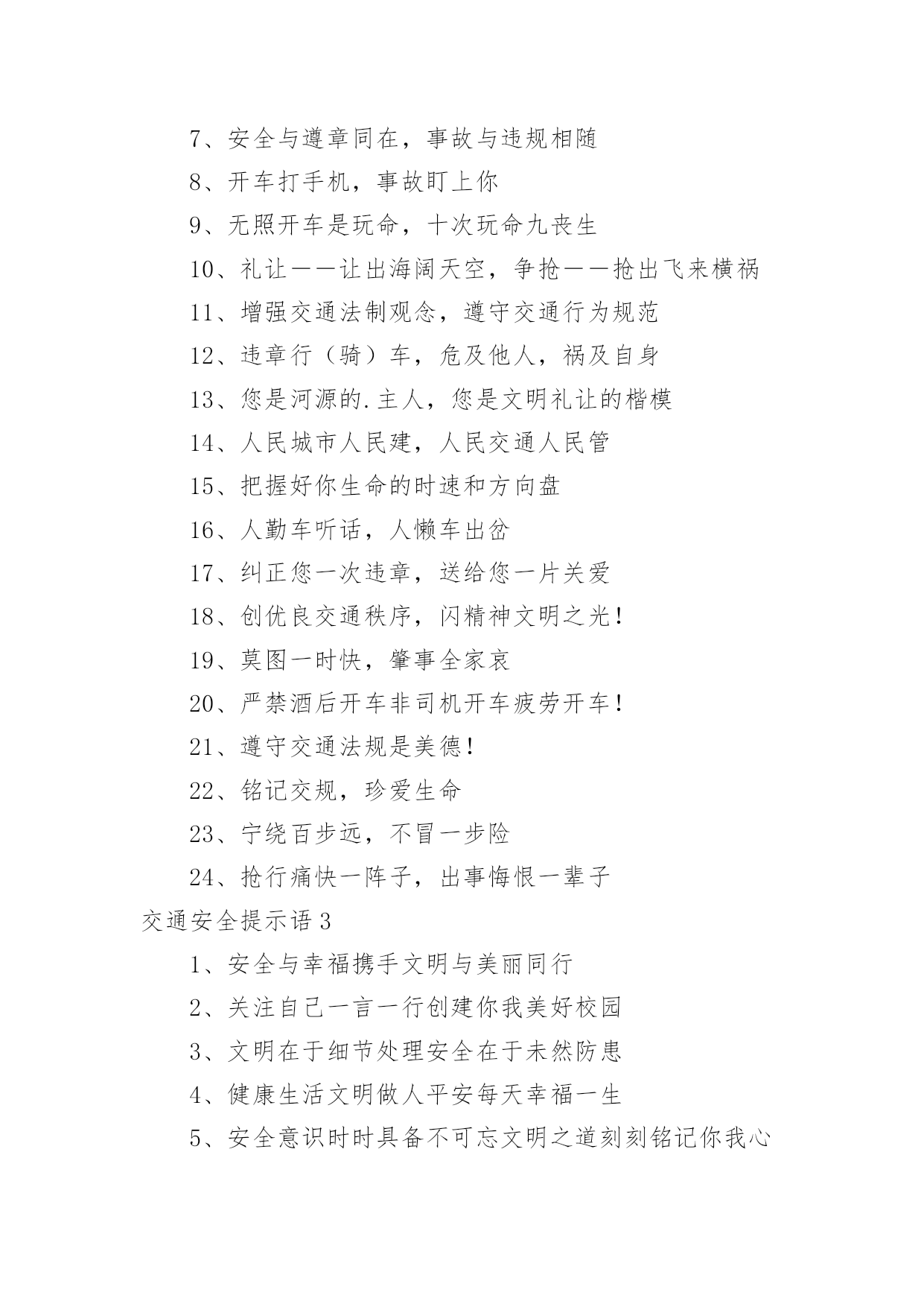 交通安全提示语交通安全提示语【范例11篇】在学习、工作、生活中,大家都有令自己印象深刻的提示语吧,提示语有节奏有韵律,读来朗朗上口,听来和谐悦耳,给人以美感,也便于记忆。还苦于找不到好的提示语?以下是小编整理的交通安全提示语,希望对大家有所帮助。交通安全提示语11、不追不跑不打闹,平平安安到学校。2、常念安全“紧箍咒”,牢记规章“护身符”。3、车好人好道路好,更需你来照章跑。4、车来人往两相让,山重水复一片天。5、车辆抛锚莫大意,处置措施要得体。标志码放应到位,开启“双闪”不忘记。路边修车不可能,驾乘人员速撤离。6、出门在外,自珍自爱;人在旅途,平安是福。7、带十分小心上路,携一份平安回家。8、带着安全意识上路,载着幸福感觉回家。9、道路因文明行驶而畅通,生活因出入平安而幸福。10、电话无线,生命有限;驾车通话,危害极大。11、风景在行车的路上,最美是你我的礼让!12、给他人让路,为自己着想。13、交通法规要知晓,出行常伴吉祥鸟!14、交通规则记得牢,一路平安大家好。15、井然有序谋求和谐交通,车水马龙共创平安大道。16、聚聚散散都是欢声笑语,来来往往总有平安吉祥。17、开车路上马大哈,随时随地把命搭。18、开车心头毋通赶,免得吃快弄破碗。19、路路无“违”,天天平安。20、麻痹,安全的天敌;谨慎,事故的'克星。21、没路的时候盼有路,有路的时候盼有车,路也有了车也好了咱盼什么呢?盼文明平安、盼和谐幸福!22、没有比生命更宝贵的财富,没有比安全更重要的幸福。23、你不争我不争,交通事故不发生。24、心中装有红绿灯,神州大地任你行。25、行车一走神,事故敲你门。26、行车在外亲人念,平安归来合家欢。27、赠人玫瑰,手留余香,予人礼让,一生平安。交通安全提示语21、人行横道是生命的绿色通道2、警惕保安全,麻痹起祸端3、人人守法规,方便你我他4、交通法规要遵守,安全警钟需常鸣5、为了您和他人的幸福,请自觉遵守交通法规6、一身安危系全家,全家幸福系一人7、安全与遵章同在,事故与违规相随8、开车打手机,事故盯上你9、无照开车是玩命,十次玩命九丧生10、礼让――让出海阔天空,争抢――抢出飞来横祸11、增强交通法制观念,遵守交通行为规范12、违章行(骑)车,危及他人,祸及自身13、您是河源的.主人,您是文明礼让的楷模14、人民城市人民建,人民交通人民管15、把握好你生命的时速和方向盘16、人勤车听话,人懒车出岔17、纠正您一次违章,送给您一片关爱18、创优良交通秩序,闪精神文明之光!19、莫图一时快,肇事全家哀20、严禁酒后开车非司机开车疲劳开车!21、遵守交通法规是美德!22、铭记交规,珍爱生命23、宁绕百步远,不冒一步险24、抢行痛快一阵子,出事悔恨一辈子交通安全提示语31、安全与幸福携手文明与美丽同行2、关注自己一言一行创建你我美好校园3、文明在于细节处理安全在于未然防患4、健康生活文明做人平安每天幸福一生5、安全意识时时具备不可忘文明之道刻刻铭记你我心6、树文明新风立安全意识做健康大使展真我风采7、让健康与我们相随让安全与我们相伴让文明与我们相拥8、安全——唱响生命之歌文明——点燃心灵之窗9、安全是人类共同的向往、安全是快乐生活的根本10、人生美好步步小心11、路无规不畅国无法不宁12、一秒钟车祸一辈子痛苦13、心无交规路有坎坷14、遵守交通法规关爱生命旅程15、出了车祸速报警救死扶伤见真情16、心头常亮红绿灯安全行驶伴人生17、生命只有一次平安伴君一生18、礼让三先路畅民安19、宁绕百步远不抢一步险20、千里之行慎于足下21、安全来自长期警惕,事故源于瞬间麻痹22、多看一眼,安全保险;多防一步,少出事故23、工作为了生活好,安全为了活到老24、生命只有一次,安全伴君一生25、关爱生命创建和谐校园珍爱生命创建平安校园26、严是爱、松是害,出了事故坑后代27、实线、虚线、斑马线,都是生命安全线28、横穿马路:一看、二等、三通过29、祸起瞬间防患未然30、安全在你脚下生命在你手中31、珍爱生命,安全出行32、一人安危系全家,全家幸福系一人33、安全是父母的寄托,安全是儿女的'心愿34、交通安全时时不忘,幸福生活天天拥有35、学校门前莫开快,司机献出一点爱36、守交通规则,树文明新风37、礼让是美德,安全是幸福38、道路通行见形象,红绿灯前看修养39、文明交通从小做起从我做起40、跨入校园,好好学习;走出校门,好好走路41、孩童路边走,成人要牵手42、遵守交通信号安全文明出行43、遵守交通规则让生活更美好44、同行十年平安路,再筑生命防护线45、推行道路交通安全诚信体系建设46、维护道路交通秩序,预防和减少交通事故47、心头常亮红绿灯,安全行驶伴人生48、心中交规严,眼前路自宽49、严是爱,松是害,发生事故祸三代50、要想效益好,安全