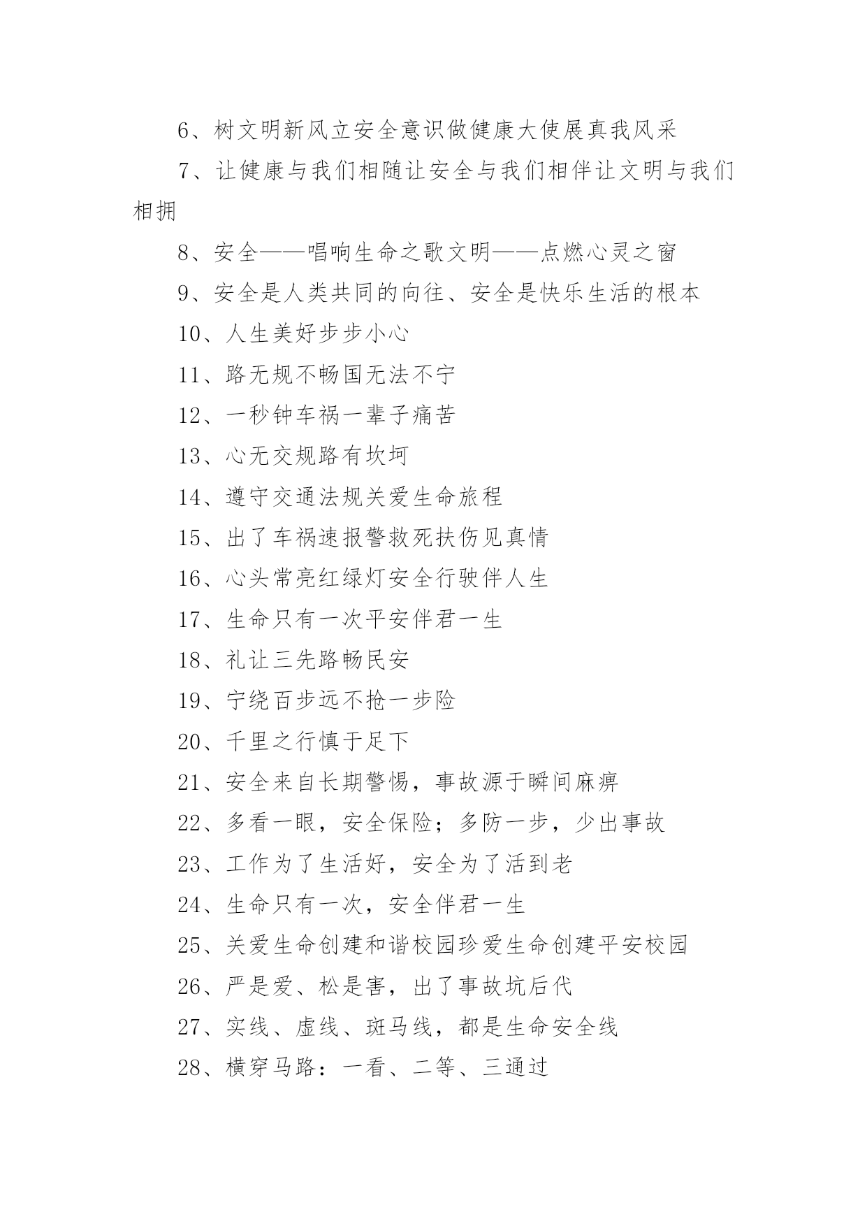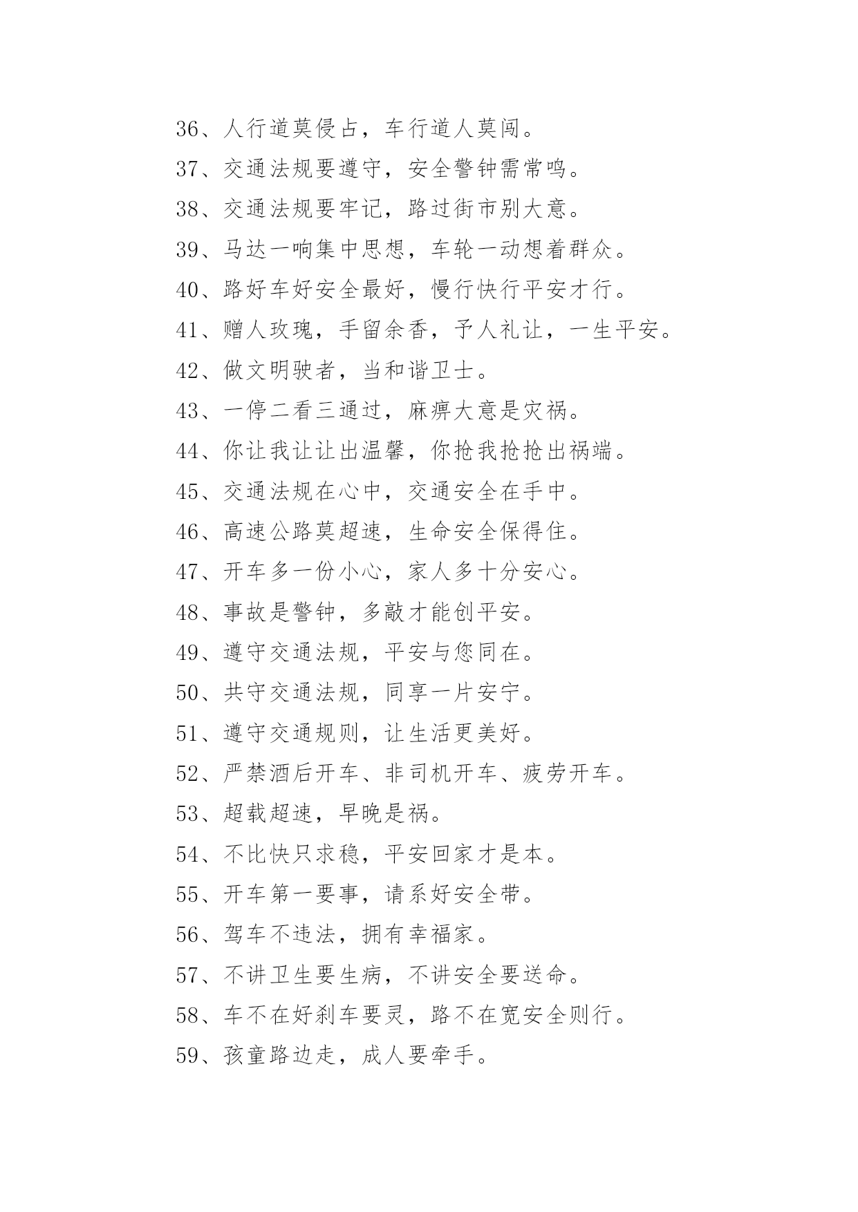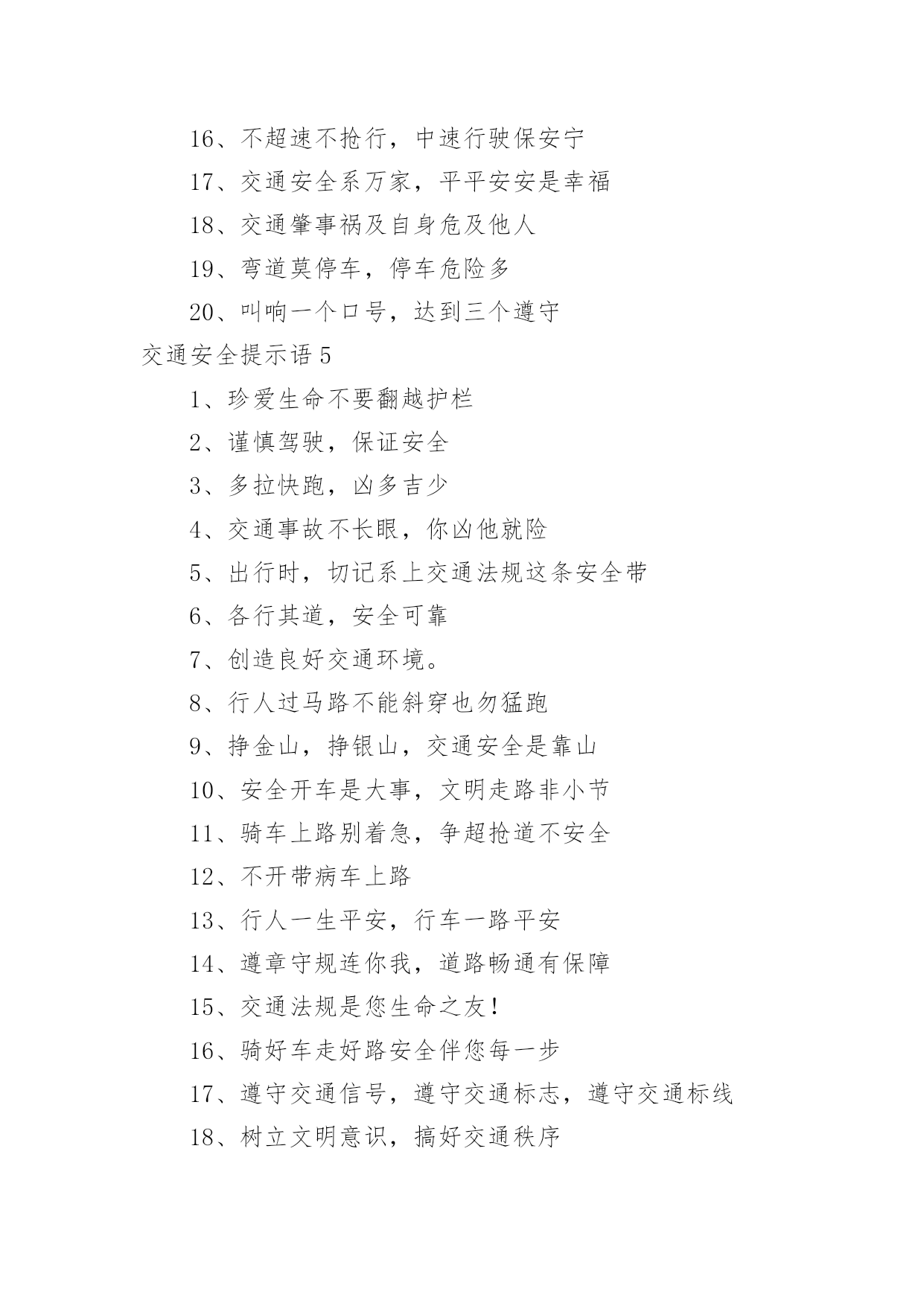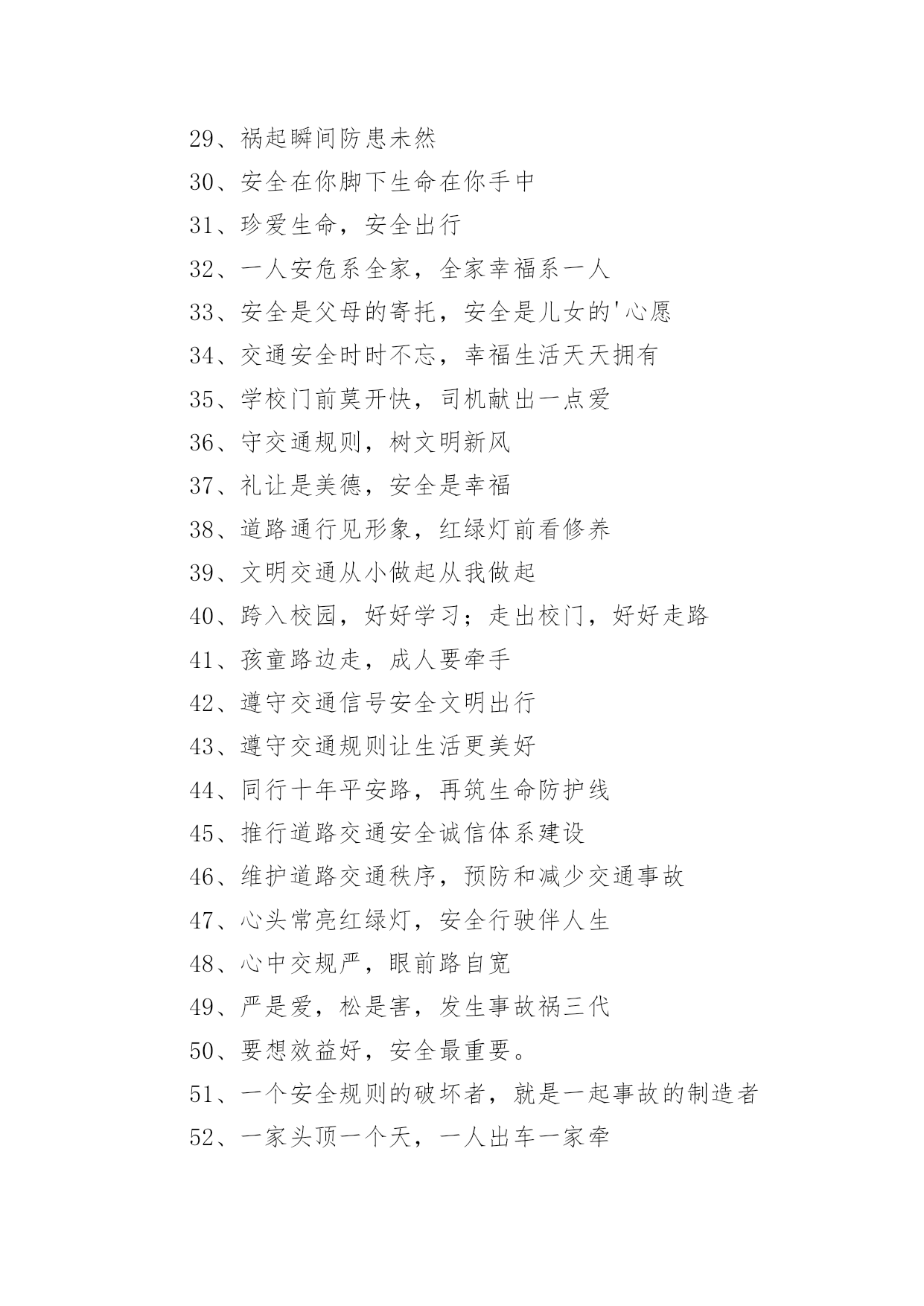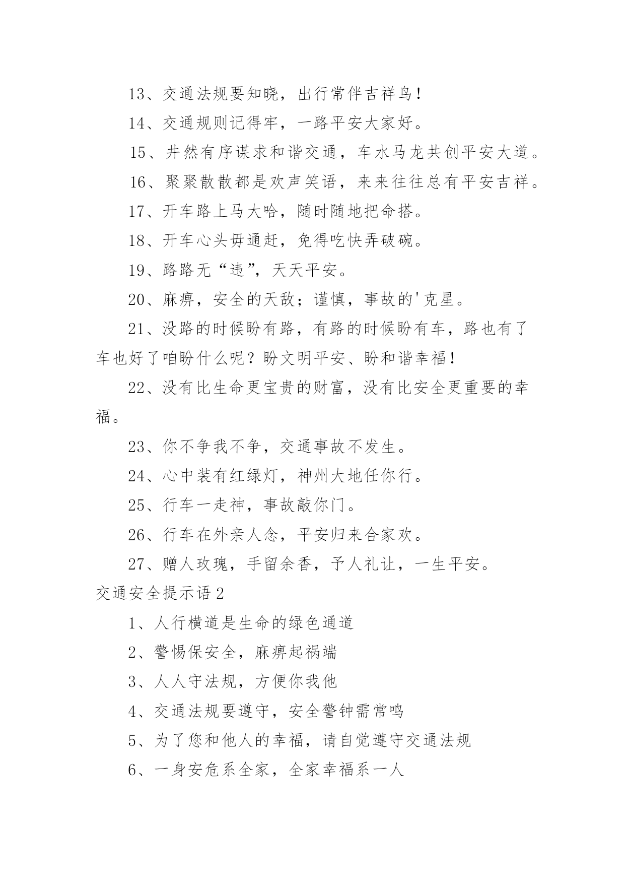 交通安全提示语交通安全提示语【范例11篇】在学习、工作、生活中,大家都有令自己印象深刻的提示语吧,提示语有节奏有韵律,读来朗朗上口,听来和谐悦耳,给人以美感,也便于记忆。还苦于找不到好的提示语?以下是小编整理的交通安全提示语,希望对大家有所帮助。交通安全提示语11、不追不跑不打闹,平平安安到学校。2、常念安全“紧箍咒”,牢记规章“护身符”。3、车好人好道路好,更需你来照章跑。4、车来人往两相让,山重水复一片天。5、车辆抛锚莫大意,处置措施要得体。标志码放应到位,开启“双闪”不忘记。路边修车不可能,驾乘人员速撤离。6、出门在外,自珍自爱;人在旅途,平安是福。7、带十分小心上路,携一份平安回家。8、带着安全意识上路,载着幸福感觉回家。9、道路因文明行驶而畅通,生活因出入平安而幸福。10、电话无线,生命有限;驾车通话,危害极大。11、风景在行车的路上,最美是你我的礼让!12、给他人让路,为自己着想。13、交通法规要知晓,出行常伴吉祥鸟!14、交通规则记得牢,一路平安大家好。15、井然有序谋求和谐交通,车水马龙共创平安大道。16、聚聚散散都是欢声笑语,来来往往总有平安吉祥。17、开车路上马大哈,随时随地把命搭。18、开车心头毋通赶,免得吃快弄破碗。19、路路无“违”,天天平安。20、麻痹,安全的天敌;谨慎,事故的'克星。21、没路的时候盼有路,有路的时候盼有车,路也有了车也好了咱盼什么呢?盼文明平安、盼和谐幸福!22、没有比生命更宝贵的财富,没有比安全更重要的幸福。23、你不争我不争,交通事故不发生。24、心中装有红绿灯,神州大地任你行。25、行车一走神,事故敲你门。26、行车在外亲人念,平安归来合家欢。27、赠人玫瑰,手留余香,予人礼让,一生平安。交通安全提示语21、人行横道是生命的绿色通道2、警惕保安全,麻痹起祸端3、人人守法规,方便你我他4、交通法规要遵守,安全警钟需常鸣5、为了您和他人的幸福,请自觉遵守交通法规6、一身安危系全家,全家幸福系一人7、安全与遵章同在,事故与违规相随8、开车打手机,事故盯上你9、无照开车是玩命,十次玩命九丧生10、礼让――让出海阔天空,争抢――抢出飞来横祸11、增强交通法制观念,遵守交通行为规范12、违章行(骑)车,危及他人,祸及自身13、您是河源的.主人,您是文明礼让的楷模14、人民城市人民建,人民交通人民管15、把握好你生命的时速和方向盘16、人勤车听话,人懒车出岔17、纠正您一次违章,送给您一片关爱18、创优良交通秩序,闪精神文明之光!19、莫图一时快,肇事全家哀20、严禁酒后开车非司机开车疲劳开车!21、遵守交通法规是美德!22、铭记交规,珍爱生命23、宁绕百步远,不冒一步险24、抢行痛快一阵子,出事悔恨一辈子交通安全提示语31、安全与幸福携手文明与美丽同行2、关注自己一言一行创建你我美好校园3、文明在于细节处理安全在于未然防患4、健康生活文明做人平安每天幸福一生5、安全意识时时具备不可忘文明之道刻刻铭记你我心6、树文明新风立安全意识做健康大使展真我风采7、让健康与我们相随让安全与我们相伴让文明与我们相拥8、安全——唱响生命之歌文明——点燃心灵之窗9、安全是人类共同的向往、安全是快乐生活的根本10、人生美好步步小心11、路无规不畅国无法不宁12、一秒钟车祸一辈子痛苦13、心无交规路有坎坷14、遵守交通法规关爱生命旅程15、出了车祸速报警救死扶伤见真情16、心头常亮红绿灯安全行驶伴人生17、生命只有一次平安伴君一生18、礼让三先路畅民安19、宁绕百步远不抢一步险20、千里之行慎于足下21、安全来自长期警惕,事故源于瞬间麻痹22、多看一眼,安全保险;多防一步,少出事故23、工作为了生活好,安全为了活到老24、生命只有一次,安全伴君一生25、关爱生命创建和谐校园珍爱生命创建平安校园26、严是爱、松是害,出了事故坑后代27、实线、虚线、斑马线,都是生命安全线28、横穿马路:一看、二等、三通过29、祸起瞬间防患未然30、安全在你脚下生命在你手中31、珍爱生命,安全出行32、一人安危系全家,全家幸福系一人33、安全是父母的寄托,安全是儿女的'心愿34、交通安全时时不忘,幸福生活天天拥有35、学校门前莫开快,司机献出一点爱36、守交通规则,树文明新风37、礼让是美德,安全是幸福38、道路通行见形象,红绿灯前看修养39、文明交通从小做起从我做起40、跨入校园,好好学习;走出校门,好好走路41、孩童路边走,成人要牵手42、遵守交通信号安全文明出行43、遵守交通规则让生活更美好44、同行十年平安路,再筑生命防护线45、推行道路交通安全诚信体系建设46、维护道路交通秩序,预防和减少交通事故47、心头常亮红绿灯,安全行驶伴人生48、心中交规严,眼前路自宽49、严是爱,松是害,发生事故祸三代50、要想效益好,安全