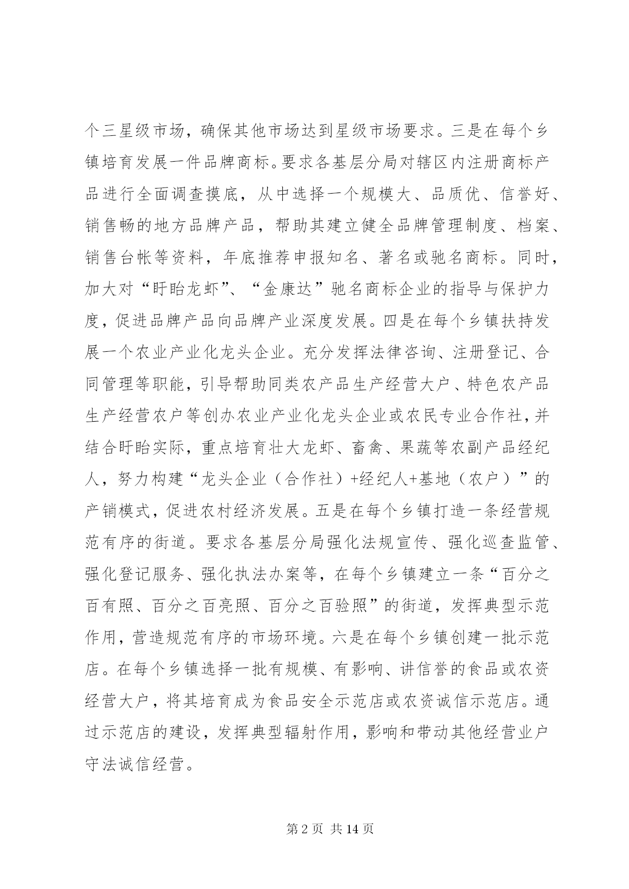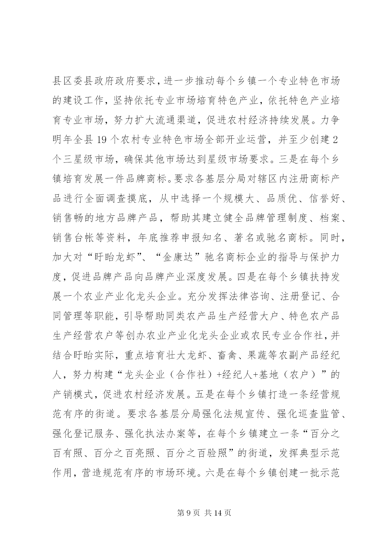 第PAGE\*Arabic\*MERGEFORMAT14页共NUMPAGES\*MERGEFORMAT14页县工商局工作计划20xx年,我局将继续深入学习实践科学发展观,积极打造“效能工商”、“实干工商”,不断深化“四项工程”,推进职能转型,创优服务举措,完善科学监管,推行行政指导,加强队伍建设等,为促进地方经济腾飞、推动工商事业发展作出新的贡献。一、创优服务举措,促进地方经济科学发展积极运用和延伸工商职能,创新服务平台,优化服务方式,为地方经济发展办实事、解难事、作贡献。(一)深入实施“六个一”工程。为充分发挥工商职能,促进农村发展和农民增收,我局明年将在全系统深入实施“六个一”工程:一是完善一套红盾护农服务体系。进一步打造好我局今年的重点项目,即建立红盾护农三级服务体系。着力完善每个乡镇的红盾护农服务站、每个行政村的红盾护农服务点的内部机制建设,加强对聘请的各村民小组联络员和各站点工作人员的培训指导工作,并将各站点和农村“一会两站”等有机整合,形成职能完备、机制健全的红盾护农服务体系,更好地服务农村发展,解决农民需求。二是协助每个乡镇建成一个专业特色市场。策XX县区委县政府政府要求,进一步推动每个乡镇一个专业特色市场的建设工作,坚持依托专业市场培育特色产业,依托特色产业培育专业市场,努力扩大流通渠道,促进农村经济持续发展。力争明年全县19个农村专业特色市场全部开业运营,并至少创建2个三星级市场,确保其他市场达到星级市场要求。三是在每个乡镇培育发展一件品牌商标。要求各基层分局对辖区内注册商标产品进行全面调查摸底,从中选择一个规模大、品质优、信誉好、销售畅的地方品牌产品,帮助其建立健全品牌管理制度、档案、销售台帐等资料,年底推荐申报知名、著名或驰名商标。同时,加大对“盱眙龙虾”、“金康达”驰名商标企业的指导与保护力度,促进品牌产品向品牌产业深度发展。四是在每个乡镇扶持发展一个农业产业化龙头企业。充分发挥法律咨询、注册登记、合同管理等职能,引导帮助同类农产品生产经营大户、特色农产品生产经营农户等创办农业产业化龙头企业或农民专业合作社,并结合盱眙实际,重点培育壮大龙虾、畜禽、果蔬等农副产品经纪人,努力构建“龙头企业(合作社)+经纪人+基地(农户)”的产销模式,促进农村经济发展。五是在每个乡镇打造一条经营规范有序的街道。要求各基层分局强化法规宣传、强化巡查监管、强化登记服务、强化执法办案等,在每个乡镇建立一条“百分之百有照、百分之百亮照、百分之百验照”的街道,发挥典型示范作用,营造规范有序的市场环境。六是在每个乡镇创建一批示范店。在每个乡镇选择一批有规模、有影响、讲信誉的食品或农资经营大户,将其培育成为食品安全示范店或农资诚信示范店。通过示范店的建设,发挥典型辐射作用,影响和带动其他经营业户守法诚信经营。(二)切实加强服务窗口建设。一是进一步加强登记注册窗口建设。在推行“一局多点、远程核准、就近受理”的基础上,大力开展注册窗口规范化建设,努力做到登记咨询“一口清”、服务流程“一站式”、为民办事“一次结”,努力提高办照效率。实行预约服务、上门服务、延时服务、承诺服务等,努力做到事前指导、事中速办、事后跟踪服务,不断“催生”市场主体。对注册资本在1000万元以上的项目和外资项目,一律安排专人接待,实施全程帮办服务,促成重大项目在盱眙落地生根。二是进一步加强消费维权窗口建设。着力将消费维权窗口建设成为服务型工商的亮丽窗口,切实做到“有诉必接、有假必打、有难必帮、有案必查”,努力将消费纠纷化解在基层、和解在企业、解决在萌芽状态。(三)继续开展好红盾服务系列活动。将红盾惠民、红盾助企、红盾塑信、红盾兴农等系列行动进一步引向深入,为应对金融危机、服务经济发展作出更大贡献。二、创新监管思路,维护和谐稳定的市场秩序工商行政管理工作的基本职能是维护市场秩序,根本目的是促进科学发展。建立和维护良好的市场秩序,是促进地方经济社会科学发展的重要保障。(一)积极推行行政指导。一是重点项目行政辅导。跟据盱眙境内市场主体特点及相对人申请,积极发挥管理和服务职能,实施上门重点指导。二是服务发展行政建议。充分发挥商标、广告、市场、合同以及经纪人等管理职能,在日常巡查监管中,采取和运用宣传、辅导、建议、沟通、帮扶等手段,引导企业和各类经济组织树立维权意识、品牌意识、信用意识,加快实现产业化、规模化和效益化。三是监督管理行政提示。提示、引导市场主体按照法律法规及政策要求履行义务,加强自律,尽可能减少违法行为的发生。四是轻微违规行政警示。对发现的不良行为倾向和情节轻微的的违章违法行为,进行警示并责令改正,以规范市场主体及其市场行为。五是行政处罚案后帮扶。对行政执法相对人进行走访、询问、建议,帮助行政执法相对人纠正违法行为,引导相对人规范经营、诚信