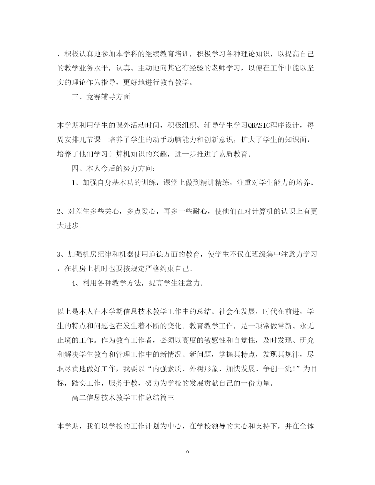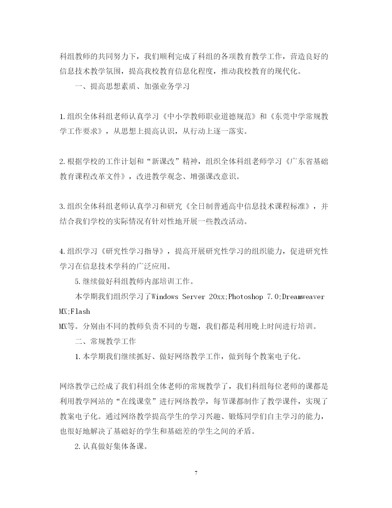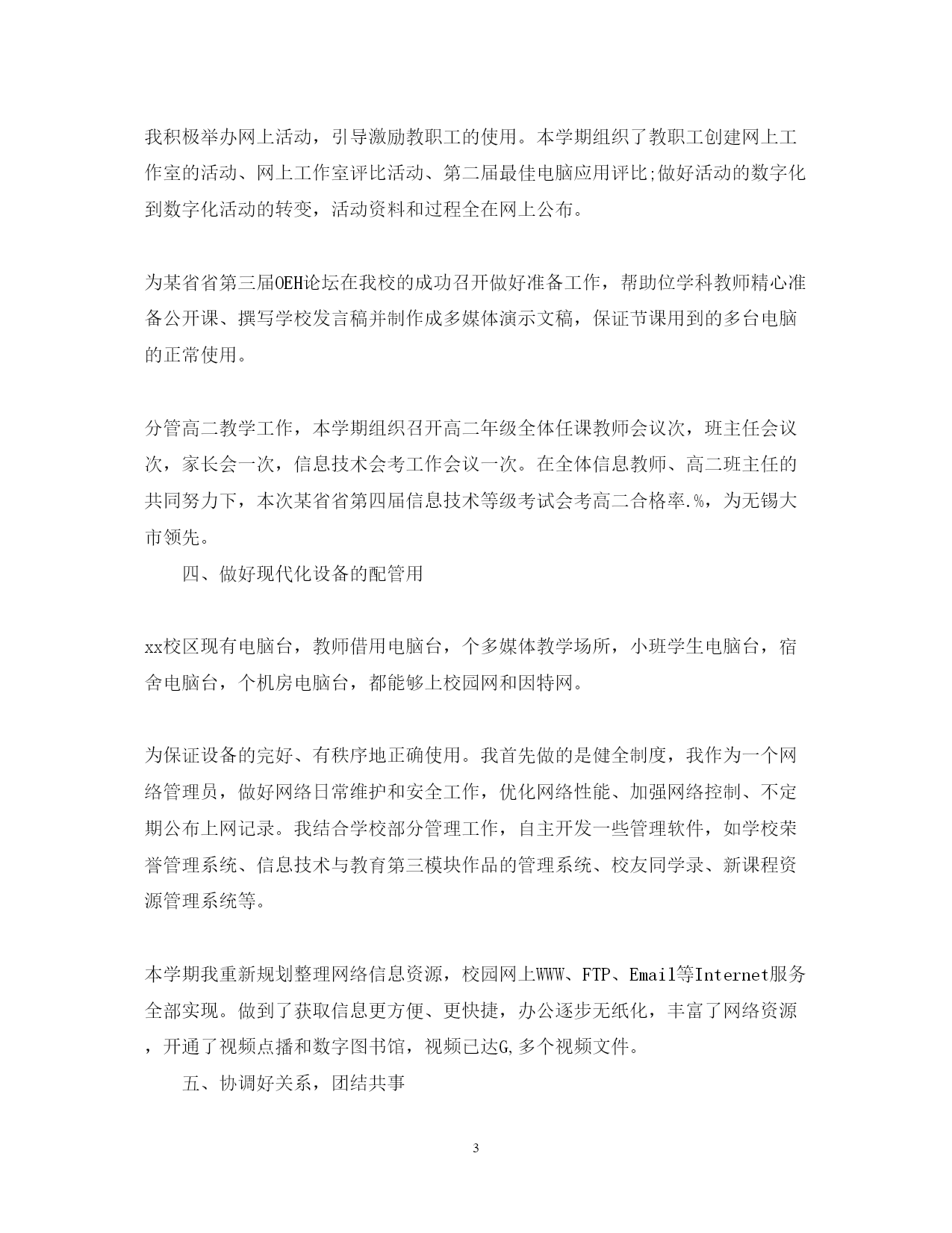 此资料由网络收集而来,如有侵权请告知上传者立即删除。资料共分享,我们负责传递知识。PAGEPAGE8高二信息技术教学工作总结加强研究性学习,培养学生对信息的获取、加工、管理、表达与交流的能力。今天范文网小编给大家带来了高二信息技术教学工作总结,希望对大家有所帮助。高二信息技术教学工作总结篇一一、加强理论学习,提高业务水平我是去年月日转为中共正式党员。半年来我认真学习党的基本理论和重要著作。认真学习xx大会议精神,特别是学习“三个代表”重要思想,不断提高自己,充实自己,以“三个代表”重要思想严格要求自己,树立正确的世界观、人生观和价值观,坚定共产主义理想和社会主义信念,为推进学校的信息化进程而努力工作。在学校党支部的指导下,做好学校“党建在线”网站的维护和更新,做好党的宣传工作,理论联系实际。现在的社会是一个学习的社会,社会科技日新月异,不懂得的东西太多,要学习的东西更多。我每天坚持学习,努力提高自身的素质。结合学校实际情况,选择有针对性、现实性、前瞻性的教育教学理论,进行学习研究,并在自己的工作实践过程中运用理论,优化课堂教学结构,提高教学效益。我积极参加各类业务进修,自学网络开发和网络管理技术。月份参加国家计算机信息化认证网络管理员培训和考试获合格证书。月参加无锡市《教育系统计算机安全培训班》培训获得合格证书。二、处理好个人和学校的关系教师是学校长盛不衰的人力资源。我认为学是为了用,学为了自己的发展,学也是为学校的发展。学习是为了自己更好的工作。我在劳技学科教学中积极探索研究,参加了某省省教研室组织的劳技教材编写,本学期刚完成了省劳技教材《识图与钳工》第三次修订工作,三年来一直负责制订无锡市高中劳技会考“识图与钳工”项目的考查要求和评分标准。我积极组织和辅导学生参加信息学奥赛,多年评为xx市信息学奥赛优秀辅导员,被无锡市电教馆聘任为“某省省信息学奥赛希望之星xx培训班”和信息学奥赛市选手集训高中组主讲教师,我还担任区信息学奥赛的评委。三、转变观念,提高服务意识现代教育技术处是新成立的部门,很多是创造性的工作。我首先想到的是怎样更好地为全校师生服务。我不停留在设备的借用、维修和培训上,从配、管、用多方面更多的为教职工服务,做好教师现代教育技术的培训和考核、老师参赛的技术支持,尽可能多推荐教师和报送作品参赛,如本学期我们优选了件作品参加中央教科所组织的第二届”百千万工程”活动,推荐季老师参加“无锡市第三届教师教学技能大赛”获滨湖区一等奖,无锡市二等奖。我结合新时代学校培训工作的特点,采取培训形式多样化,集中和分散、讲授和自学相结合,培训内容数字化并上网的办法;本学期开办个培训班,让不同层次的教职工都有所获。为了方便教师,提高工作效率,自主开发点电教室网上申请系统,让教师在办公室就能进行电教室的使用申请,我还组织构建太湖高中新课程资源网,目前有论文、教案、习题、课件、视音频资源个,方便教师下载使用。我积极举办网上活动,引导激励教职工的使用。本学期组织了教职工创建网上工作室的活动、网上工作室评比活动、第二届最佳电脑应用评比;做好活动的数字化到数字化活动的转变,活动资料和过程全在网上公布。为某省省第三届OEH论坛在我校的成功召开做好准备工作,帮助位学科教师精心准备公开课、撰写学校发言稿并制作成多媒体演示文稿,保证节课用到的多台电脑的正常使用。分管高二教学工作,本学期组织召开高二年级全体任课教师会议次,班主任会议次,家长会一次,信息技术会考工作会议一次。在全体信息教师、高二班主任的共同努力下,本次某省省第四届信息技术等级考试会考高二合格率.%,为无锡大市领先。四、做好现代化设备的配管用xx校区现有电脑台,教师借用电脑台,个多媒体教学场所,小班学生电脑台,宿舍电脑台,个机房电脑台,都能够上校园网和因特网。为保证设备的完好、有秩序地正确使用。我首先做的是健全制度,我作为一个网络管理员,做好网络日常维护和安全工作,优化网络性能、加强网络控制、不定期公布上网记录。我结合学校部分管理工作,自主开发一些管理软件,如学校荣誉管理系统、信息技术与教育第三模块作品的管理系统、校友同学录、新课程资源管理系统等。本学期我重新规划整理网络信息资源,校园网上WWW、FTP、Email等Internet服务全部实现。做到了获取信息更方便、更快捷,办公逐步无纸化,丰富了网络资源,开通了视频点播和数字图书馆,视频已达G,多个视频文件。五、协调好关系,团结共事坚持实事求是,求真务实,完成上级部门、校长室布置的工作任务,并提出有利于学校发展的建议。做好市区现代教育技术条线的联络工作,并参与其工作,如担任市信息学奥赛辅导教师、帮助区电教站开发了滨湖教育信息网、滨湖区教育科研网和太湖社区网,担任区信息学