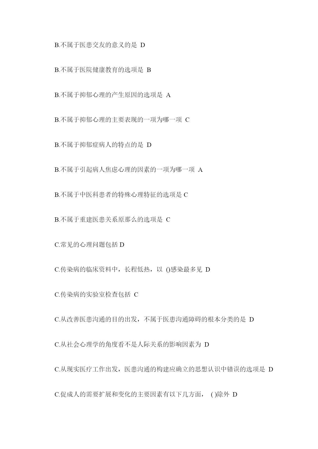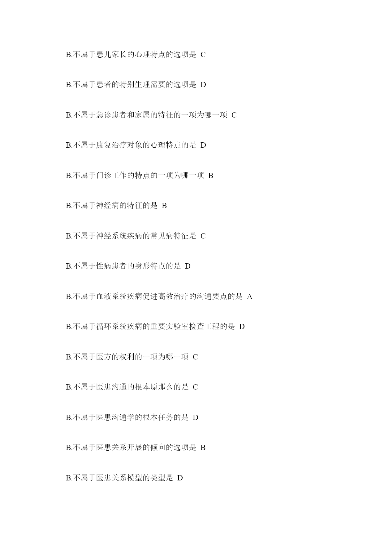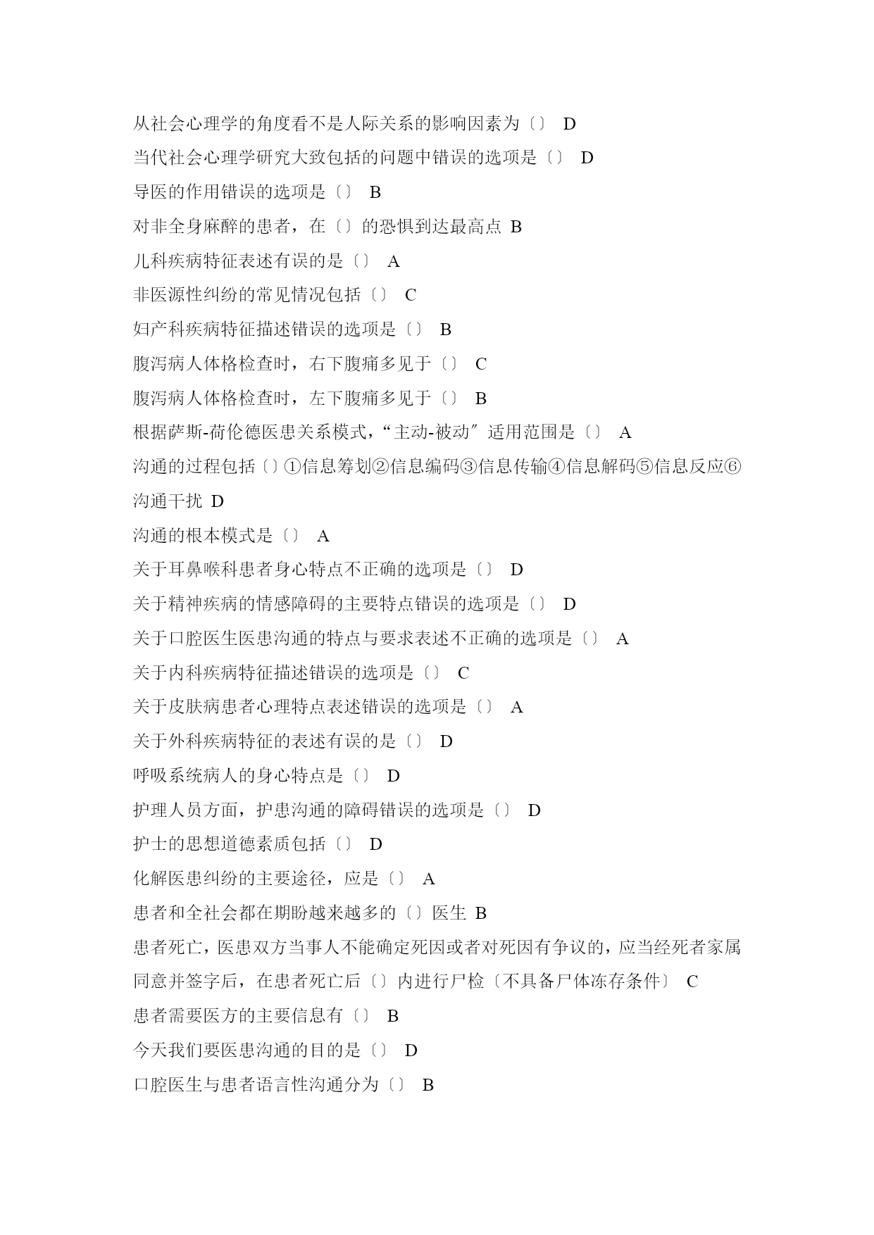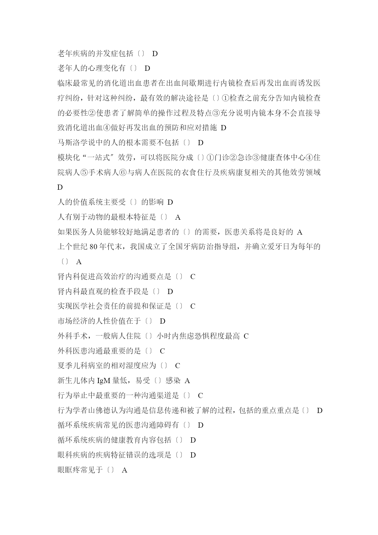 公共课程《医患沟通学》答案【完整版】(文档可以直接使用,也可根据实际需要修订后使用,可编辑放心下载)公共课程?医患沟通学?答案“瓜熟蒂落〞说明患者〔〕B“绿色平安通道〞的目标是〔〕B“医〞的含义,狭义上是指〔〕A“医事〞涵盖〔〕等学科体系①医学②药物学③卫生学④管理学A3岁以上年长儿,小儿惊厥的发病原因应主要考虑〔〕D6个月以内的婴儿,小儿惊厥的发病原因应主要考虑〔〕B6个月至3岁的儿童,小儿惊厥的发病原因应主要考虑〔〕C病人谈话中出现沉默的可能性包括〔〕①成心②思维突然中断③冲动④新的意识闪现⑤有难言之隐D病人选取医生的实施方法有〔〕D不是构成医事侵权民事责任必须具备的条件的选项是〔〕B不是健康俱乐部的特征的是〔〕B不是皮肤科疾病的特征的选项是〔〕C不是医方的义务的一项为哪一项〔〕A不属于恶性肿瘤患者及其家属的身心特点的是〔〕C不属于患儿的心理特点的是〔〕D不属于神经病人的特点的是〔〕C不属于神经系统疾病的常见病特征是〔〕A不属于医方的权利的一项为哪一项〔〕C不属于医患沟通学的根本任务的是〔〕D不属于医患关系开展的倾向的选项是〔〕B不属于医者价值的选项是〔〕B不属于抑郁心理的主要表现的一项为哪一项〔〕C不属于引起病人焦虑心理的因素的一项为哪一项〔〕A不属于躁狂病人的特点的是〔〕C不属于中医科患者的特殊心理特征〔〕D传染病的实验室检查包括〔〕C从社会心理学的角度看不是人际关系的影响因素为〔〕D当代社会心理学研究大致包括的问题中错误的选项是〔〕D导医的作用错误的选项是〔〕B对非全身麻醉的患者,在〔〕的恐惧到达最高点B儿科疾病特征表述有误的是〔〕A非医源性纠纷的常见情况包括〔〕C妇产科疾病特征描述错误的选项是〔〕B腹泻病人体格检查时,右下腹痛多见于〔〕C腹泻病人体格检查时,左下腹痛多见于〔〕B根据萨斯-荷伦德医患关系模式,“主动-被动〞适用范围是〔〕A沟通的过程包括〔〕①信息筹划②信息编码③信息传输④信息解码⑤信息反应⑥沟通干扰D沟通的根本模式是〔〕A关于耳鼻喉科患者身心特点不正确的选项是〔〕D关于精神疾病的情感障碍的主要特点错误的选项是〔〕D关于口腔医生医患沟通的特点与要求表述不正确的选项是〔〕A关于内科疾病特征描述错误的选项是〔〕C关于皮肤病患者心理特点表述错误的选项是〔〕A关于外科疾病特征的表述有误的是〔〕D呼吸系统病人的身心特点是〔〕D护理人员方面,护患沟通的障碍错误的选项是〔〕D护士的思想道德素质包括〔〕D化解医患纠纷的主要途径,应是〔〕A患者和全社会都在期盼越来越多的〔〕医生B患者死亡,医患双方当事人不能确定死因或者对死因有争议的,应当经死者家属同意并签字后,在患者死亡后〔〕内进行尸检〔不具备尸体冻存条件〕C患者需要医方的主要信息有〔〕B今天我们要医患沟通的目的是〔〕D口腔医生与患者语言性沟通分为〔〕B老年疾病的并发症包括〔〕D老年人的心理变化有〔〕D临床最常见的消化道出血患者在出血间歇期进行内镜检查后再发出血而诱发医疗纠纷,针对这种纠纷,最有效的解决途径是〔〕①检查之前充分告知内镜检查的必要性②使患者了解简单的操作过程及特点③充分说明内镜本身不会直接导致消化道出血④做好再发出血的预防和应对措施D马斯洛学说中的人的根本需要不包括〔〕D模块化“一站式〞效劳,可以将医院分成〔〕①门诊②急诊③健康查体中心④住院病人⑤手术病人⑥与病人在医院的衣食住行及疾病康复相关的其他效劳领域D人的价值系统主要受〔〕的影响D人有别于动物的最根本特征是〔〕A如果医务人员能够较好地满足患者的〔〕的需要,医患关系将是良好的A上个世纪80年代末,我国成立了全国牙病防治指导组,并确立爱牙日为每年的〔〕A肾内科促进高效治疗的沟通要点是〔〕C肾内科最直观的检查手段是〔〕D实现医学社会责任的前提和保证是〔〕C市场经济的人性价值在于〔〕D外科手术,一般病人住院〔〕小时内焦虑恐惧程度最高C外科医患沟通最重要的是〔〕C夏季儿科病室的相对湿度应为〔〕C新生儿体内IgM量低,易受〔〕感染A行为举止中最重要的一种沟通渠道是〔〕C行为学者山佛德认为沟通是信息传递和被了解的过程,包括的重点重点是〔〕D循环系统疾病常见的医患沟通障碍有〔〕D循环系统疾病的健康教育内容包括〔〕D眼科疾病的疾病特征错误的选项是〔〕D眼眶疼常见于〔〕A医方在维权过程中应该注意的问题是〔〕B医患沟通,按医疗过程分类,错误的一项为哪一项〔〕C医患沟通,按责任人员分类,错误的一项为哪一项〔〕C医患沟通双方沟通的前提是〔〕C医患关系紧张的原因错误的选项是〔〕A医患互惠双赢中医方之赢在于〔〕D医患会谈的过程与医生的应诊过程是紧密相连的,可
