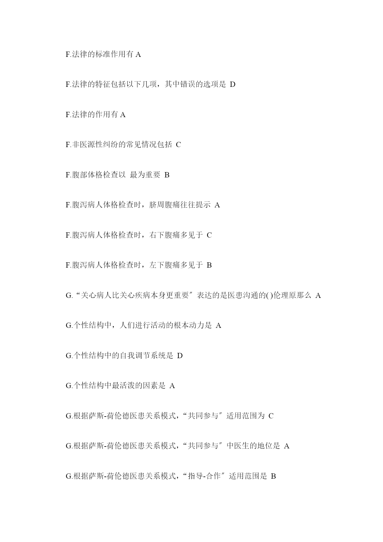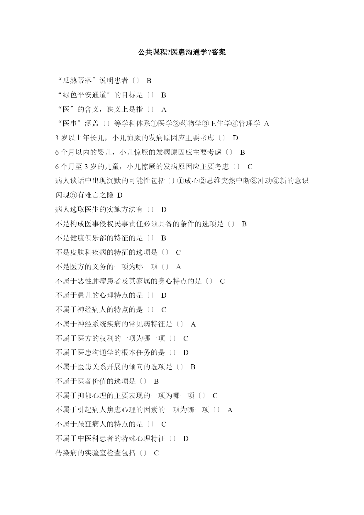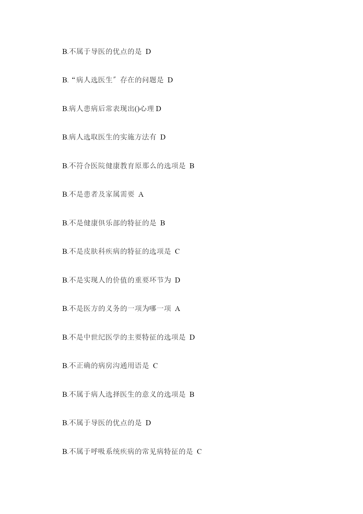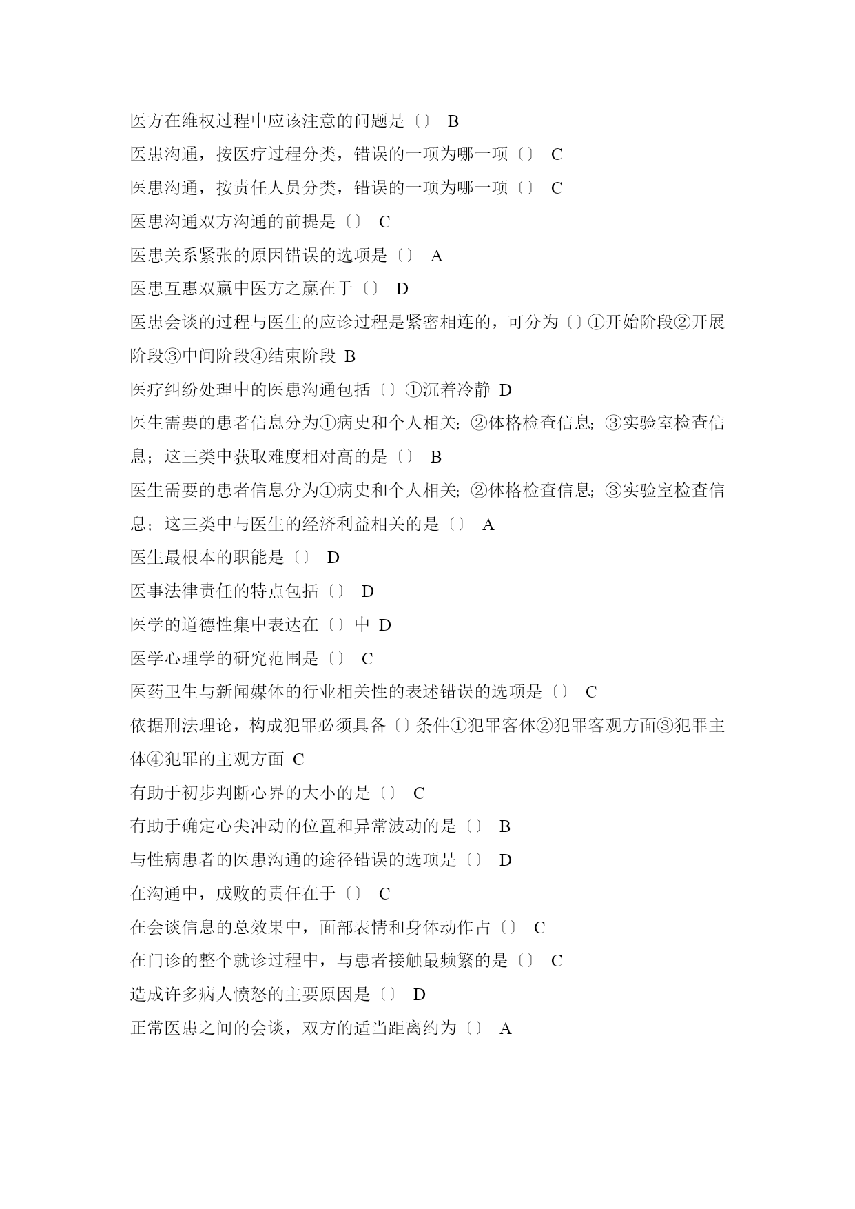 公共课程《医患沟通学》答案【完整版】(文档可以直接使用,也可根据实际需要修订后使用,可编辑放心下载)公共课程?医患沟通学?答案“瓜熟蒂落〞说明患者〔〕B“绿色平安通道〞的目标是〔〕B“医〞的含义,狭义上是指〔〕A“医事〞涵盖〔〕等学科体系①医学②药物学③卫生学④管理学A3岁以上年长儿,小儿惊厥的发病原因应主要考虑〔〕D6个月以内的婴儿,小儿惊厥的发病原因应主要考虑〔〕B6个月至3岁的儿童,小儿惊厥的发病原因应主要考虑〔〕C病人谈话中出现沉默的可能性包括〔〕①成心②思维突然中断③冲动④新的意识闪现⑤有难言之隐D病人选取医生的实施方法有〔〕D不是构成医事侵权民事责任必须具备的条件的选项是〔〕B不是健康俱乐部的特征的是〔〕B不是皮肤科疾病的特征的选项是〔〕C不是医方的义务的一项为哪一项〔〕A不属于恶性肿瘤患者及其家属的身心特点的是〔〕C不属于患儿的心理特点的是〔〕D不属于神经病人的特点的是〔〕C不属于神经系统疾病的常见病特征是〔〕A不属于医方的权利的一项为哪一项〔〕C不属于医患沟通学的根本任务的是〔〕D不属于医患关系开展的倾向的选项是〔〕B不属于医者价值的选项是〔〕B不属于抑郁心理的主要表现的一项为哪一项〔〕C不属于引起病人焦虑心理的因素的一项为哪一项〔〕A不属于躁狂病人的特点的是〔〕C不属于中医科患者的特殊心理特征〔〕D传染病的实验室检查包括〔〕C从社会心理学的角度看不是人际关系的影响因素为〔〕D当代社会心理学研究大致包括的问题中错误的选项是〔〕D导医的作用错误的选项是〔〕B对非全身麻醉的患者,在〔〕的恐惧到达最高点B儿科疾病特征表述有误的是〔〕A非医源性纠纷的常见情况包括〔〕C妇产科疾病特征描述错误的选项是〔〕B腹泻病人体格检查时,右下腹痛多见于〔〕C腹泻病人体格检查时,左下腹痛多见于〔〕B根据萨斯-荷伦德医患关系模式,“主动-被动〞适用范围是〔〕A沟通的过程包括〔〕①信息筹划②信息编码③信息传输④信息解码⑤信息反应⑥沟通干扰D沟通的根本模式是〔〕A关于耳鼻喉科患者身心特点不正确的选项是〔〕D关于精神疾病的情感障碍的主要特点错误的选项是〔〕D关于口腔医生医患沟通的特点与要求表述不正确的选项是〔〕A关于内科疾病特征描述错误的选项是〔〕C关于皮肤病患者心理特点表述错误的选项是〔〕A关于外科疾病特征的表述有误的是〔〕D呼吸系统病人的身心特点是〔〕D护理人员方面,护患沟通的障碍错误的选项是〔〕D护士的思想道德素质包括〔〕D化解医患纠纷的主要途径,应是〔〕A患者和全社会都在期盼越来越多的〔〕医生B患者死亡,医患双方当事人不能确定死因或者对死因有争议的,应当经死者家属同意并签字后,在患者死亡后〔〕内进行尸检〔不具备尸体冻存条件〕C患者需要医方的主要信息有〔〕B今天我们要医患沟通的目的是〔〕D口腔医生与患者语言性沟通分为〔〕B老年疾病的并发症包括〔〕D老年人的心理变化有〔〕D临床最常见的消化道出血患者在出血间歇期进行内镜检查后再发出血而诱发医疗纠纷,针对这种纠纷,最有效的解决途径是〔〕①检查之前充分告知内镜检查的必要性②使患者了解简单的操作过程及特点③充分说明内镜本身不会直接导致消化道出血④做好再发出血的预防和应对措施D马斯洛学说中的人的根本需要不包括〔〕D模块化“一站式〞效劳,可以将医院分成〔〕①门诊②急诊③健康查体中心④住院病人⑤手术病人⑥与病人在医院的衣食住行及疾病康复相关的其他效劳领域D人的价值系统主要受〔〕的影响D人有别于动物的最根本特征是〔〕A如果医务人员能够较好地满足患者的〔〕的需要,医患关系将是良好的A上个世纪80年代末,我国成立了全国牙病防治指导组,并确立爱牙日为每年的〔〕A肾内科促进高效治疗的沟通要点是〔〕C肾内科最直观的检查手段是〔〕D实现医学社会责任的前提和保证是〔〕C市场经济的人性价值在于〔〕D外科手术,一般病人住院〔〕小时内焦虑恐惧程度最高C外科医患沟通最重要的是〔〕C夏季儿科病室的相对湿度应为〔〕C新生儿体内IgM量低,易受〔〕感染A行为举止中最重要的一种沟通渠道是〔〕C行为学者山佛德认为沟通是信息传递和被了解的过程,包括的重点重点是〔〕D循环系统疾病常见的医患沟通障碍有〔〕D循环系统疾病的健康教育内容包括〔〕D眼科疾病的疾病特征错误的选项是〔〕D眼眶疼常见于〔〕A医方在维权过程中应该注意的问题是〔〕B医患沟通,按医疗过程分类,错误的一项为哪一项〔〕C医患沟通,按责任人员分类,错误的一项为哪一项〔〕C医患沟通双方沟通的前提是〔〕C医患关系紧张的原因错误的选项是〔〕A医患互惠双赢中医方之赢在于〔〕D医患会谈的过程与医生的应诊过程是紧密相连的,可
