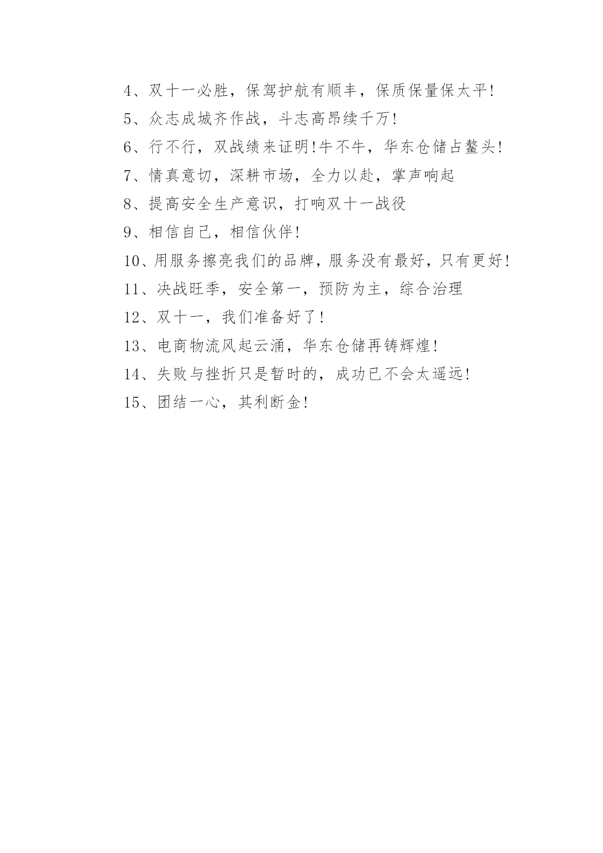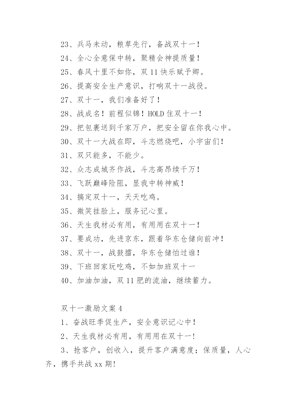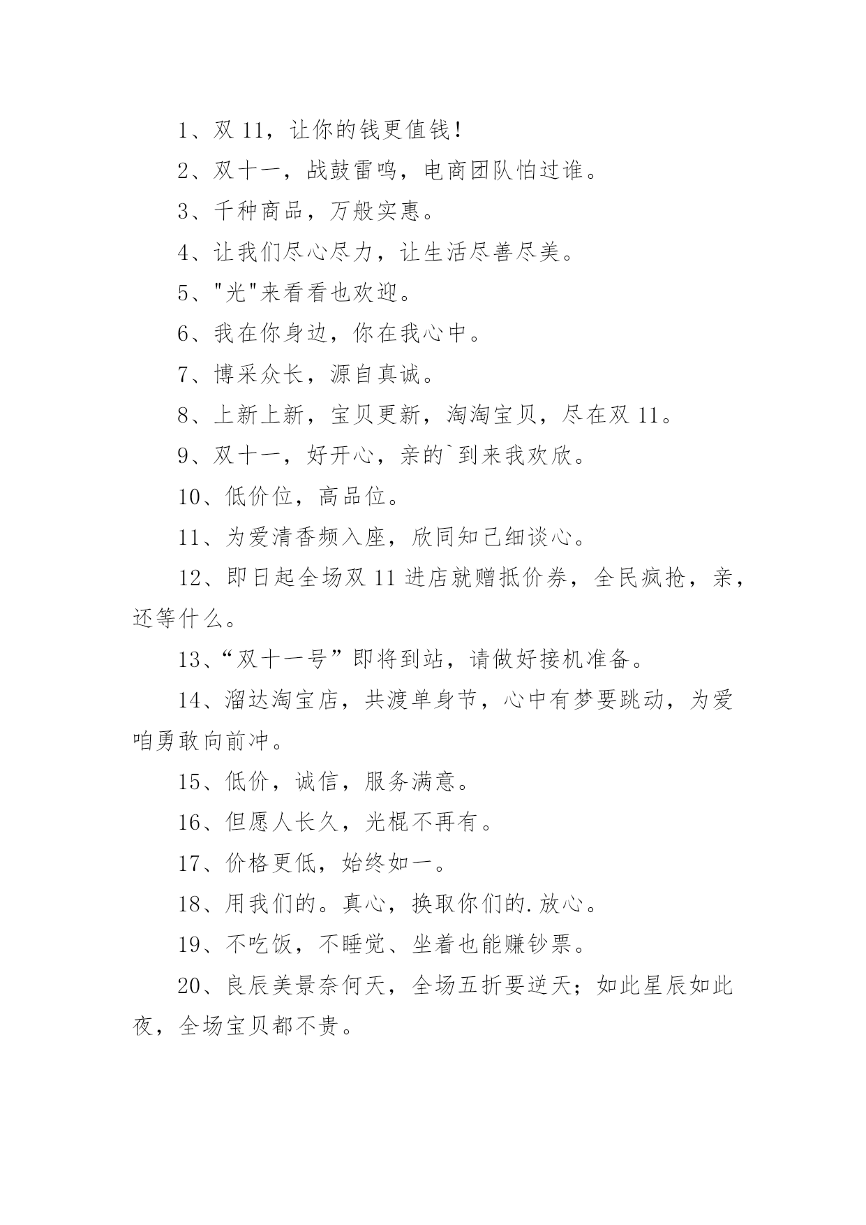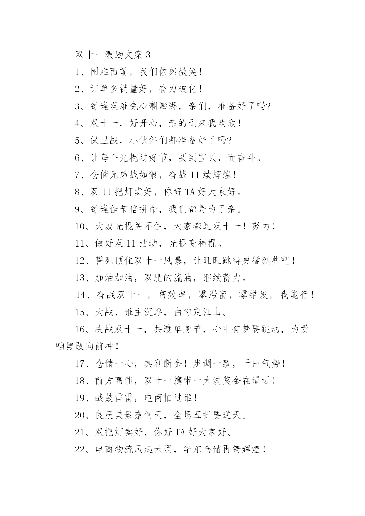 双十一激励文案2022年双十一激励文案随着社交网络和信息技术的飞速发展,大家都听说过或者使用过一些比较经典的文案吧,文案用以分享自己对生活的思考,表达自己的喜怒哀乐。那什么样的文案才是新颖独特的呢?下面是小编精心整理的2022年双十一激励文案,供大家参考借鉴,希望可以帮助到有需要的朋友。双十一激励文案11、双十一让每个上帝都微笑。2、前方高能,双十一携带一大波奖金在逼近!3、小伙伴们冲啊,双十一带着奖金来战啦!4、今天很残酷,明天更残酷,但双十一很美好。5、双十一近在眼前,爆发趁现在。6、双11百亿元品牌优惠券,11月11日折后再优惠,马上就抢。7、一年如一日,勇攀销量顶峰。8、我要飞上天,跟业务一起肩并肩!9、我们的目标是:不愁货——有!不愁钱——折!不愁人——我们都在!10、蓄力待发,双十一我们来了!双十一激励文案21、双11,让你的钱更值钱!2、双十一,战鼓雷鸣,电商团队怕过谁。3、千种商品,万般实惠。4、让我们尽心尽力,让生活尽善尽美。5、"光"来看看也欢迎。6、我在你身边,你在我心中。7、博采众长,源自真诚。8、上新上新,宝贝更新,淘淘宝贝,尽在双11。9、双十一,好开心,亲的`到来我欢欣。10、低价位,高品位。11、为爱清香频入座,欣同知己细谈心。12、即日起全场双11进店就赠抵价券,全民疯抢,亲,还等什么。13、“双十一号”即将到站,请做好接机准备。14、溜达淘宝店,共渡单身节,心中有梦要跳动,为爱咱勇敢向前冲。15、低价,诚信,服务满意。16、但愿人长久,光棍不再有。17、价格更低,始终如一。18、用我们的。真心,换取你们的.放心。19、不吃饭,不睡觉、坐着也能赚钞票。20、良辰美景奈何天,全场五折要逆天;如此星辰如此夜,全场宝贝都不贵。双十一激励文案31、困难面前,我们依然微笑!2、订单多销量好,奋力破亿!3、每逢双难免心潮澎湃,亲们,准备好了吗?4、双十一,好开心,亲的到来我欢欣!5、保卫战,小伙伴们都准备好了吗?6、让每个光棍过好节,买到宝贝,而奋斗。7、仓储兄弟战如狼,奋战11续辉煌!8、双11把灯卖好,你好TA好大家好。9、每逢佳节倍拼命,我们都是为了亲。10、大波光棍关不住,大家都过双十一!努力!11、做好双11活动,光棍变神棍。12、誓死顶住双十一风暴,让旺旺跳得更猛烈些吧!13、加油加油,双肥的流油,继续蓄力。14、奋战双十一,高效率,零滞留,零错发,我能行!15、大战,谁主沉浮,由你定江山。16、决战双十一,共渡单身节,心中有梦要跳动,为爱咱勇敢向前冲!17、仓储一心,其利断金!步调一致,干出气势!18、前方高能,双十一携带一大波奖金在逼近!19、战鼓雷雷,电商怕过谁!20、良辰美景奈何天,全场五折要逆天。21、双把灯卖好,你好TA好大家好。22、电商物流风起云涌,华东仓储再铸辉煌!23、兵马未动,粮草先行,备战双十一!24、全心全意保中转,聚精会神提质量!25、春风十里不如你,双11快乐赋予卿。26、提高安全生产意识,打响双十一战役。27、双十一,我们准备好了!28、战成名!前程似锦!HOLD住双十一!29、把包裹送到千家万户,把安全留在你我心中。30、双十一大战在即,斗志燃烧吧,小宇宙们!31、双只能多,不能少。32、众志成城齐作战,斗志高昂续千万!33、飞跃巅峰险阻,显我中转神威!34、搞定双十一,天天吃鸡。35、微笑挂脸上,服务记心里。36、天生我材必有用,有用用在双十一!37、要成功,先进京东,跟着华东仓储向前冲!38、双十一,战鼓擂,华东仓储怕过谁!39、下班回家玩吃鸡,不如加班双十一40、加油加油,双11肥的流油,继续蓄力。双十一激励文案41、奋战旺季促生产,安全意识记心中!2、天生我材必有用,有用用在双十一!3、抢客户,创收入,提升客户满意度;保质量,人心齐,携手共战xx期!4、双十一必胜,保驾护航有顺丰,保质保量保太平!5、众志成城齐作战,斗志高昂续千万!6、行不行,双战绩来证明!牛不牛,华东仓储占鳌头!7、情真意切,深耕市场,全力以赴,掌声响起8、提高安全生产意识,打响双十一战役9、相信自己,相信伙伴!10、用服务擦亮我们的品牌,服务没有最好,只有更好!11、决战旺季,安全第一,预防为主,综合治理12、双十一,我们准备好了!13、电商物流风起云涌,华东仓储再铸辉煌!14、失败与挫折只是暂时的,成功已不会太遥远!15、团结一心,其利断金!