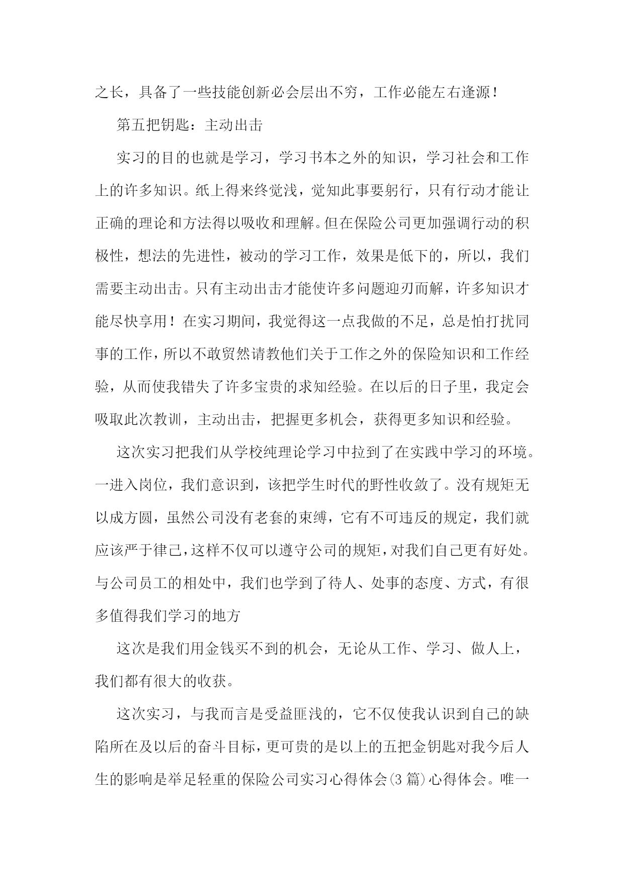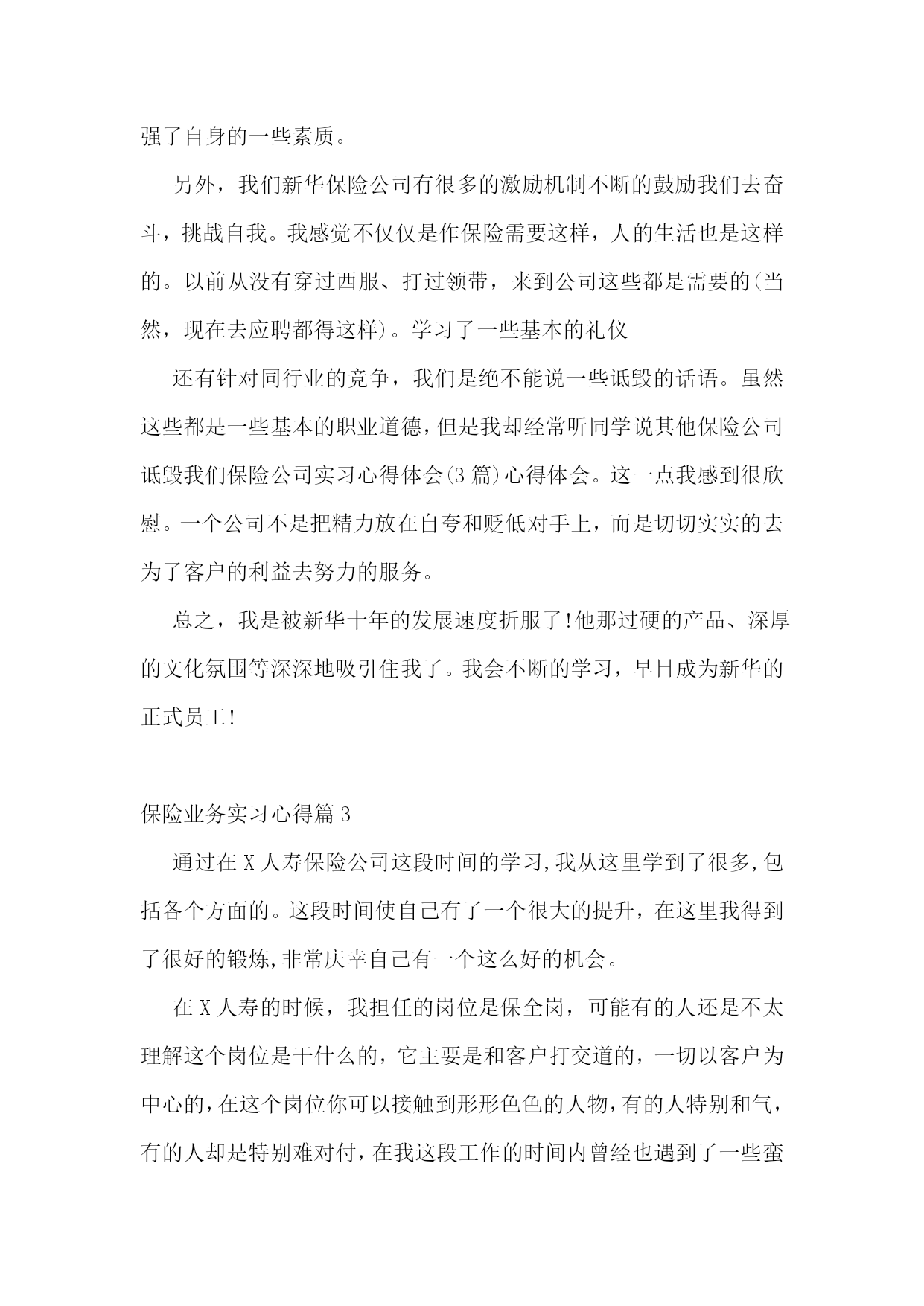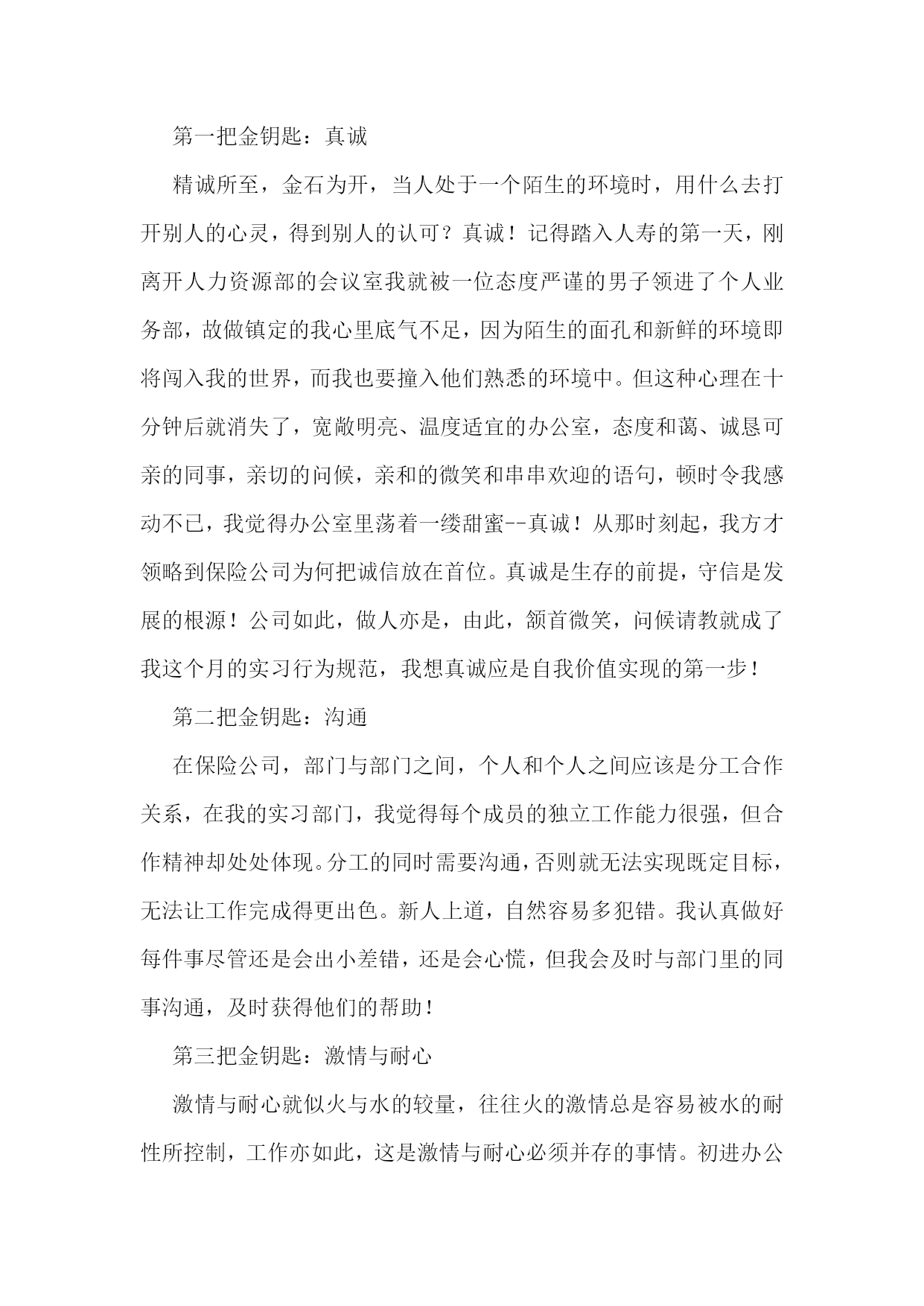 保险业务实习心得保险业务实习心得篇1我的主要工作就是整理档案,算来都是一些很琐碎,比较没有技术含量的事情,可是它同样教会了我许多东西。在外人看来,这样的工作是个人都会做,不就是数数,写字,录入数据嘛,可它也并不如想象中的简单。它难就难在不仅非常繁琐,要足够认真仔细,核对清楚,还有就是工作量大。我和其他11个实习生一起,在狭小的工作间完成了湖北地区从20__年6月到20__年8月的个险、团险、员福档案的整理工作。从将理赔档案按顺序装订成册到装盒,到将数据录入电脑,到最后的装箱,送入仓库,我们的工作包括了这整个流程。别小看这工作,我们在做这个事情的时候还是花了脑筋的。新华保险带我们的老师,每次都只是把一堆工作放在我们面前,再教会我们怎么做就不管了。面对如此多的工作,我们为了提高效率,自觉分工合作,真正尝到了分工合作的甜头,也真正理解了书中常说的,人类社会的进步,就体现在社会劳动的高度分工。还有,在这个过程中,我更学会了如何与人合作,如何融入团队,如何取人之长补己之短。一个人的力量是有限的,集体的力量是无限的。在社会上打拼,要想做成某项事情,一个人都不可能做成功,我们需要其他人的参与,需要发挥团体的力量,而这,就必须有很好的团队合作精神。在团队中,不能过度强调自己的个人作用,每个人都只是这个团体中的一份子,就好像是化合物中的一个构成元素,谁都不能少,谁都起着不可替代的作用。与人相处,最重要的就是沟通,而且要及时沟通,以避免不必要的误会,也有利于做到行动一致。由此看来,选择及时、保险的沟通方式也就尤为重要。面对这个看似很枯燥无趣的工作,我们却觉得充满了乐趣。曾以为犹如28个世纪漫长的28天会把我们折磨死,却突然发现它已经在我们的不知不觉中,伴随着我们的谈笑声悄悄流逝。我们也曾在讨论案例时激烈辩论,但是,我们就事论事,求同存异,并没有把这种纯观点上的意见带到日常相处中。28天下来,我们12个人都成为了朋友,甚至比班上很多已经相处两年的同学还要亲。保险业务实习心得篇2自从X开始在新华人寿保险公司实习以来,到现在已经学习了20天了。虽然自己仍然一个单子也没有做成,还交了400元的各项费用和押金,但是学到了很多东西。在学校里一直认为工作了什么事情就都简单了,不用那么用功学习了,可是在新华的这段时间我发现,越是工作越需要学习。在新华不仅仅新的员工需要学习(比如:保险法的相关知识,考取代理人资格证书以及相关的业务技能培训),而且各个级别的都需要不断的培训学习。而且这里的工作氛围很好,每天都有晨会,大家高高兴兴的一起学习,分享经验,是快乐的工作。在这里,能学到很多的知识保险公司实习心得体会(3篇)保险公司实习心得体会(3篇)。不仅仅是保险的,而且有关理财的知识、人际交往的知识等。退一步说,即使我以后不适合作保险,也锻炼了自己,增强了自身的一些素质。另外,我们新华保险公司有很多的激励机制不断的鼓励我们去奋斗,挑战自我。我感觉不仅仅是作保险需要这样,人的生活也是这样的。以前从没有穿过西服、打过领带,来到公司这些都是需要的(当然,现在去应聘都得这样)。学习了一些基本的礼仪还有针对同行业的竞争,我们是绝不能说一些诋毁的话语。虽然这些都是一些基本的职业道德,但是我却经常听同学说其他保险公司诋毁我们保险公司实习心得体会(3篇)心得体会。这一点我感到很欣慰。一个公司不是把精力放在自夸和贬低对手上,而是切切实实的去为了客户的利益去努力的服务。总之,我是被新华十年的发展速度折服了!他那过硬的产品、深厚的文化氛围等深深地吸引住我了。我会不断的学习,早日成为新华的正式员工!保险业务实习心得篇3通过在X人寿保险公司这段时间的学习,我从这里学到了很多,包括各个方面的。这段时间使自己有了一个很大的提升,在这里我得到了很好的锻炼,非常庆幸自己有一个这么好的机会。在X人寿的时候,我担任的岗位是保全岗,可能有的人还是不太理解这个岗位是干什么的,它主要是和客户打交道的,一切以客户为中心的,在这个岗位你可以接触到形形色色的人物,有的人特别和气,有的人却是特别难对付,在我这段工作的时间内曾经也遇到了一些蛮横不讲理的客户,他们时说话还带着脏字,有几次把我气的都想哭,但是不能,必须学会坚强的面对发生的困难,以积极的态度解决问题。同时保险行业的竞争也是相当的激烈,现在保险业务是相当的不好干呢,尤其是寿险的业务更是不好做。现在的保险行业是年轻的行业,需要大量的人才,尤其是新一代的青年,所以我们更应该抓好面前的机会,把握美好的时光努力学习,在保险这个行业寻找属于自己的天空,给自己在这个行业中找到自己的立足之地。前几年的话,如果有10个人,问他们有保险吗?他们当中肯定是大多数人会说没有,但是现在可是不一样了,10个人应该10个人多多少少都会有各种各样的保险了。毕竟时代不